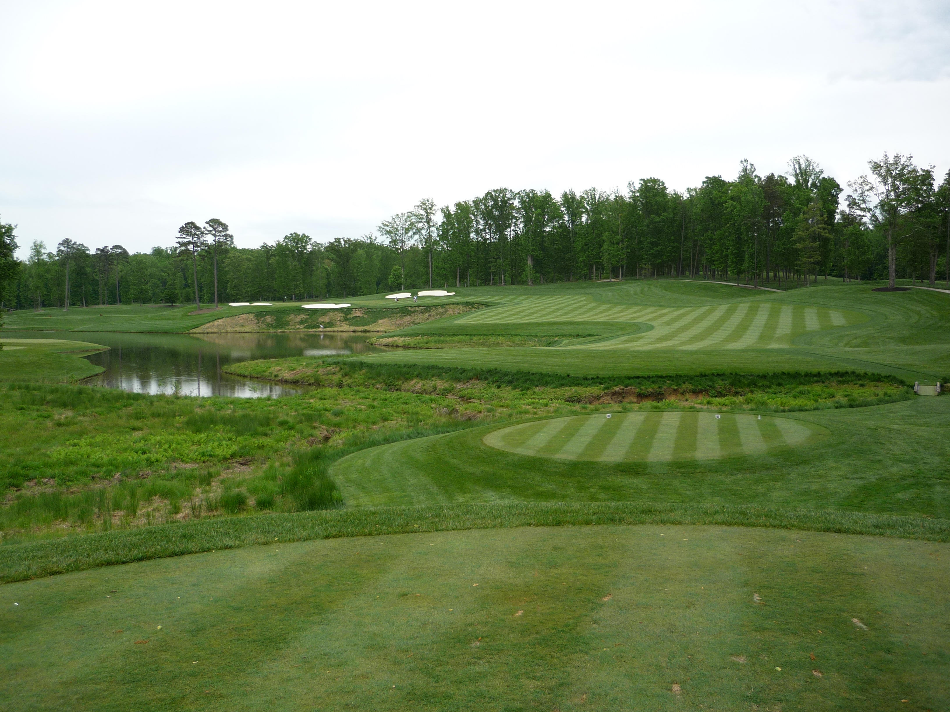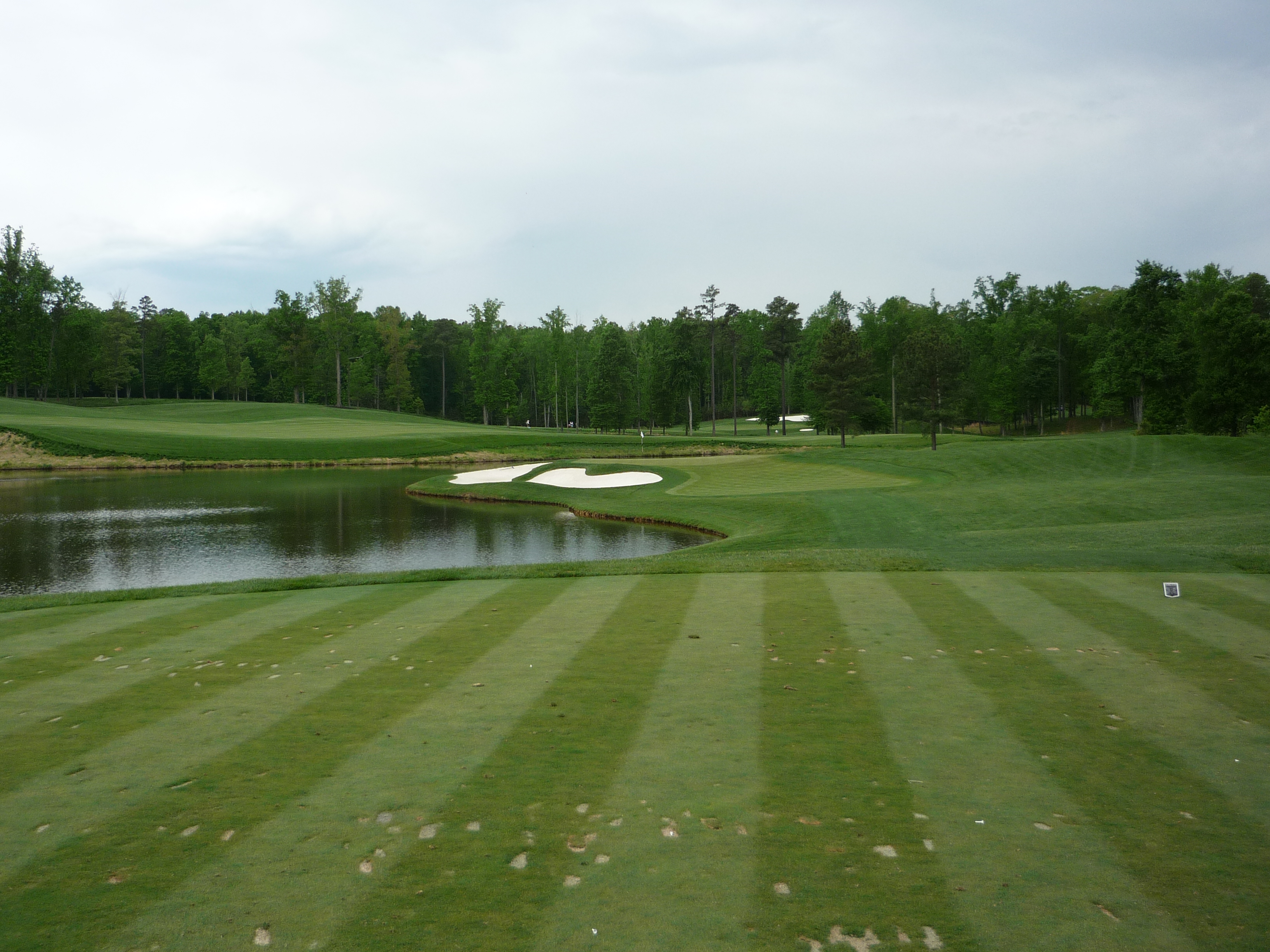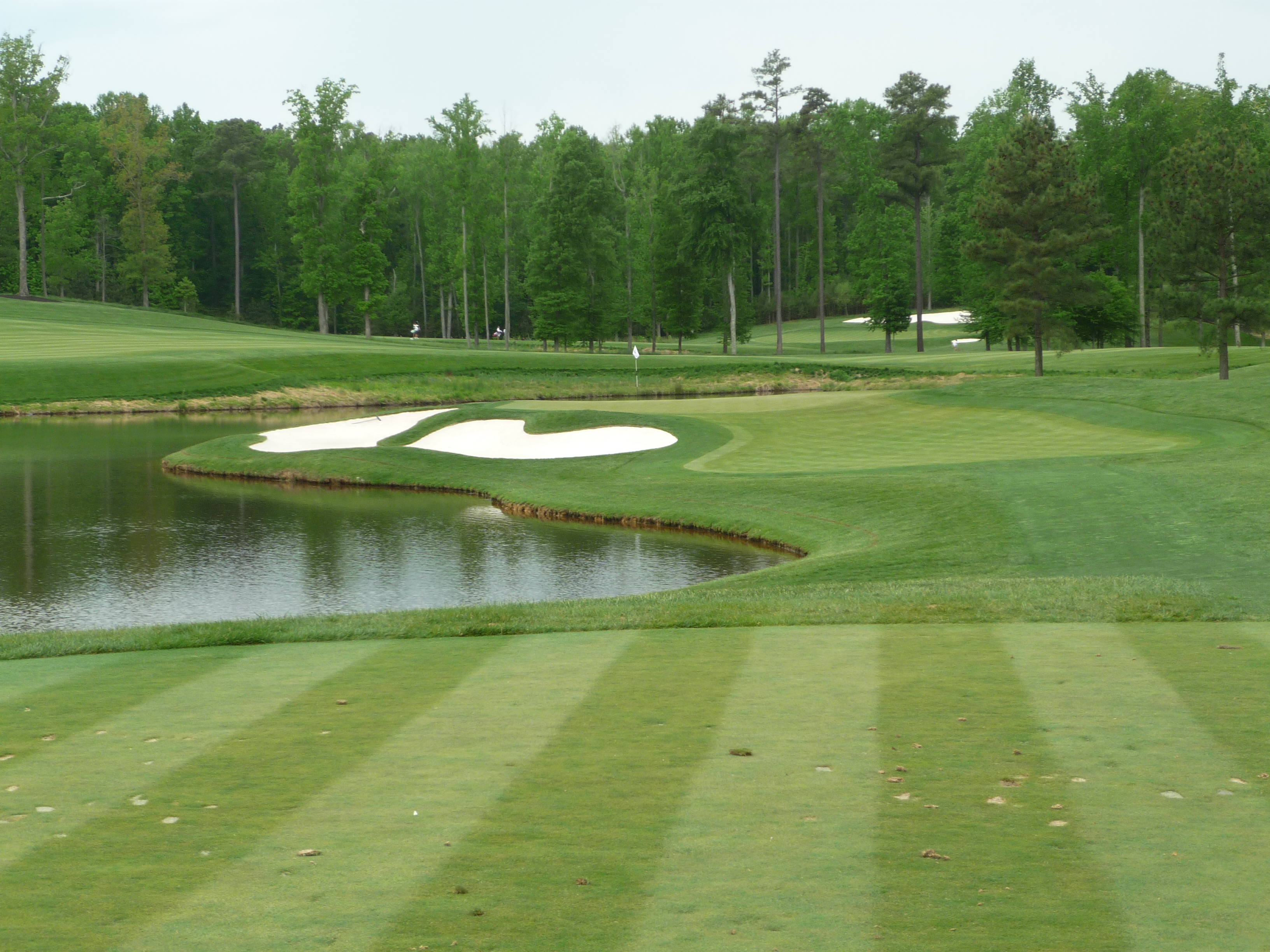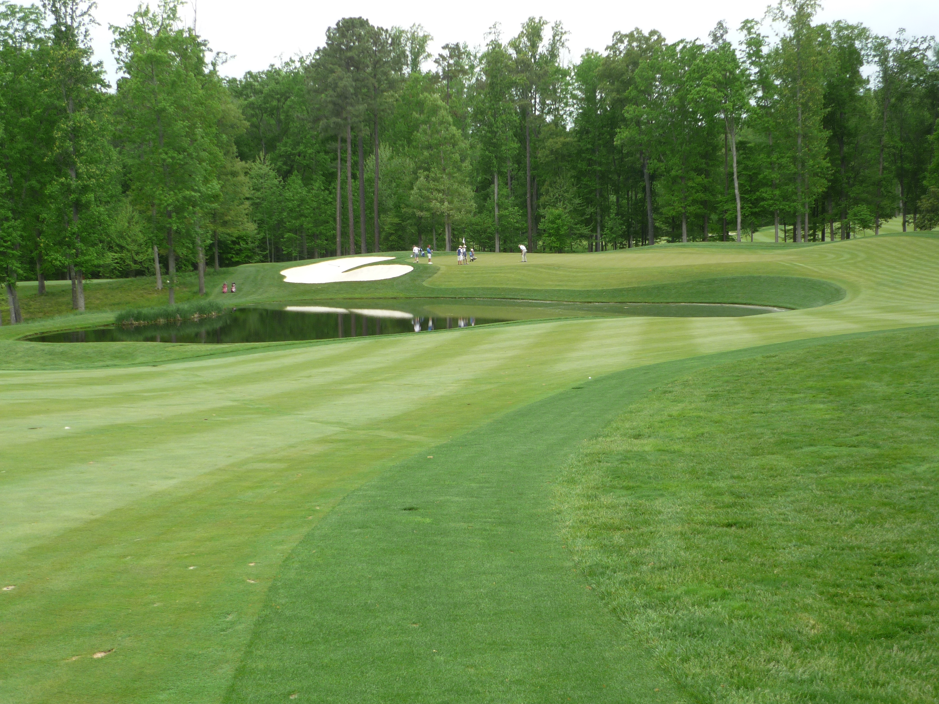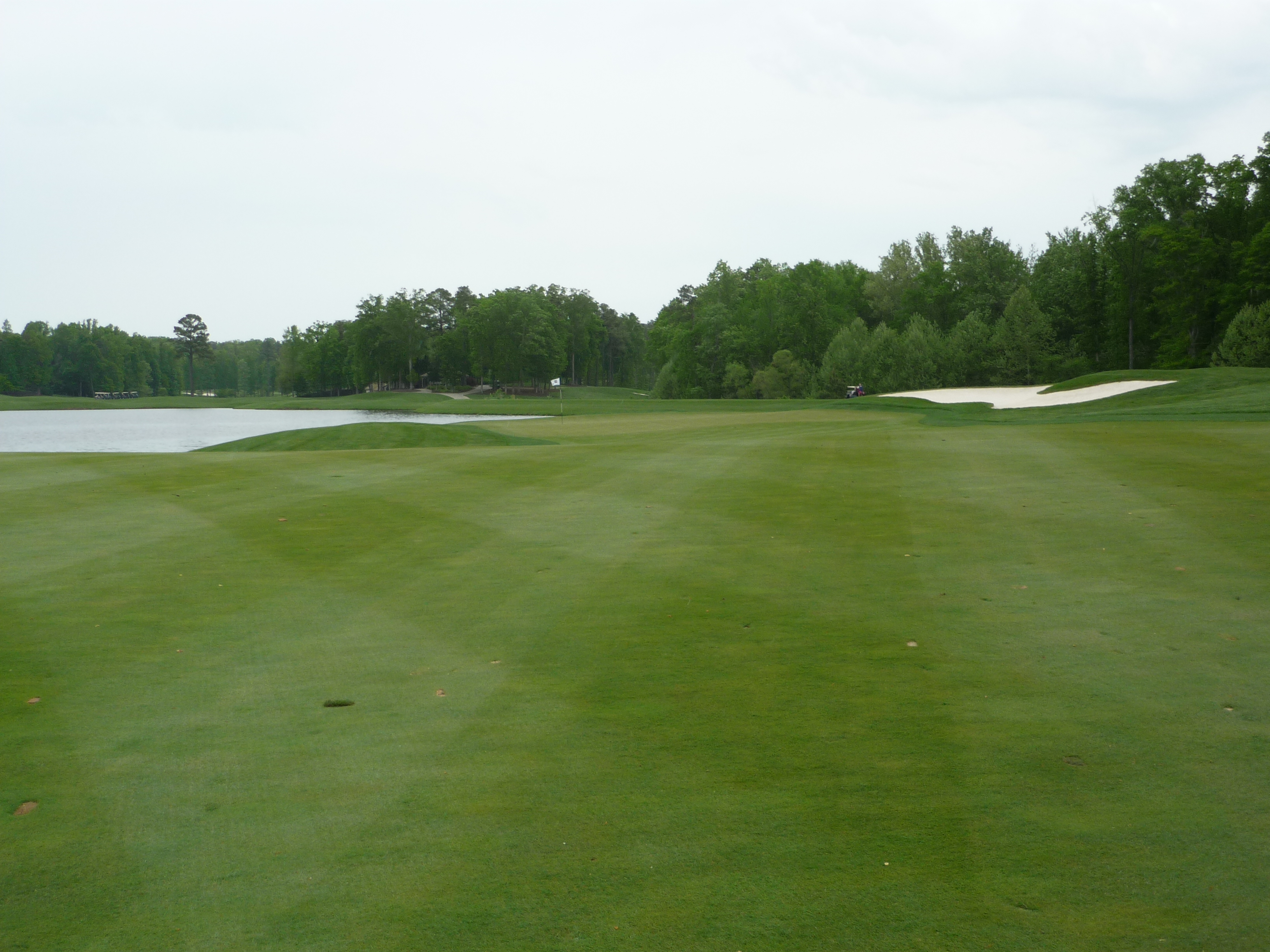 The approach shot plays over a large pond. This is from the first cut of rough on the right. Don’t be short or your ball may well run back into the water.