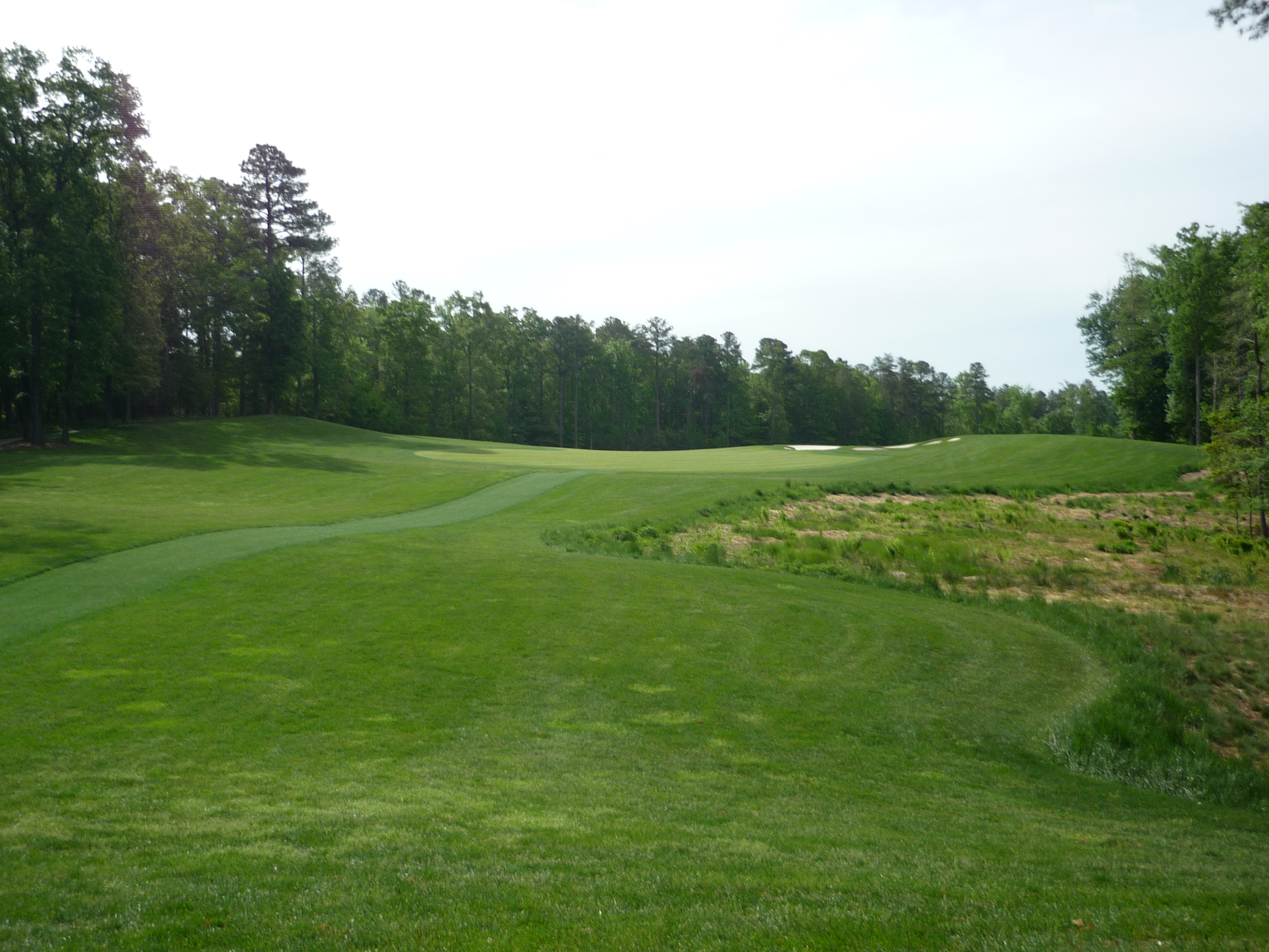 The tee shot is uphill, but the landing area pitches downward. A line just left of the mowed walking path will work great here.