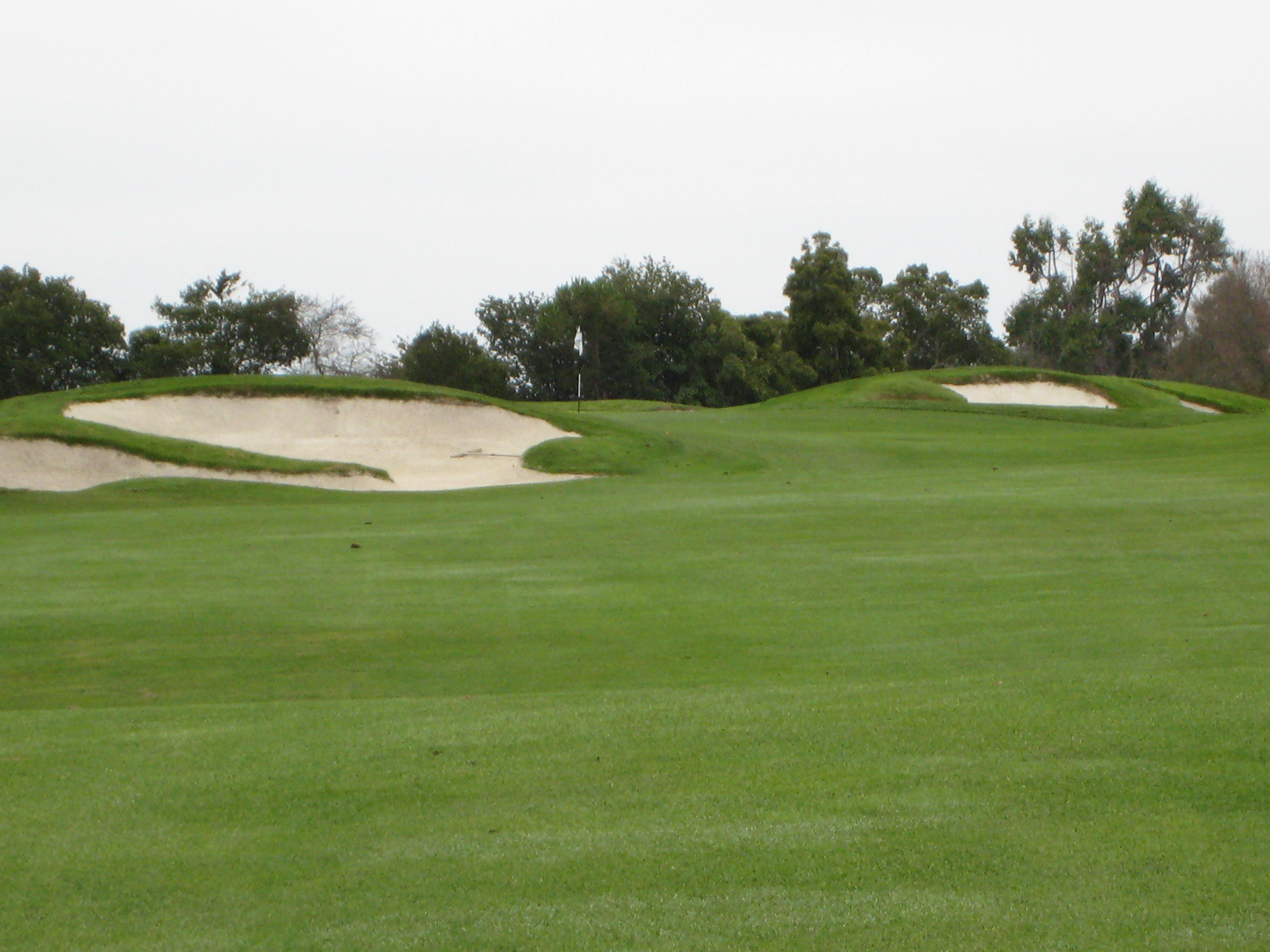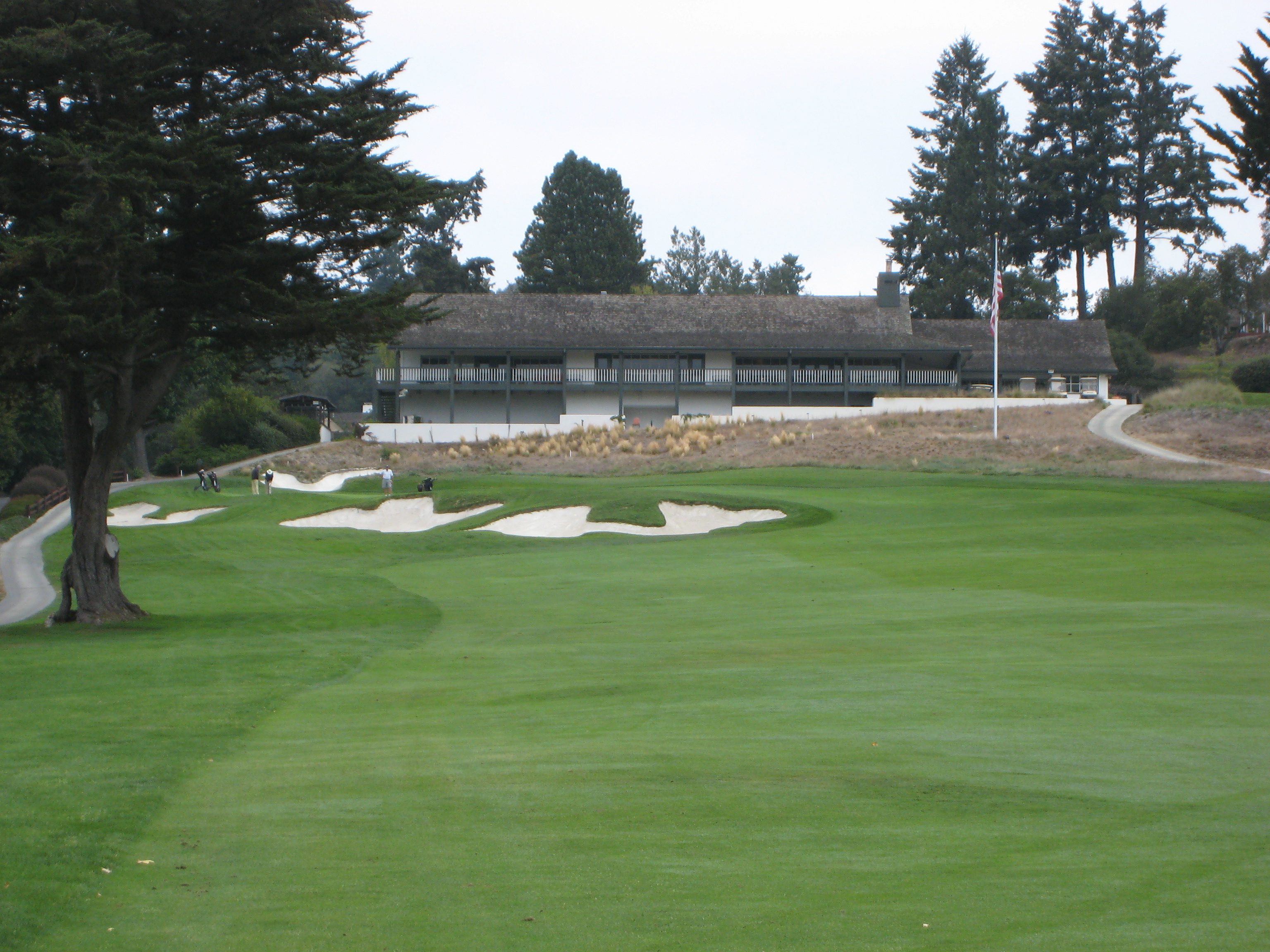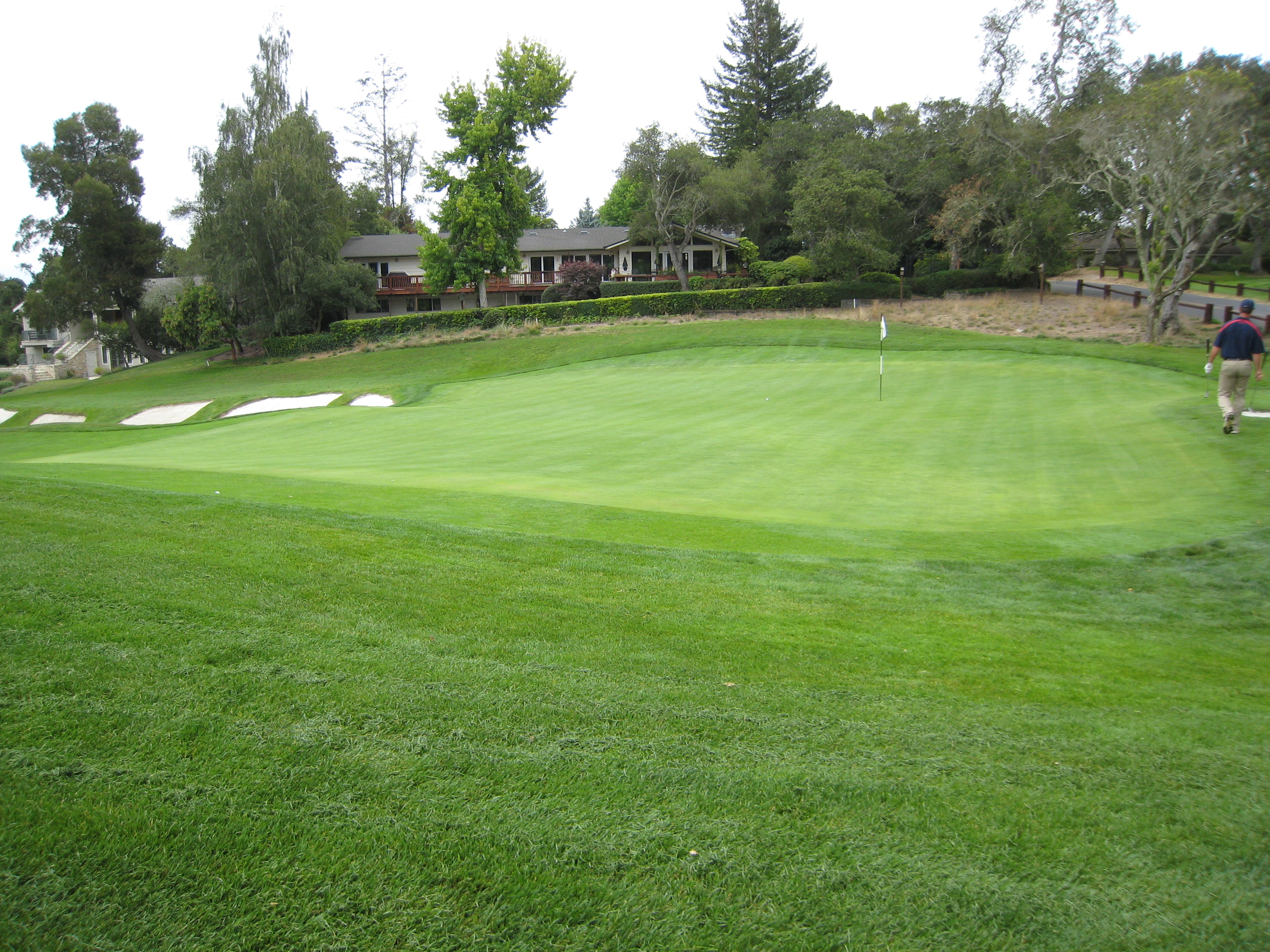 The photo of the approach shot seen below tells its own story. Note the huge bunkers and three-tiered green.