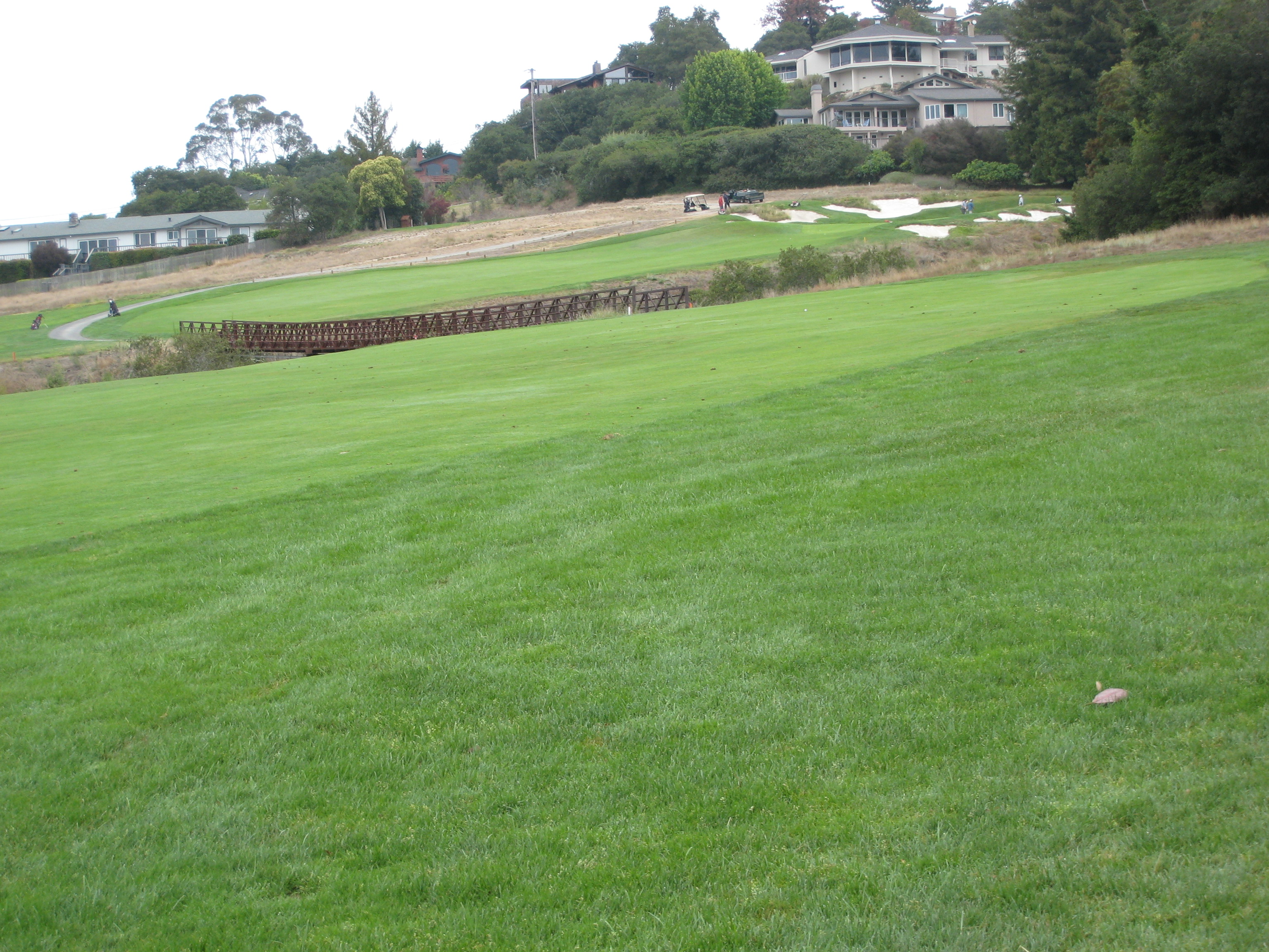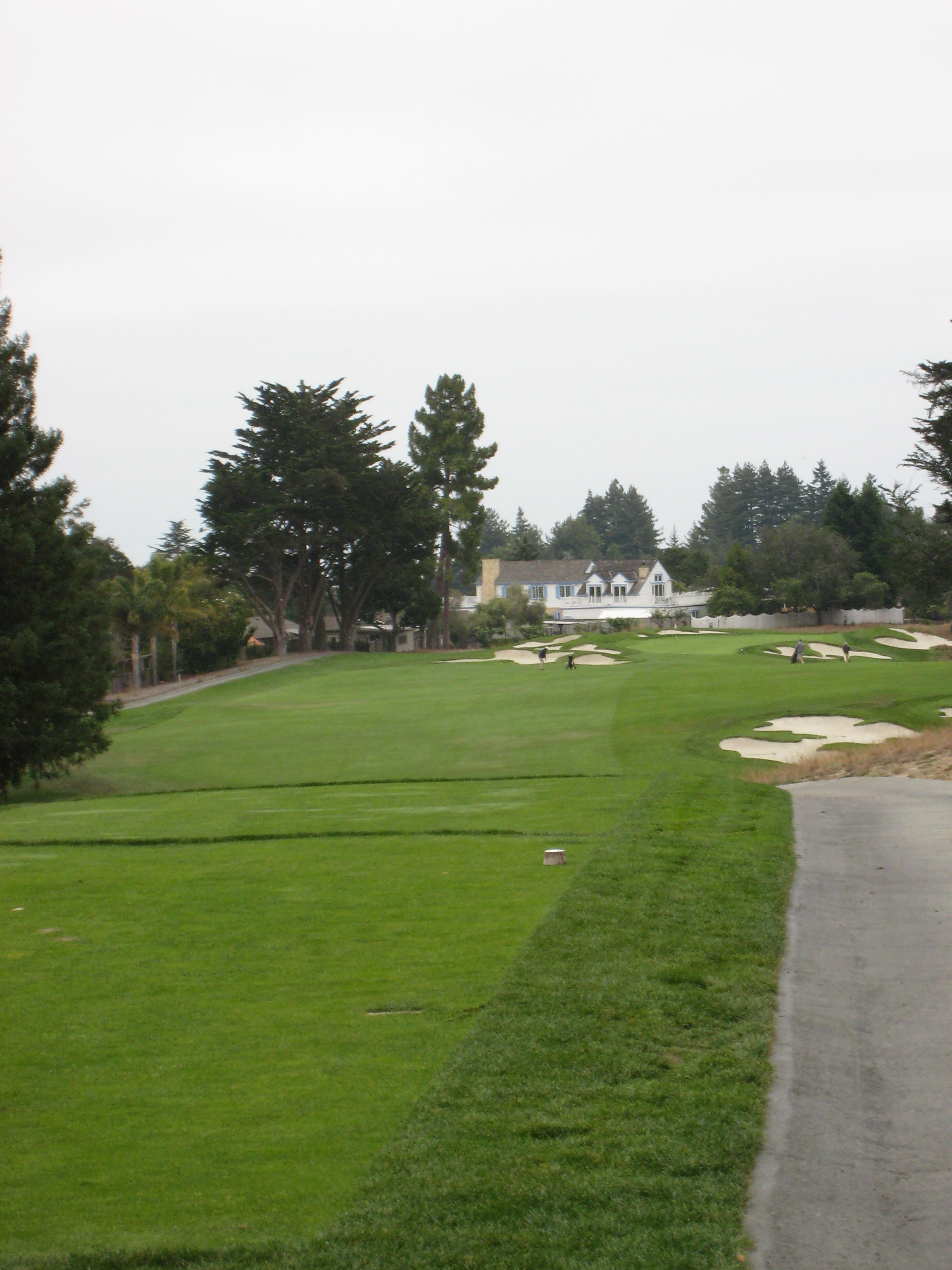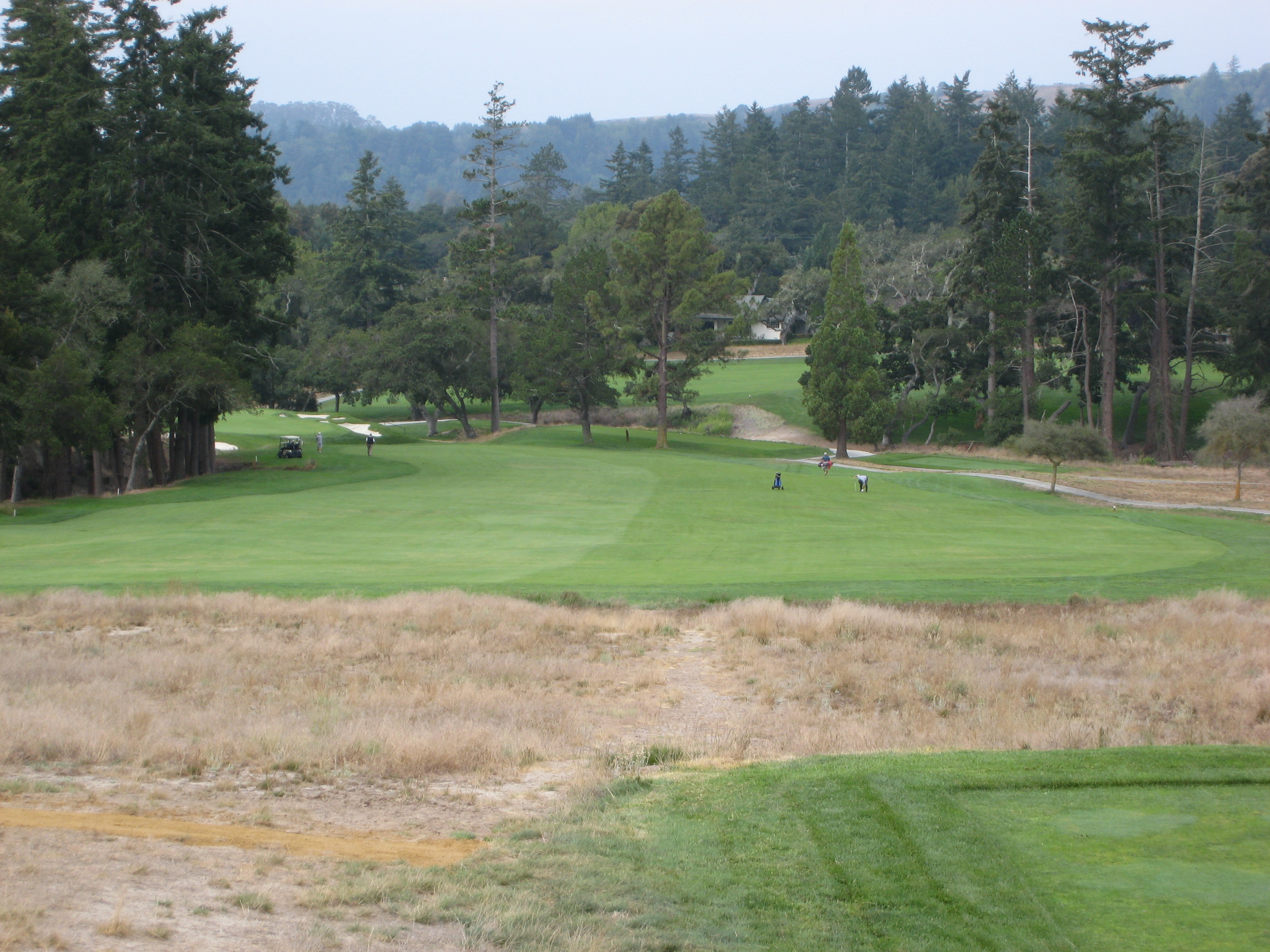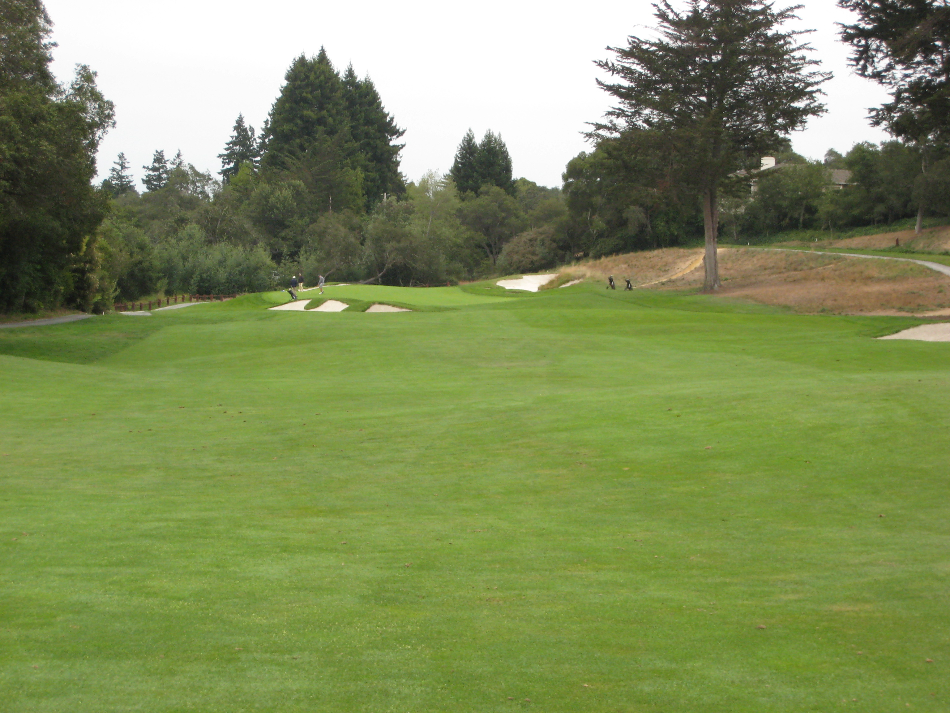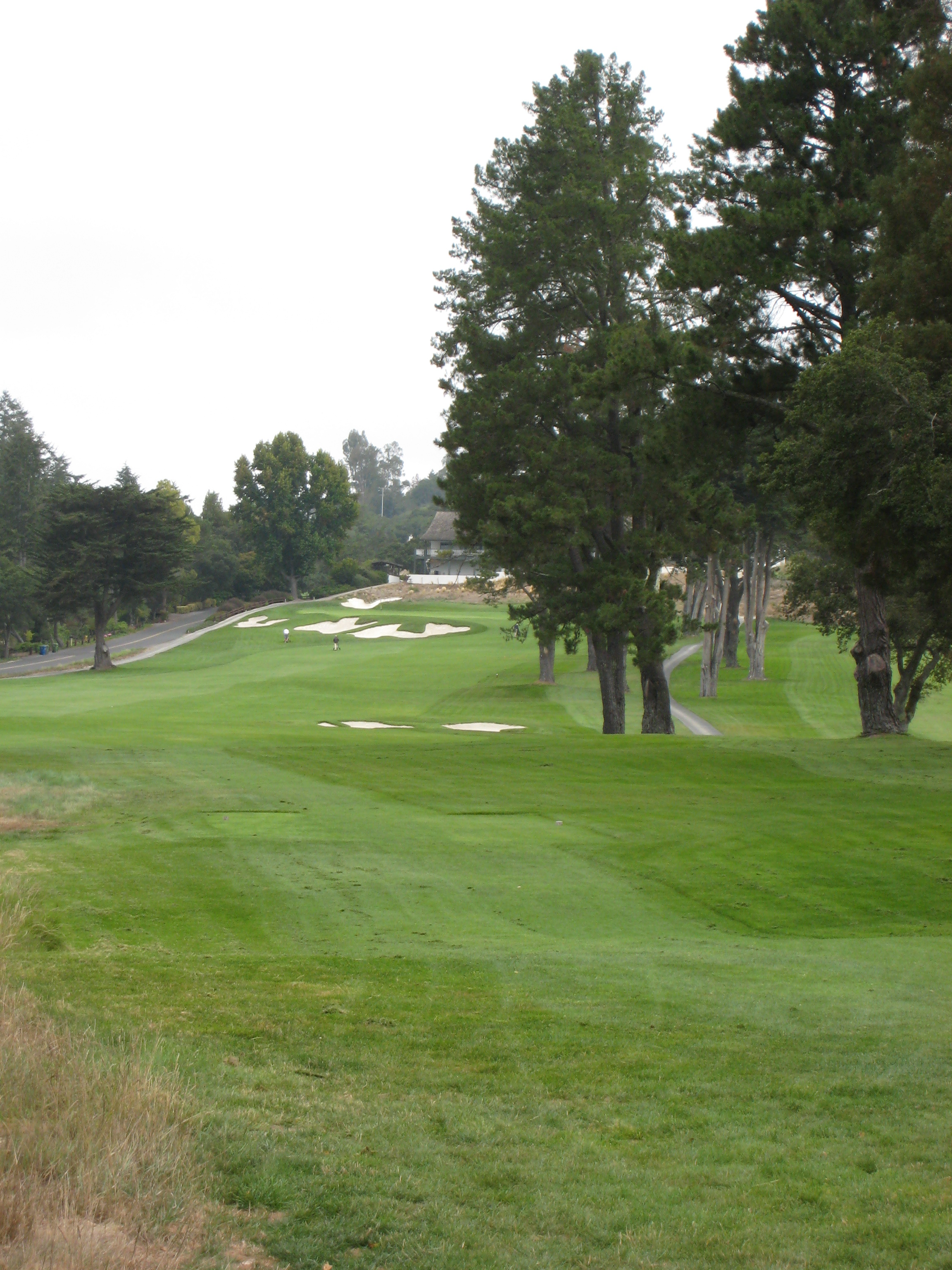The approach is up a steep hill. My playing partner mentioned this would be the longest 379-yard hole I would ever play. He was right, I hit 3 wood from 195 yards out of the rough, so it was about a four-club hill. The players on the right are on the green.