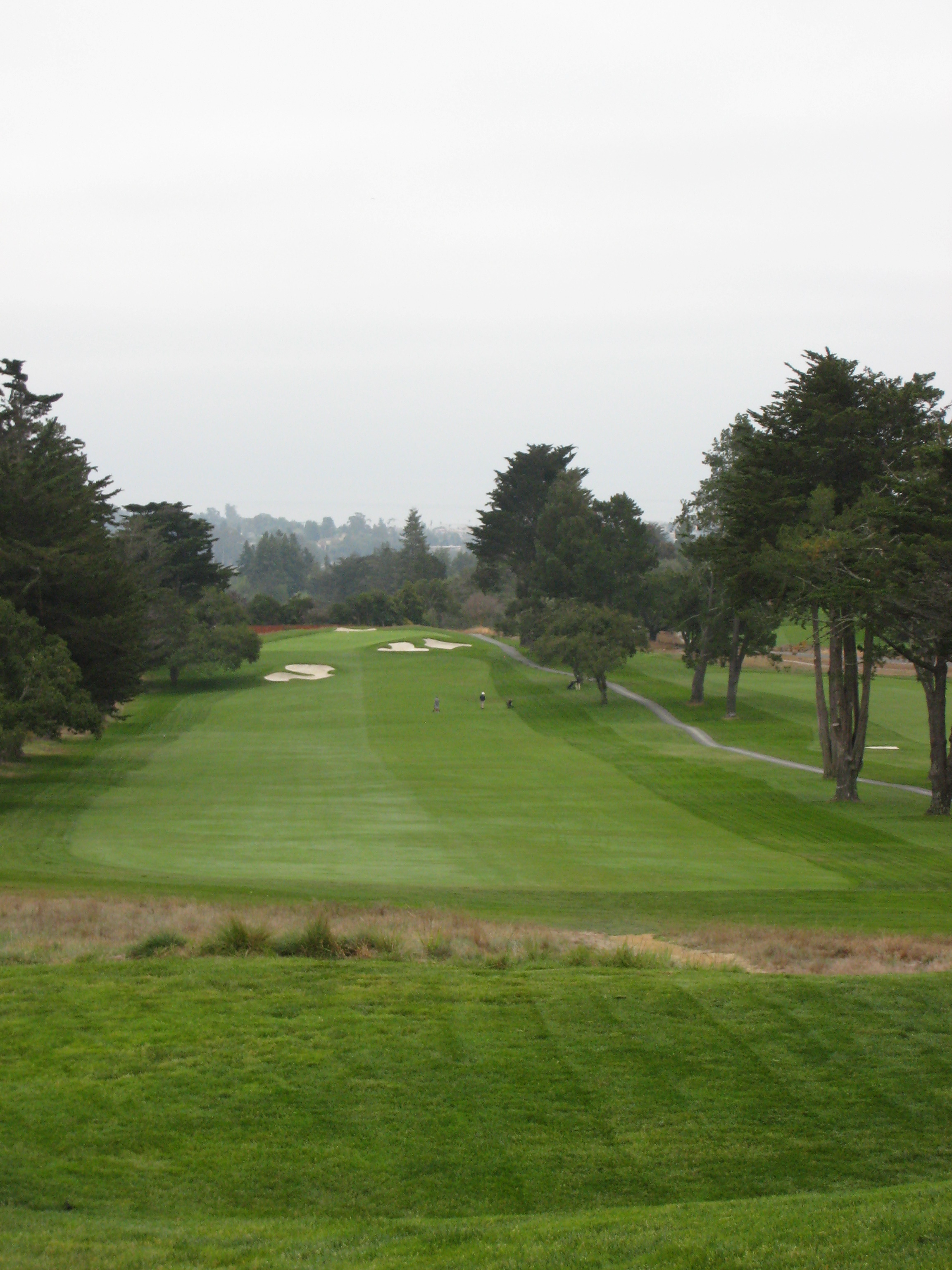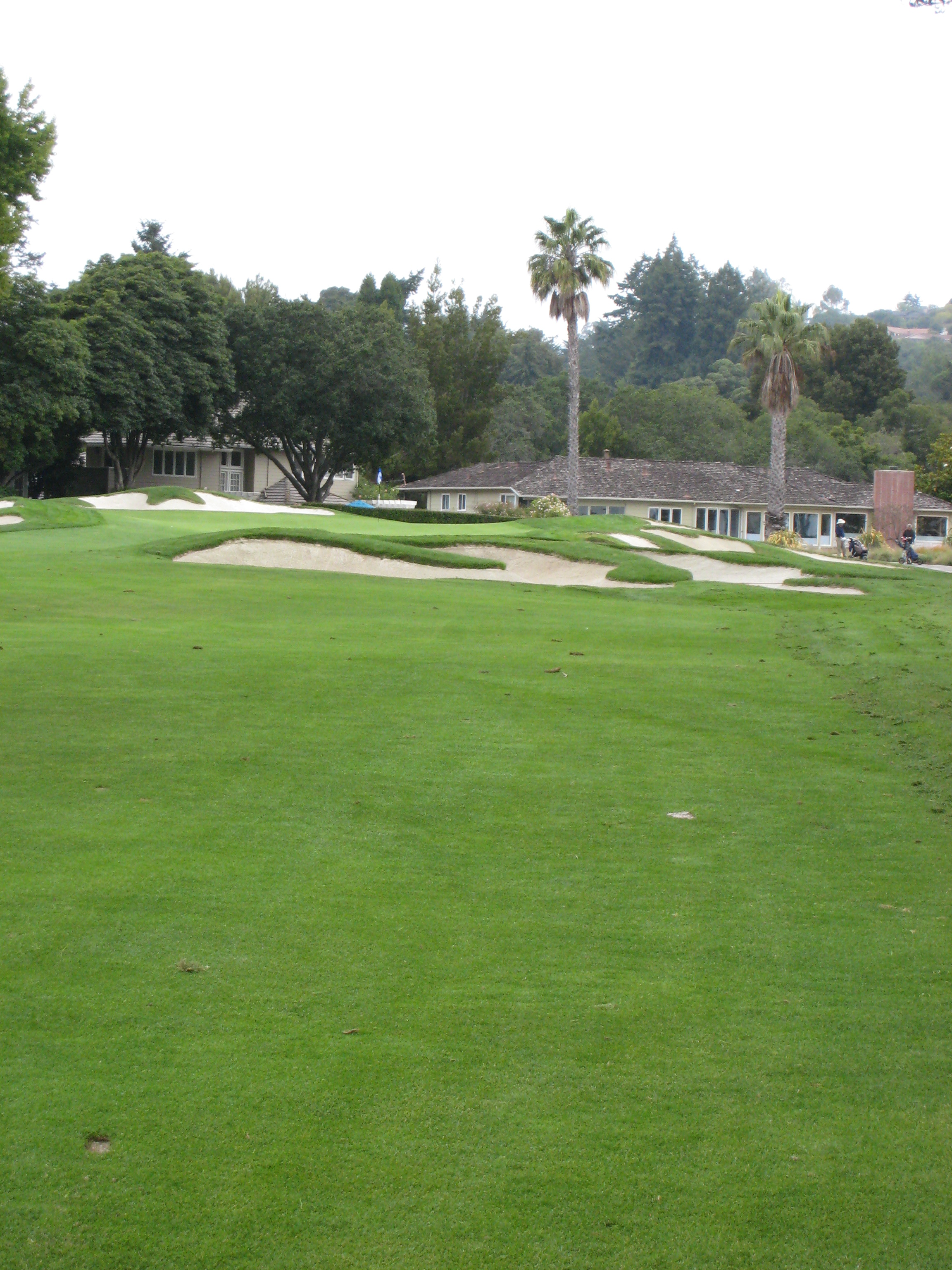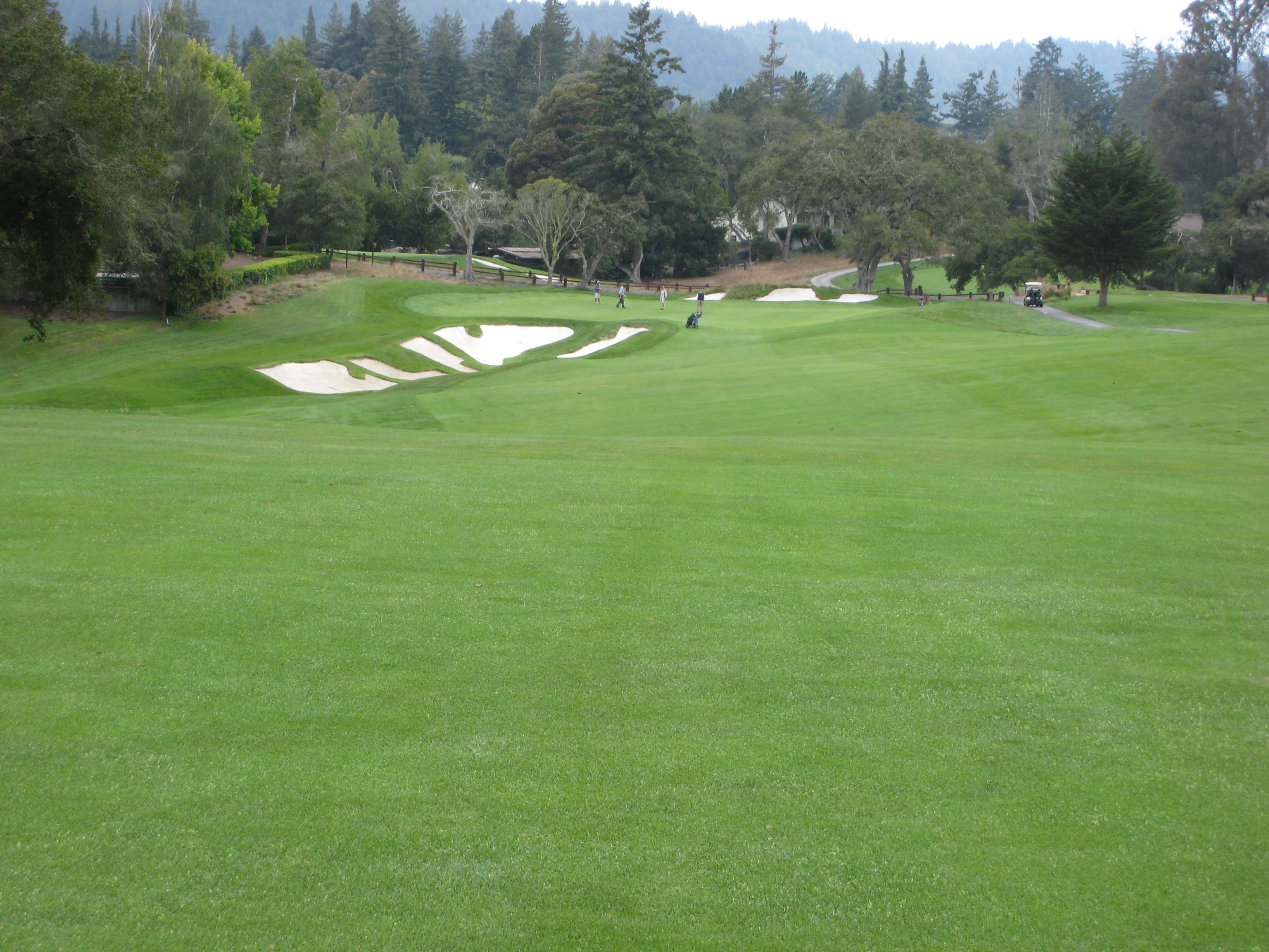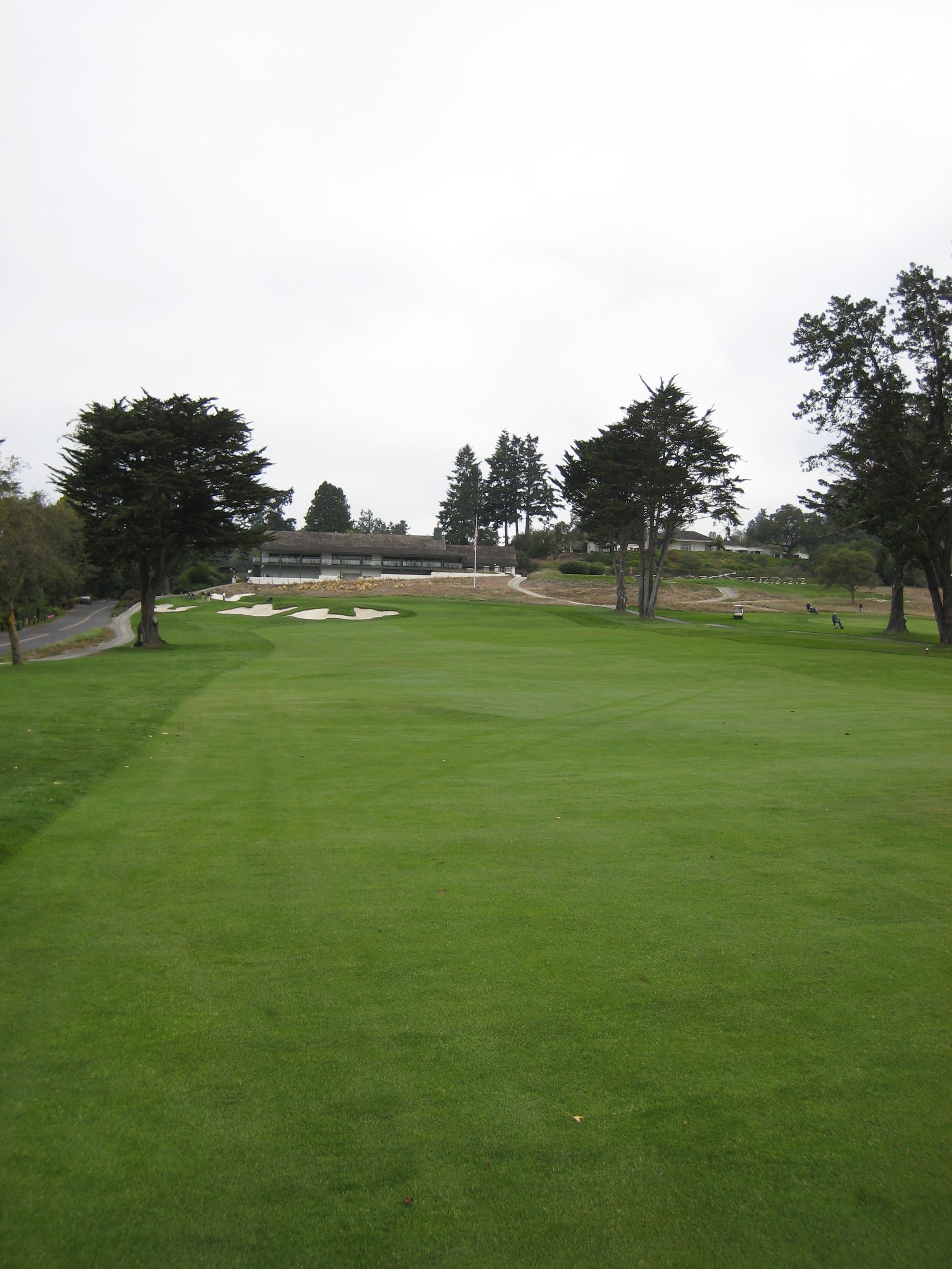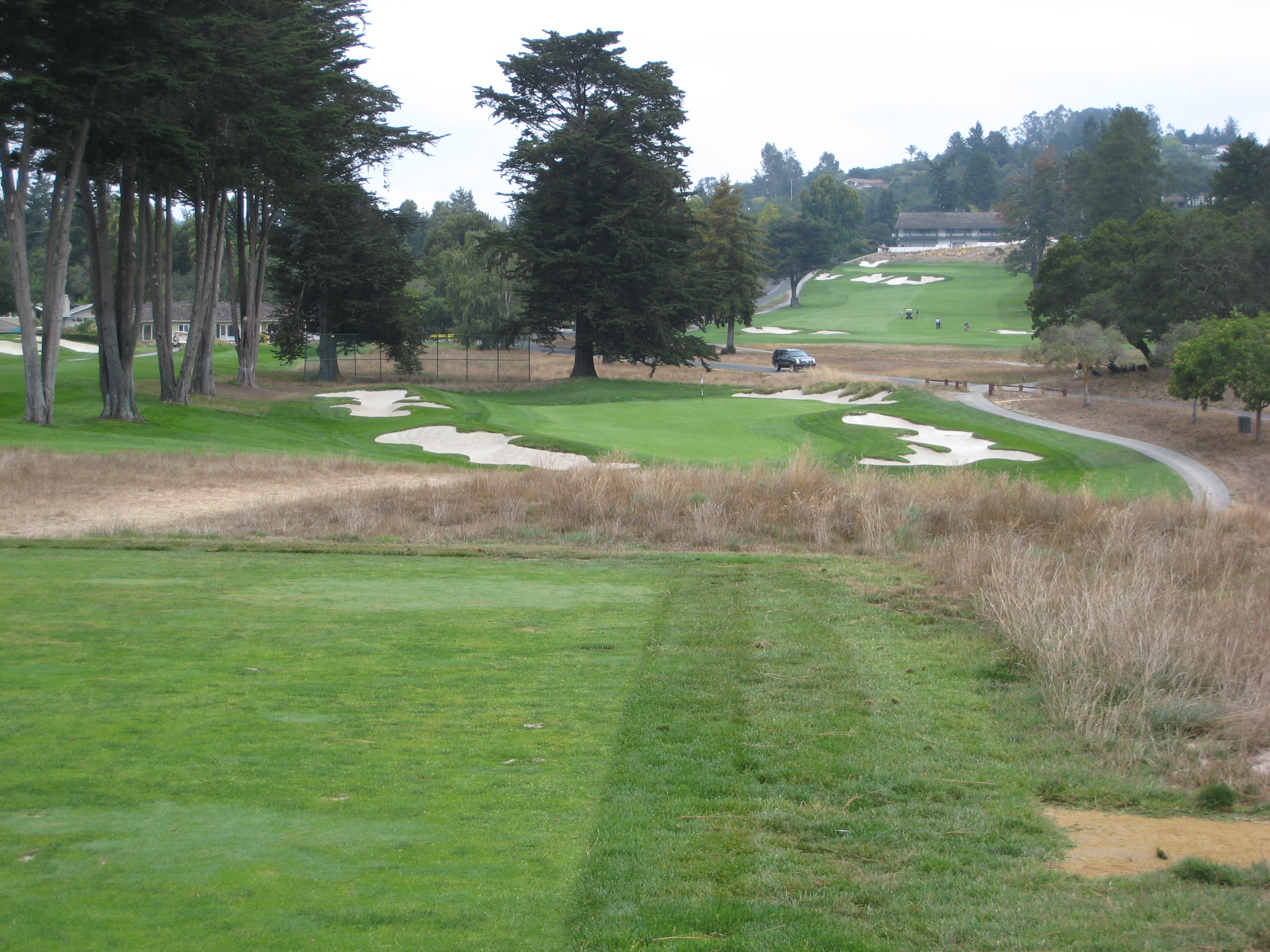 The approach is up a steep hill. My playing partner mentioned this would be the longest 379-yard hole I would ever play. He was right, I hit 3 wood from 195 yards out of the rough, so it was about a four-club hill. The players on the right are on the green.