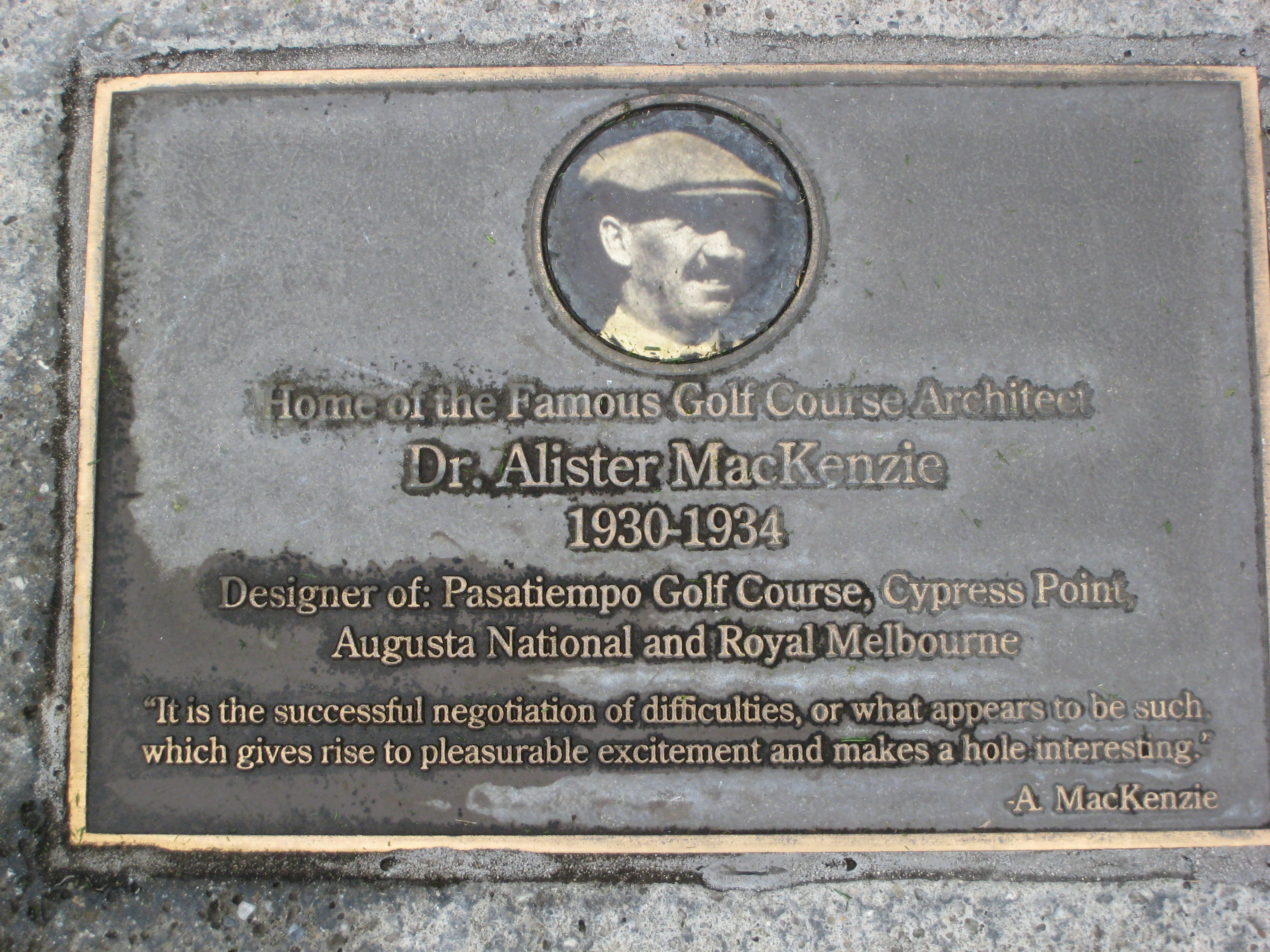 The sixth hole has a piece of history associated with it. It is on this hole that Dr. MacKenzie lived until his death. His home is very close to the edge of the hole and is noted with a plaque as seen below.