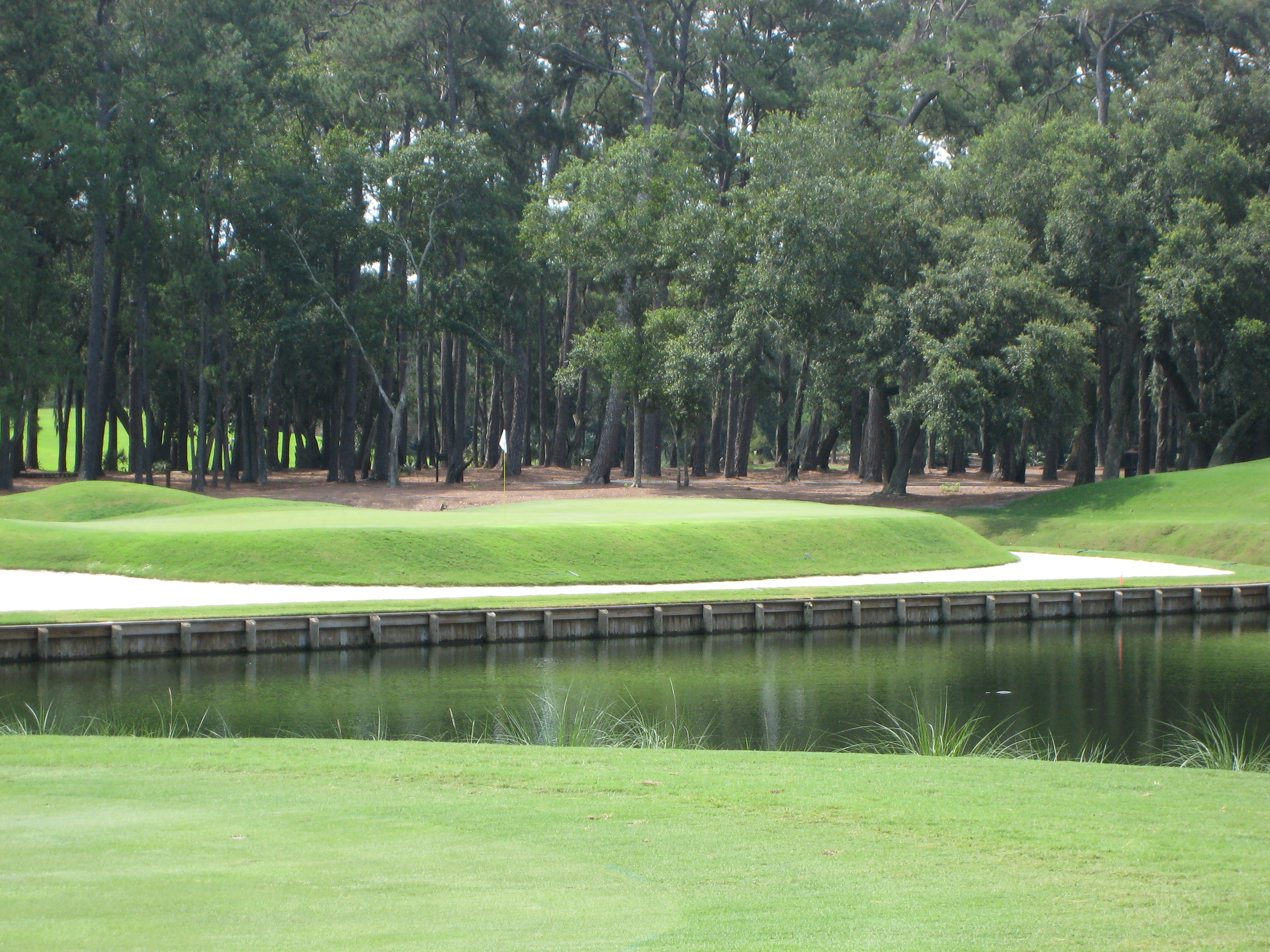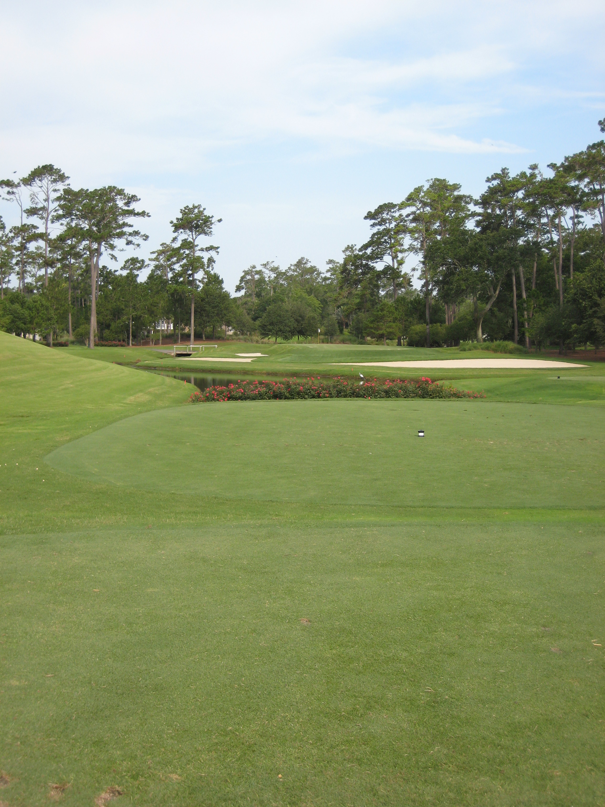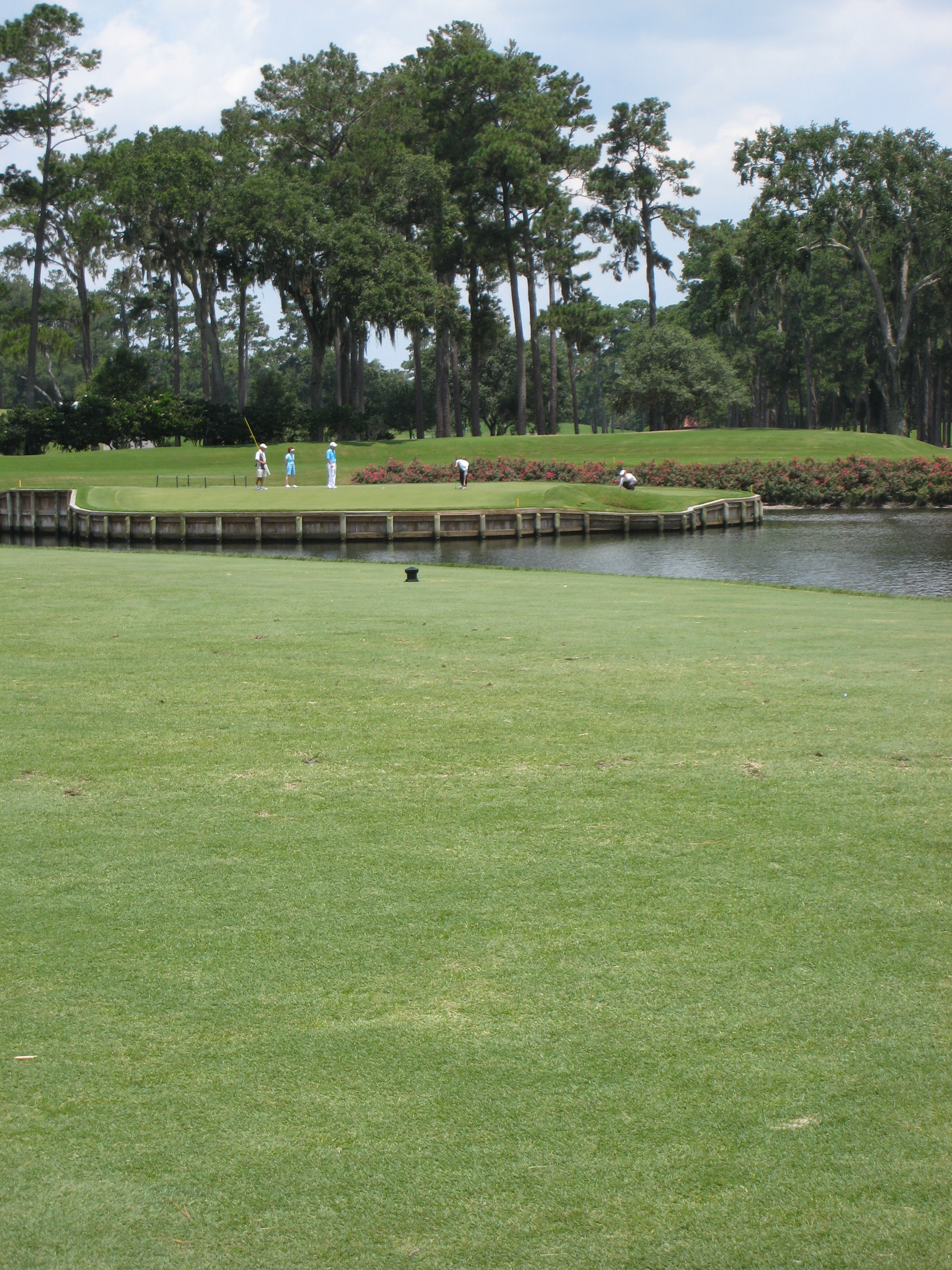 The green has a fair bit of slope in the front and down the middle. It is really important to pay attention to that for your putt or chip with the water so close.