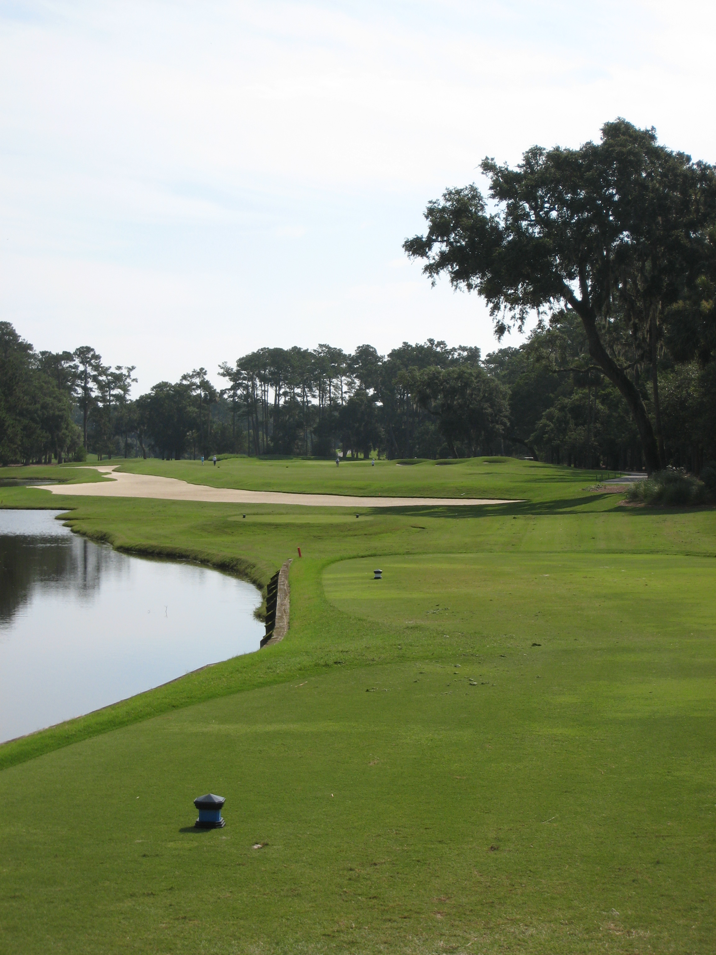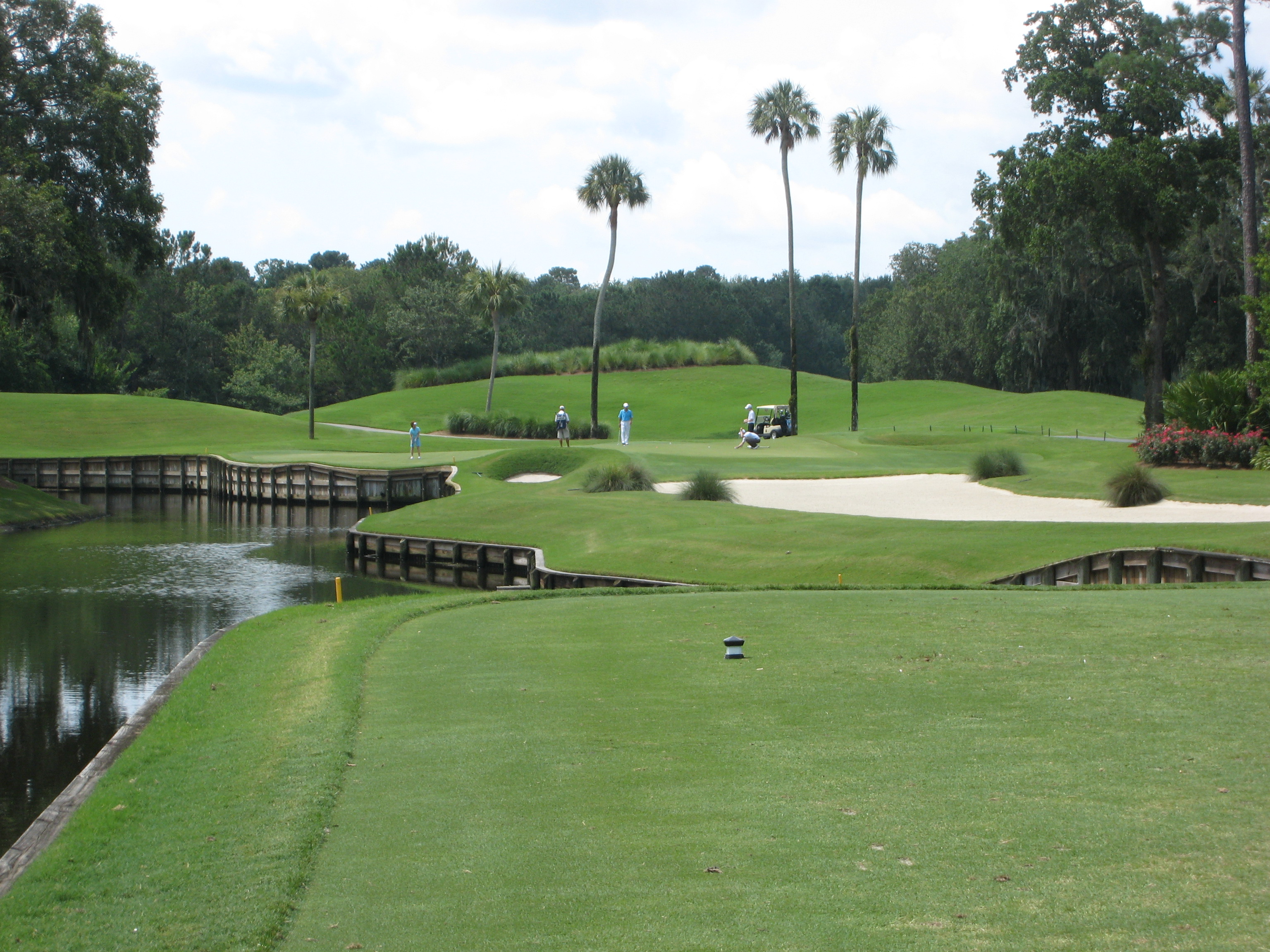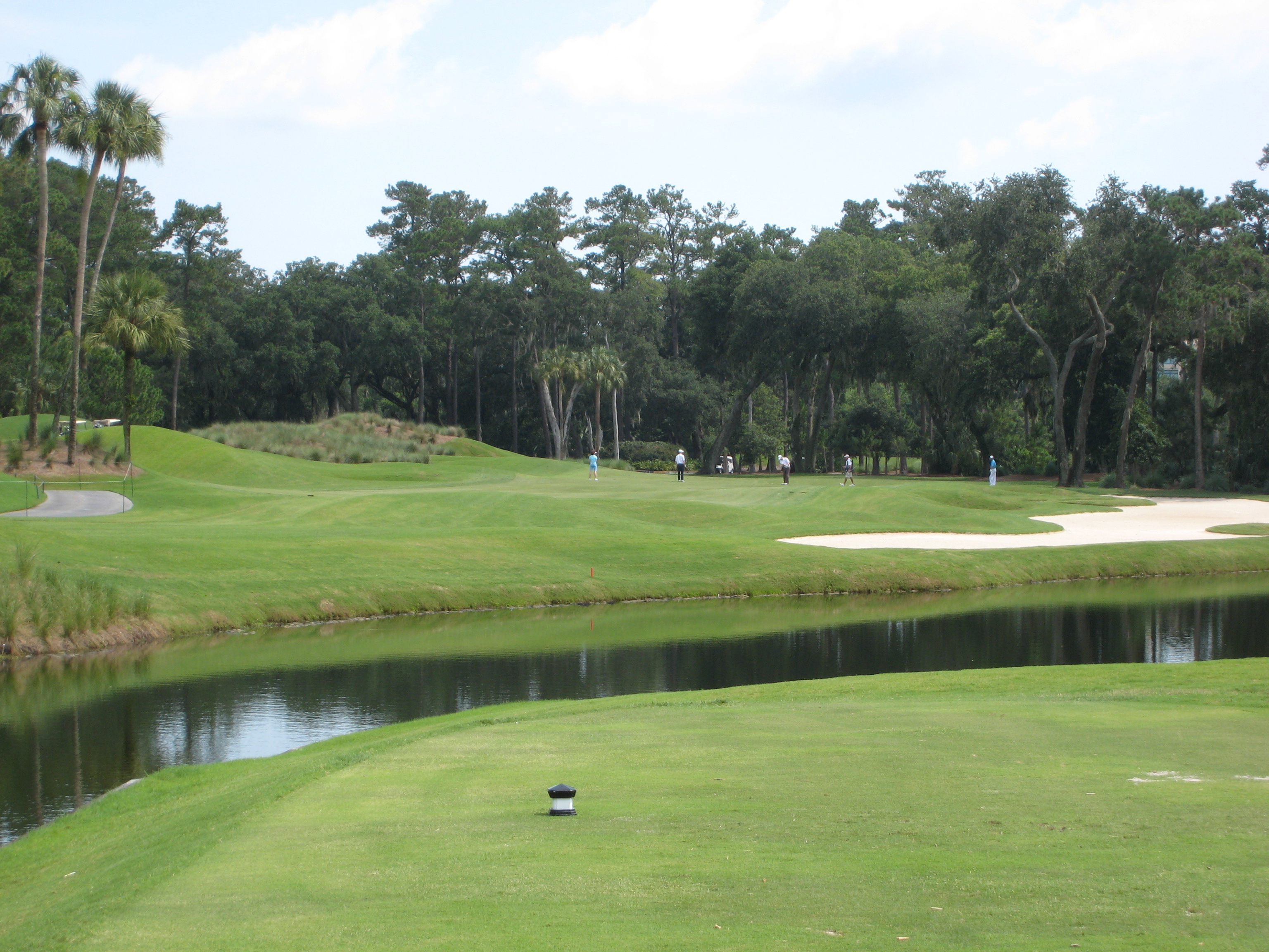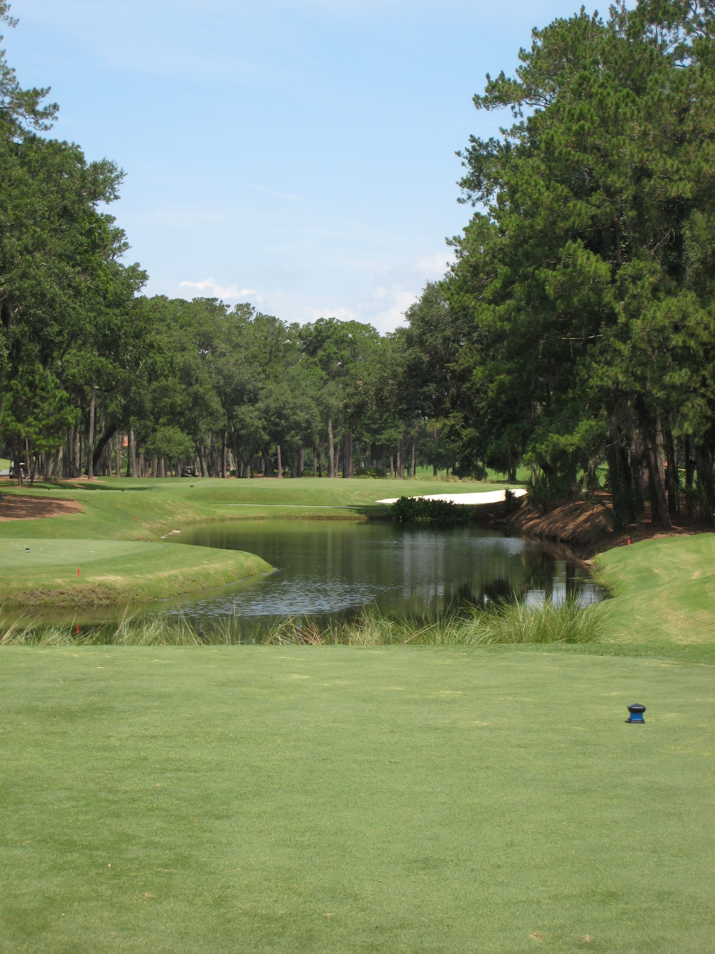 The green has a fair bit of slope in the front and down the middle. It is really important to pay attention to that for your putt or chip with the water so close.