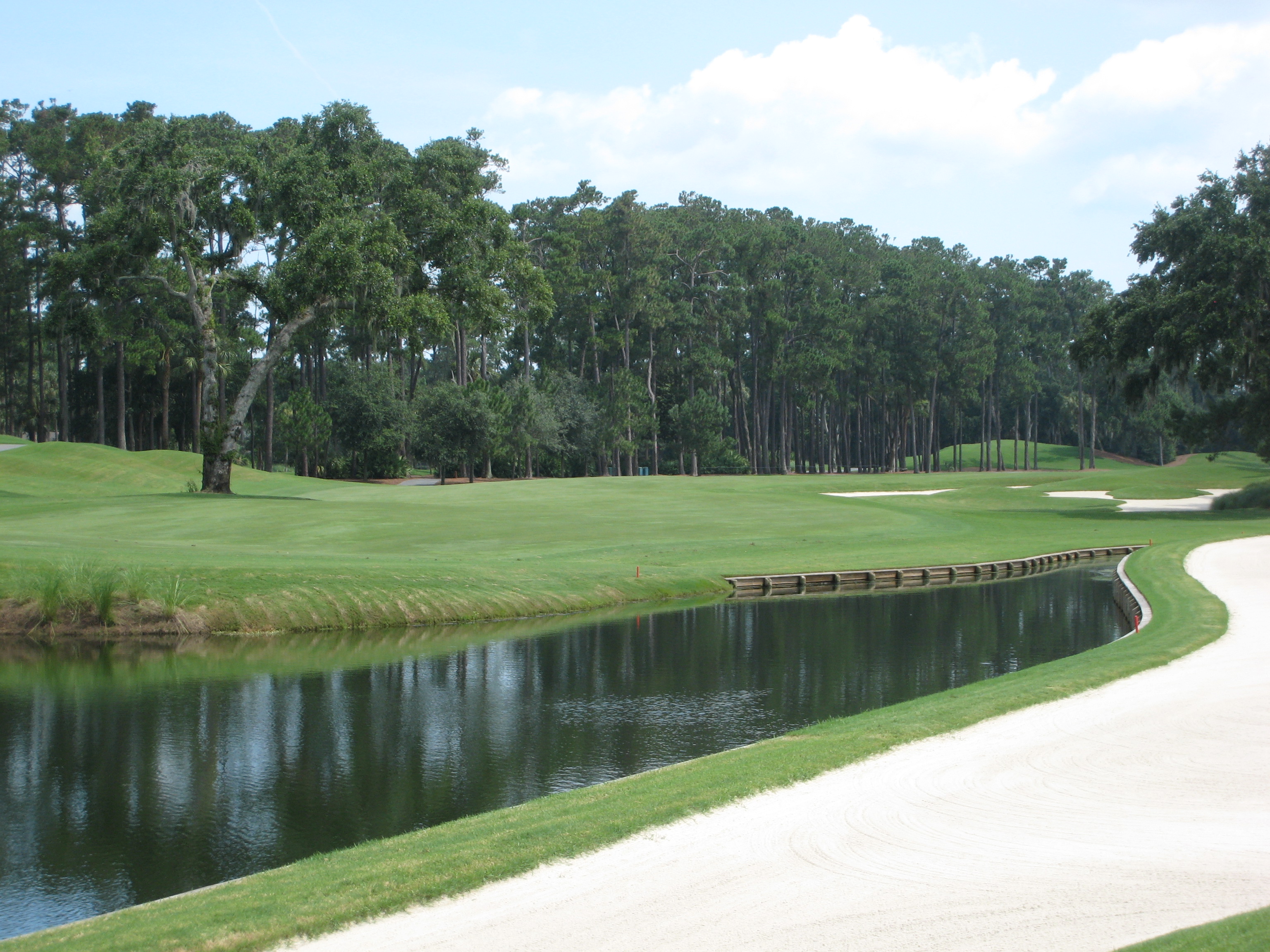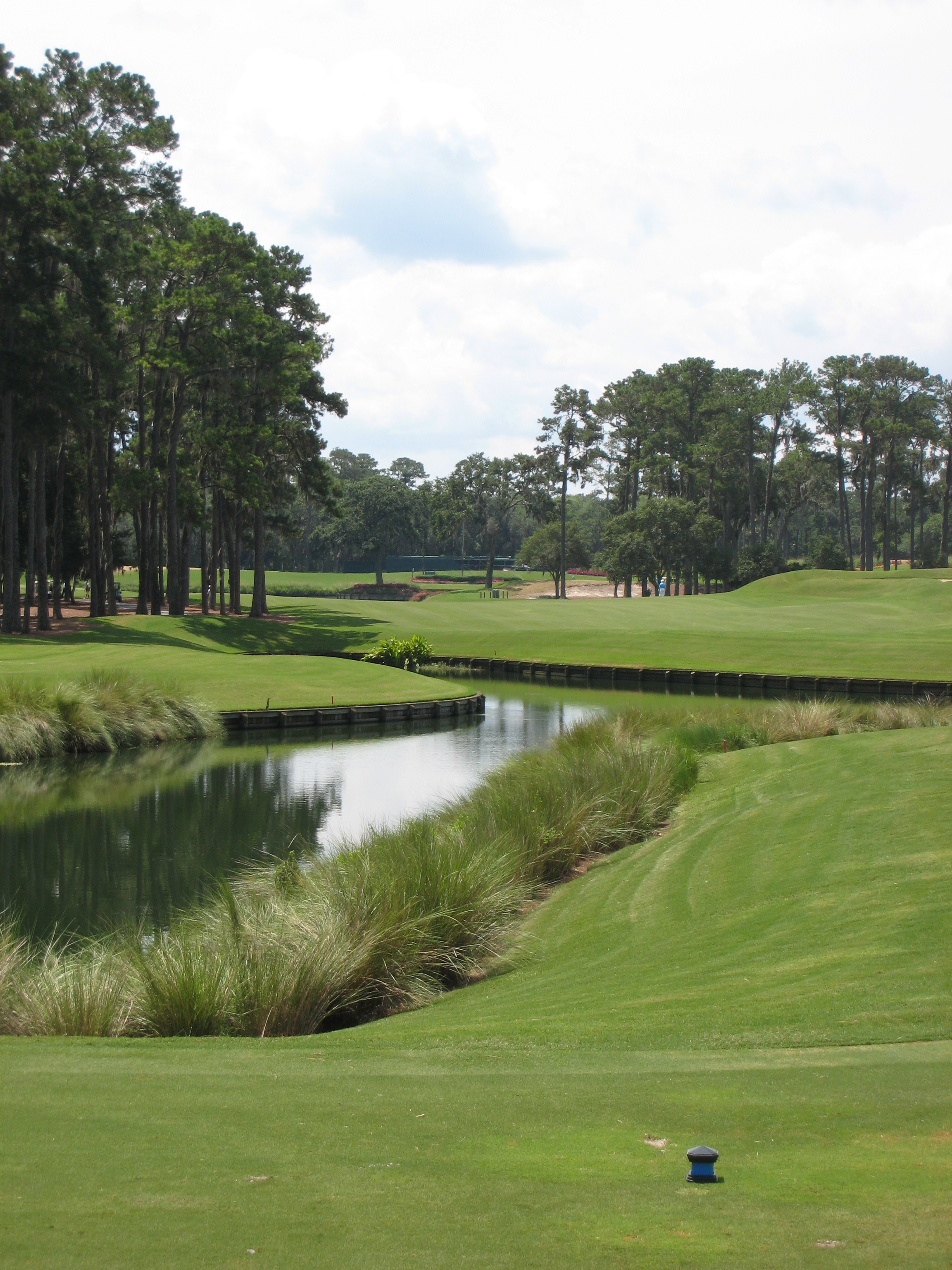 This tee shot continues the strong par fives at TPC. Bust a draw down the middle and there may be a decision to go for the green.