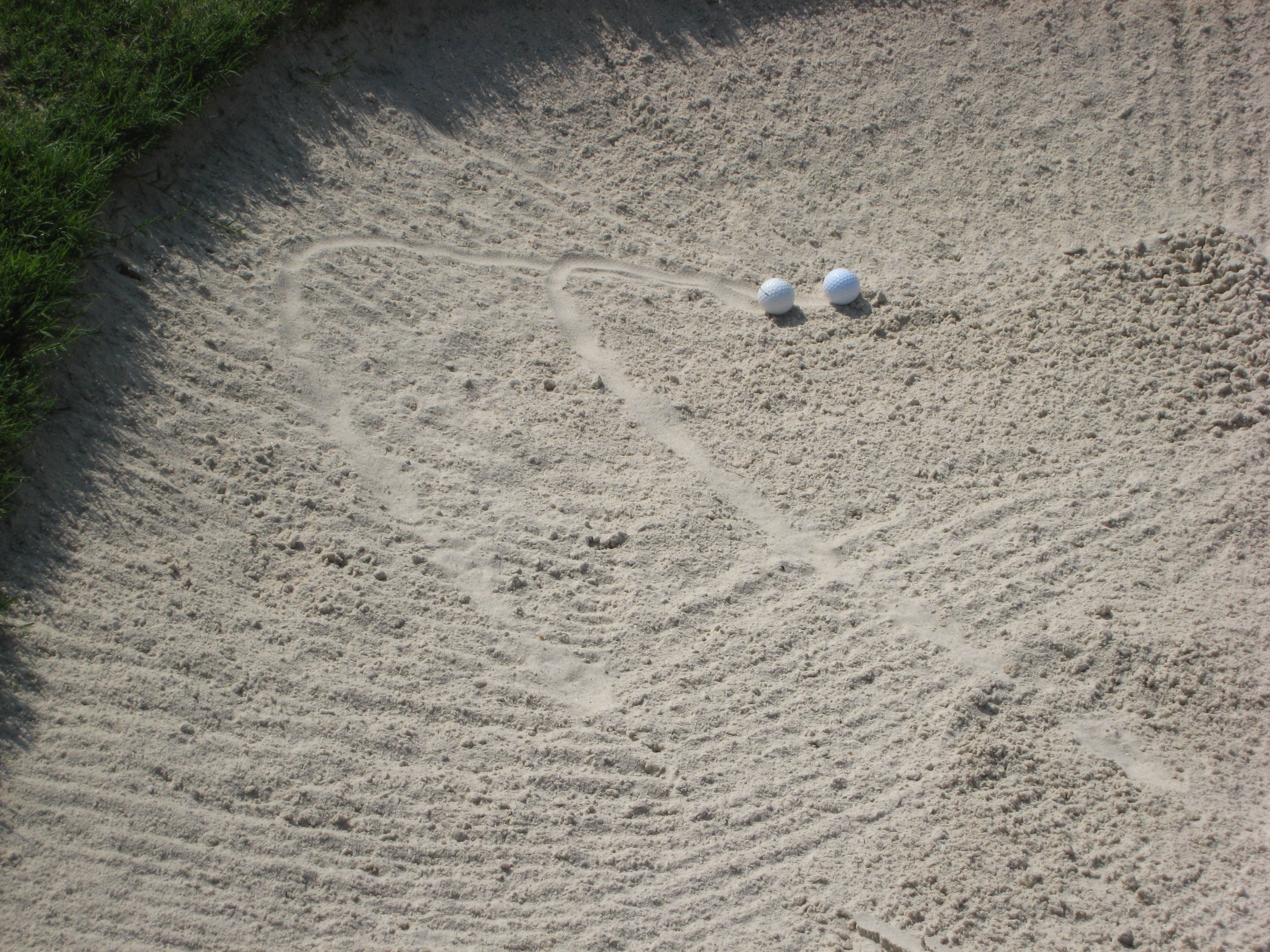 I had one of the more memorable situations here with one of my playing partners. The photo below is our balls in the right bunker. Even our trails in the sand were nearly identical.