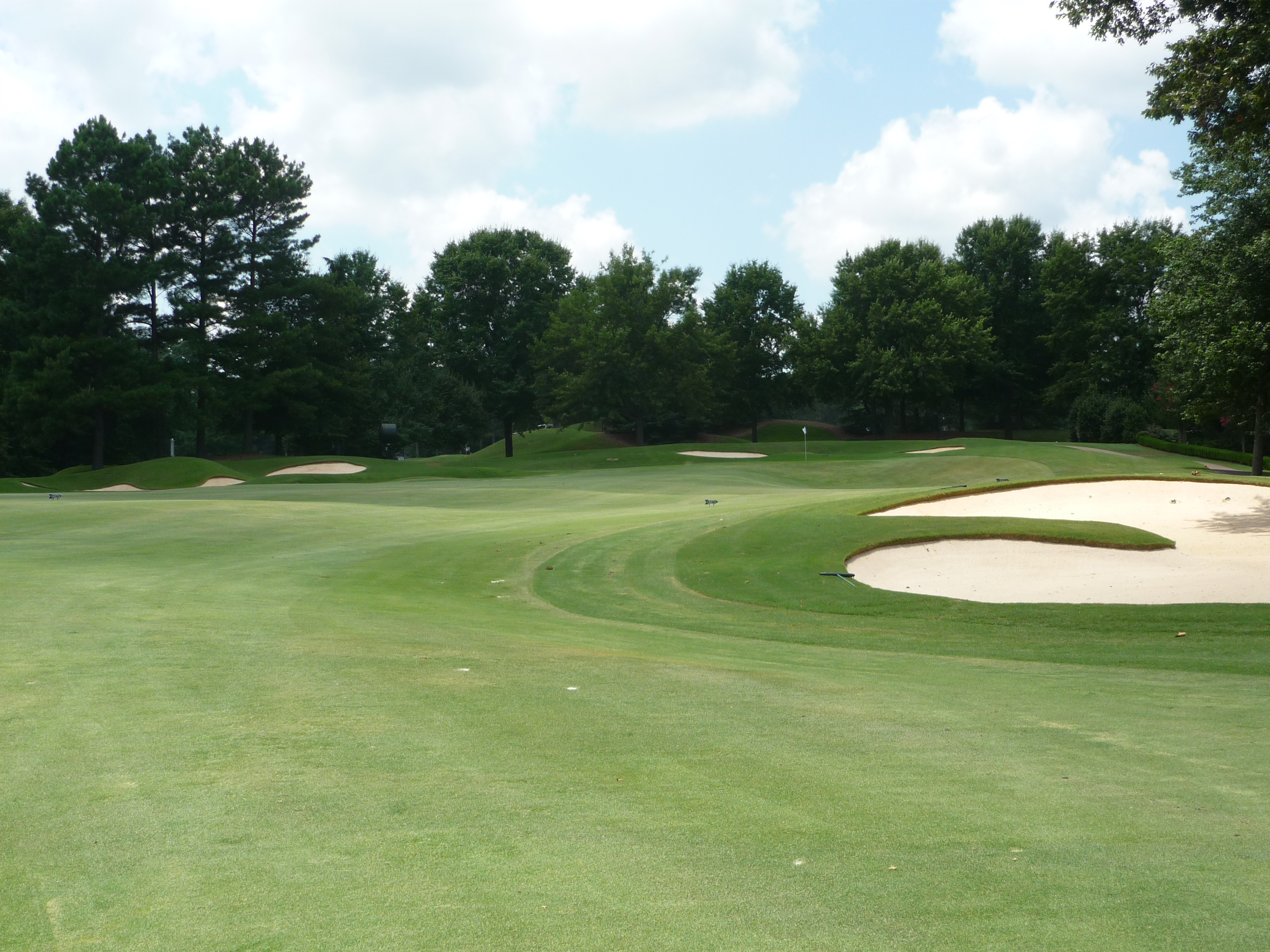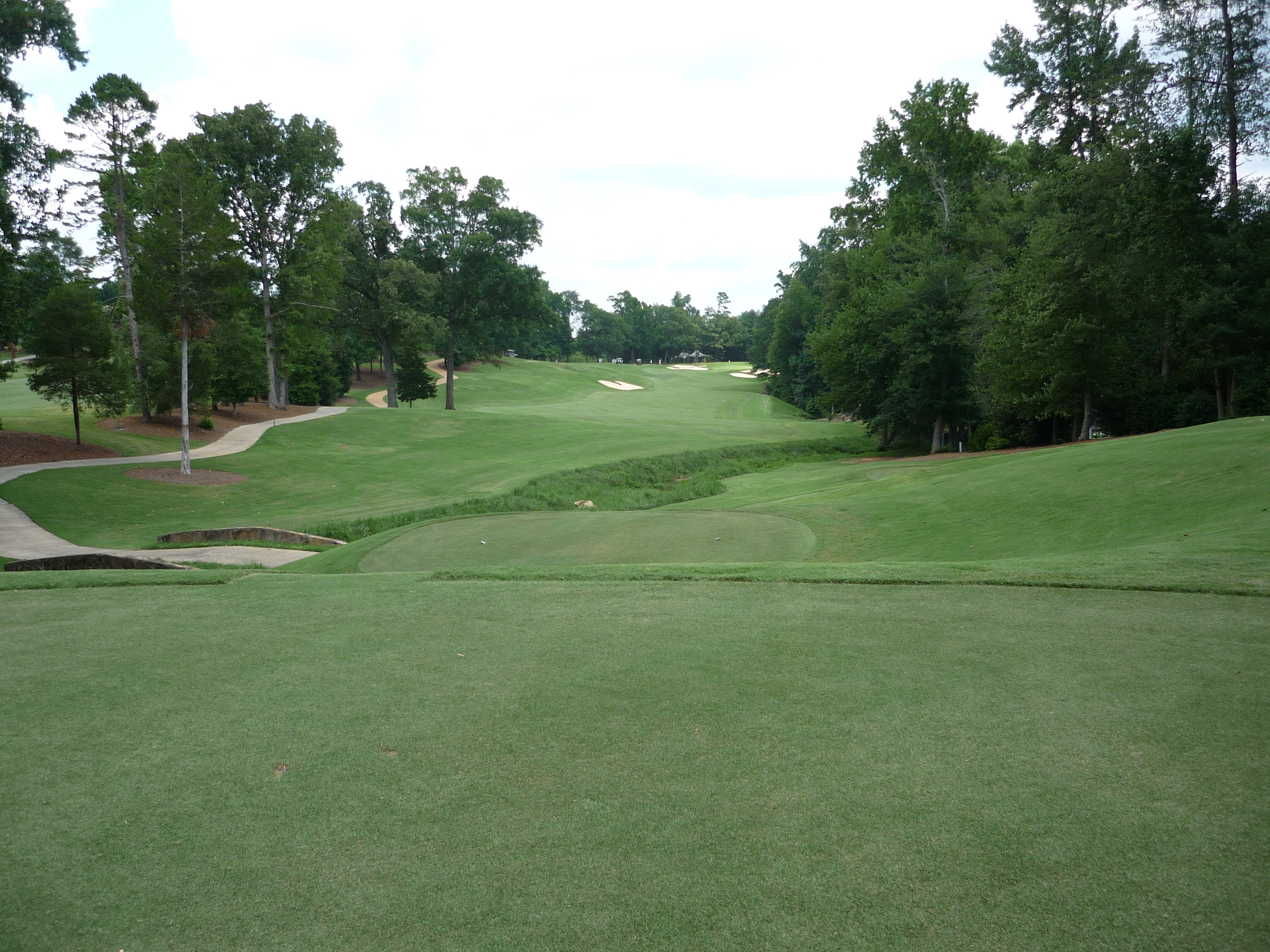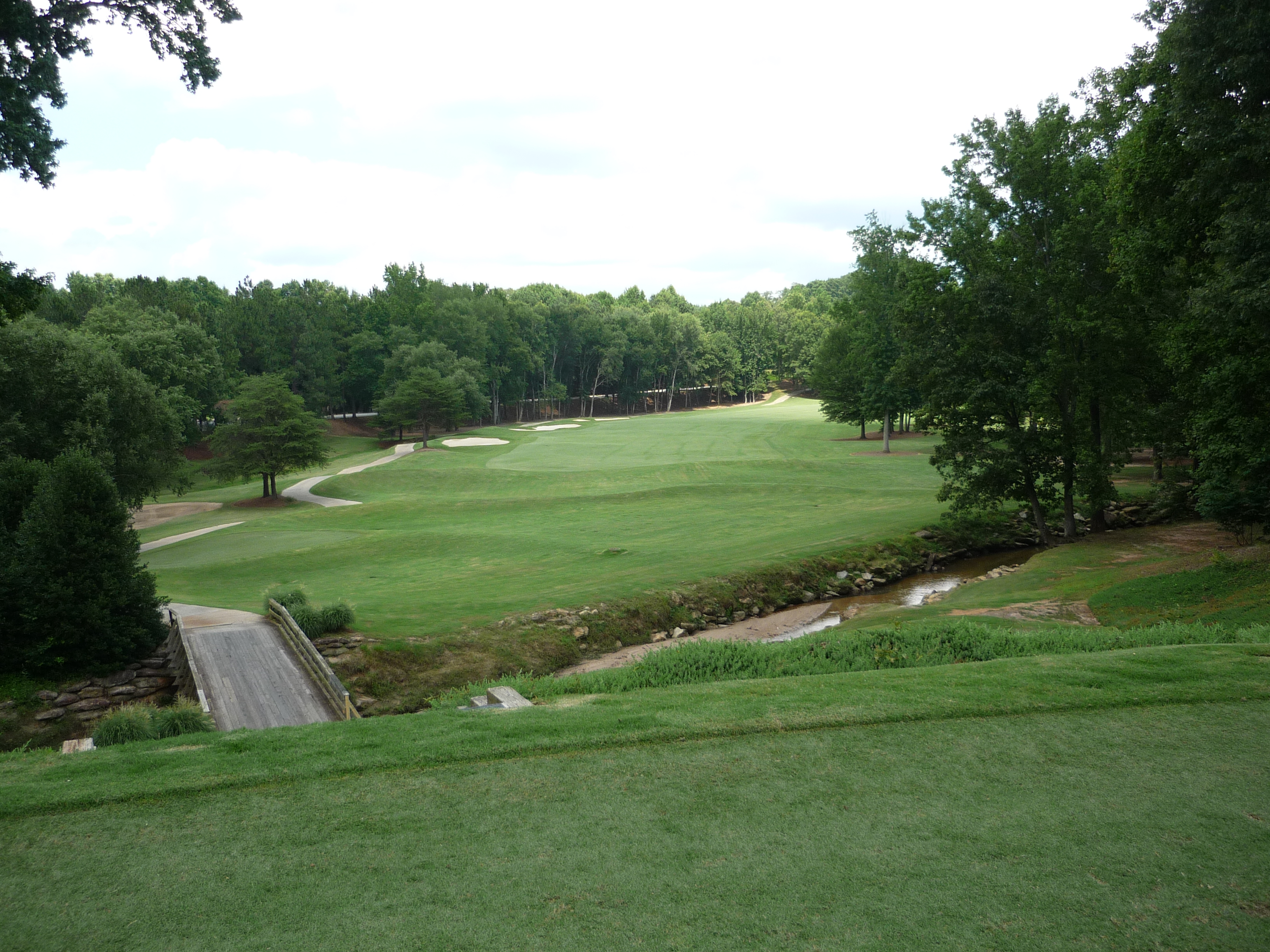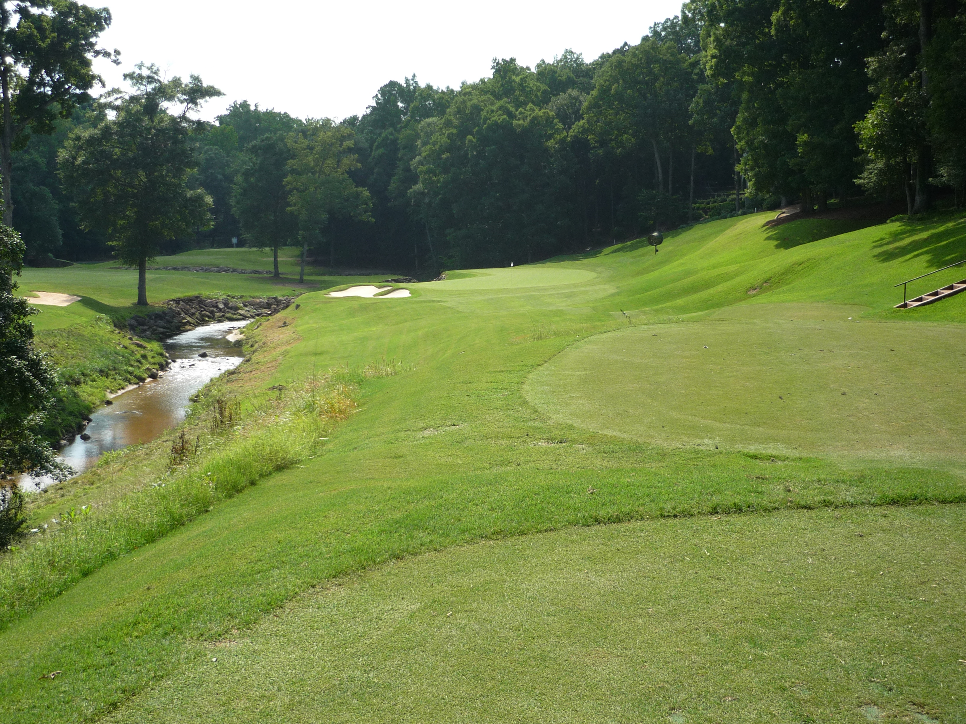 This is a really difficult shot. The woods on the right are in play and a creek runs all down the left side. Hit one right at the bunker with a little draw if you can.