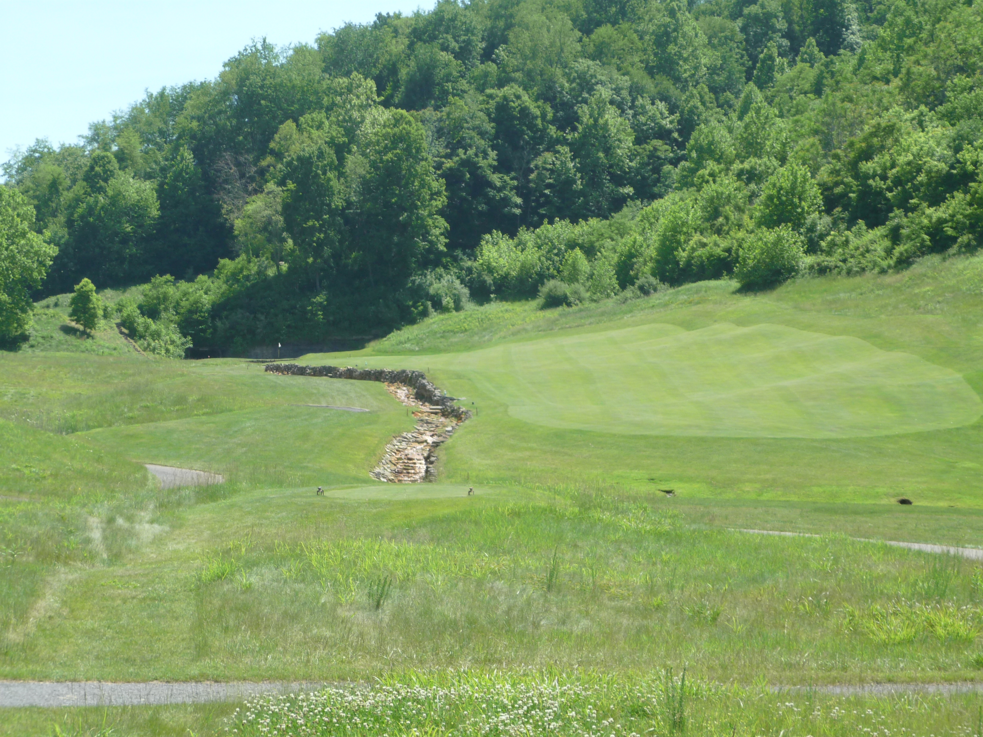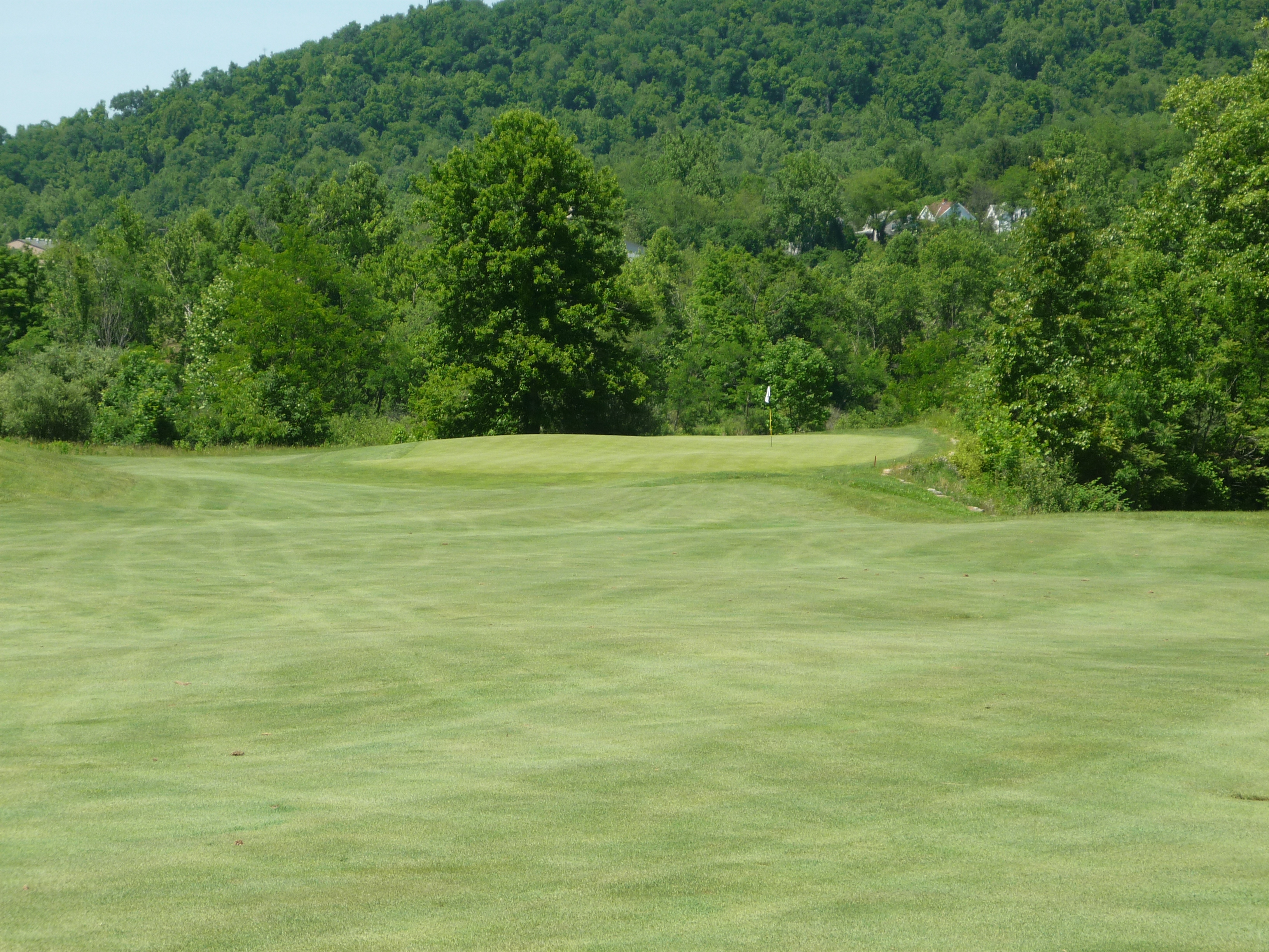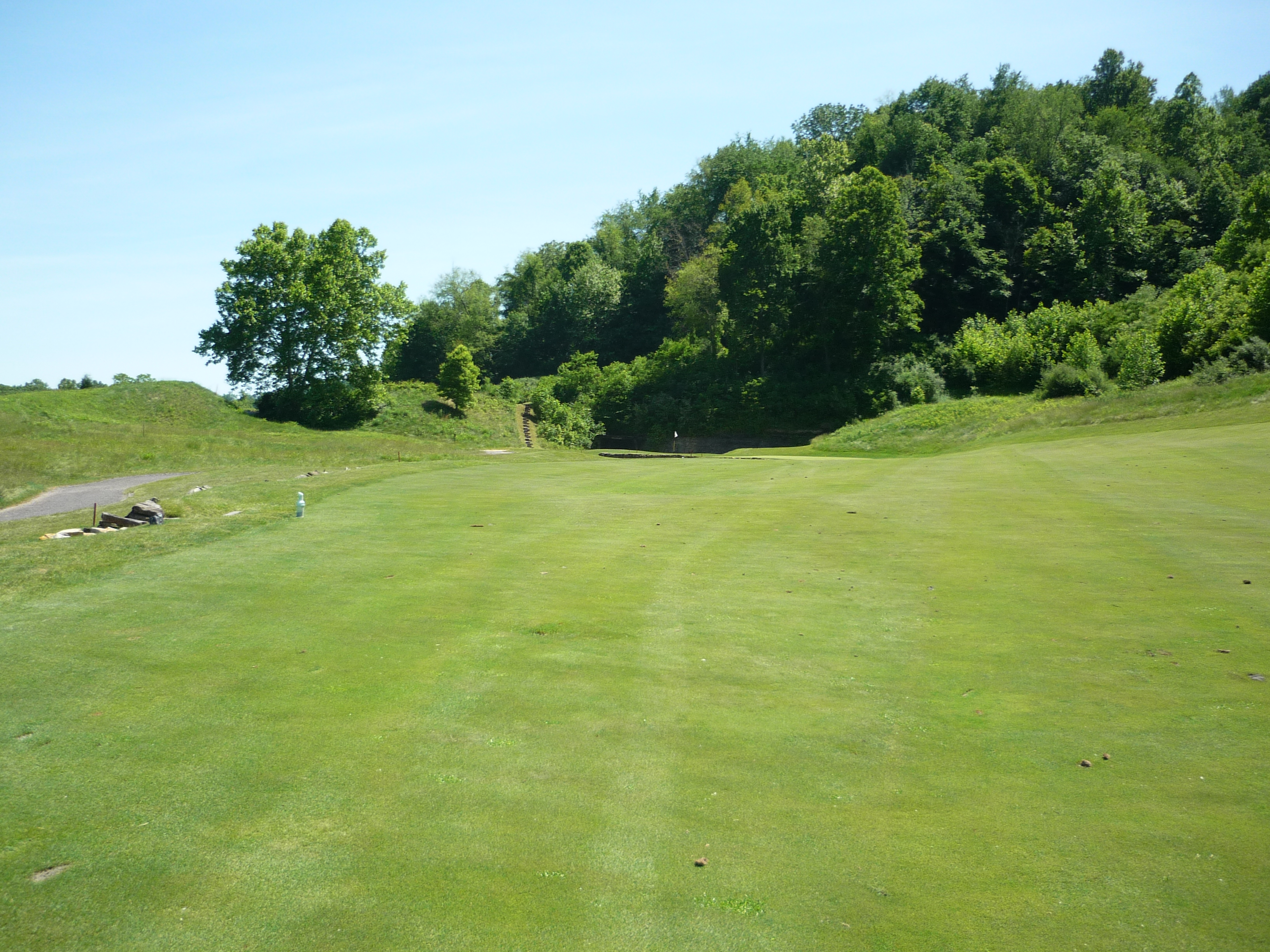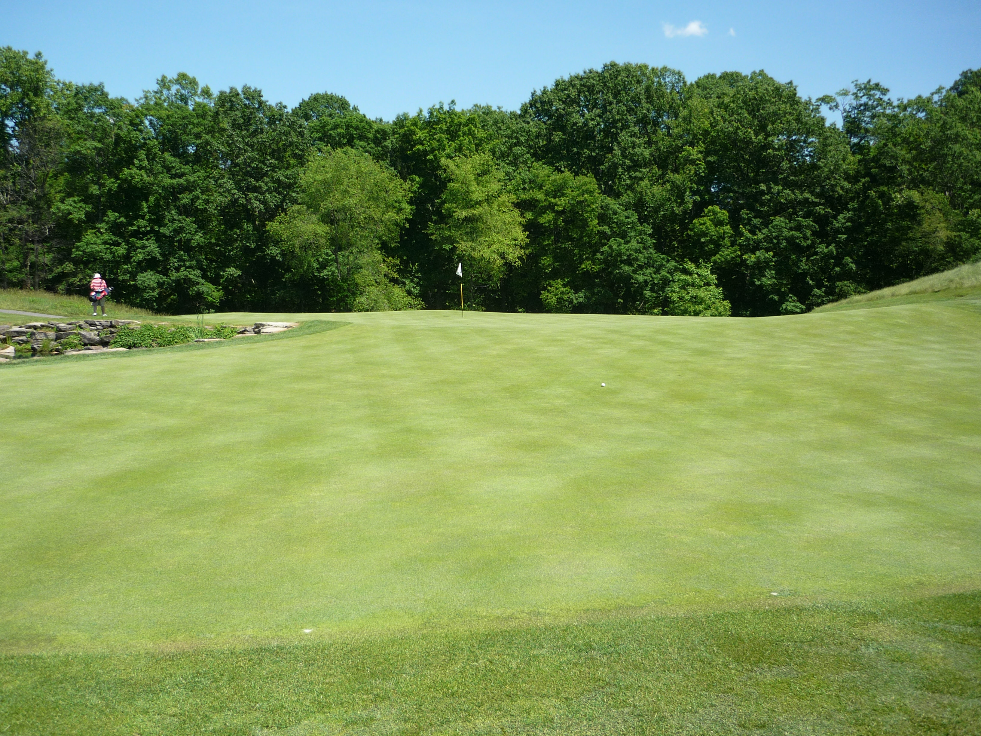 The approach plays over and down a hill to a green that is open in the front. Anything a little short has a chance to bounce onto the green.