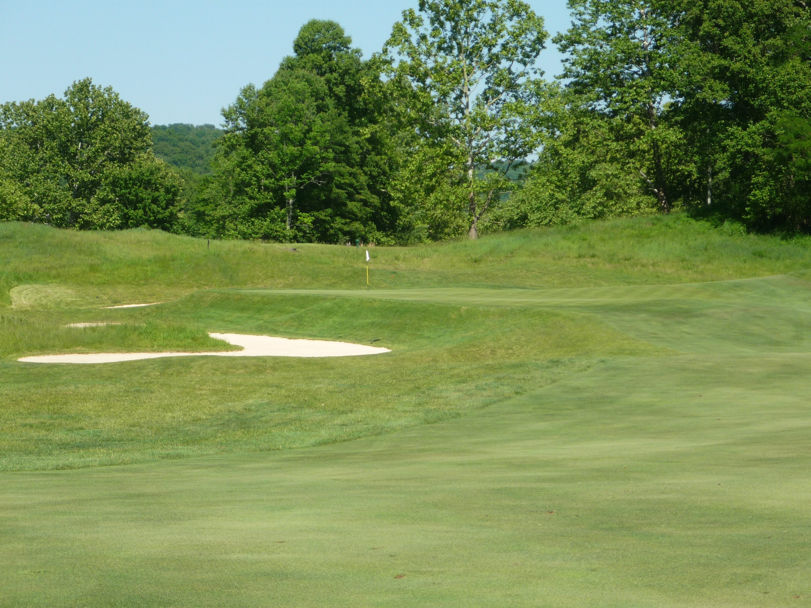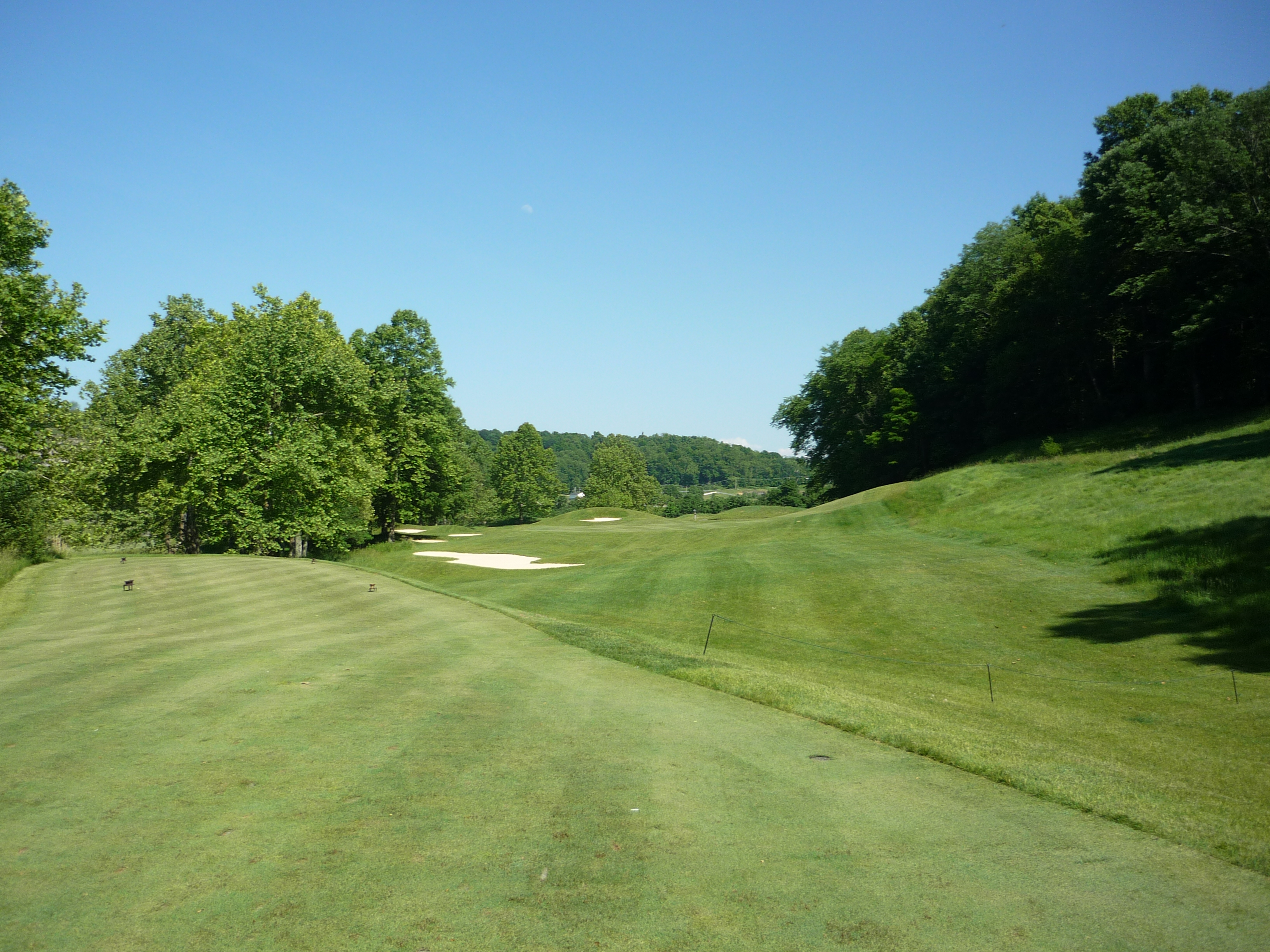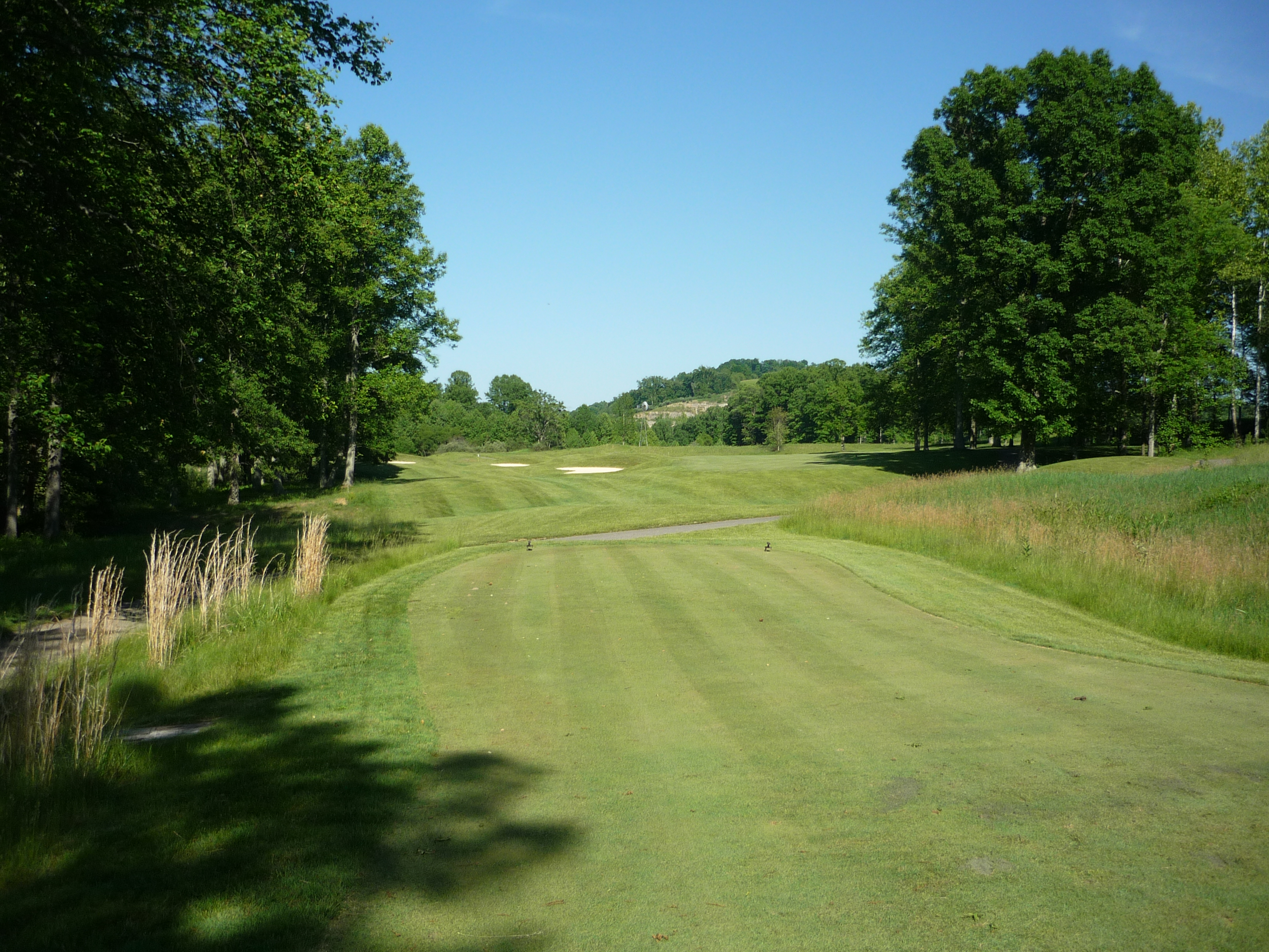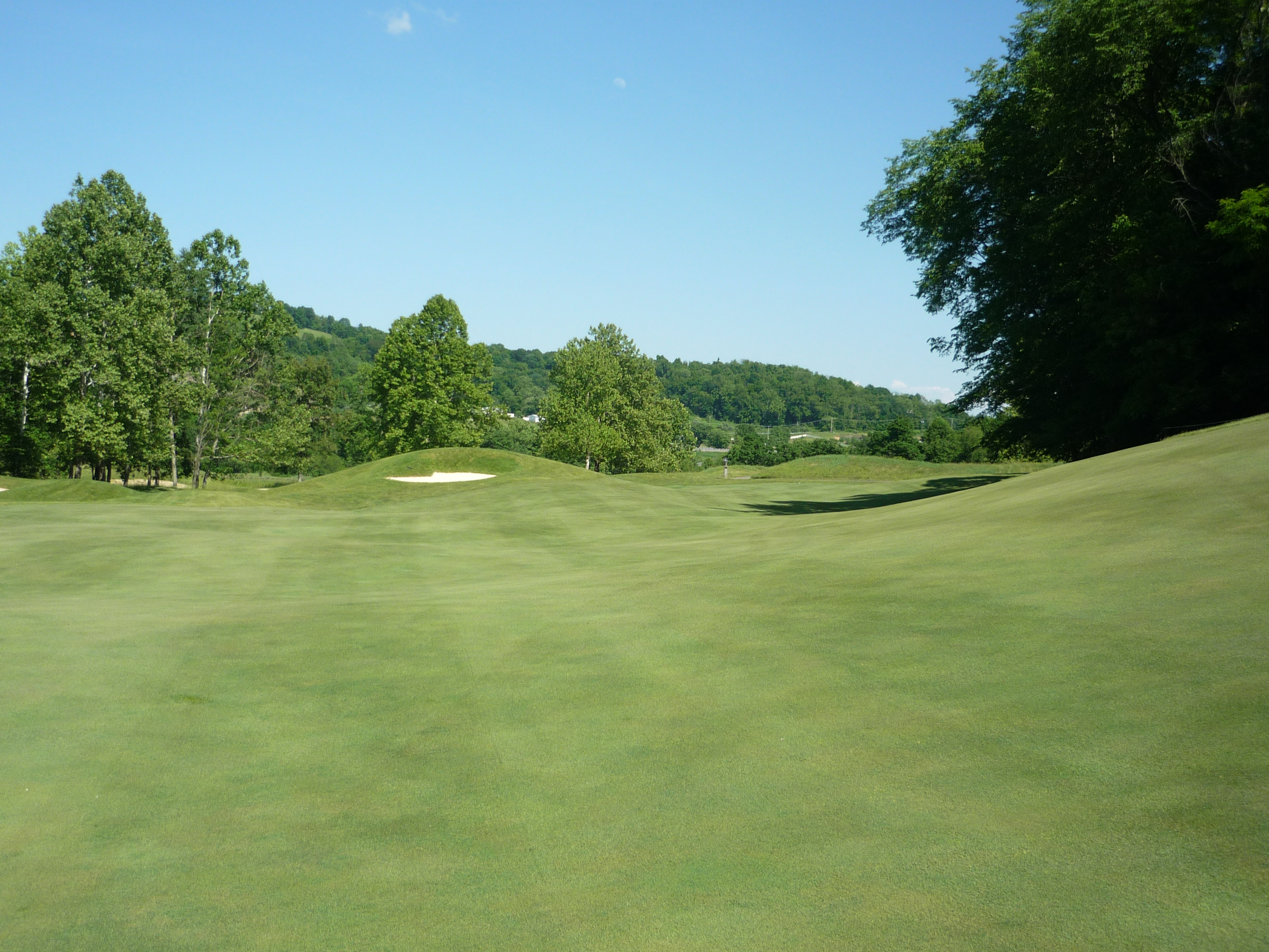 The approach plays over and down a hill to a green that is open in the front. Anything a little short has a chance to bounce onto the green.