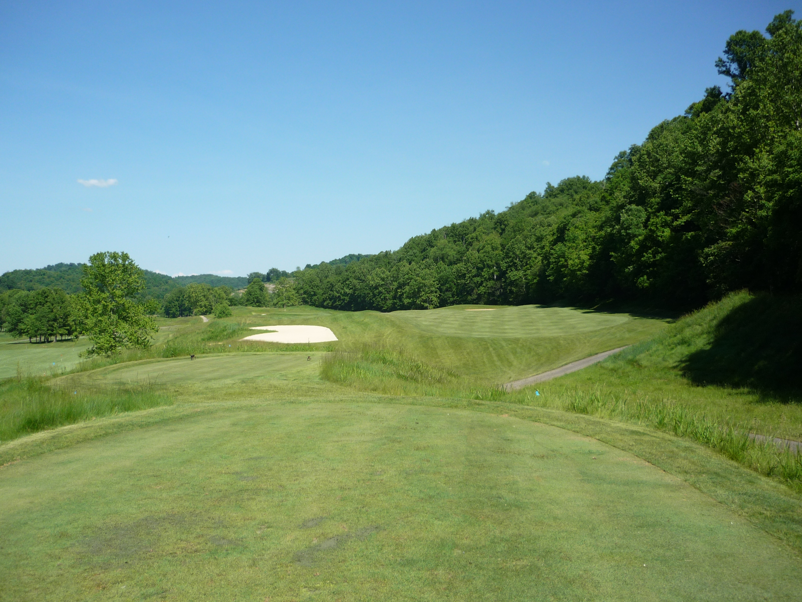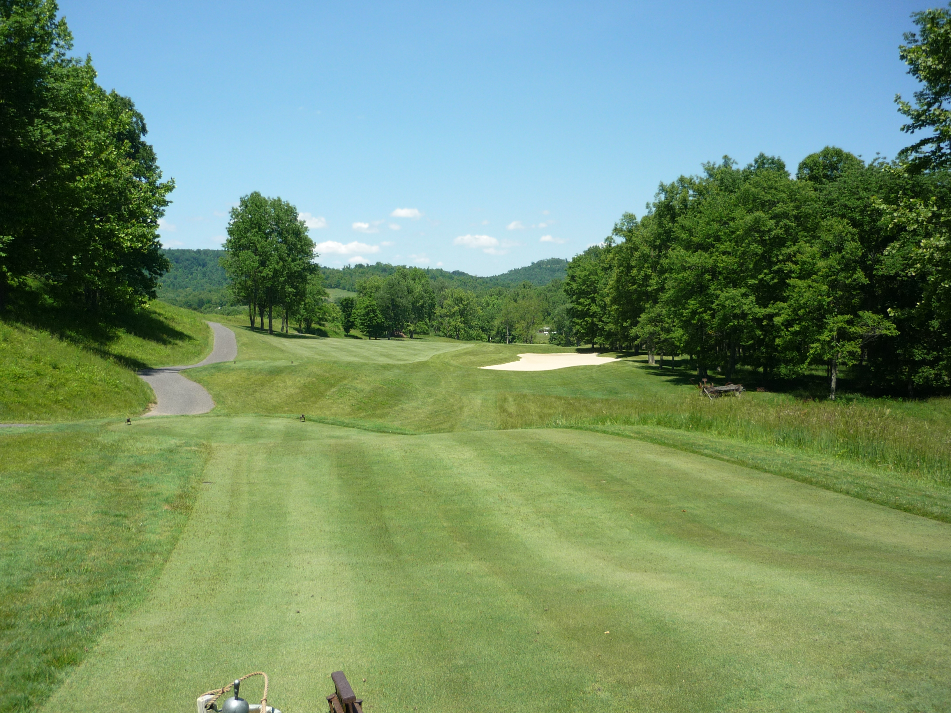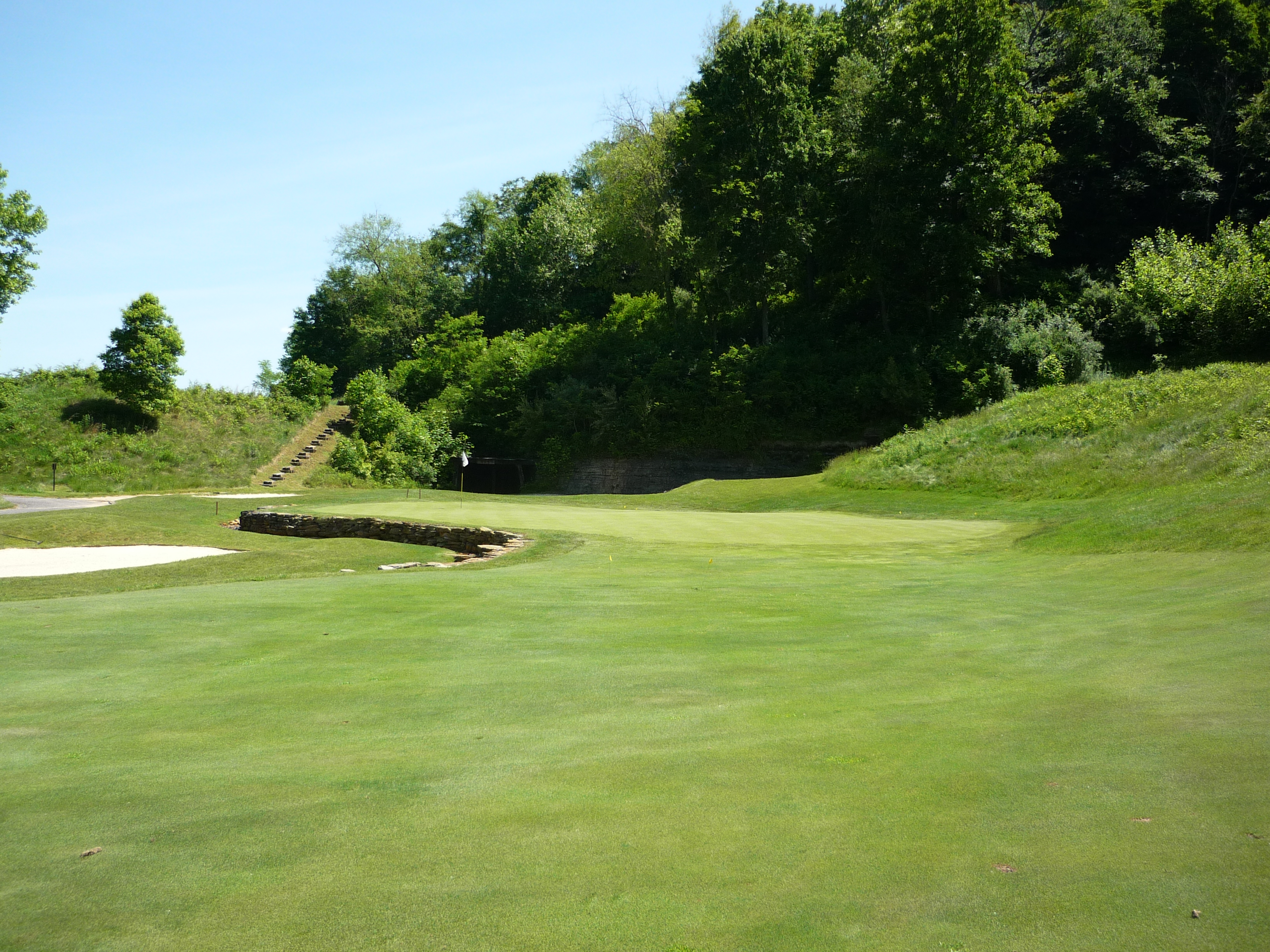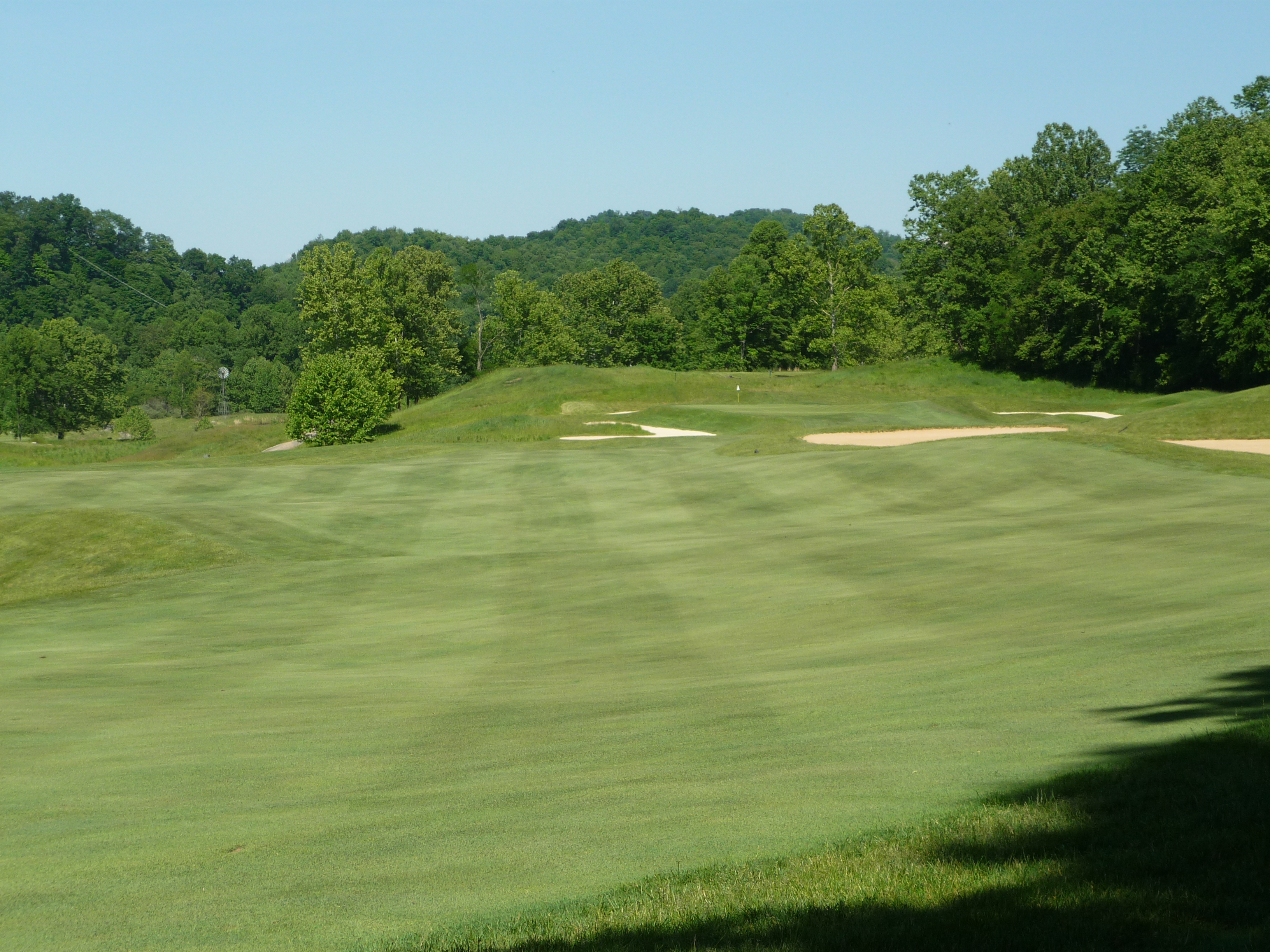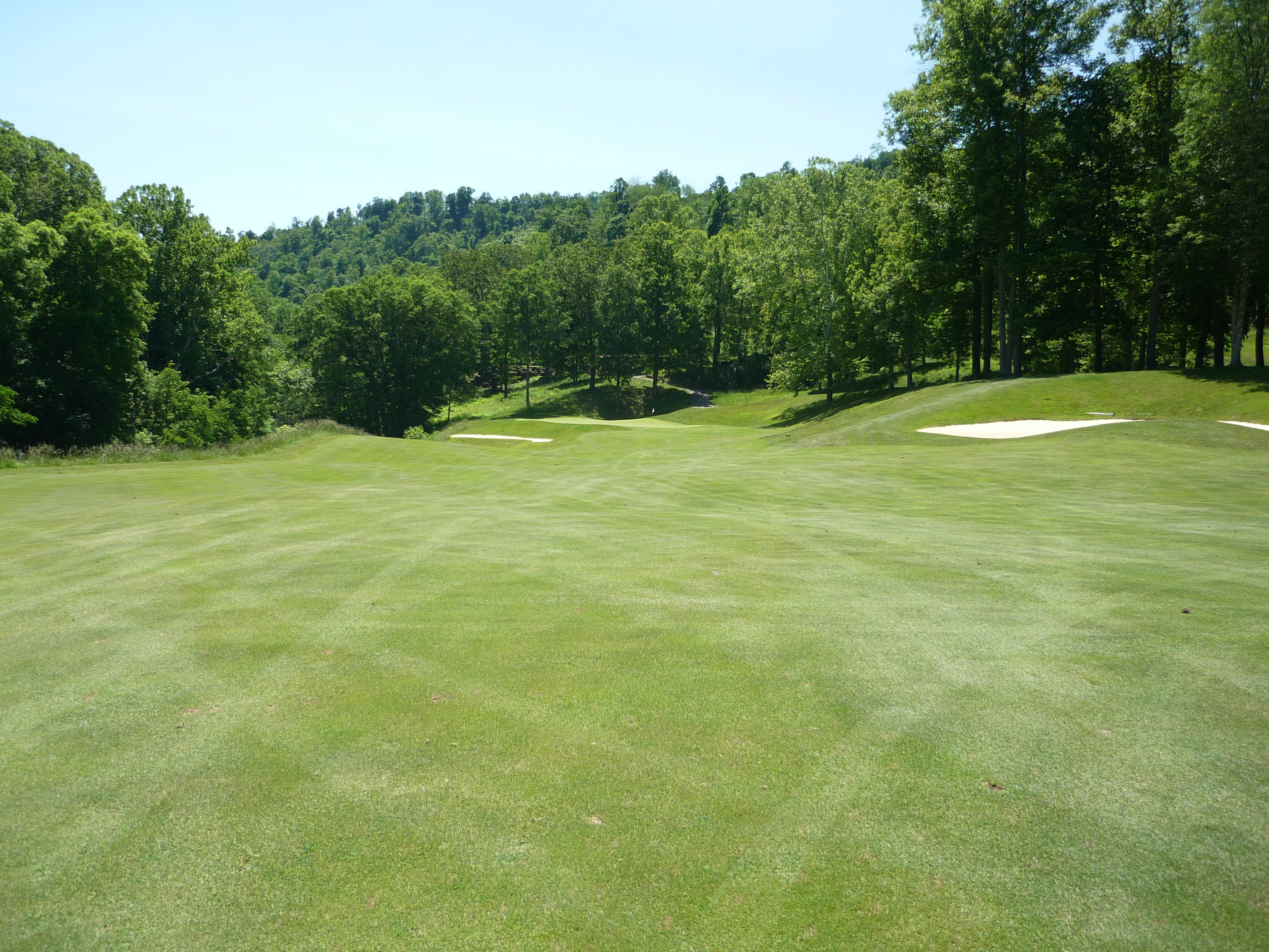The approach plays over and down a hill to a green that is open in the front. Anything a little short has a chance to bounce onto the green.