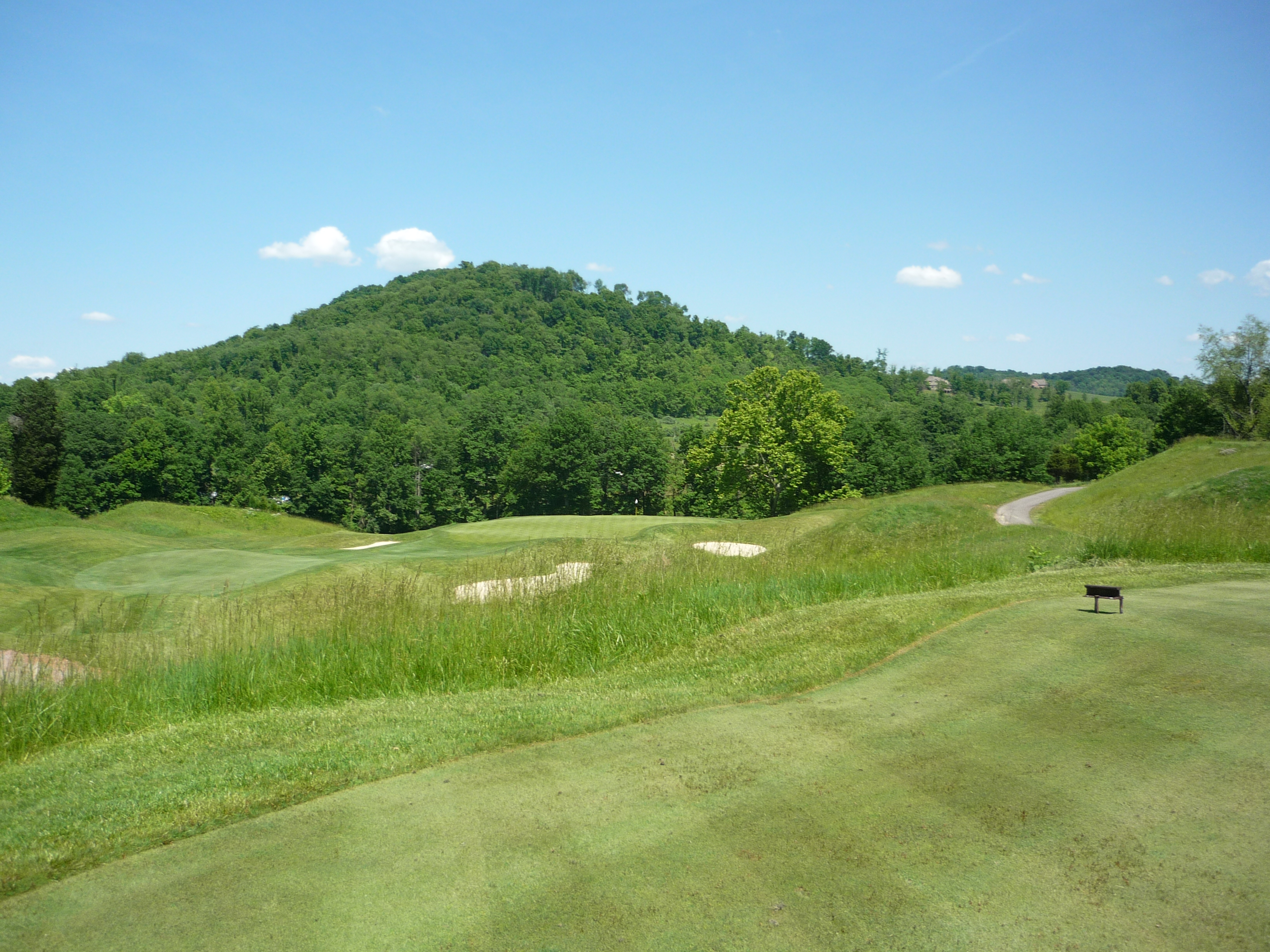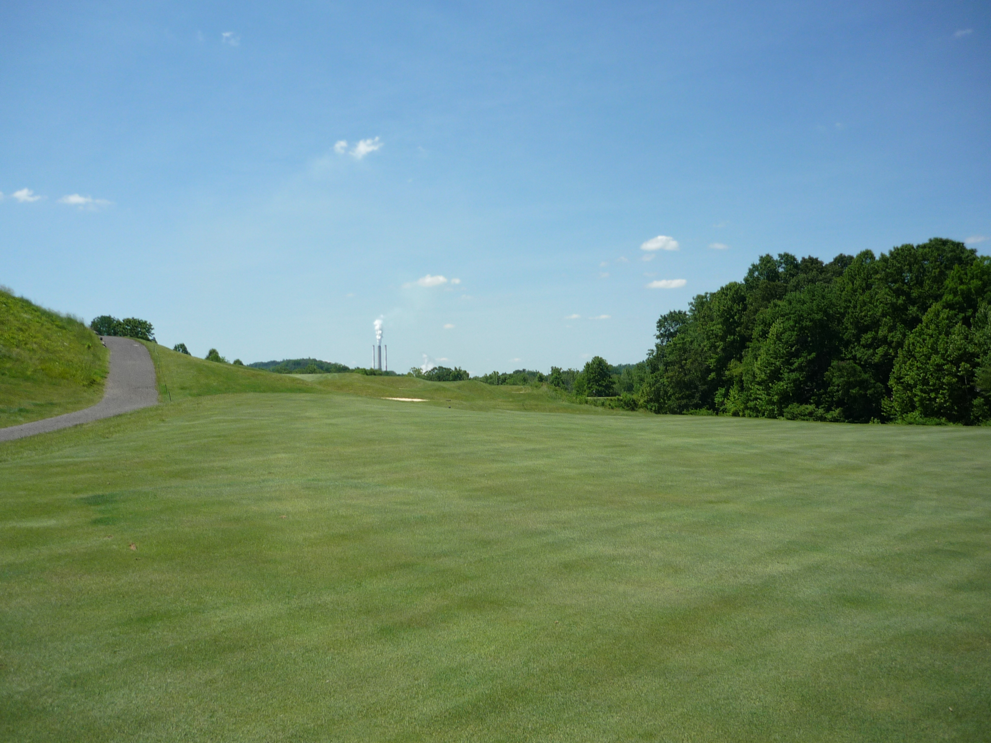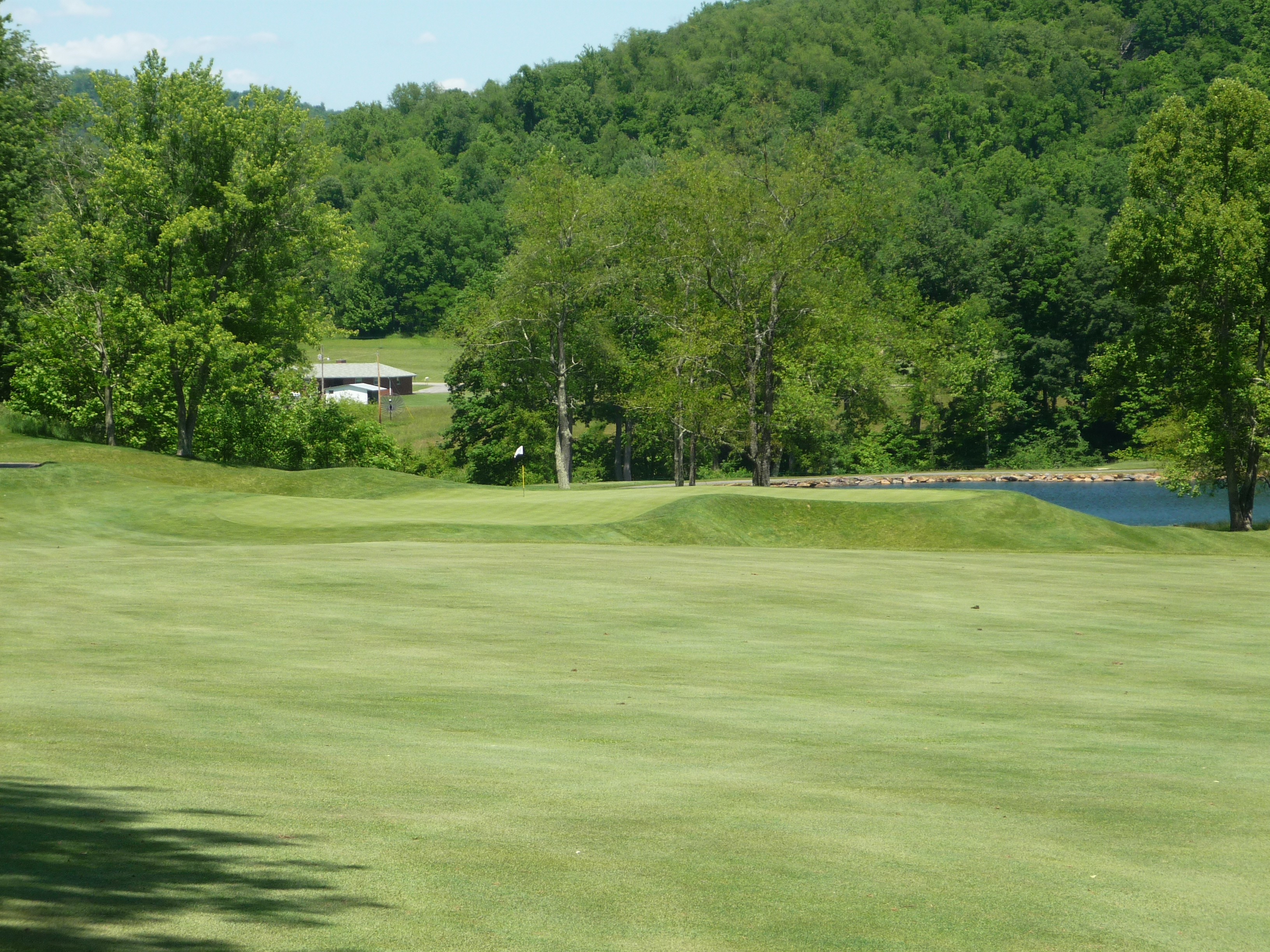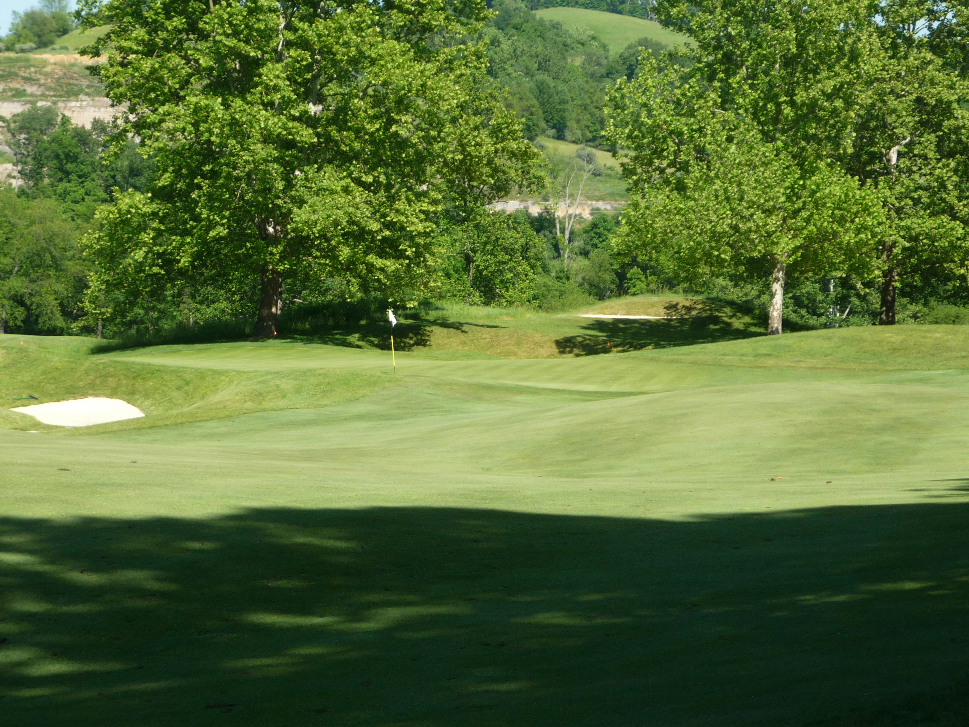 The approach plays over and down a hill to a green that is open in the front. Anything a little short has a chance to bounce onto the green.