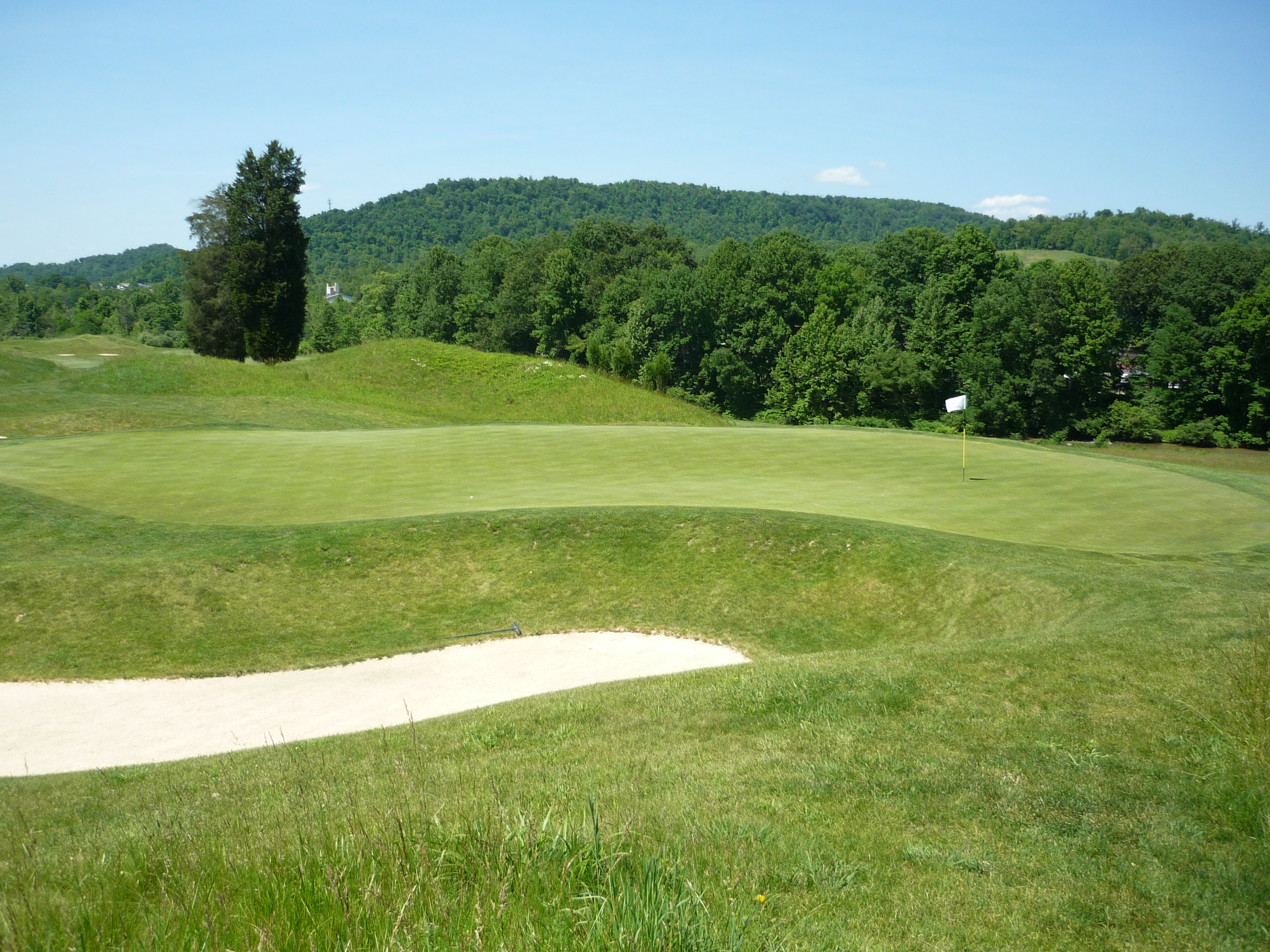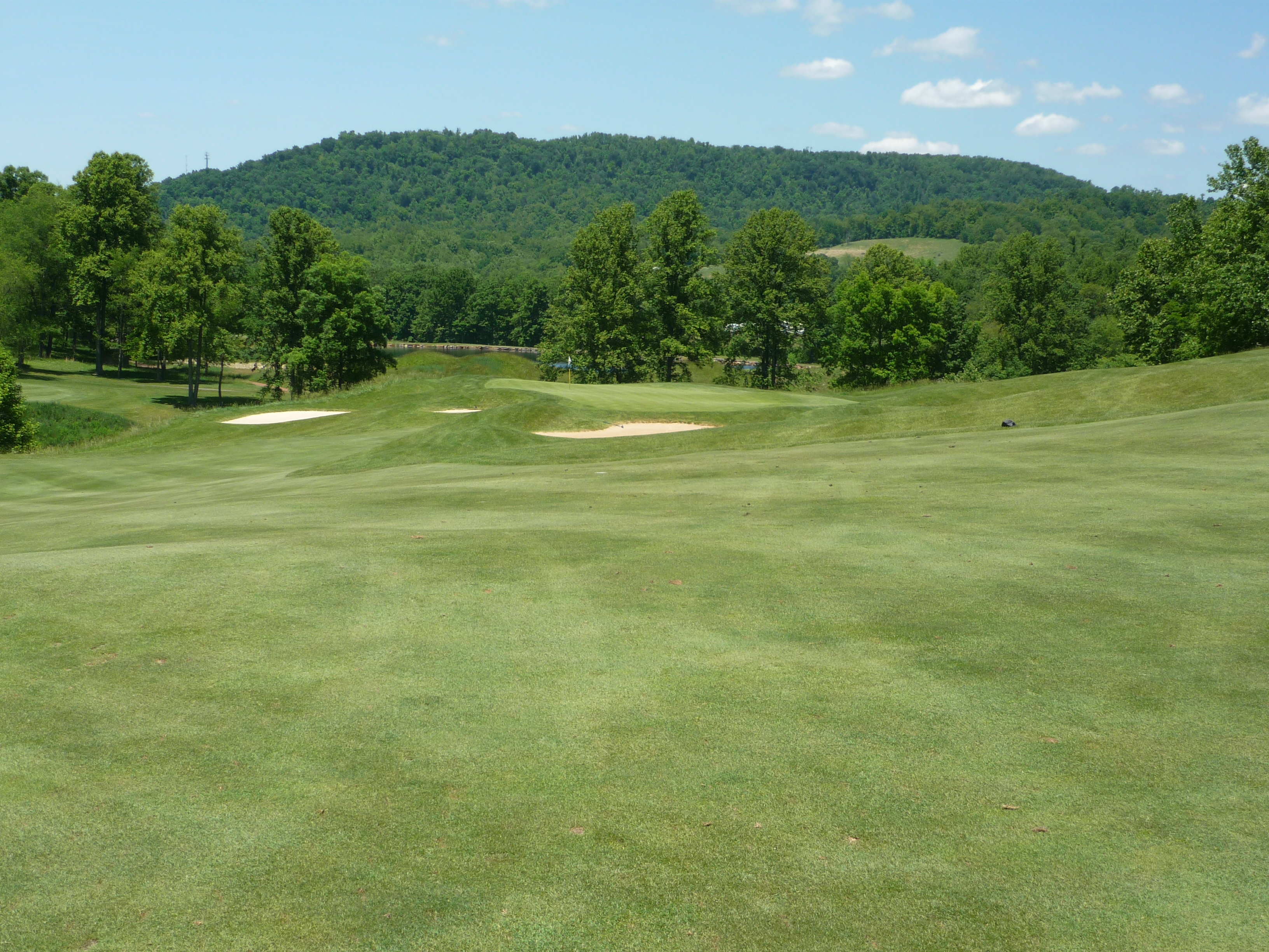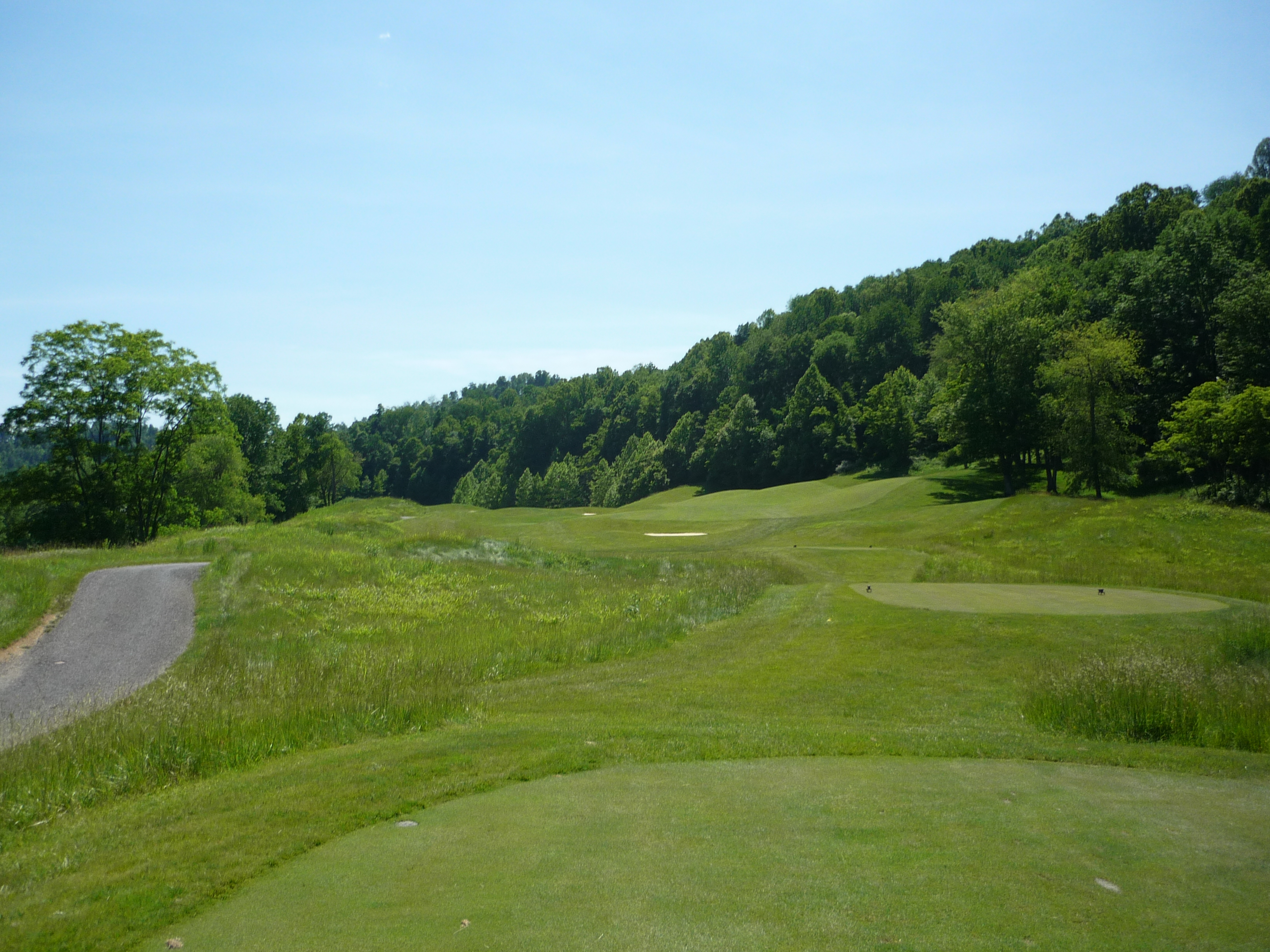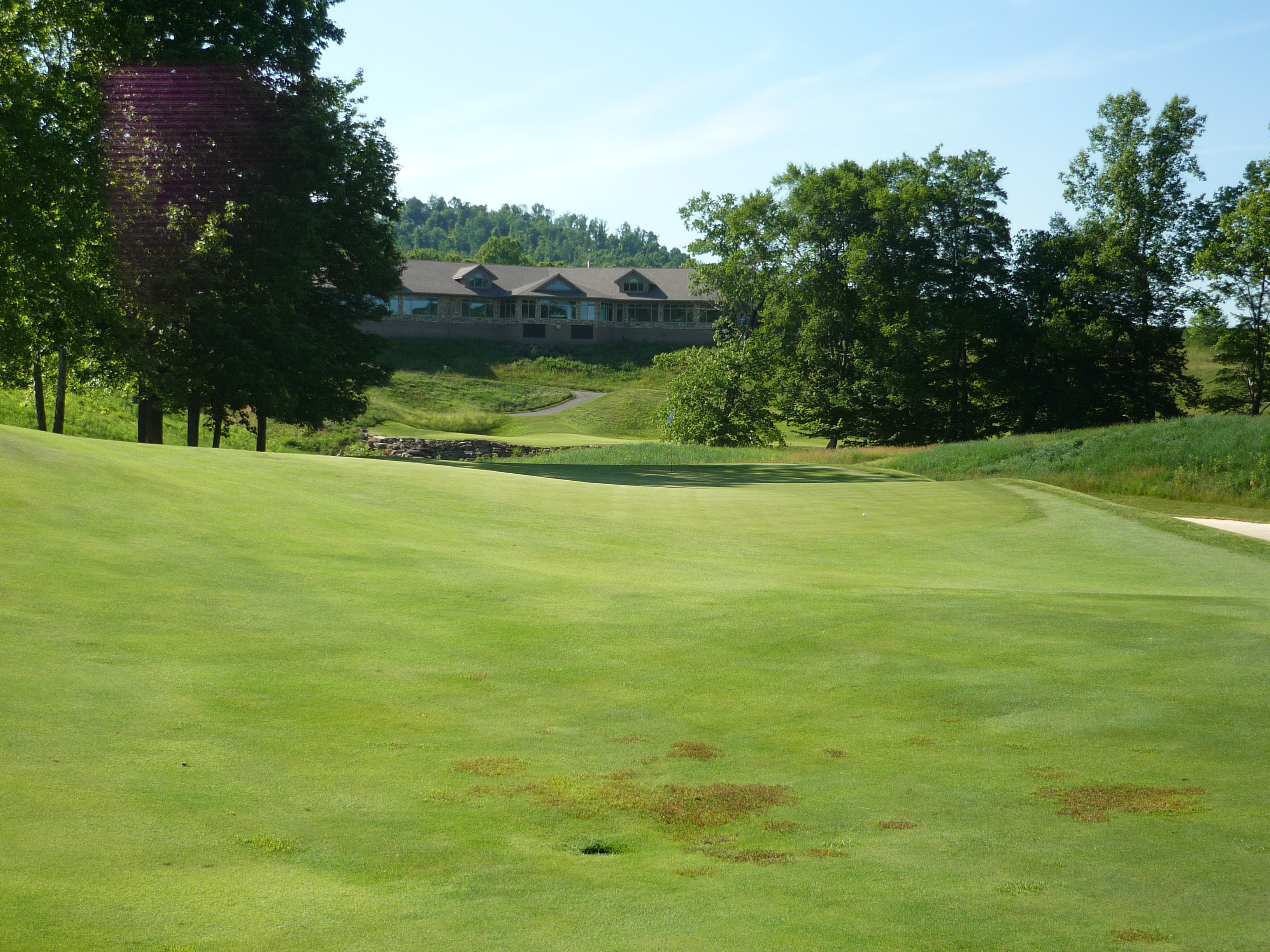 The approach plays over and down a hill to a green that is open in the front. Anything a little short has a chance to bounce onto the green.