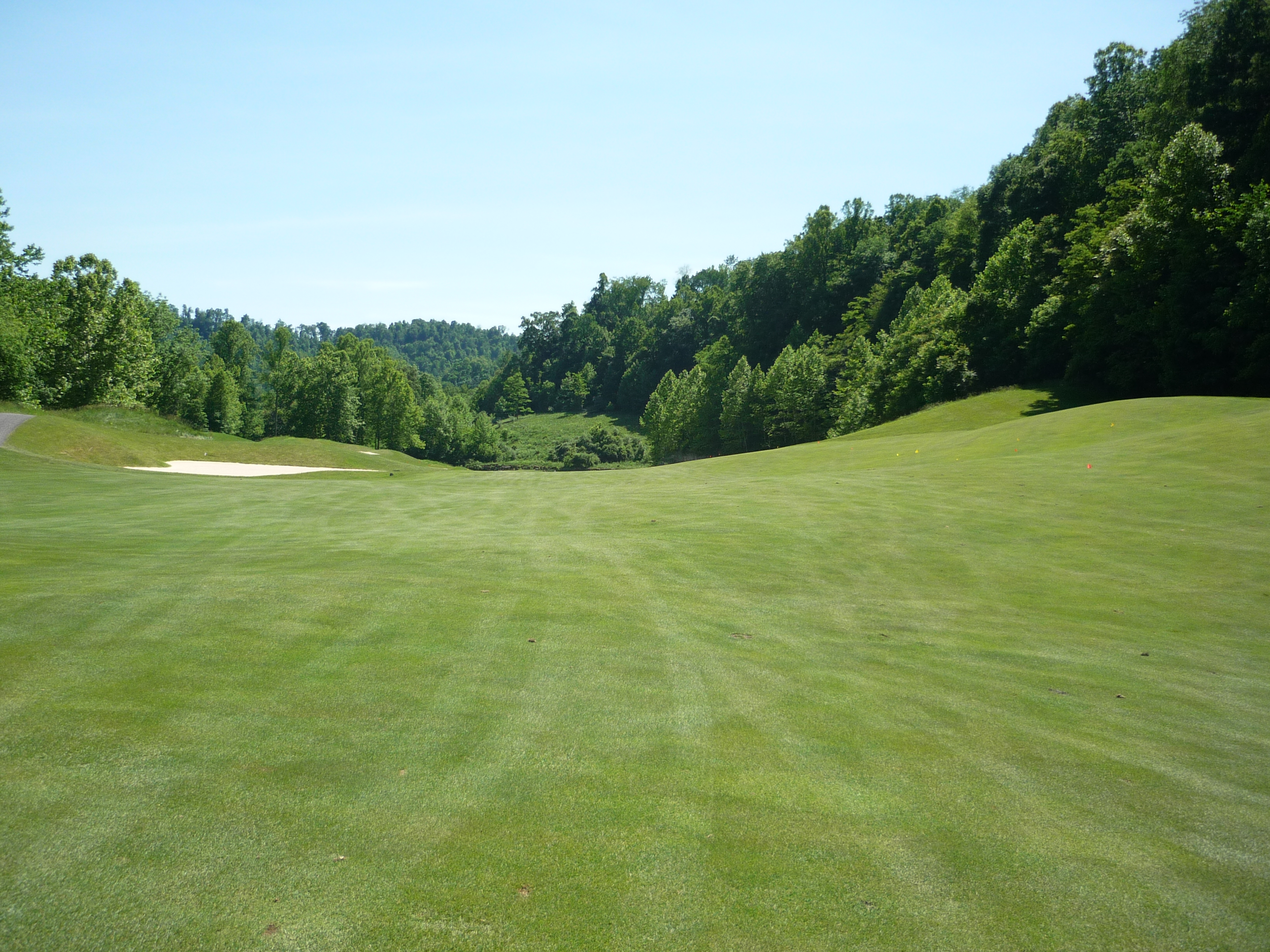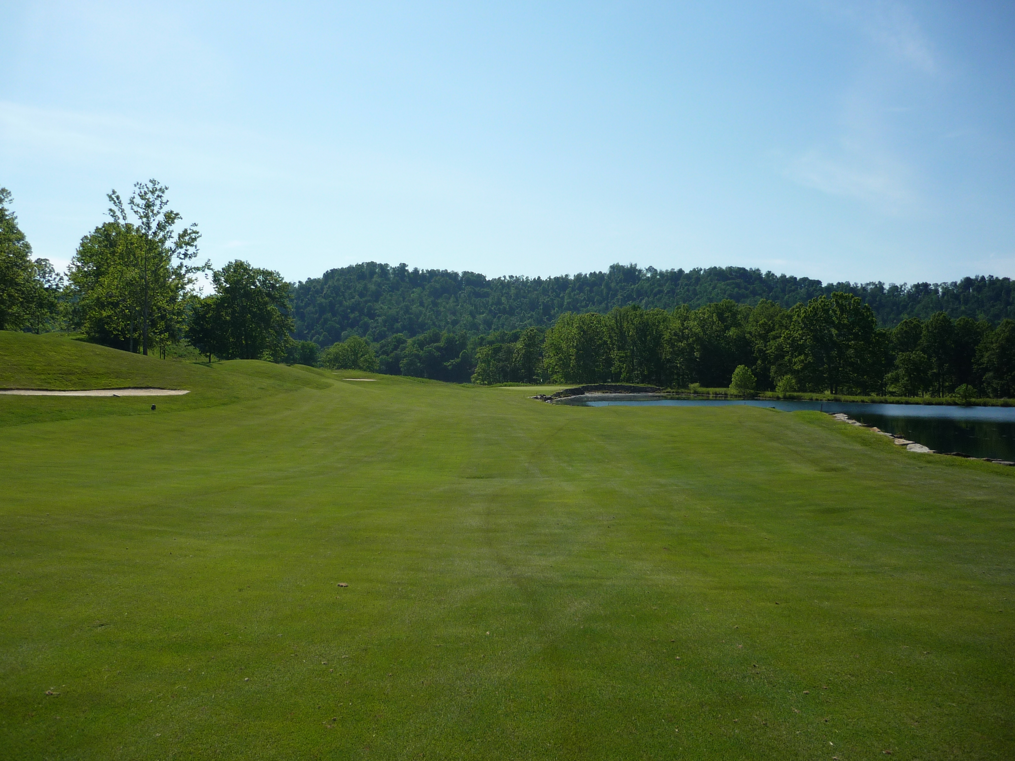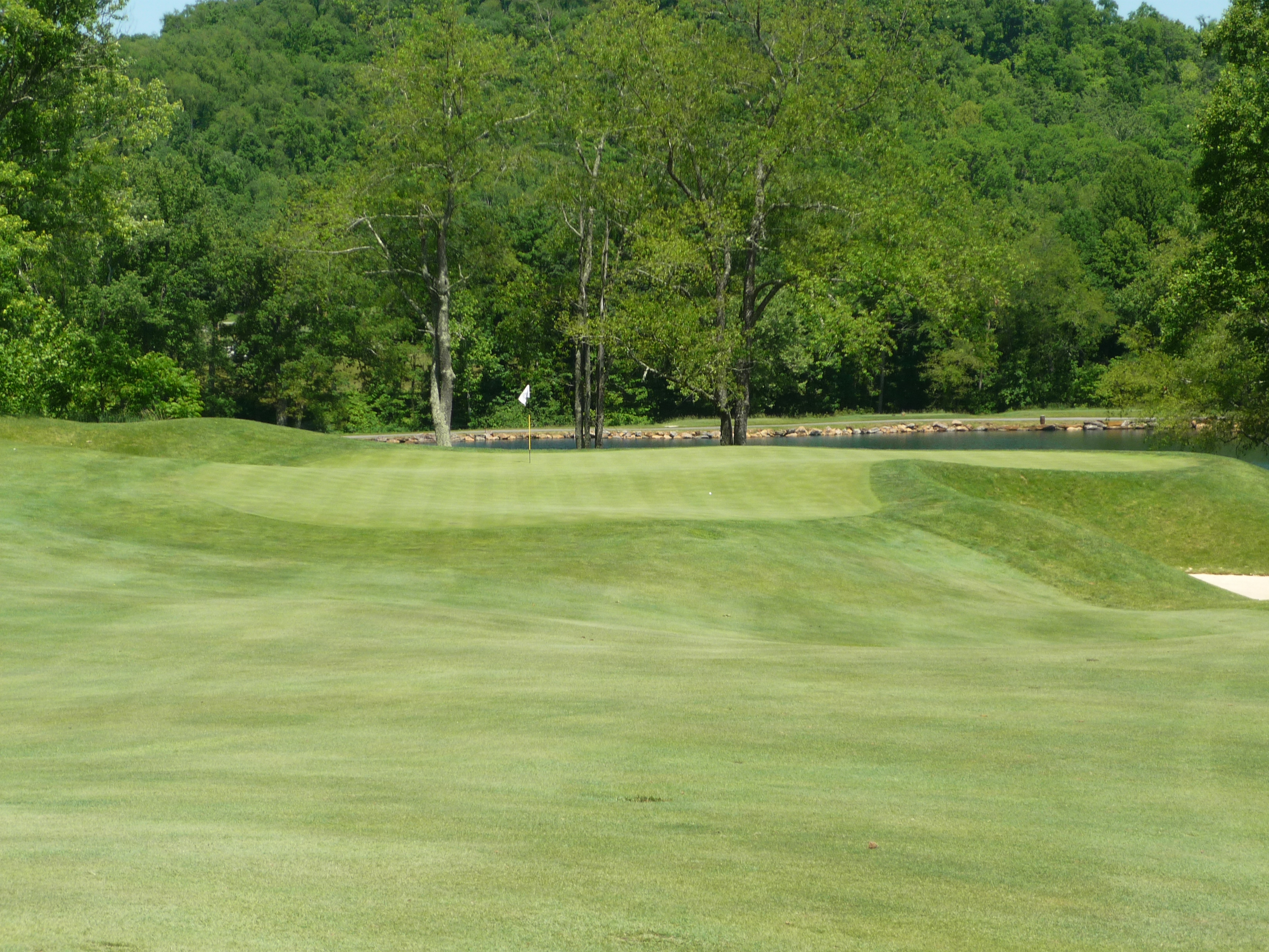 This is a nice, short hole up the hill. Another opportunity for pros to go for it. The creek goes all the way to the green. The fairway is plenty wide if you are choosing to lay up. It does slope a good deal to the left as you can see.