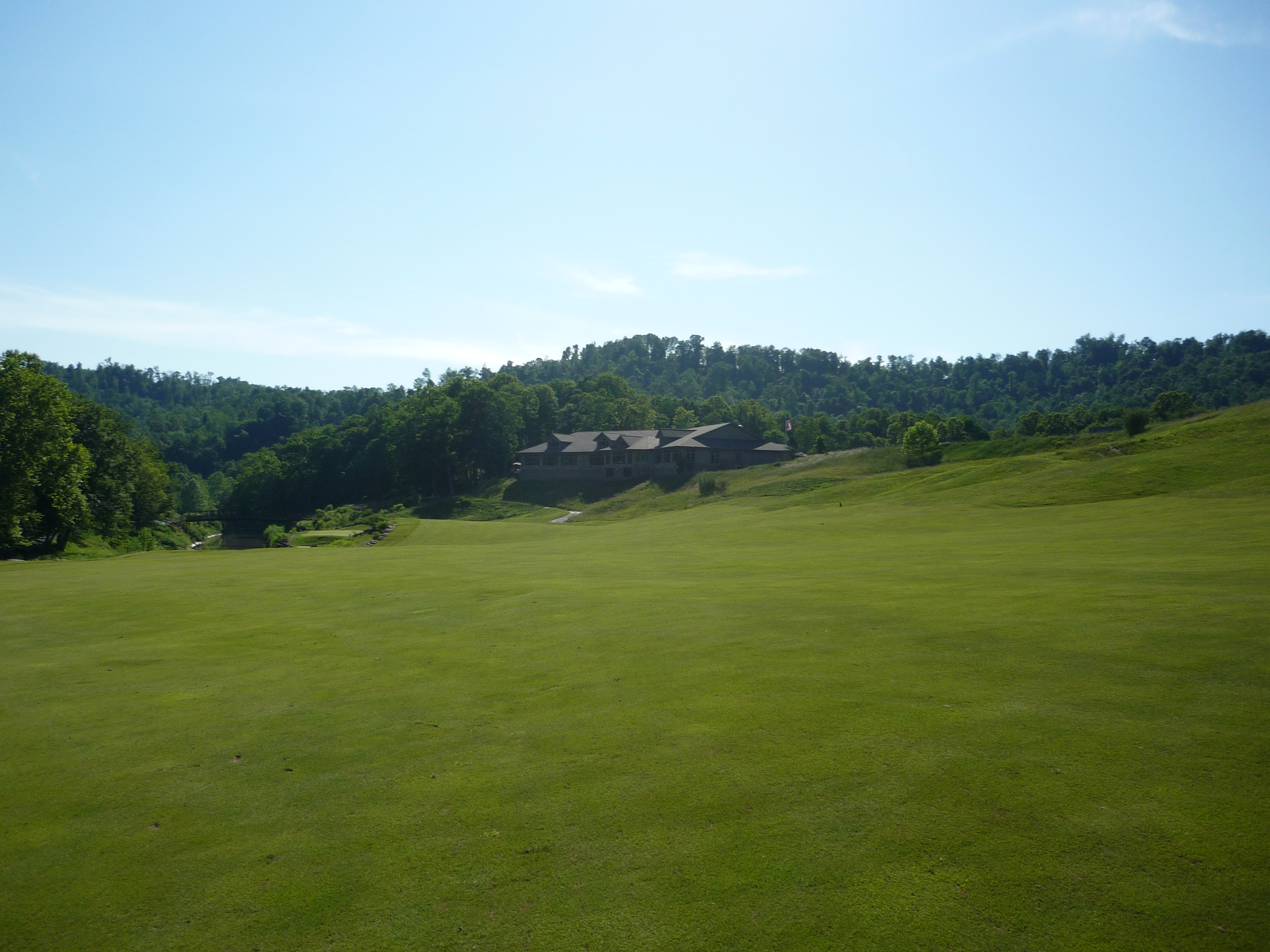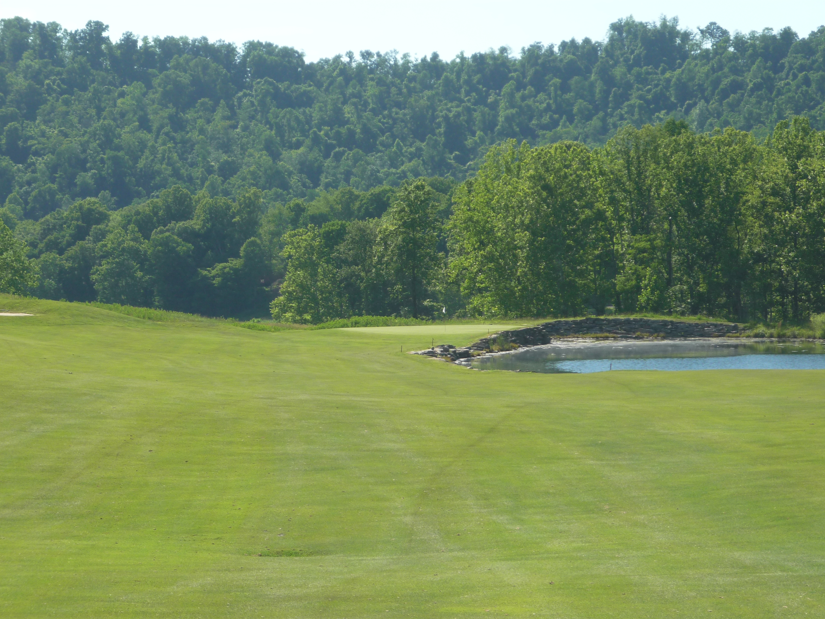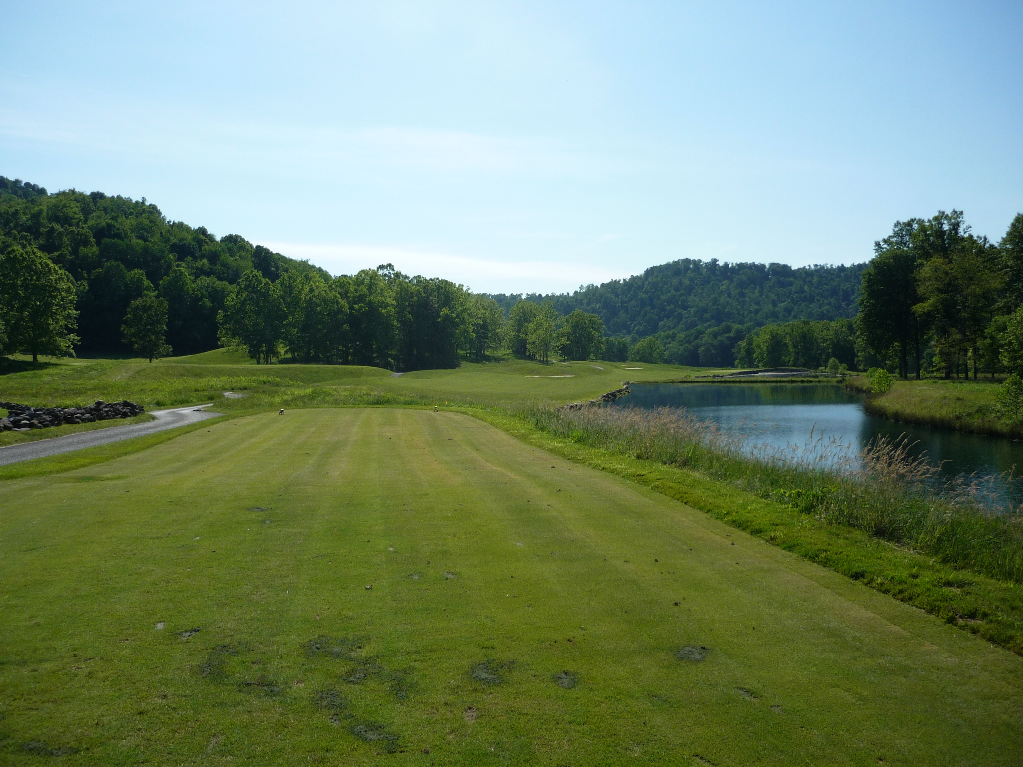 This is a nice, short hole up the hill. Another opportunity for pros to go for it. The creek goes all the way to the green. The fairway is plenty wide if you are choosing to lay up. It does slope a good deal to the left as you can see.