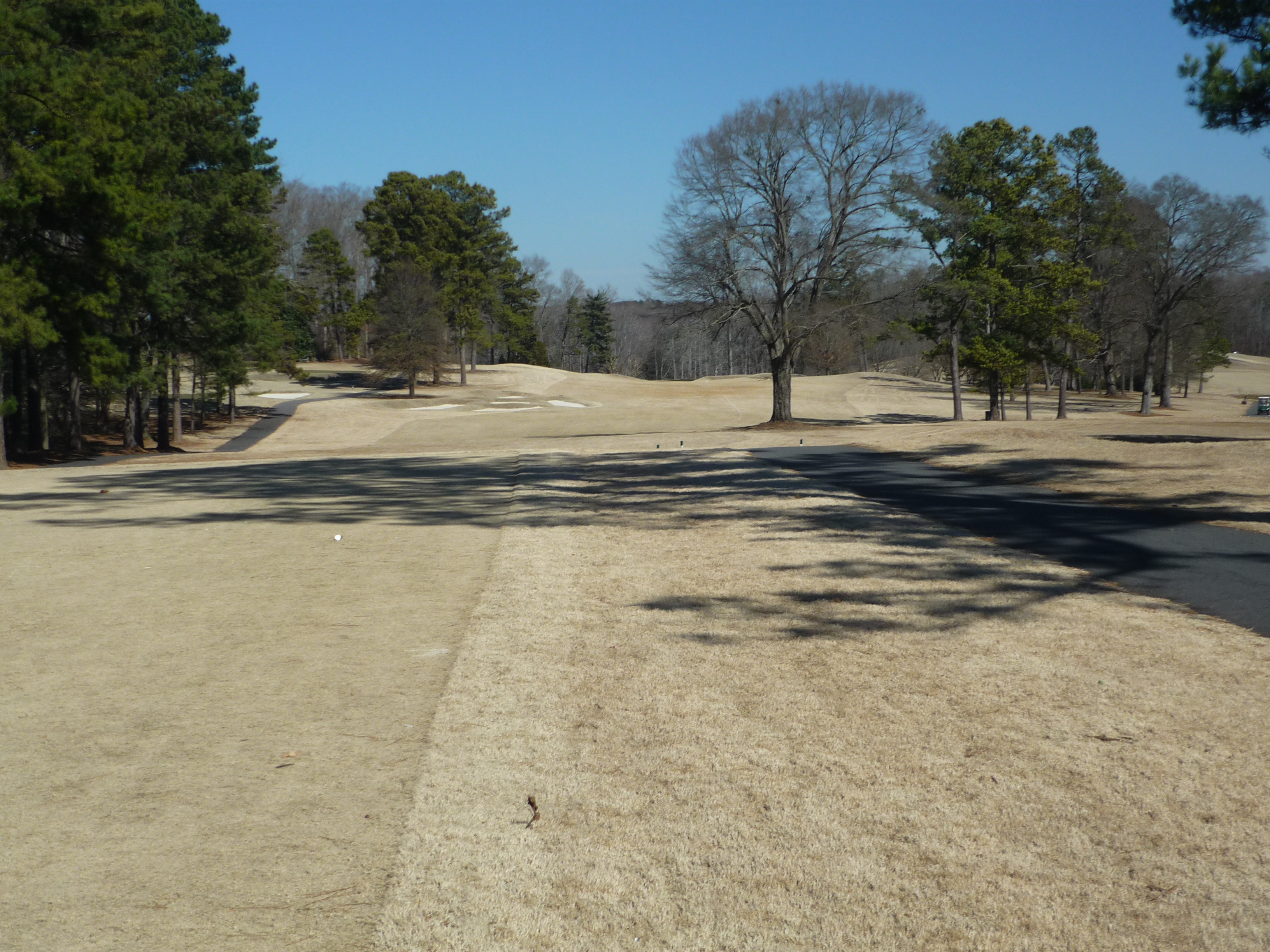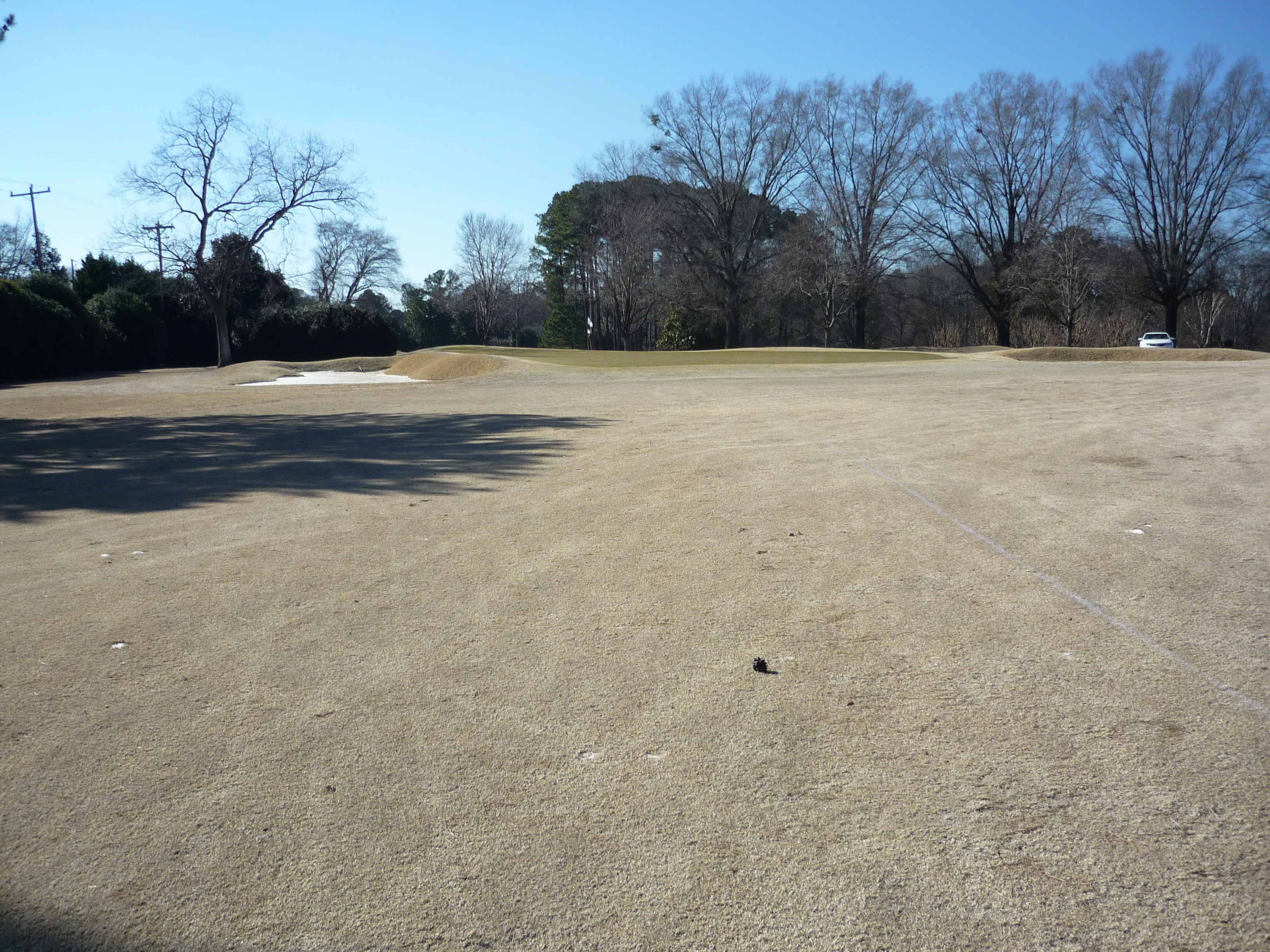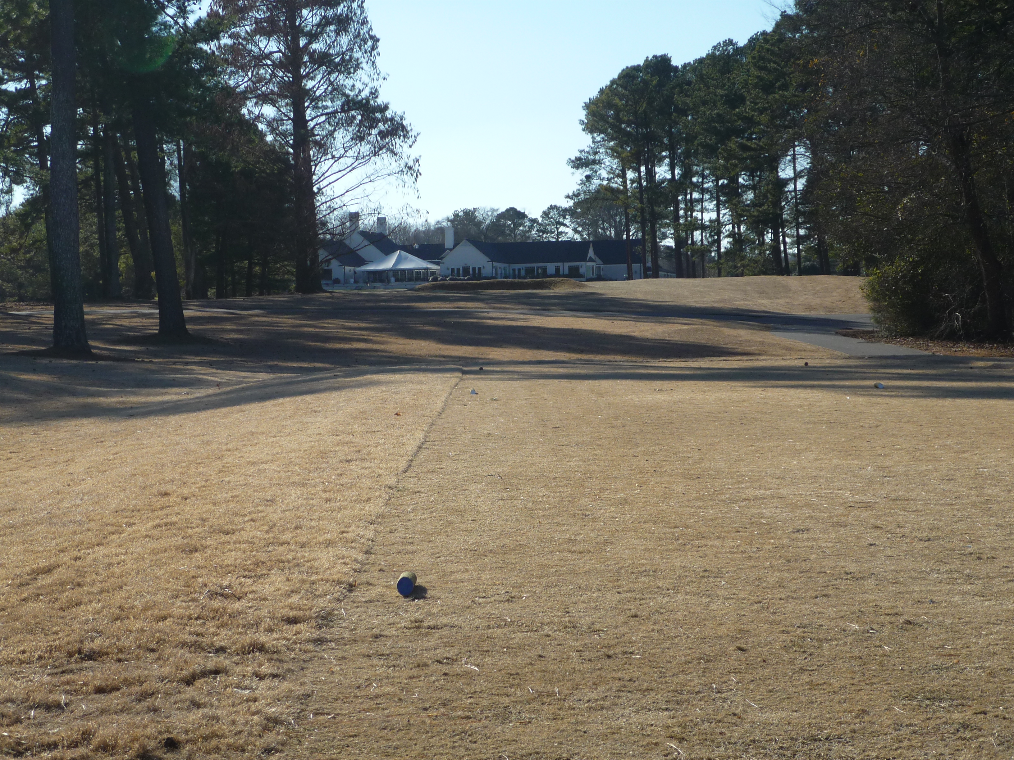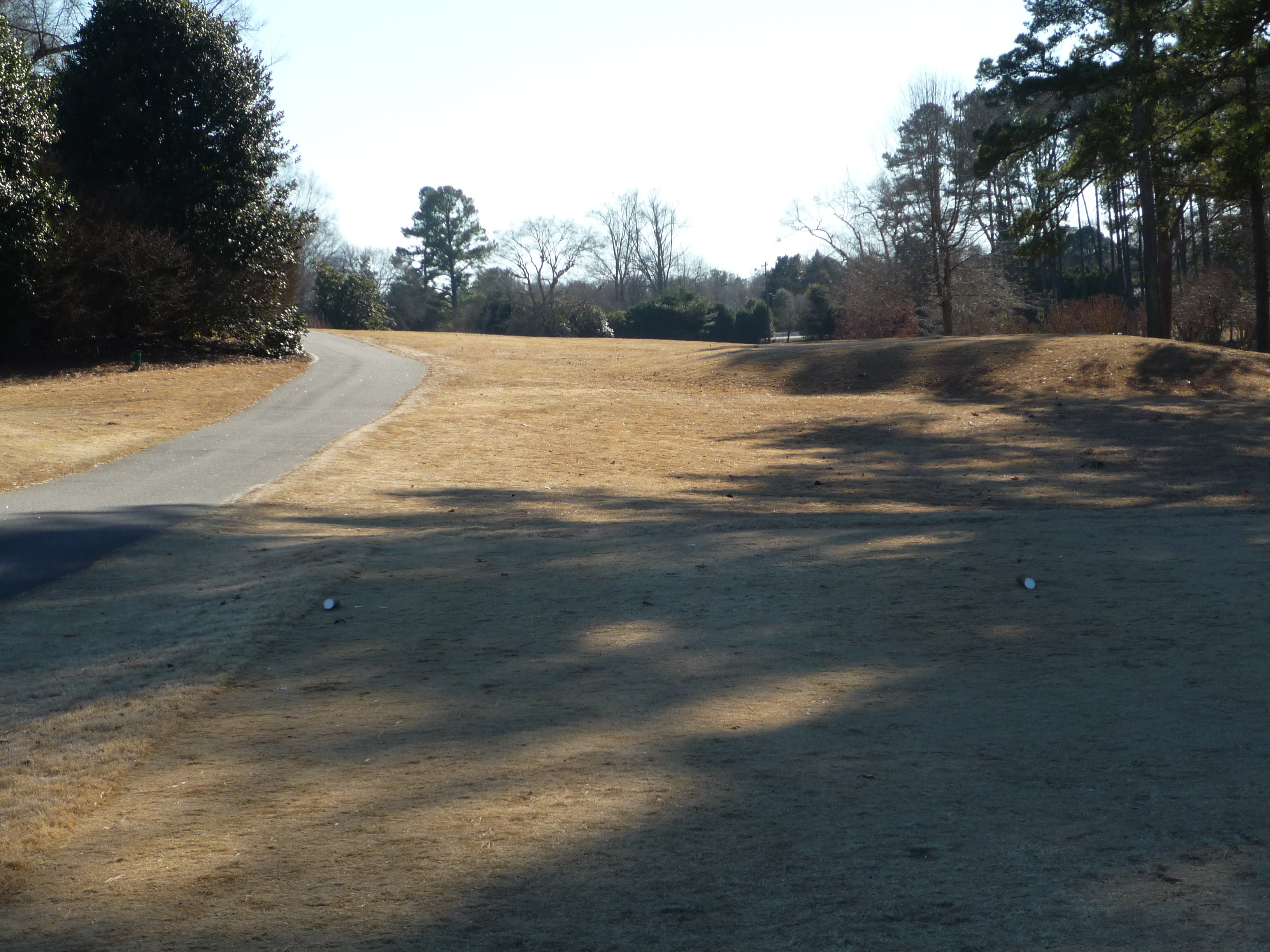 The tee aims you down the left side of the hole. At this time of the year the big tree on the right is less fearsome since it has no leaves. A big drive can clear that tree and leave a shorter approach.