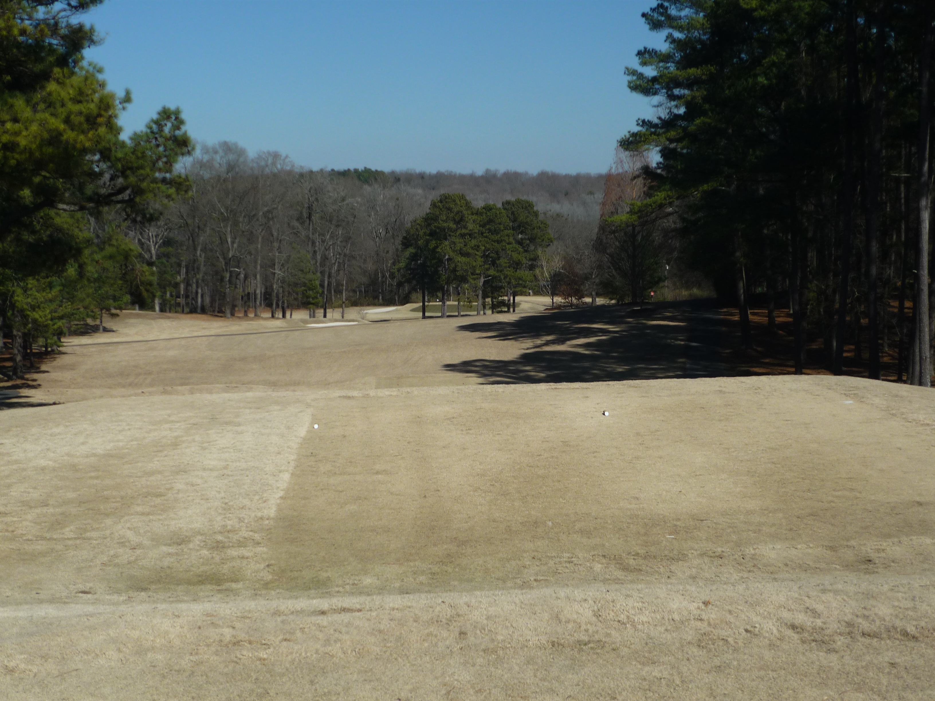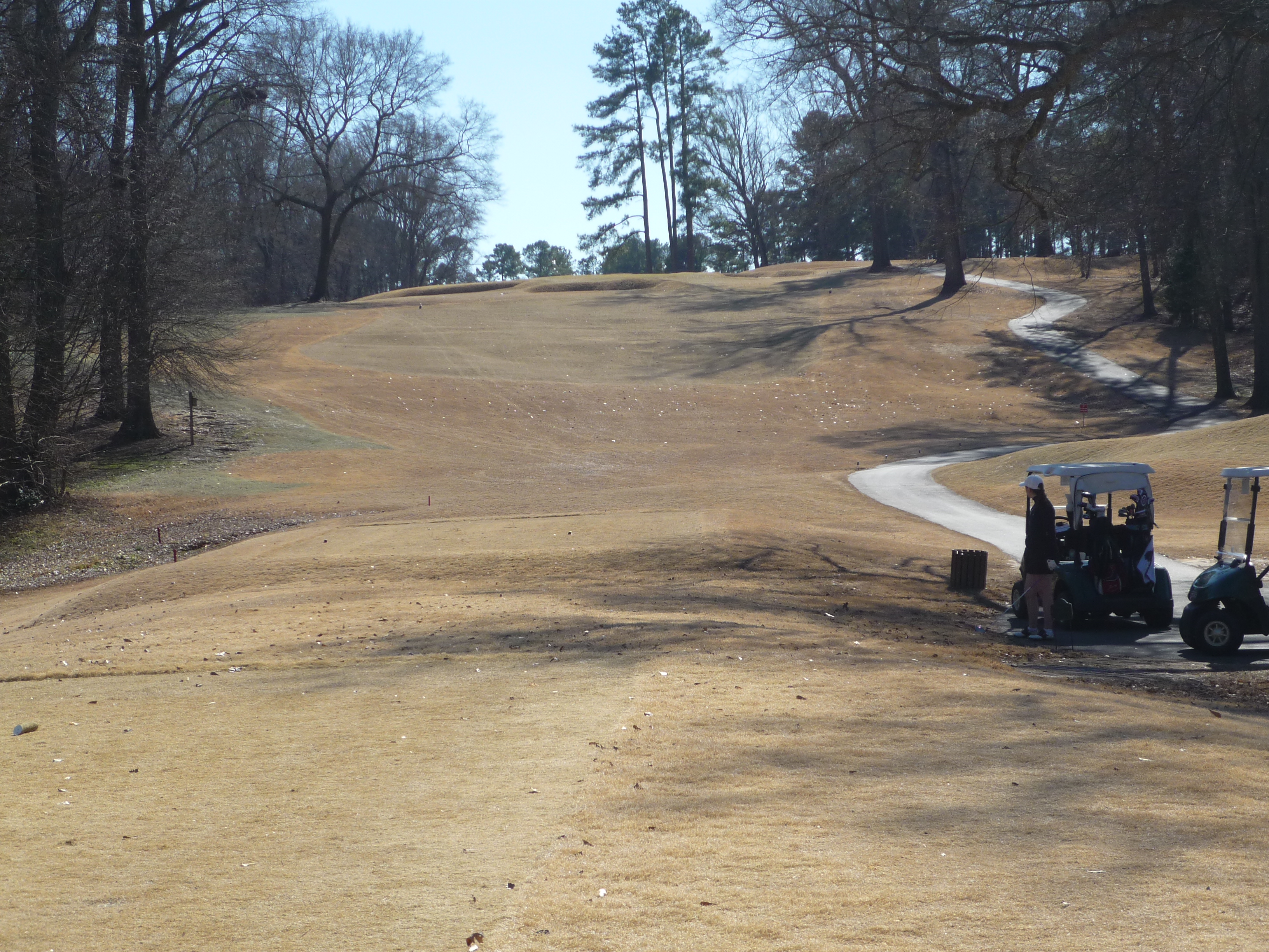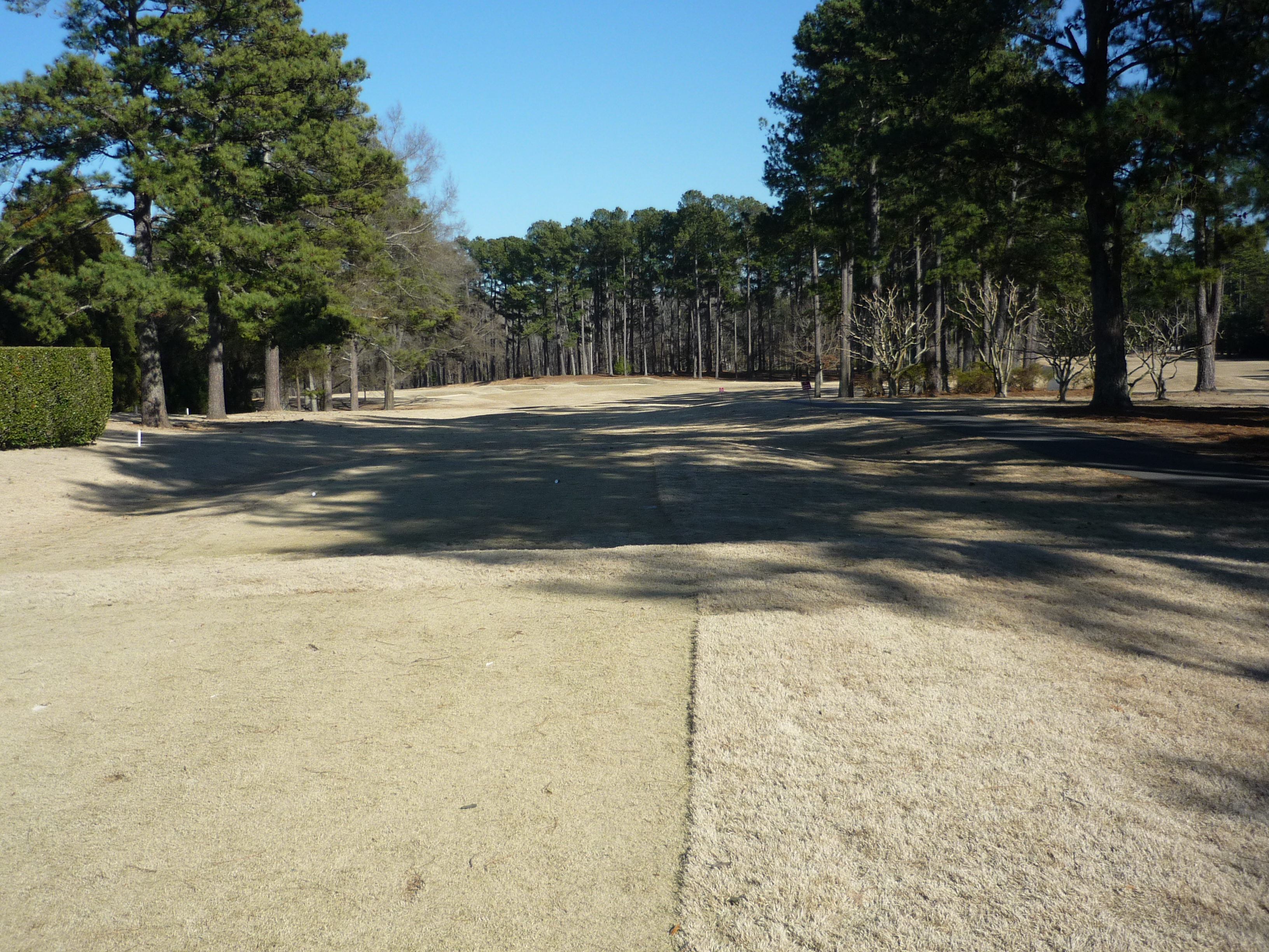 The tee aims you down the left side of the hole. At this time of the year the big tree on the right is less fearsome since it has no leaves. A big drive can clear that tree and leave a shorter approach.