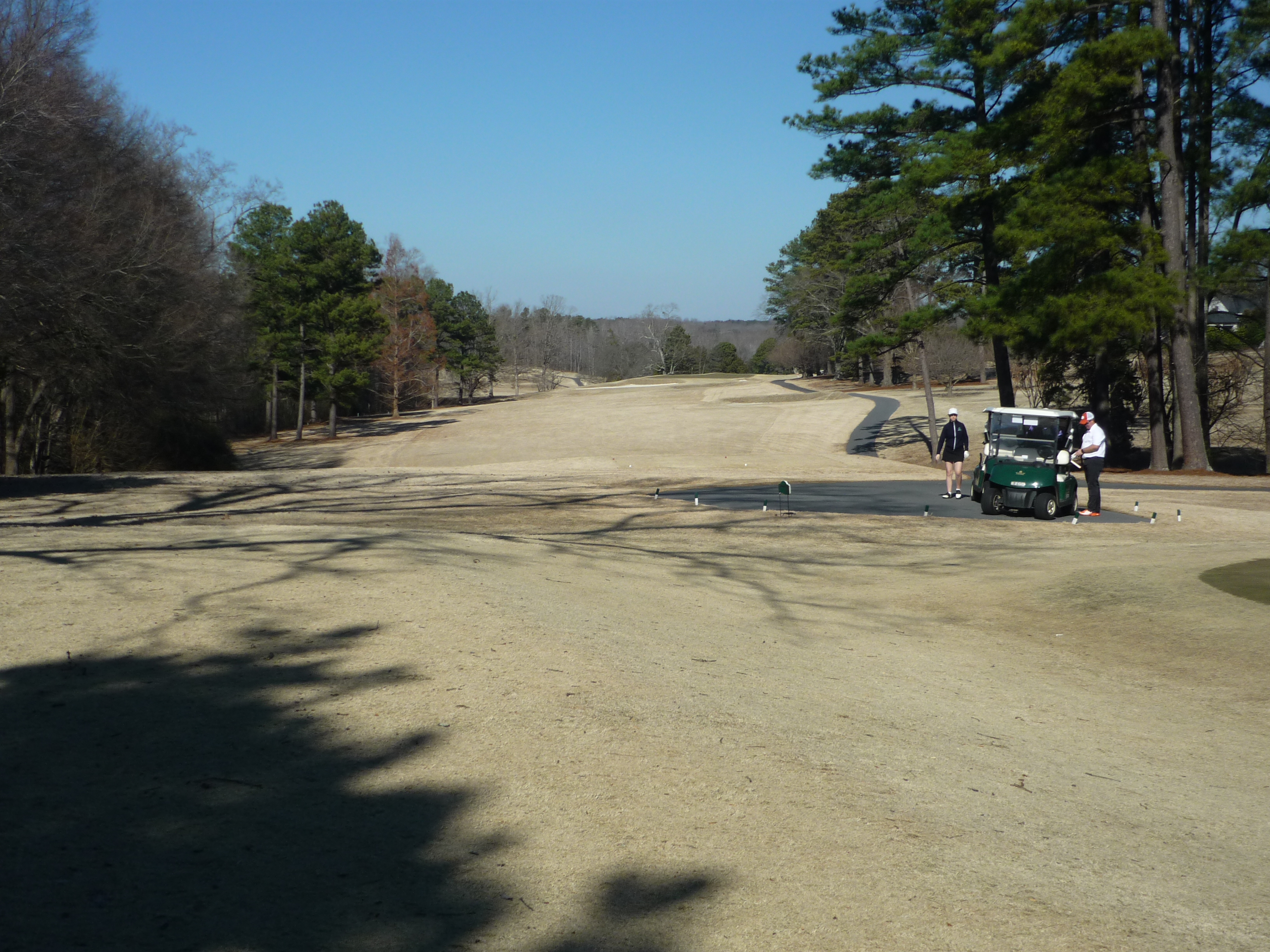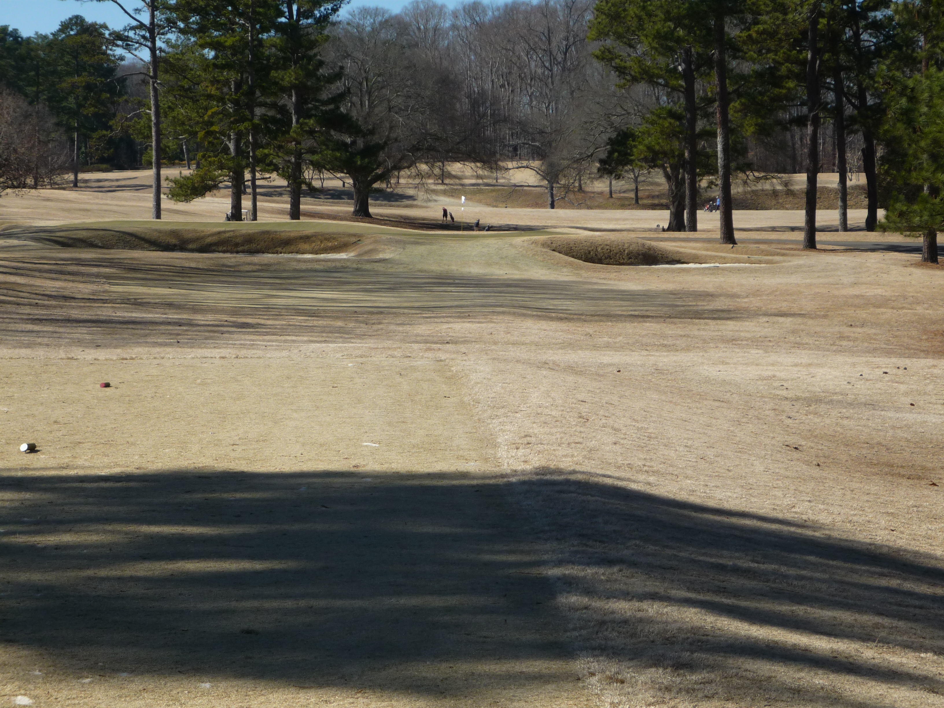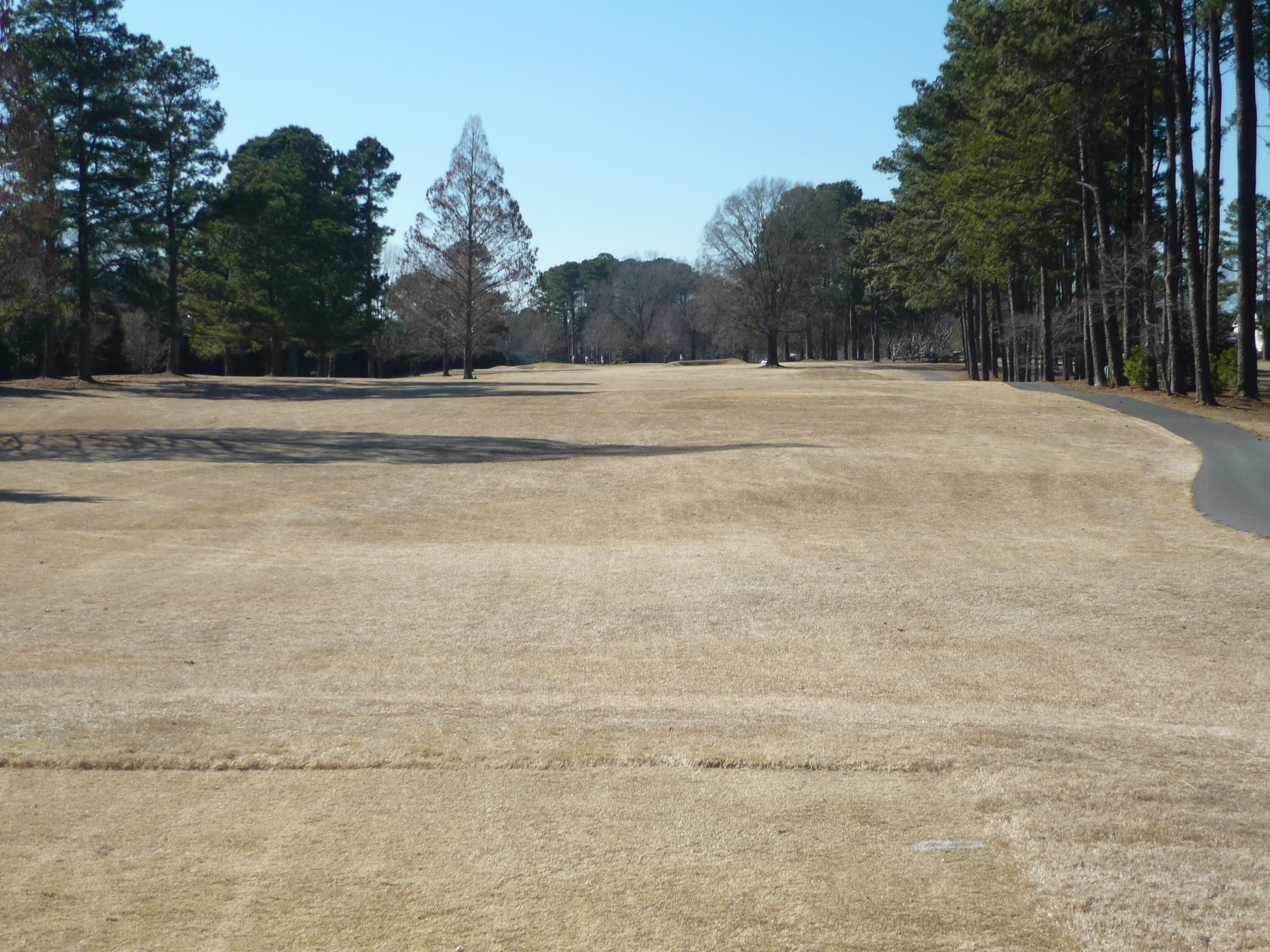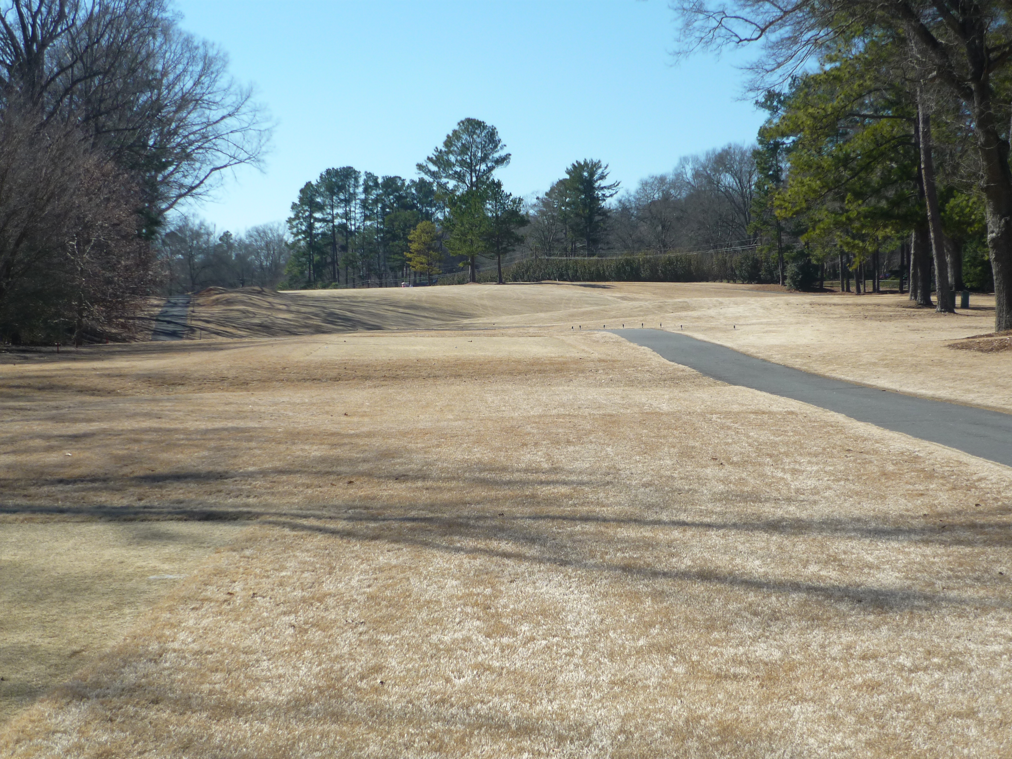 The tee aims you down the left side of the hole. At this time of the year the big tree on the right is less fearsome since it has no leaves. A big drive can clear that tree and leave a shorter approach.