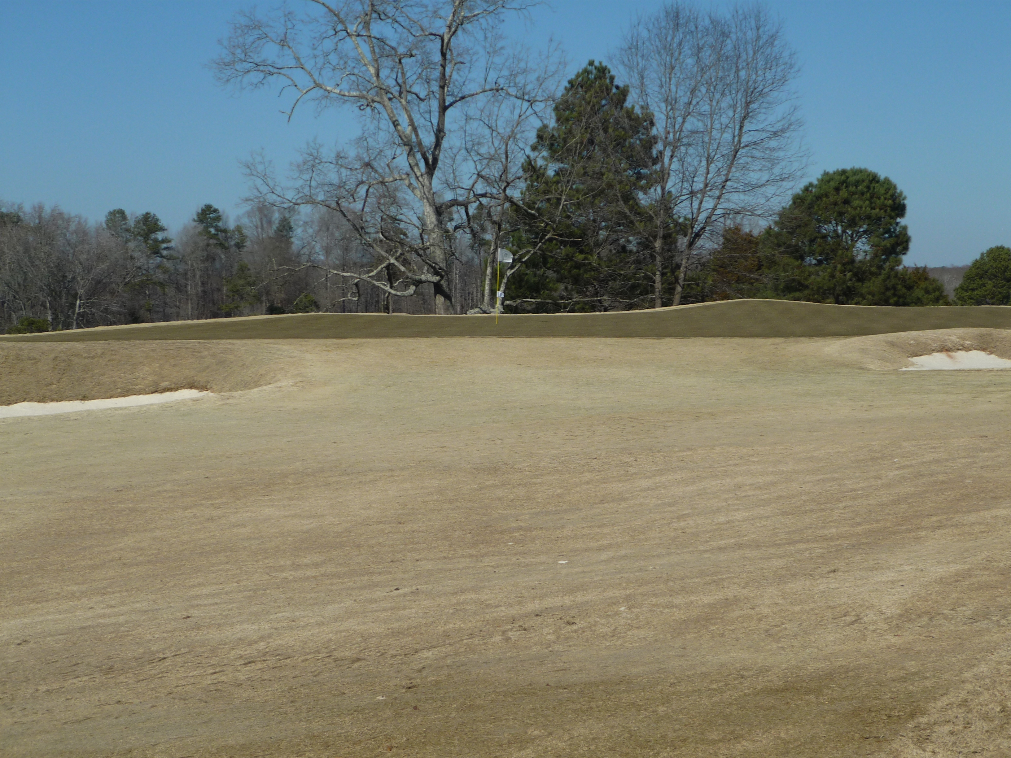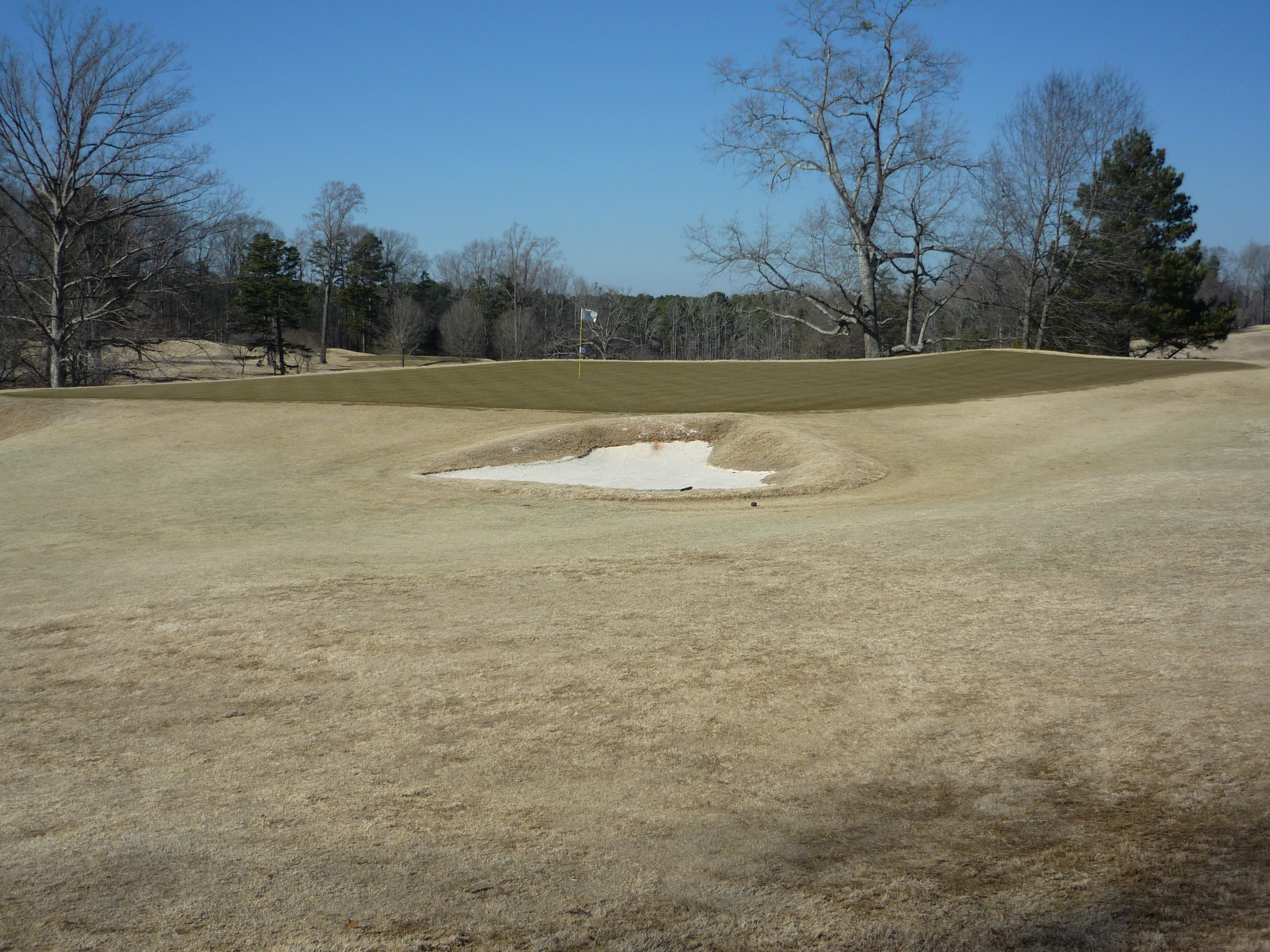 This is a stout par three. It plays uphill all the way. Anything short will most likely roll down the hill a little ways. The bunkers are very deep.