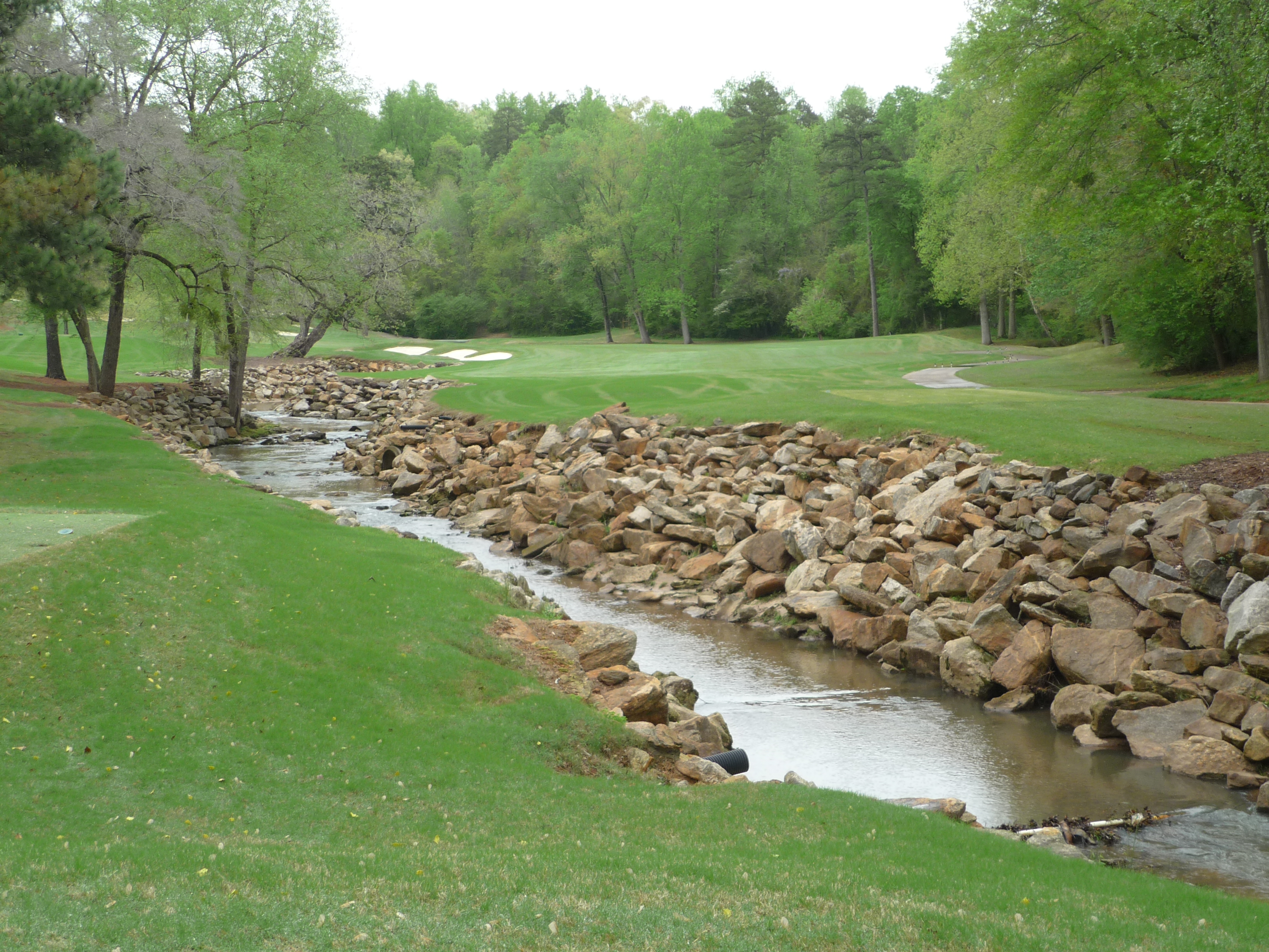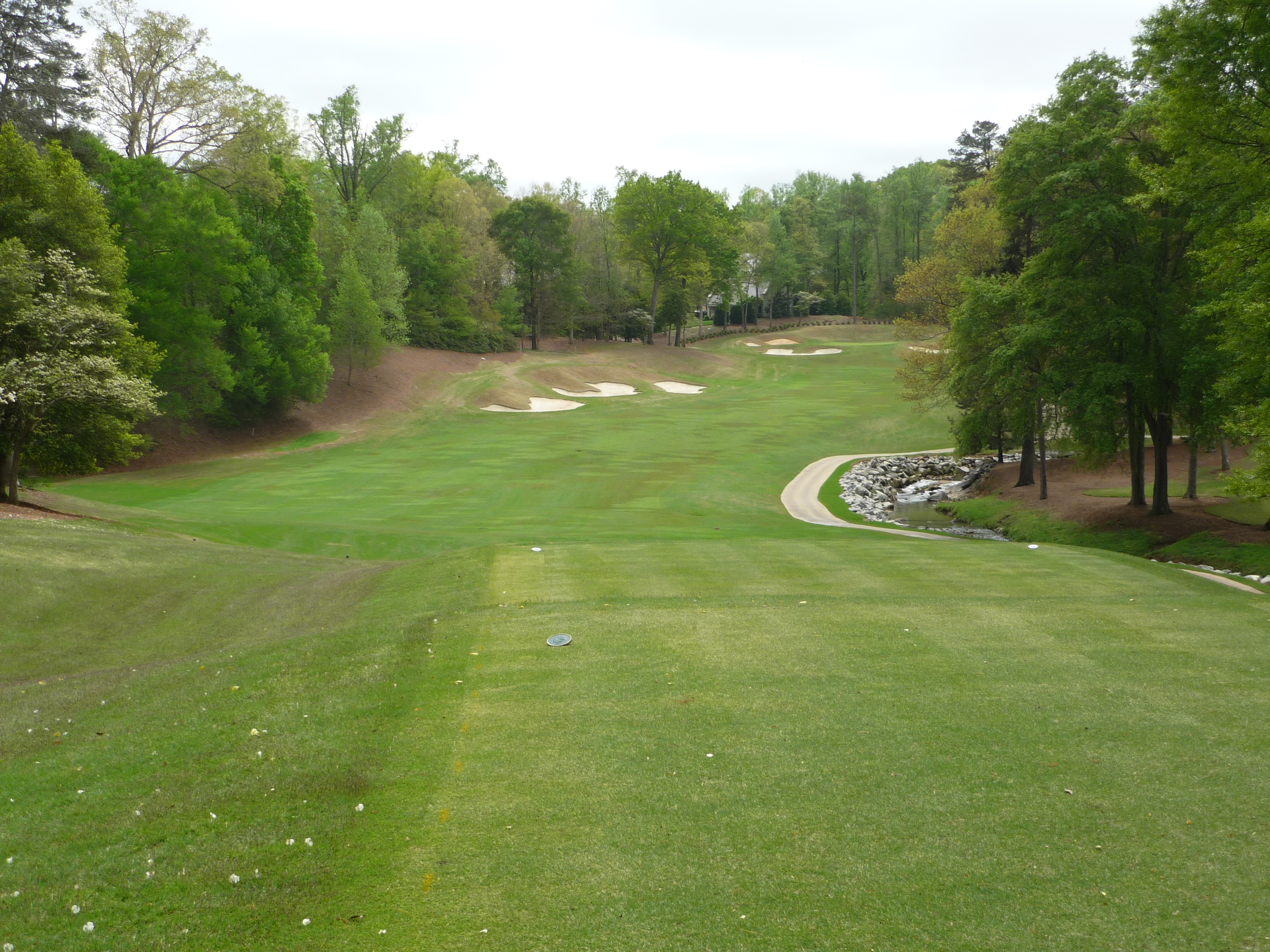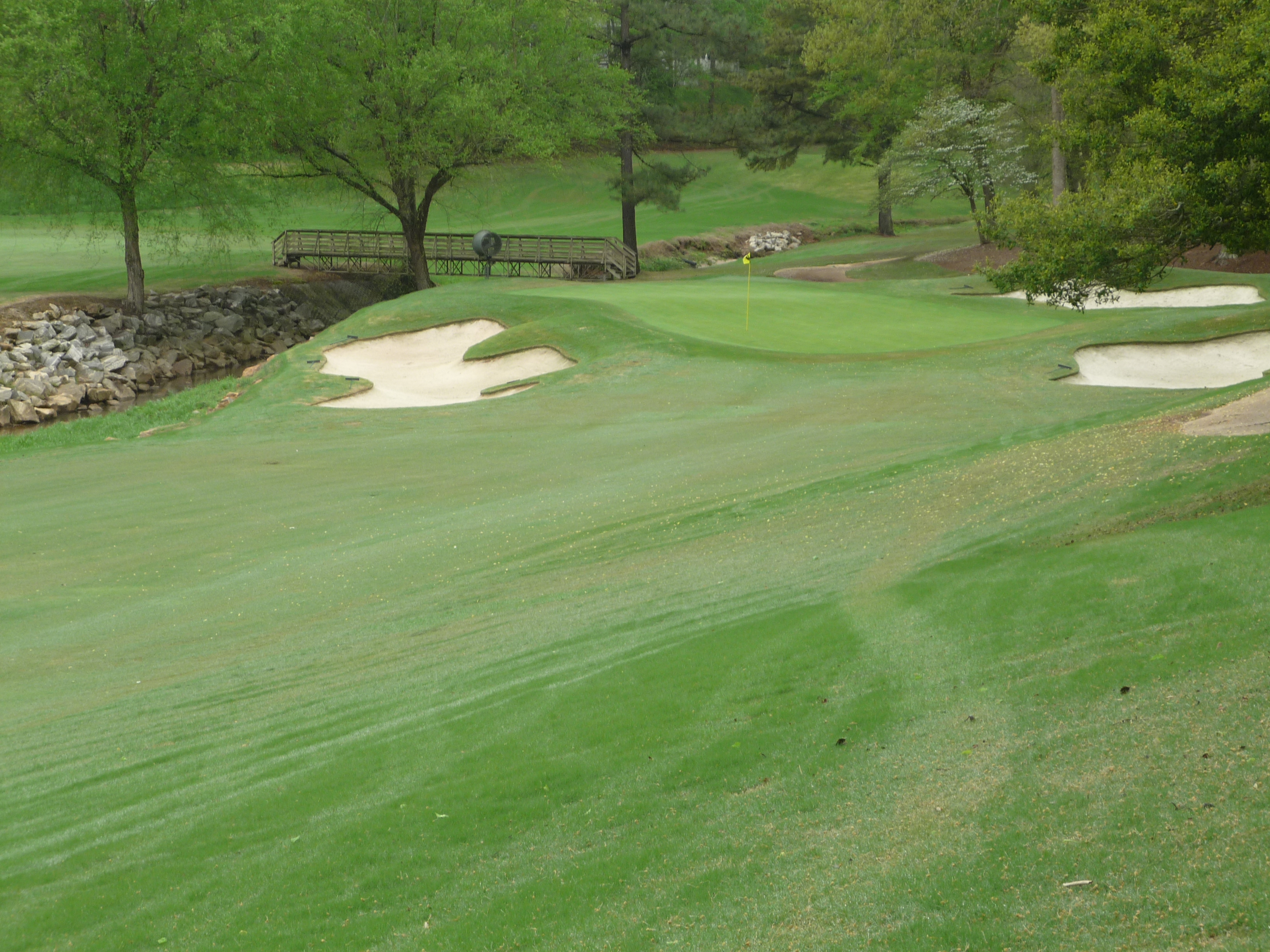 The approach is played over that creek with some nice rock work in it. A good drive will leave a wedge shot, so clearing the water shouldn’t be too bad.
