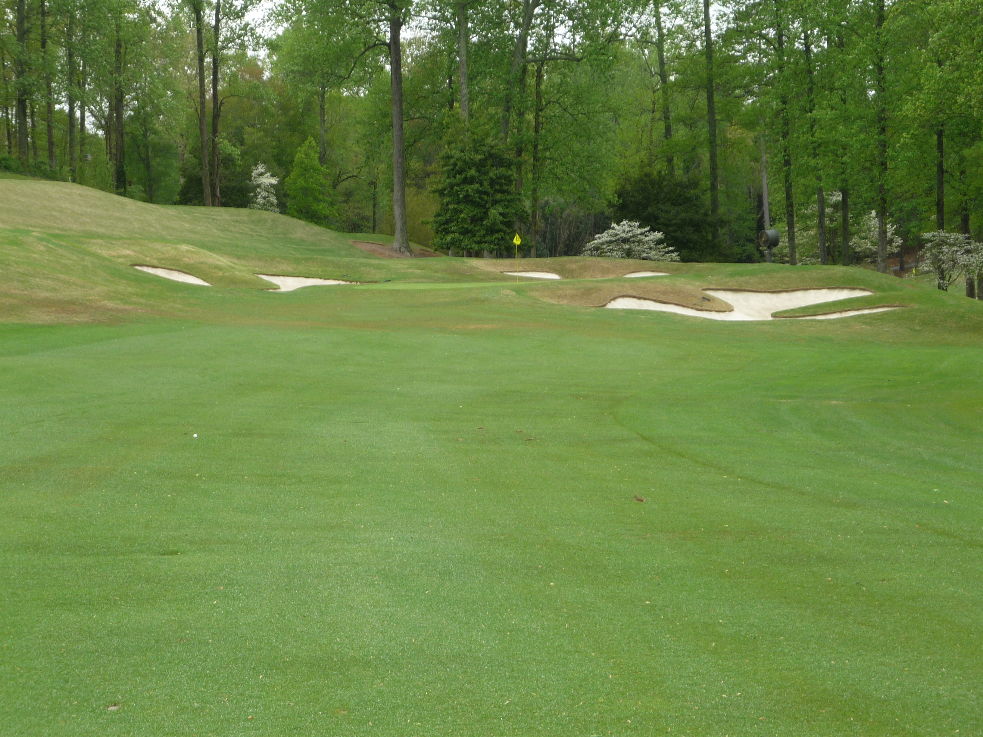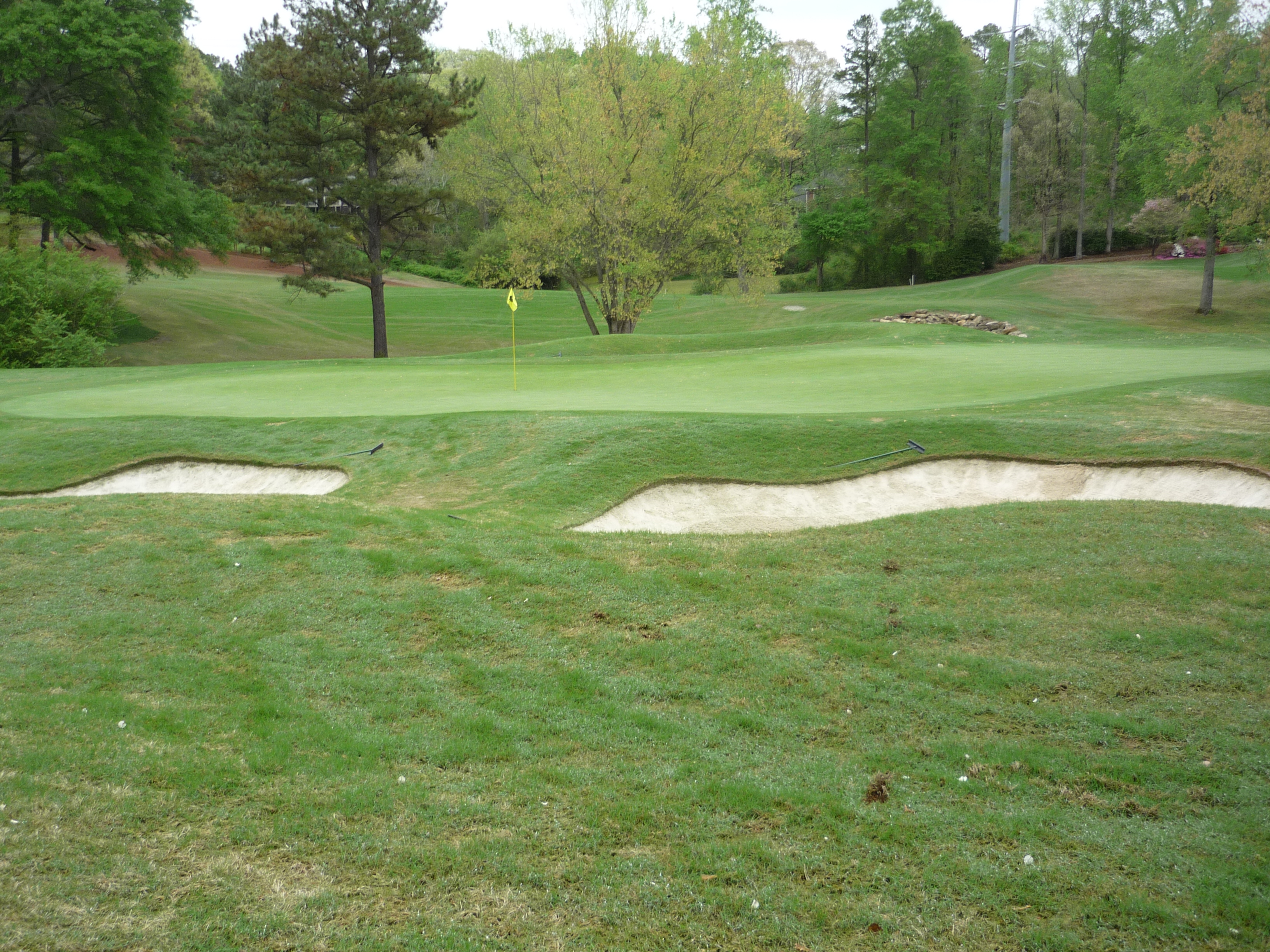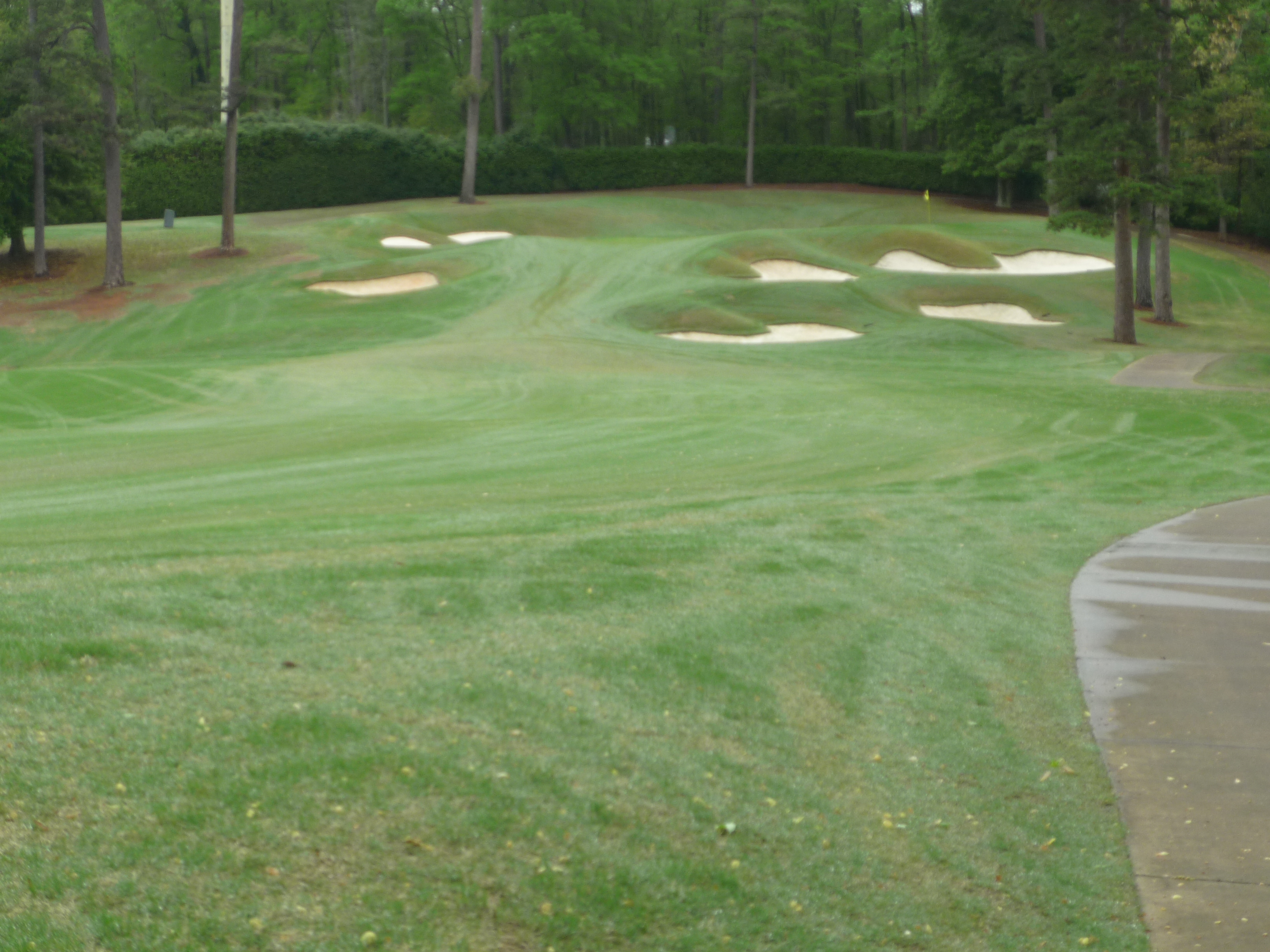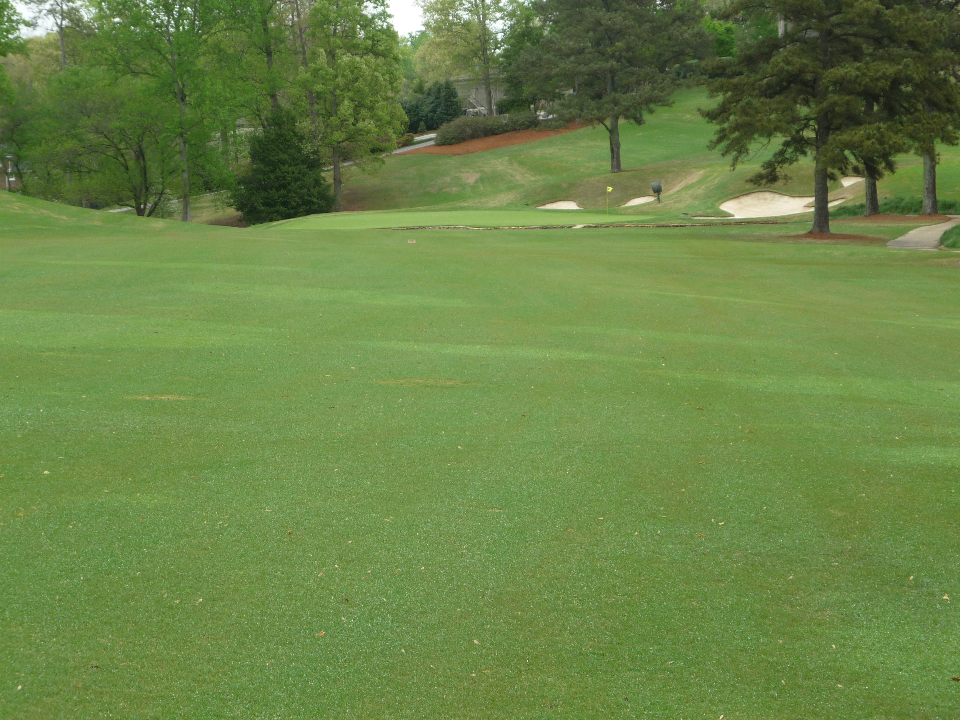 The approach shot is straight up the hill. Get a load of those bunkers. They are very deep and make par almost impossible if you find yourself in there.
