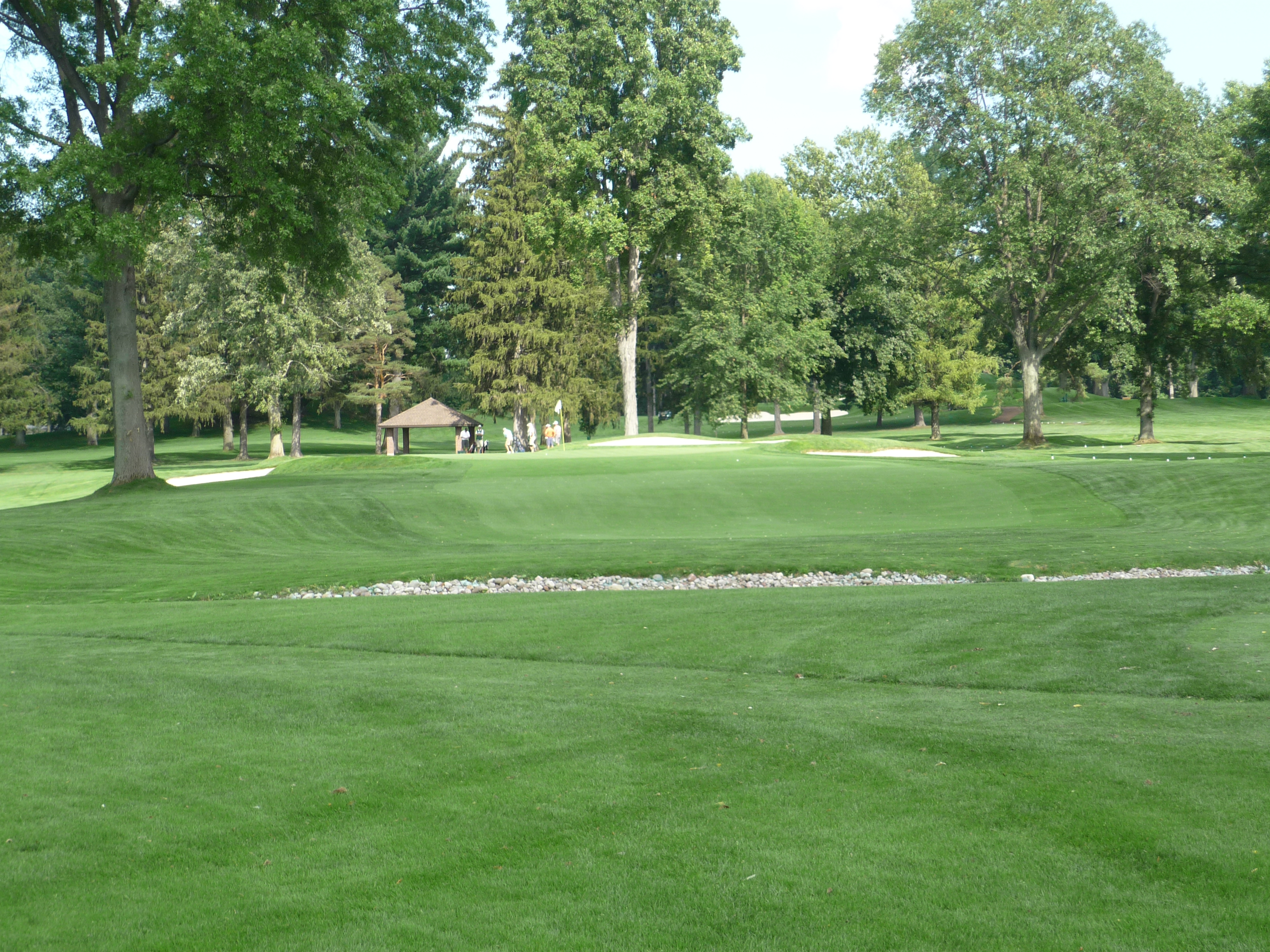 This approach is another one over the creek. The green is elevated and edged with three bunkers.