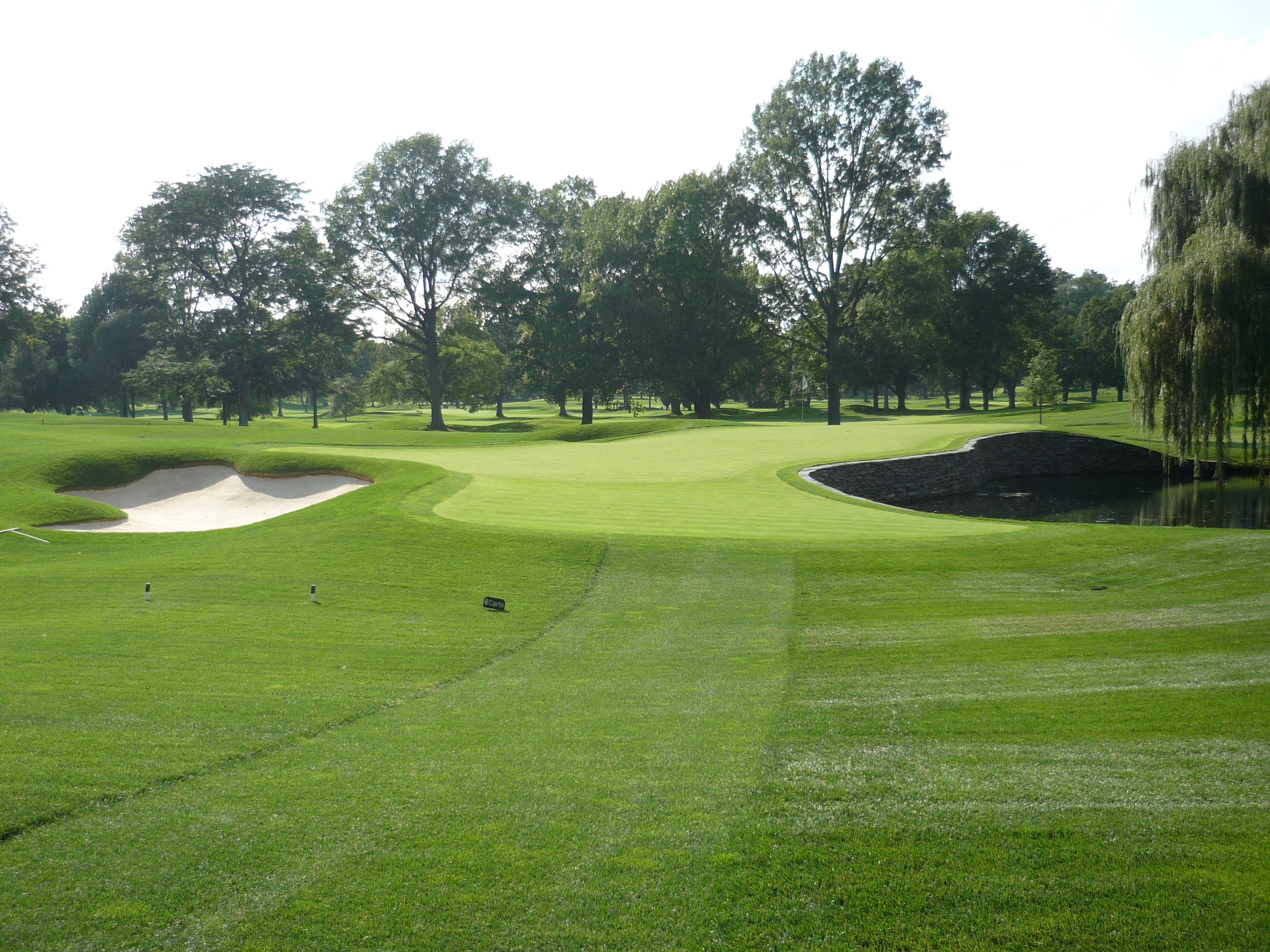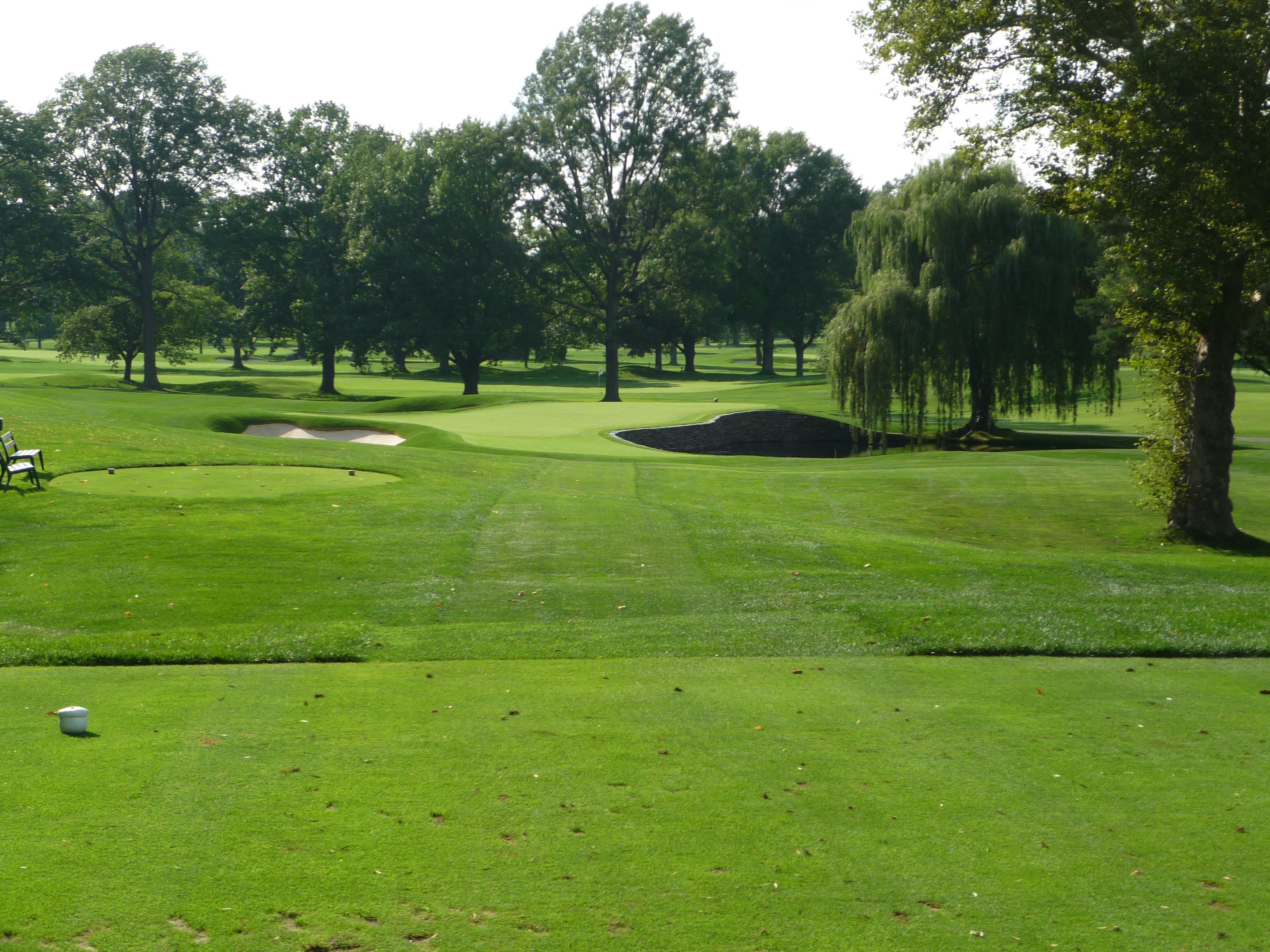 This short hole is guarded by a creek that wraps around everything but the right side. In the 1989 US Open four hole in ones were recorded here in the second round.