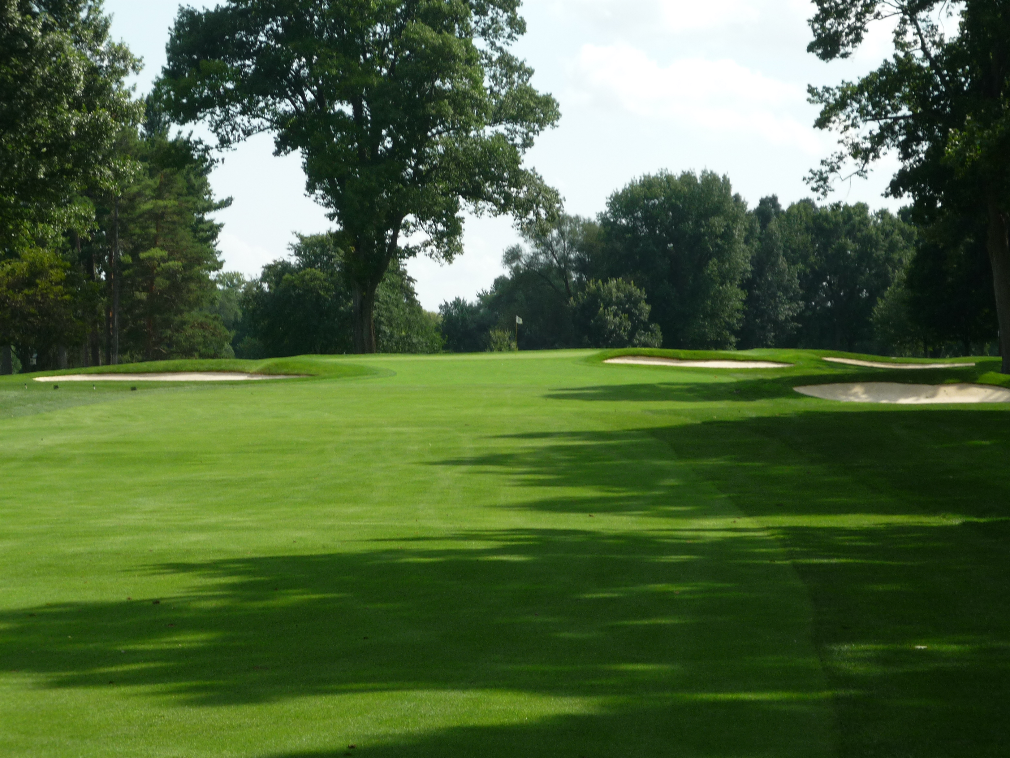 This fairway is bordered by deep bunkers on both sides. A road also runs along the right side of the hole. A long drive is essential.
