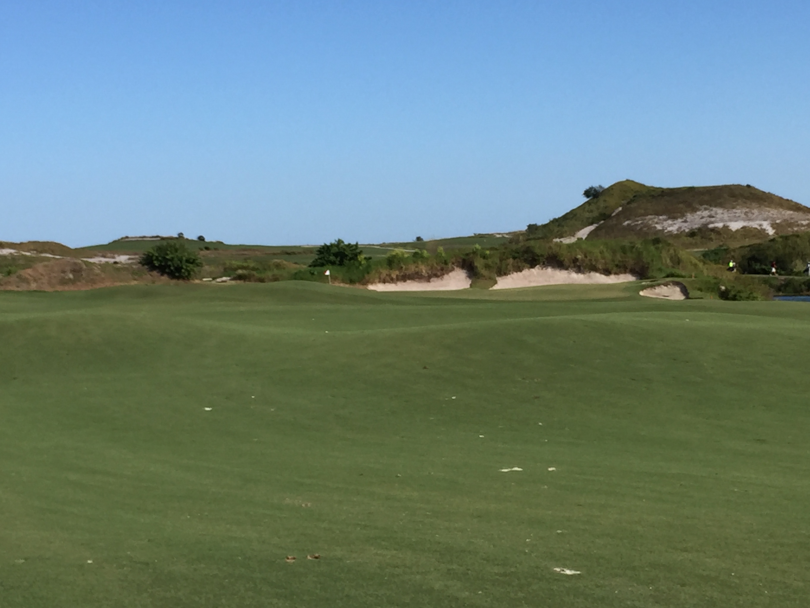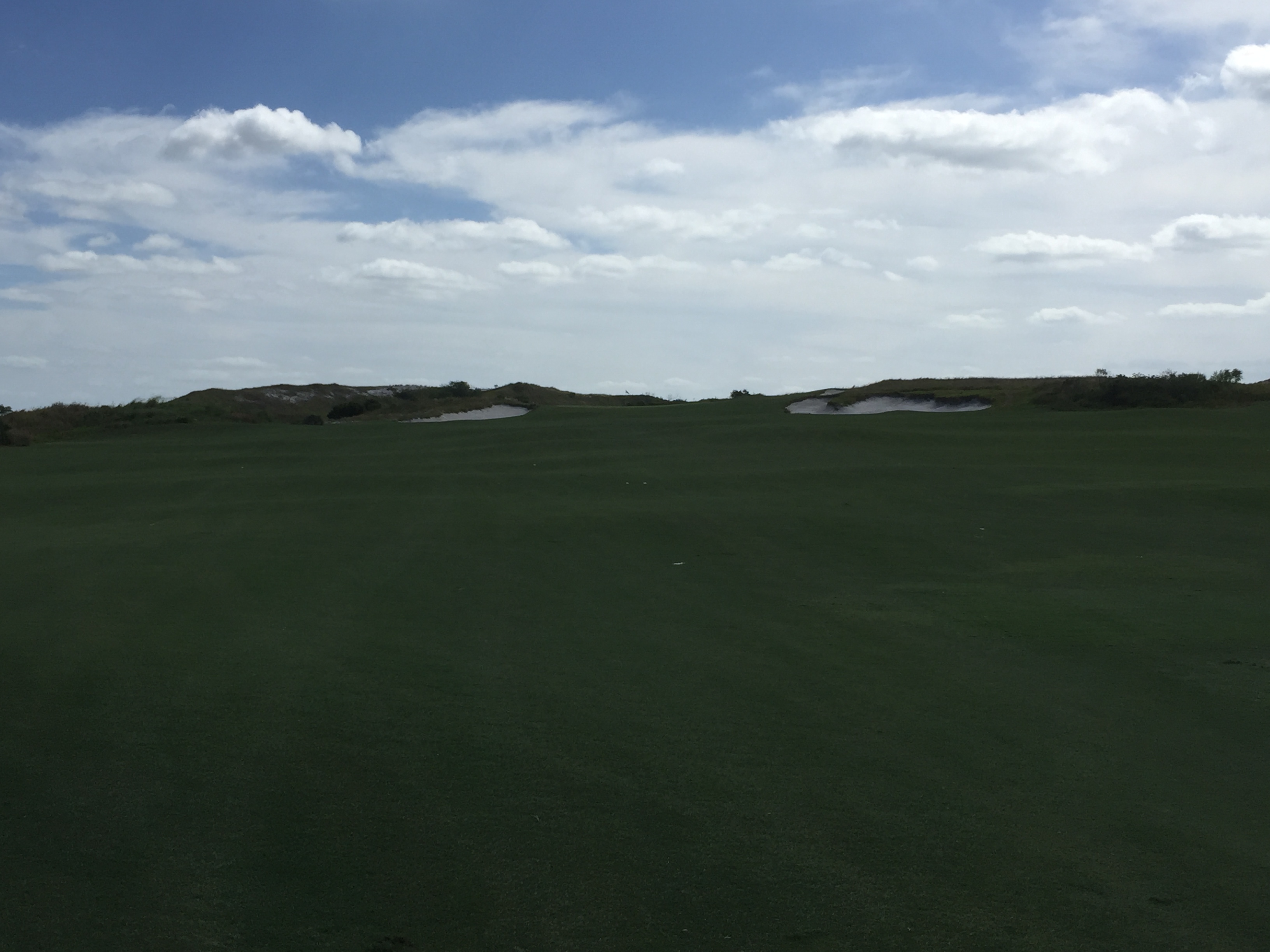 This hole can be reached if you have a favorable wind or if you are a big hitter. You can barely make out the green to the right of the bunkers in the middle.
