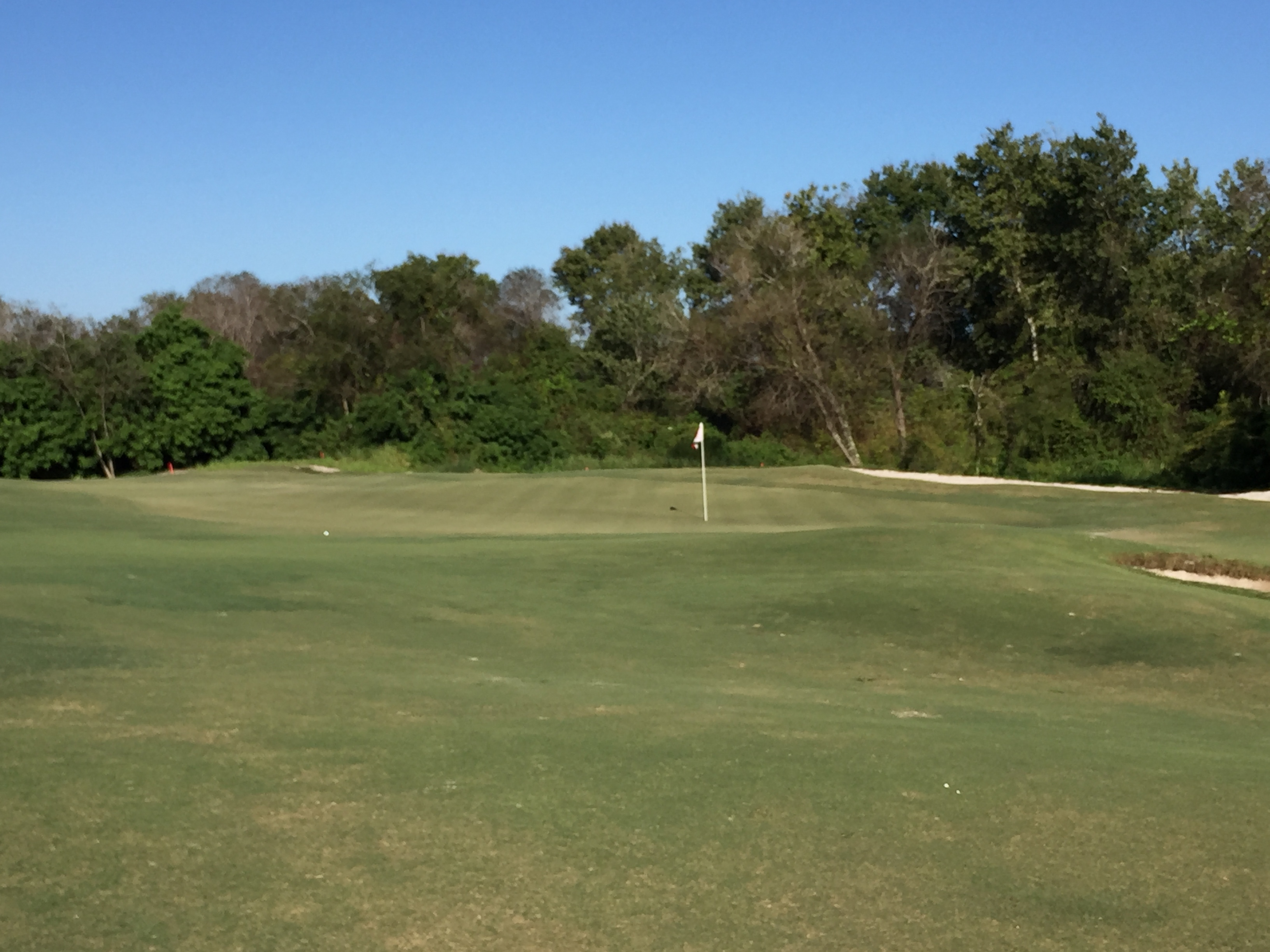 This is probably the craziest hole on the course. Over the water to the most undulating green of the 18. We were into the wind so it player longer. The bunkers in the front are very deep.