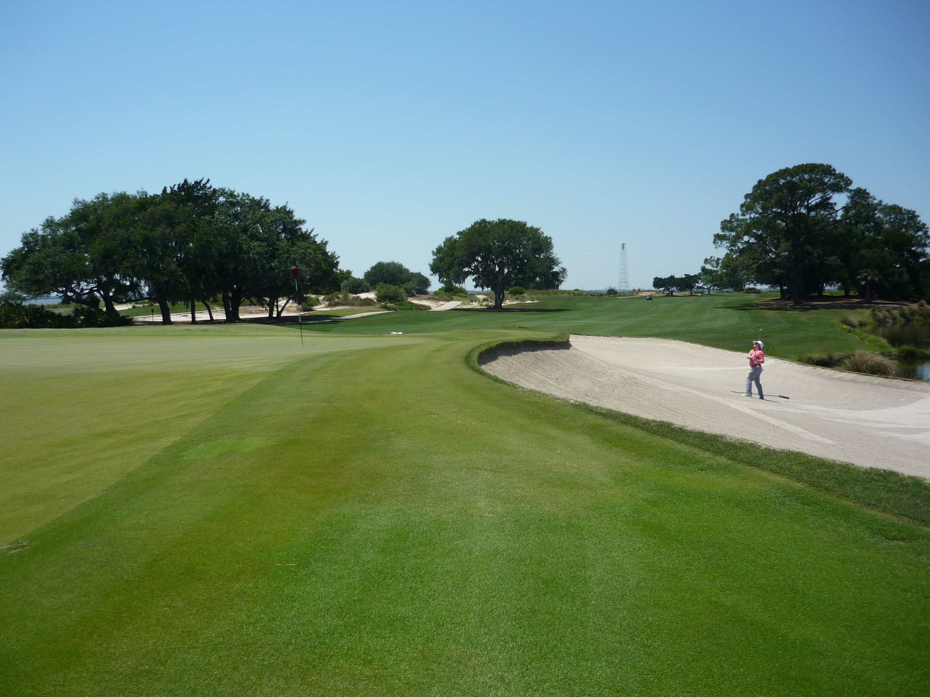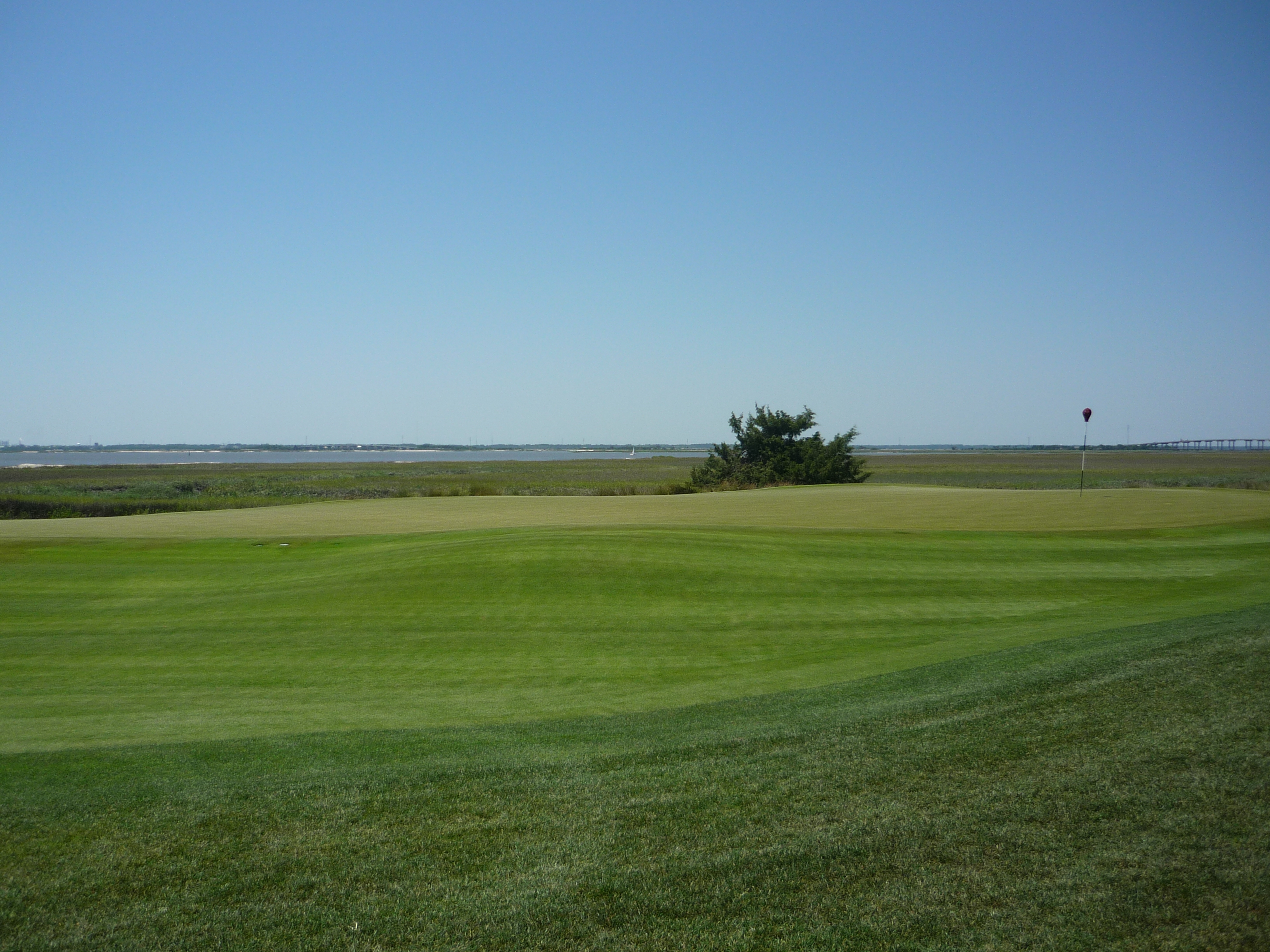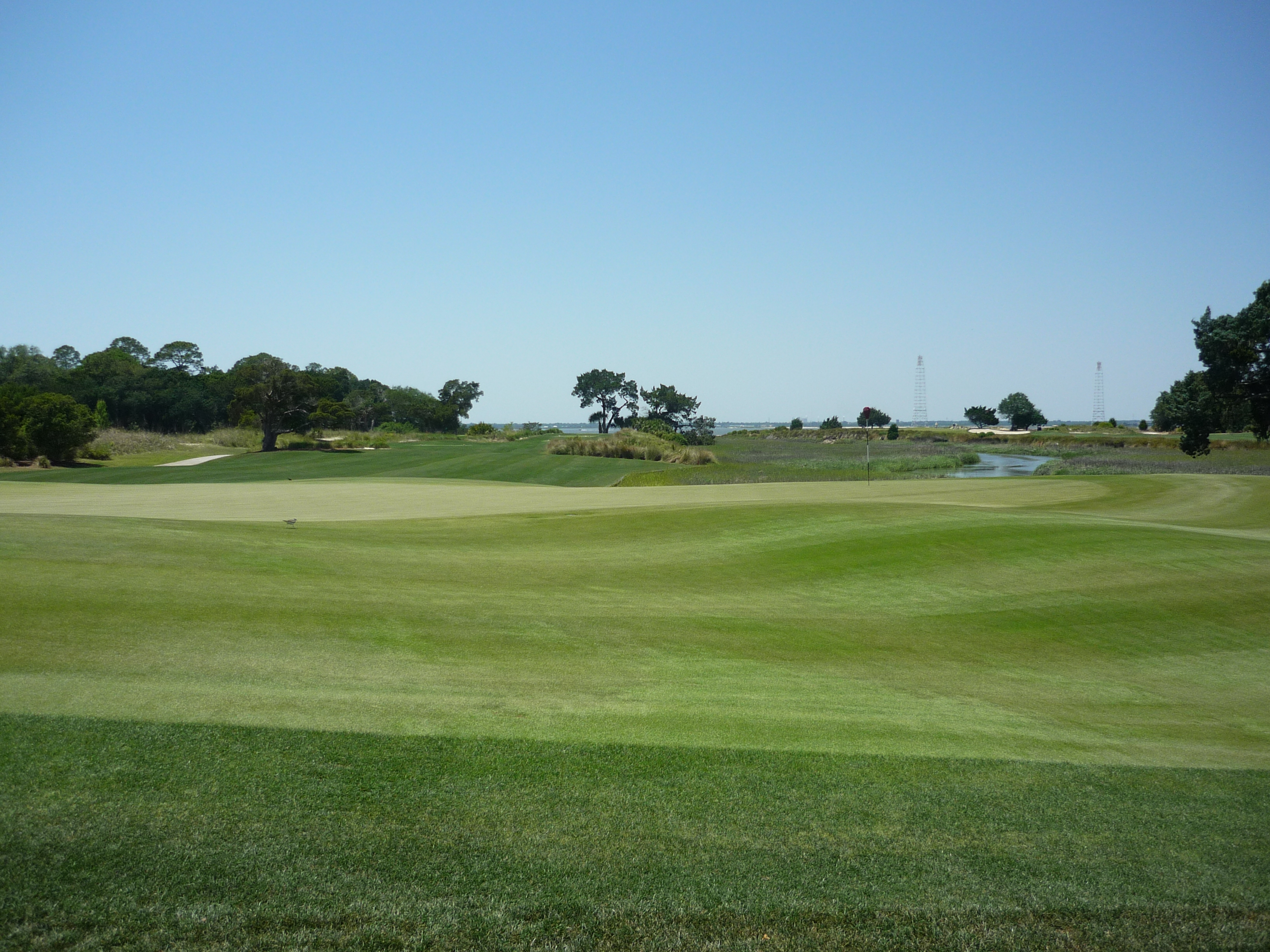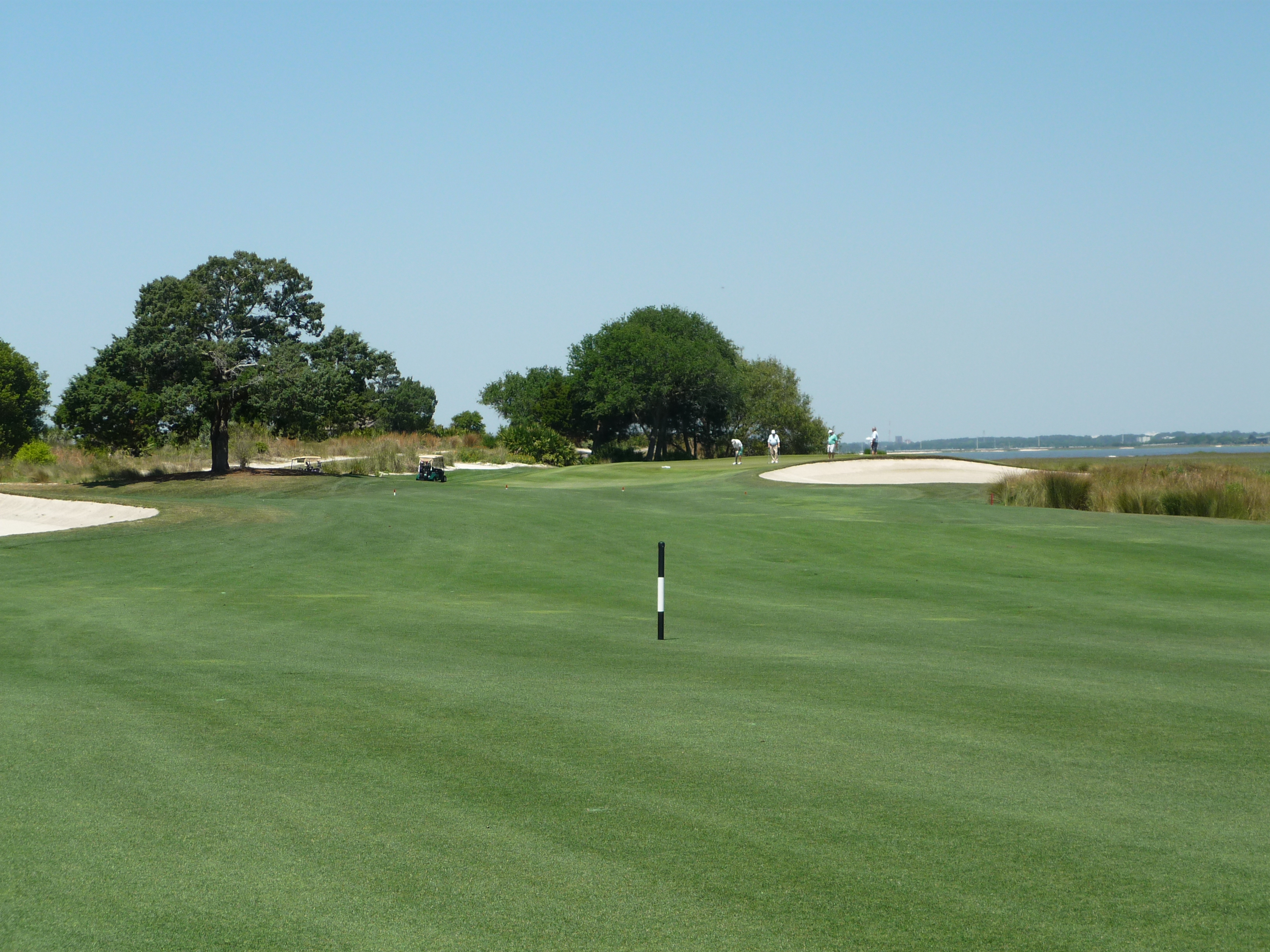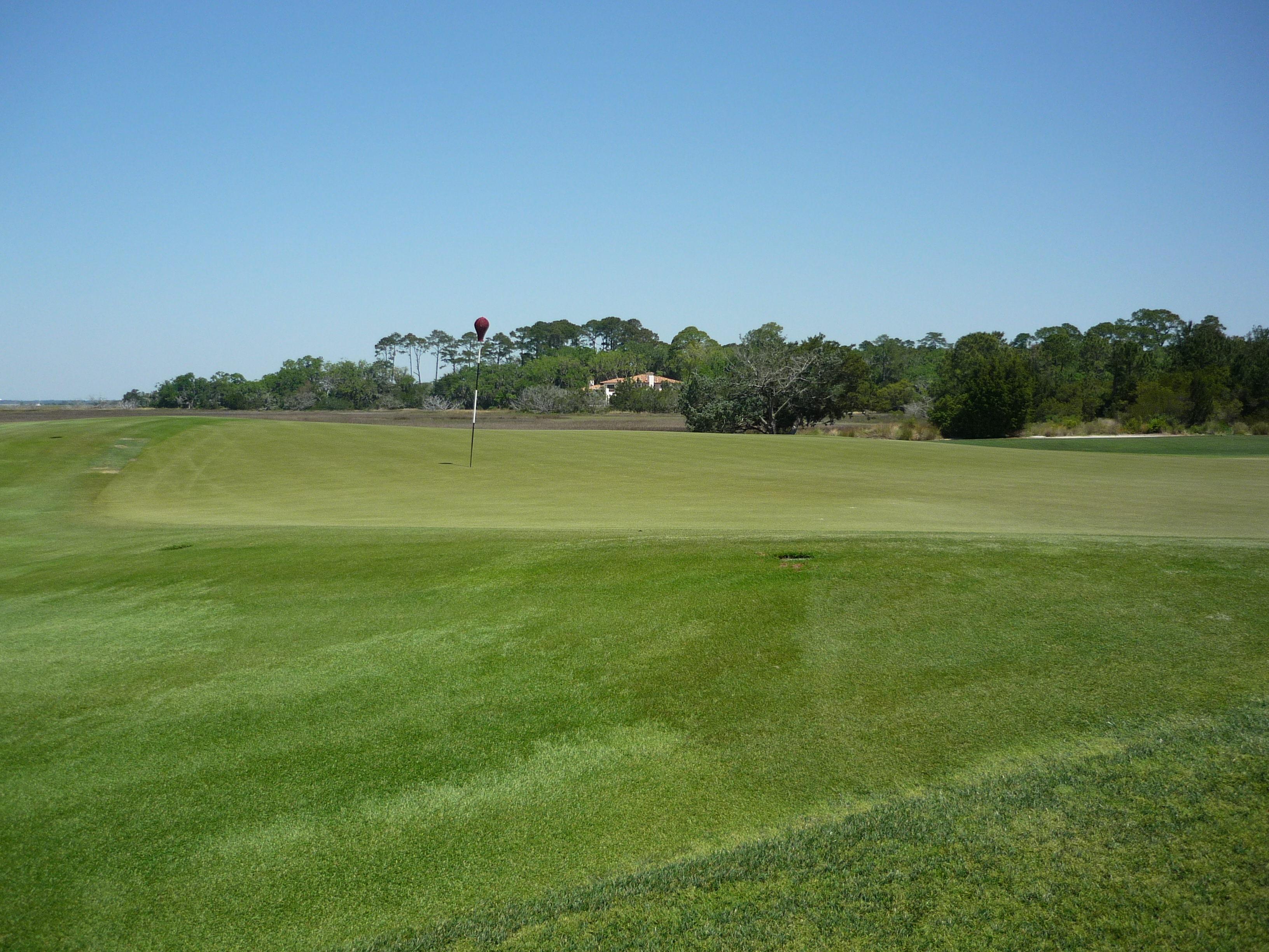 The second shot plays back to the left over the marsh. Like the last few holes the green is at the big bunker.