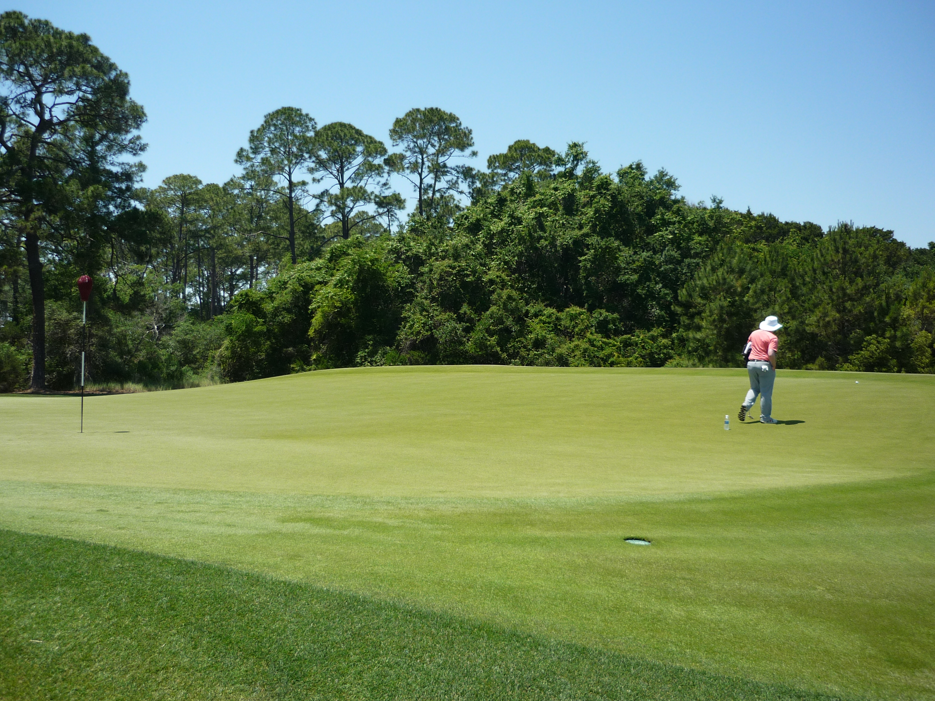 The shot below shows the slope of the green. There isn’t as much on this hole as some others, but there is still some movement there.