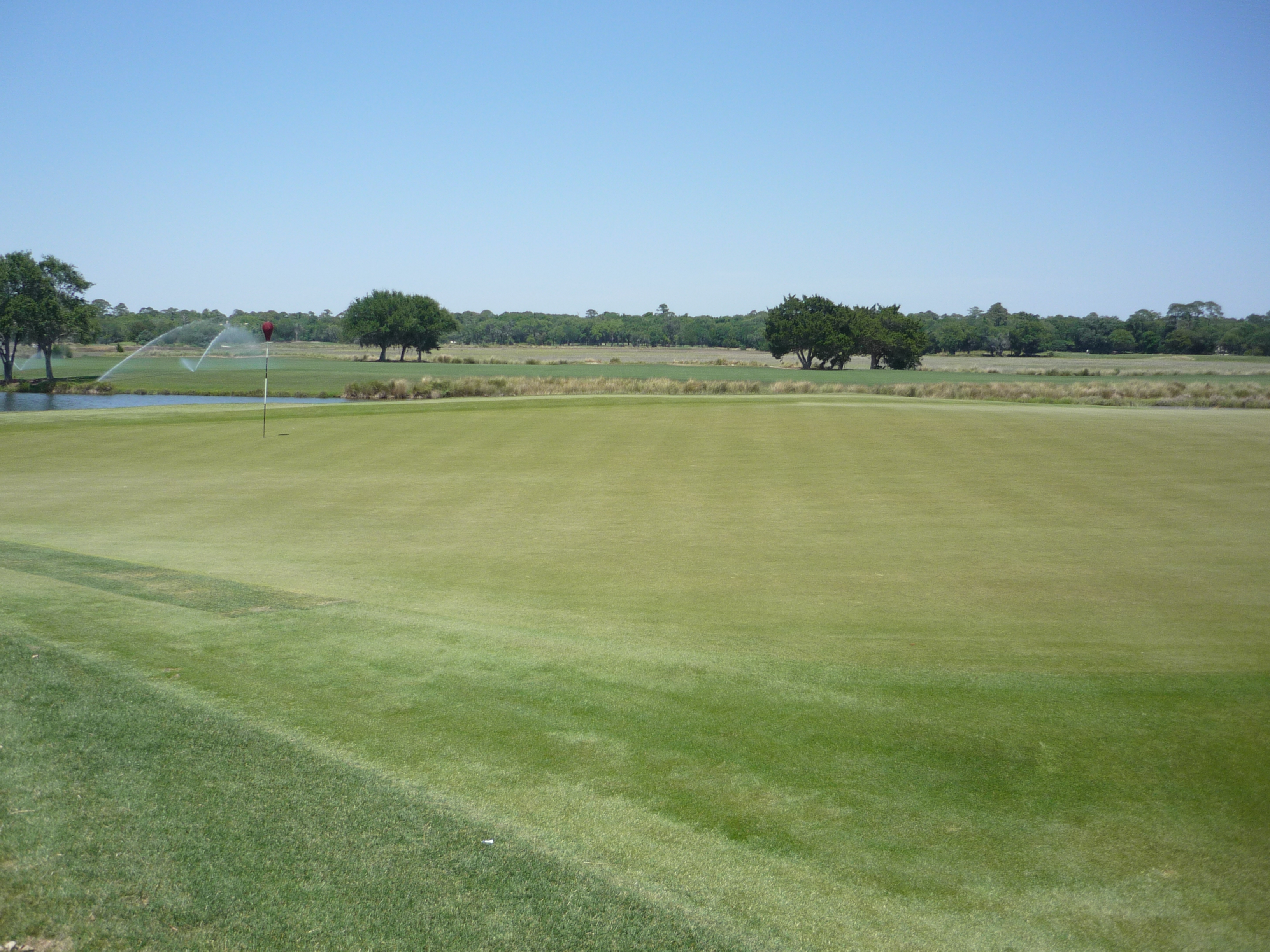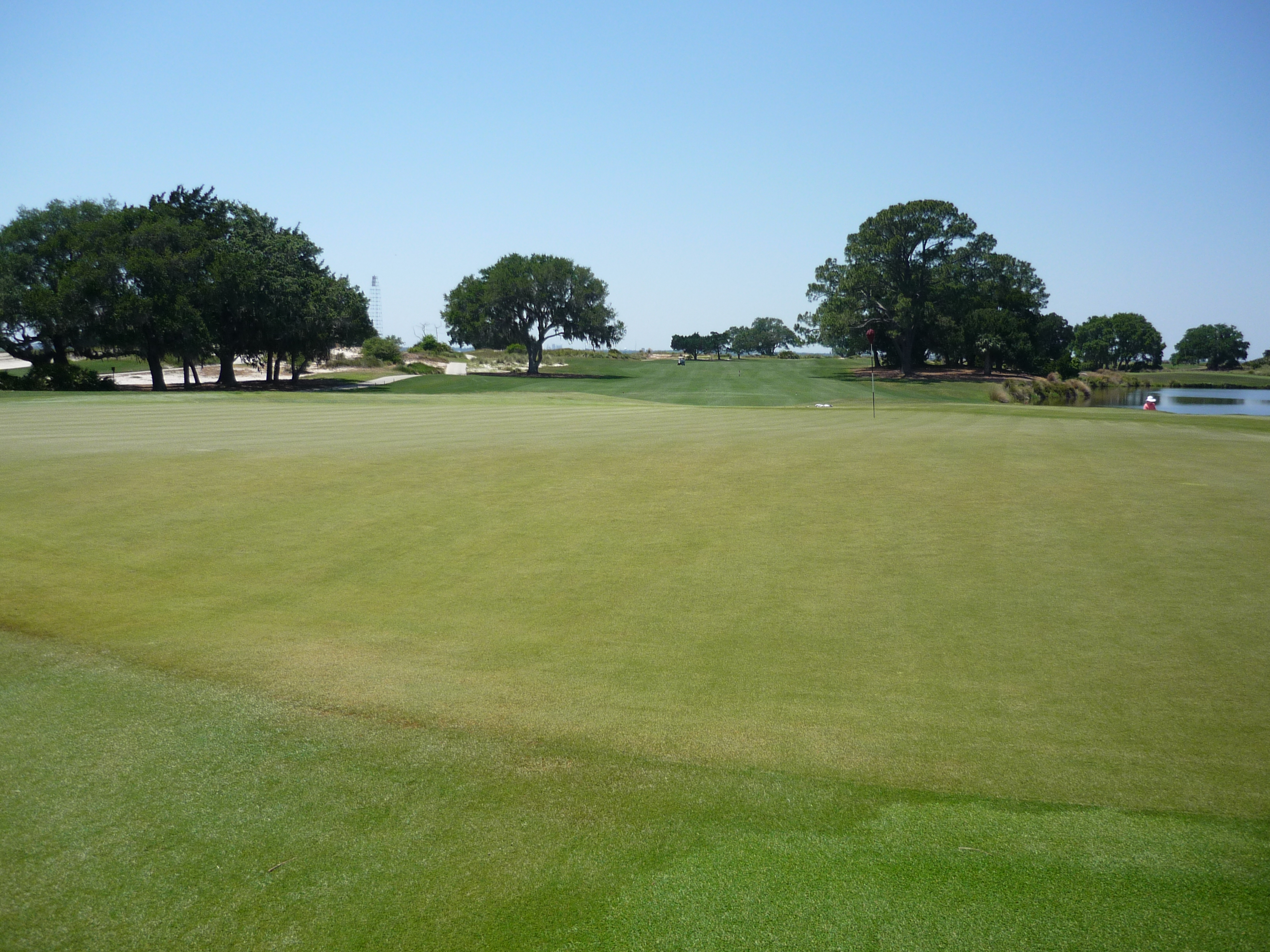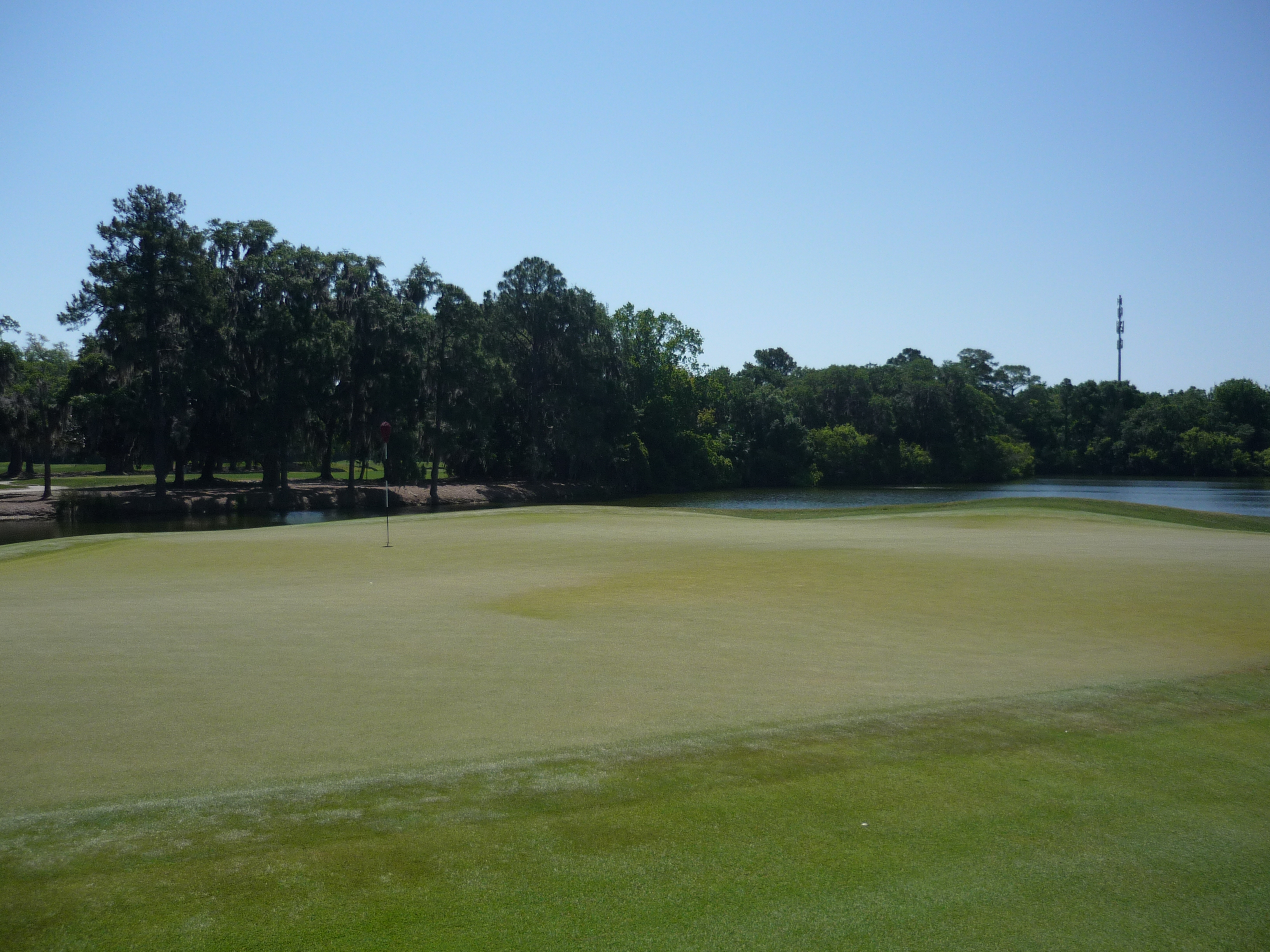 You can see the pond buffeting the green on the right. The green is another one that is slightly raised.