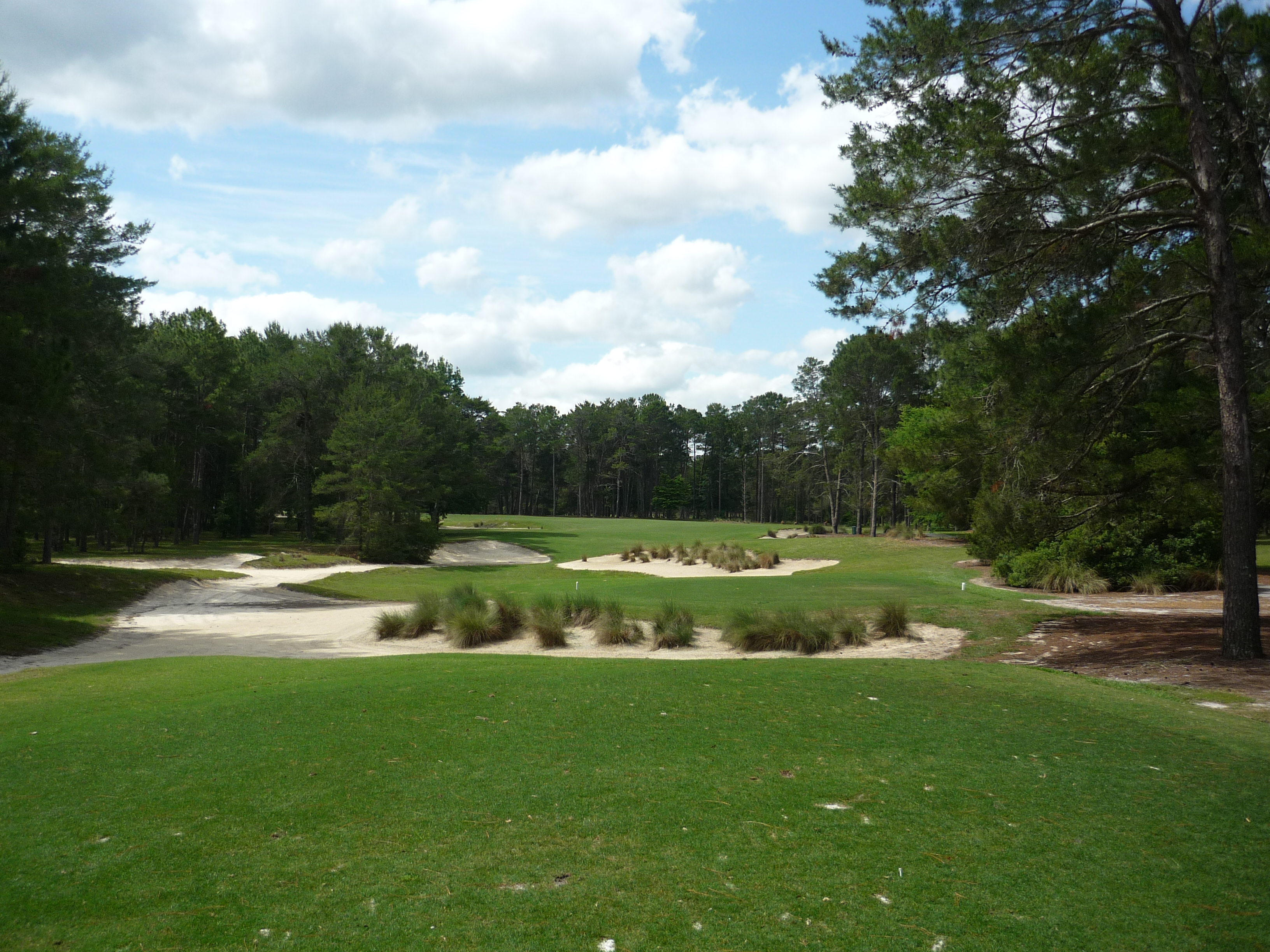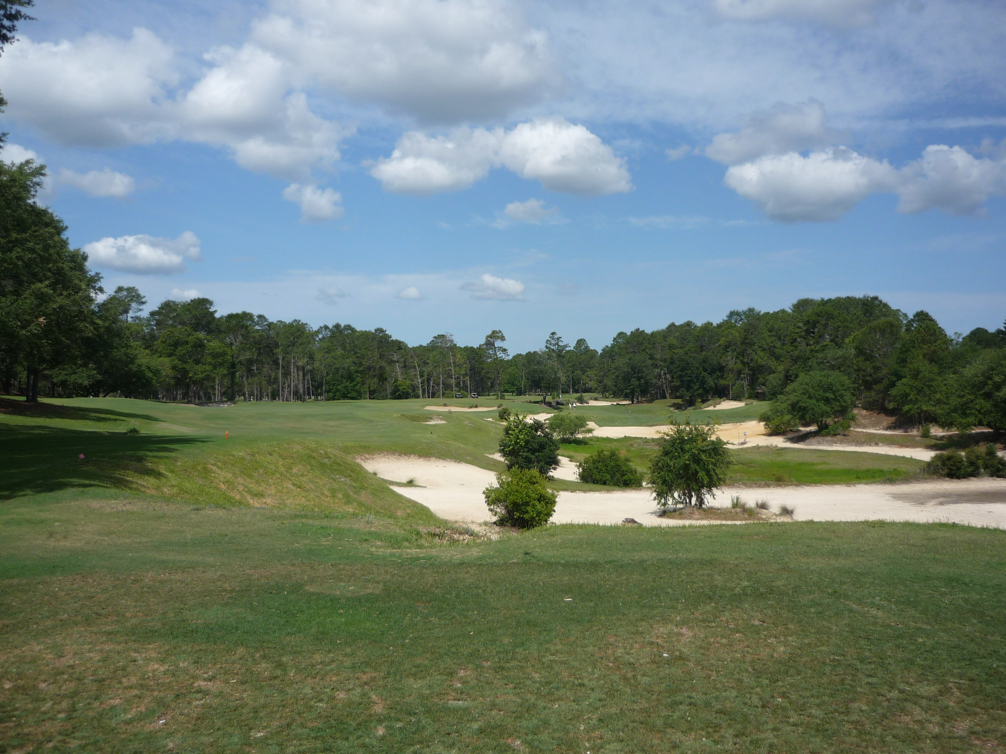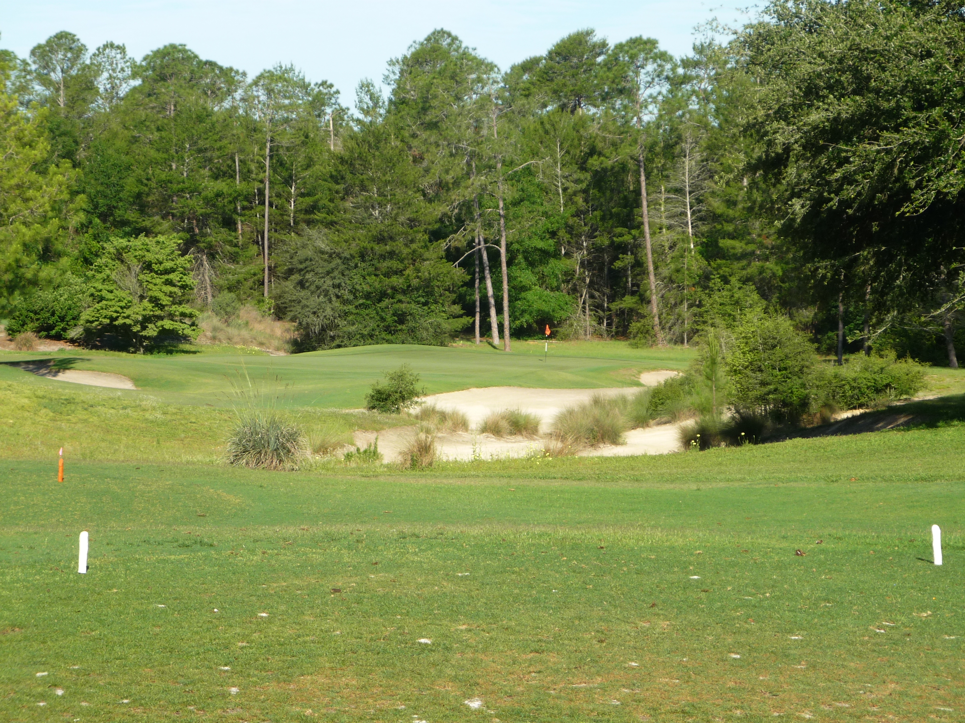 This one is ever so slightly down the hill. There is a lot of sand in the middle and continuing up the right. A fade works very well here and goes over the least amount of trouble.