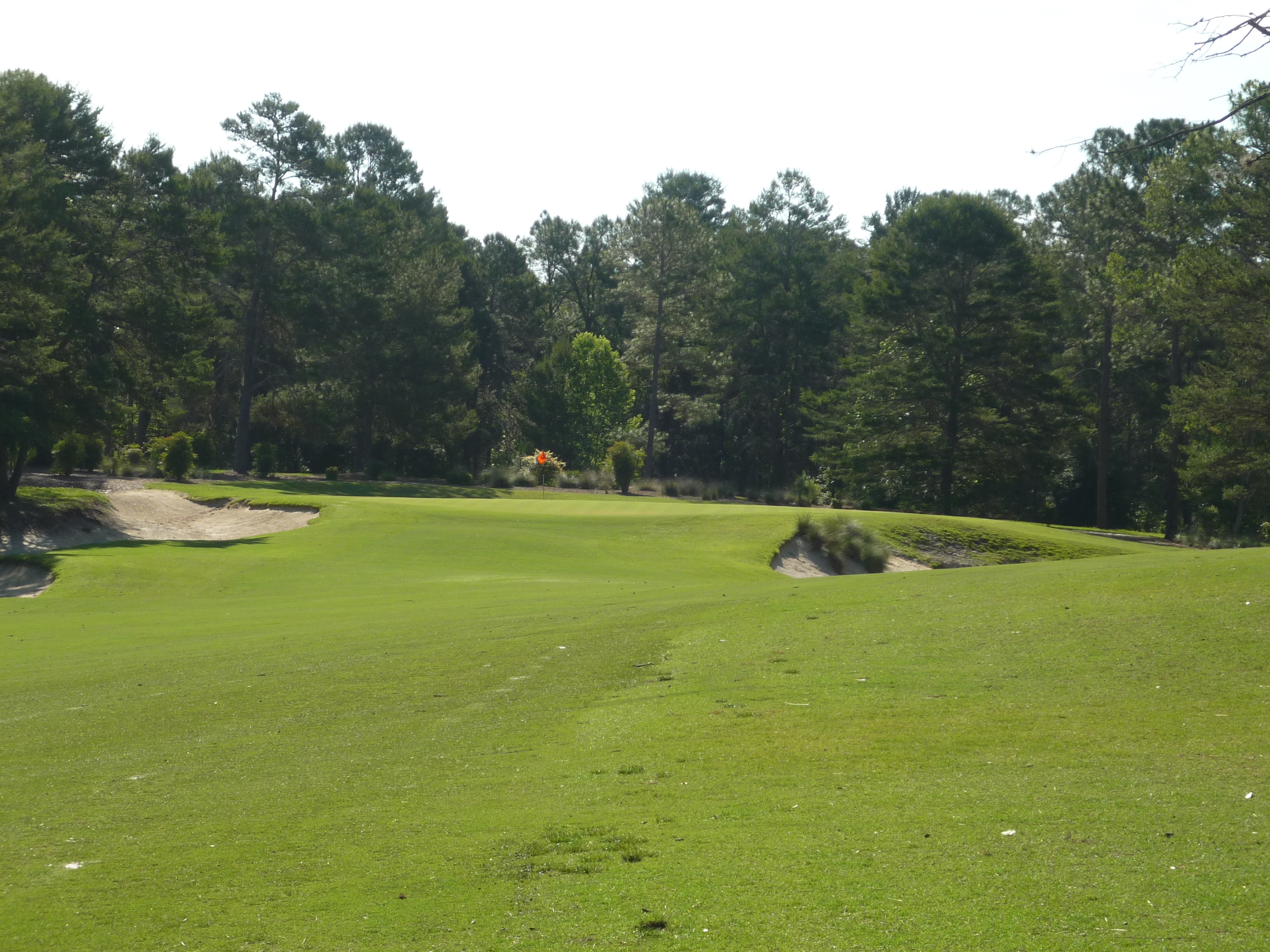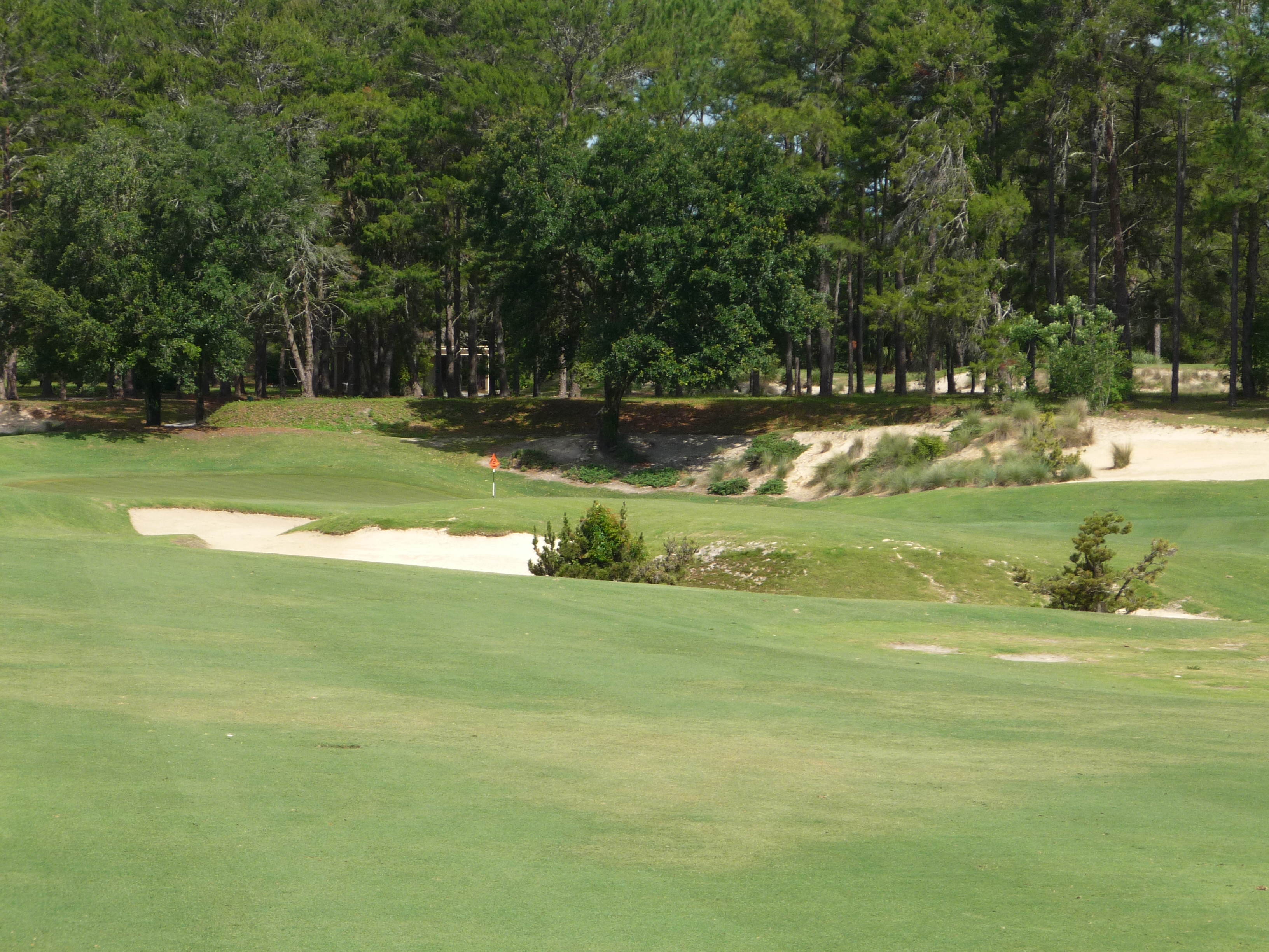 The approach plays to a smallish green you can see below. You can see the bunkers have tufts of grass in them that add another layer of difficulty.