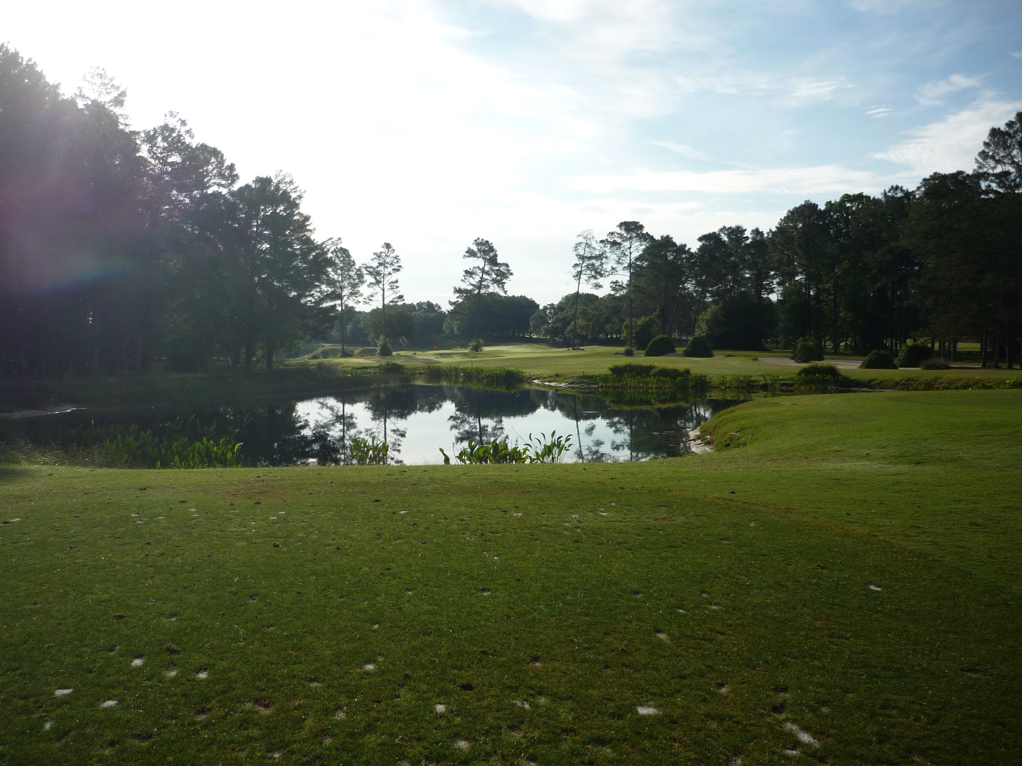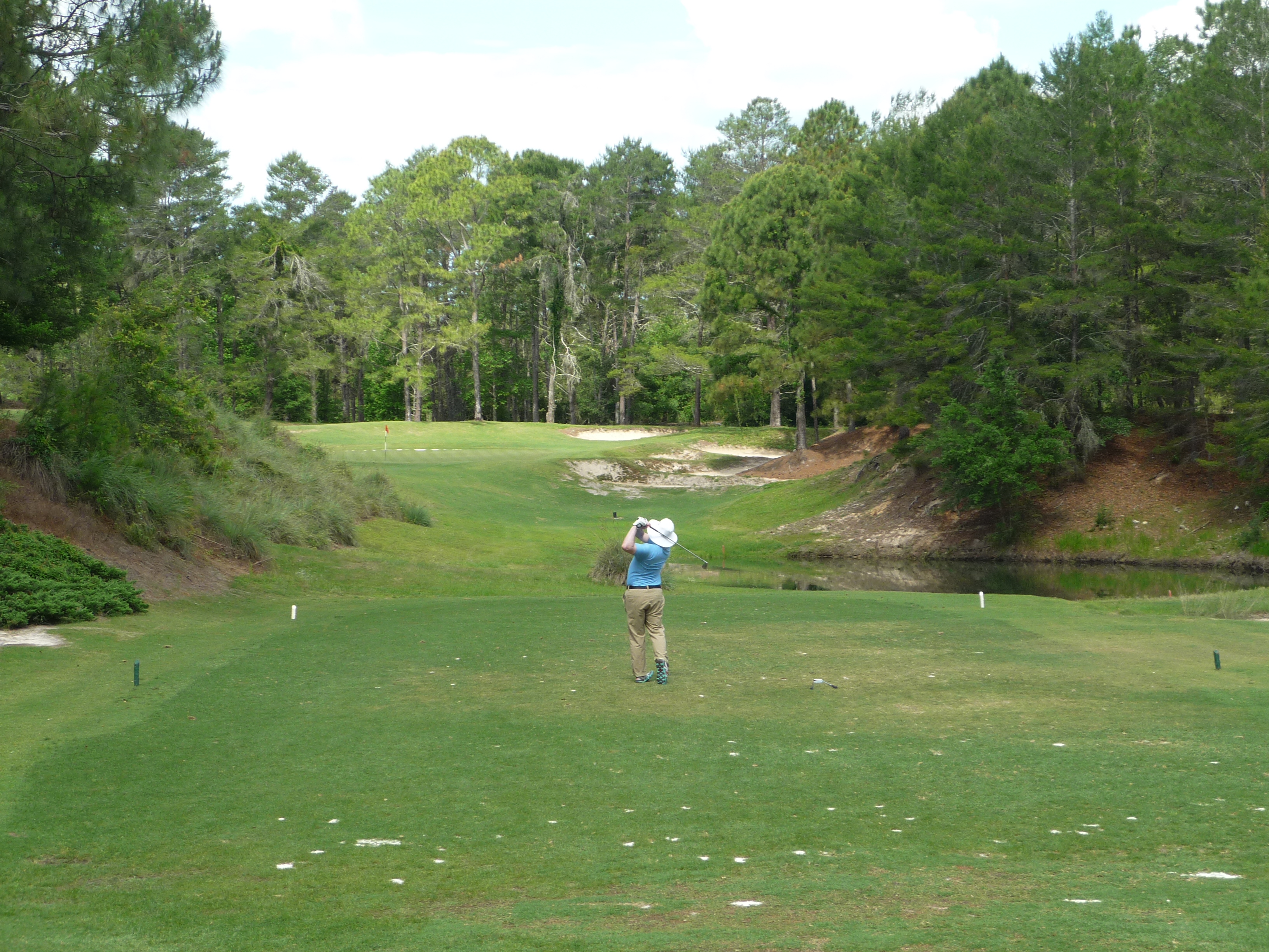 This par three sits in a little hollow. The pond is not in play. Here is a shot of me taking it on.