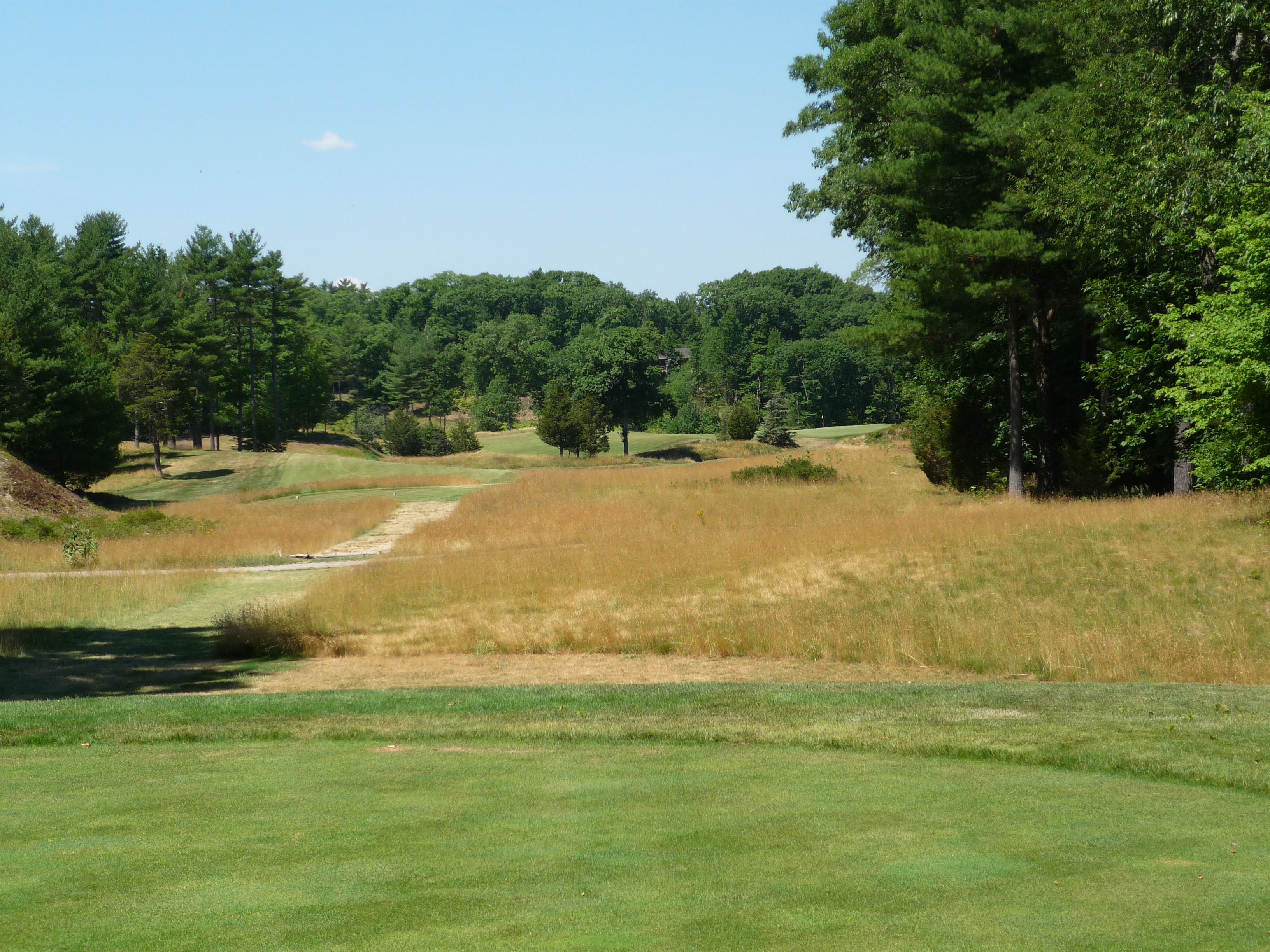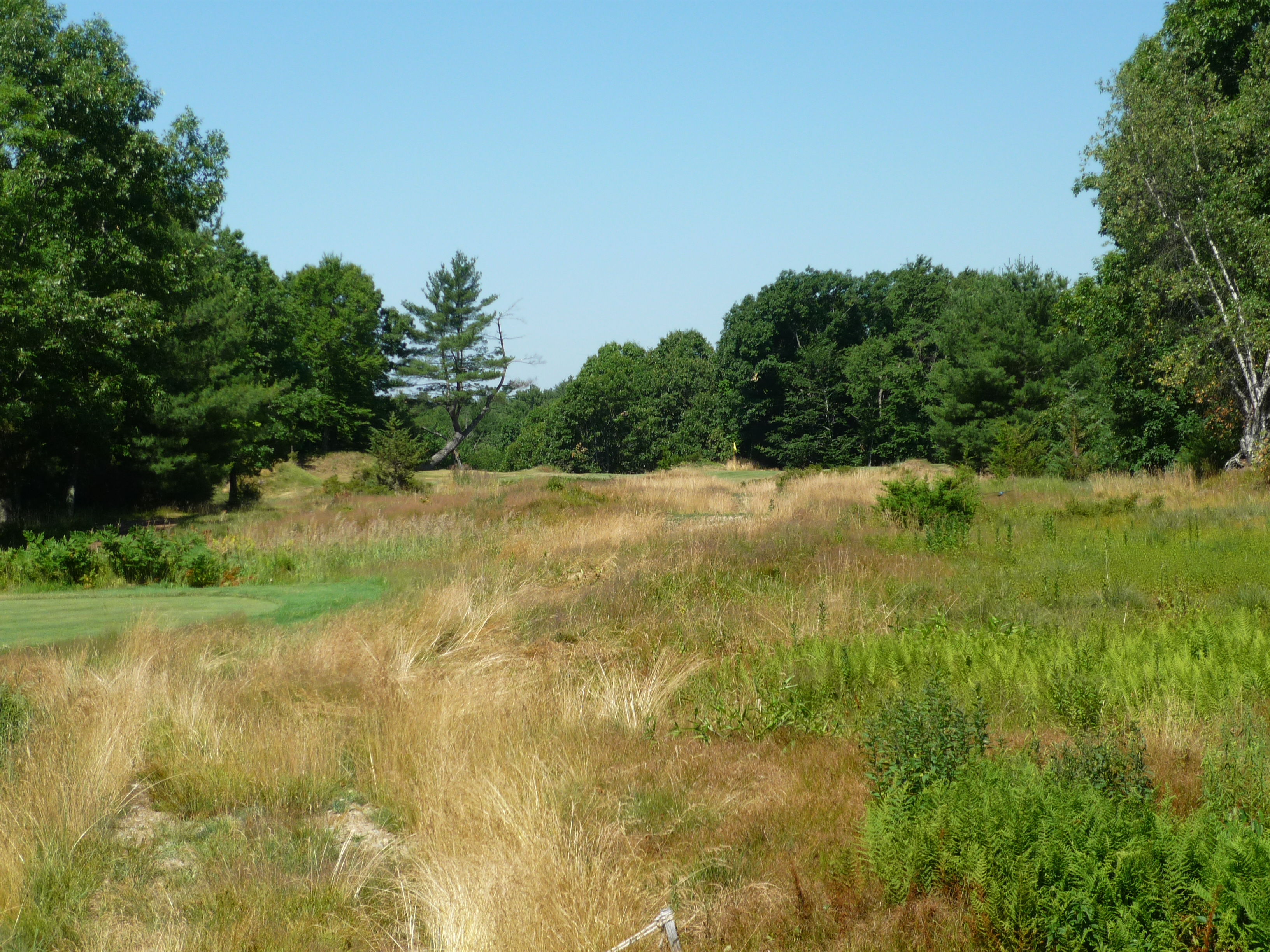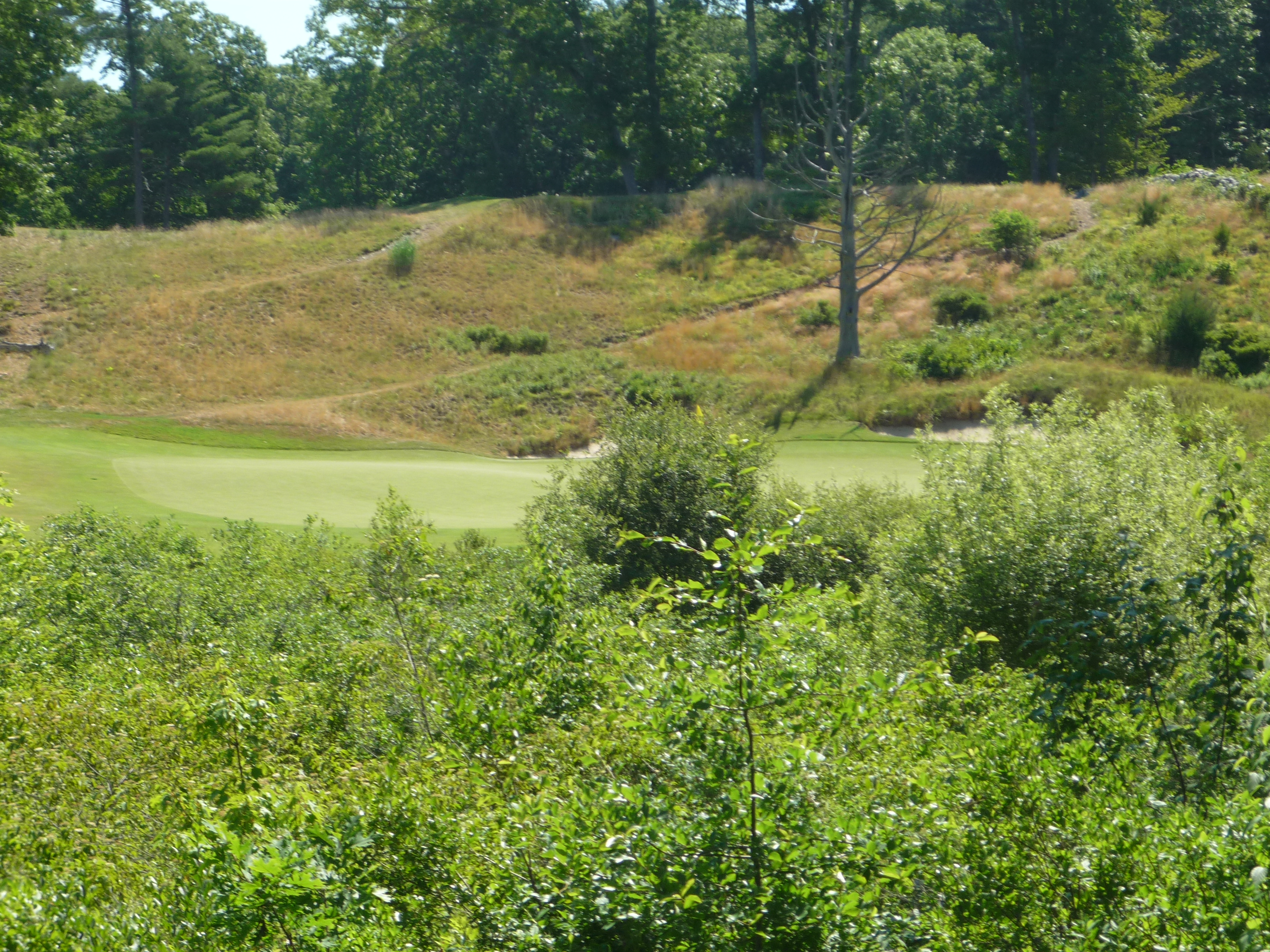 This view gives you an idea of what you are going to see on this course. The big rock outcropping, long native grasses, and trees along the edges of holes. I like this motif and it reminds me of other New England courses I have played. This shot is straightforward in that you need to keep it a little left of the rocks.