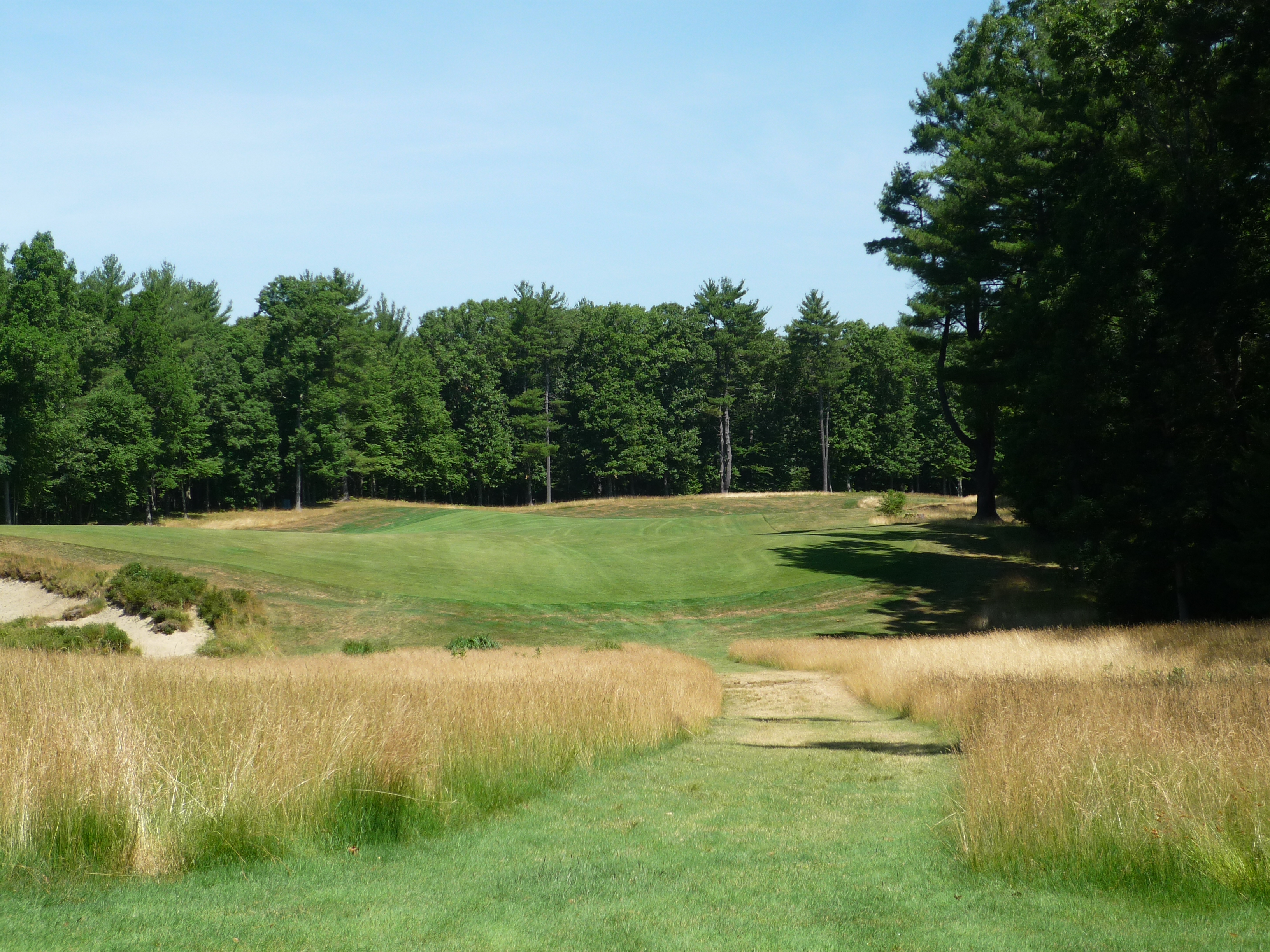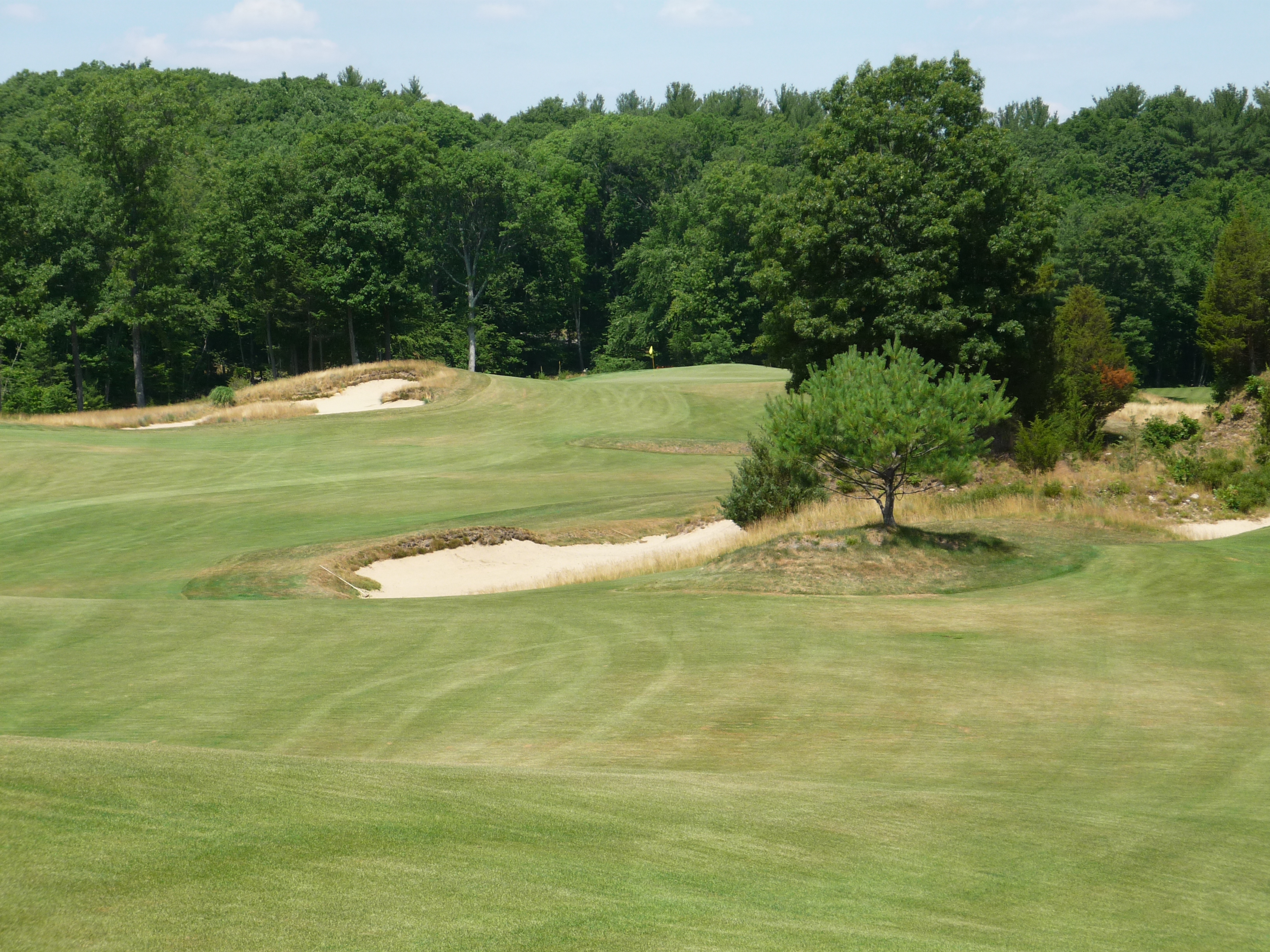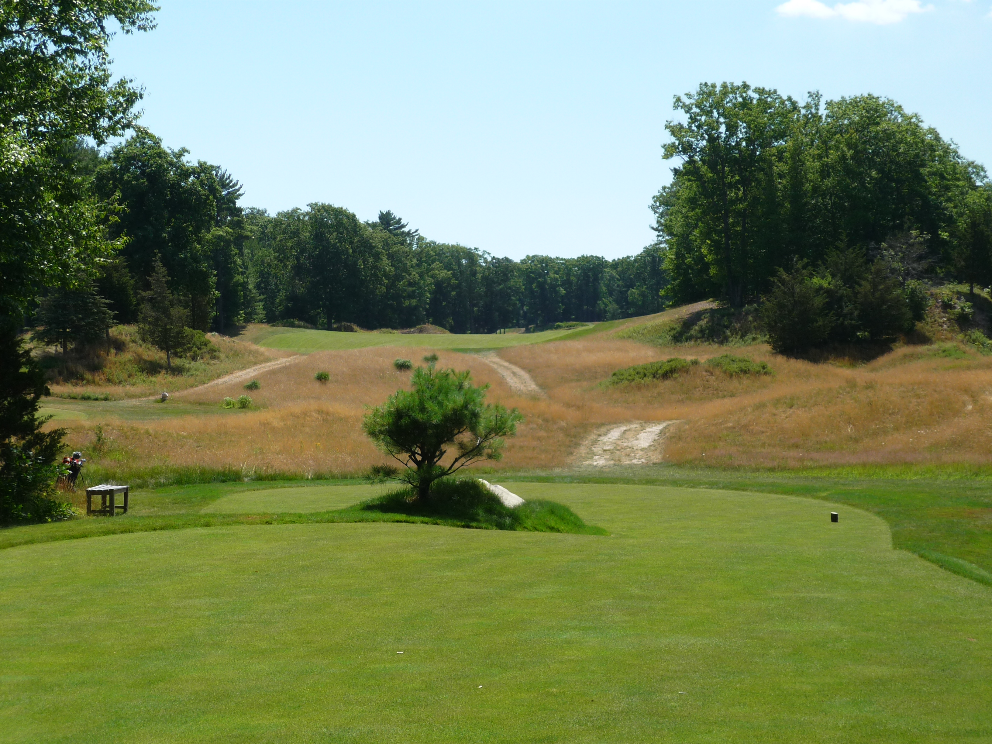 This view gives you an idea of what you are going to see on this course. The big rock outcropping, long native grasses, and trees along the edges of holes. I like this motif and it reminds me of other New England courses I have played. This shot is straightforward in that you need to keep it a little left of the rocks.