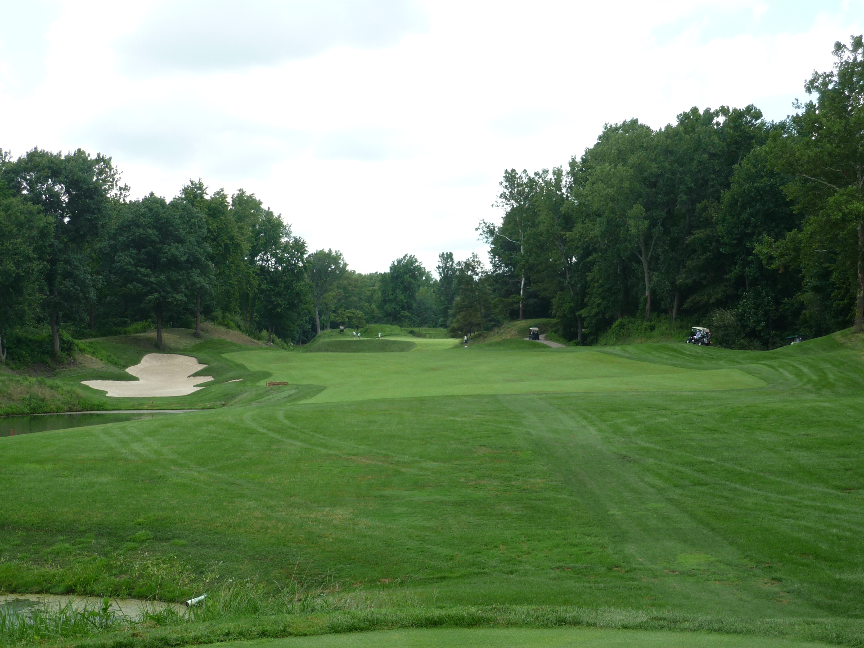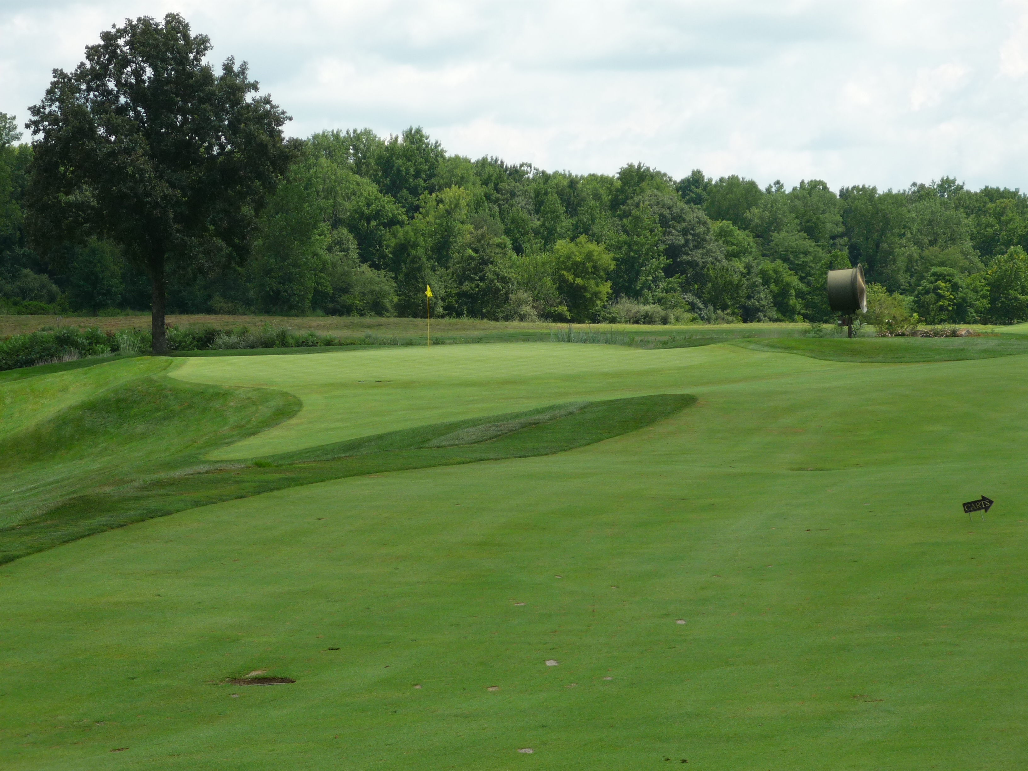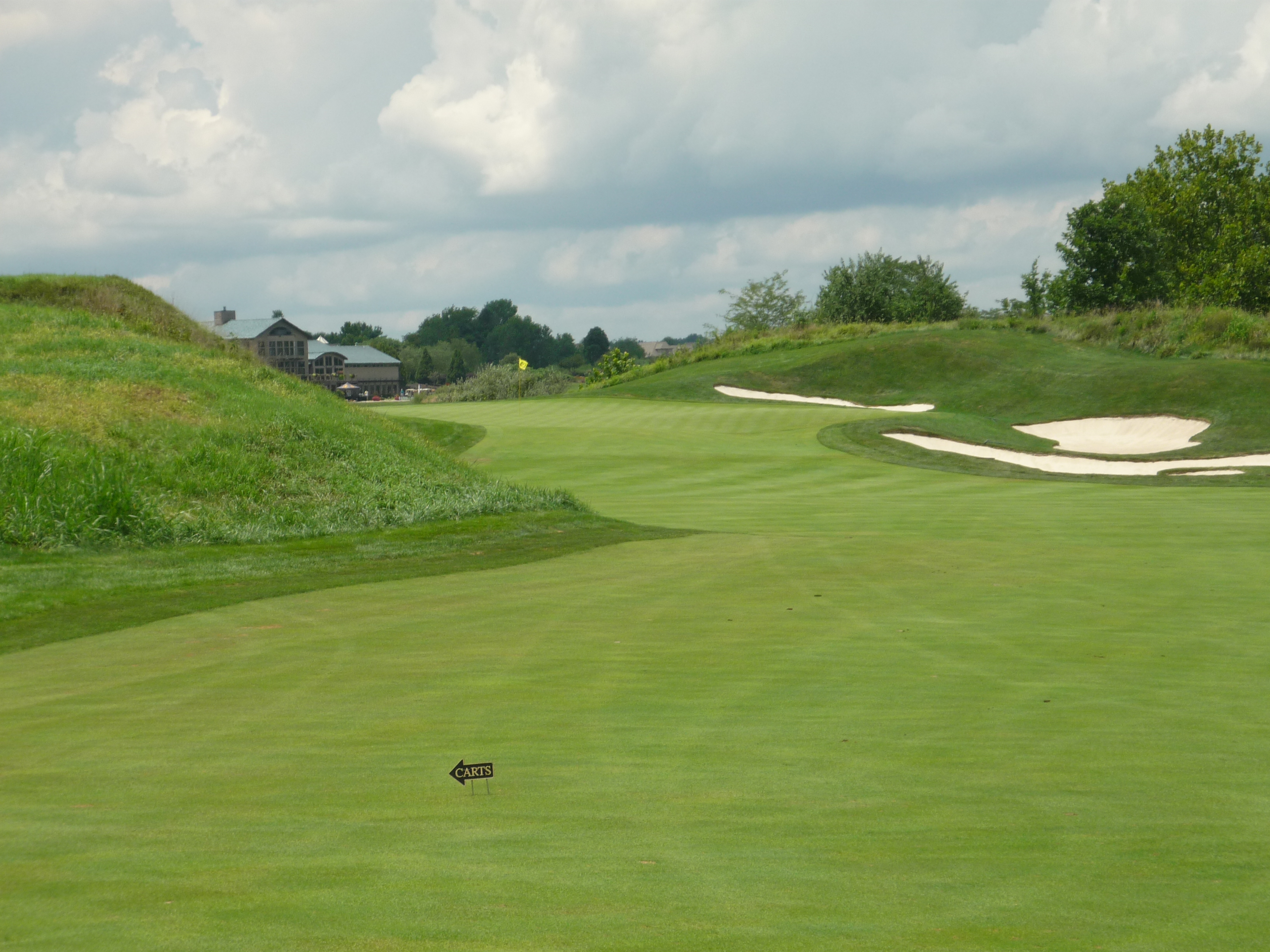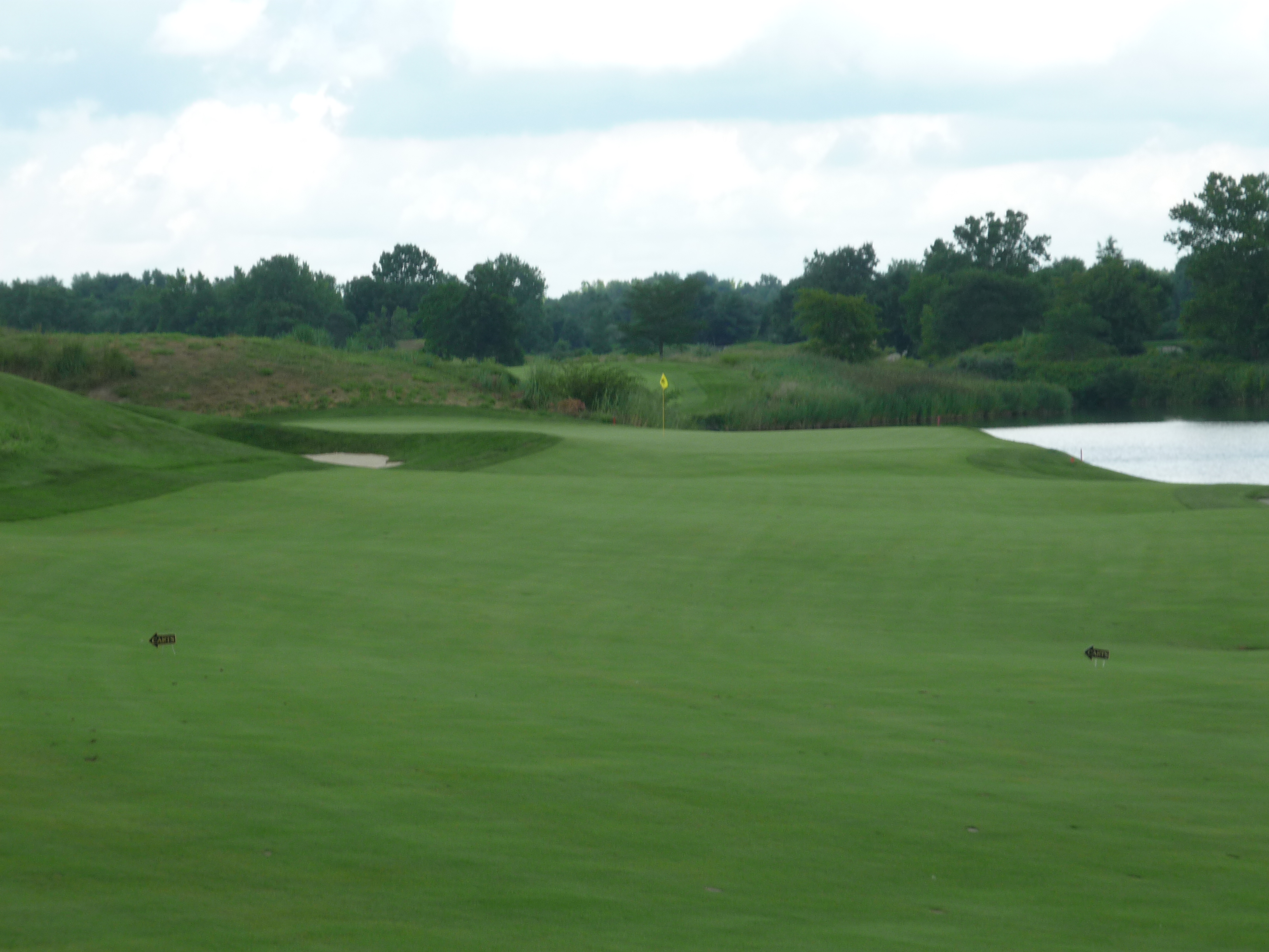 This fairway presents a pretty wide target. The cart on the left is a perfect target. The second shot plays to a green framed by bunkers that is slightly elevated. It’s tough to run up a shot on this hole.