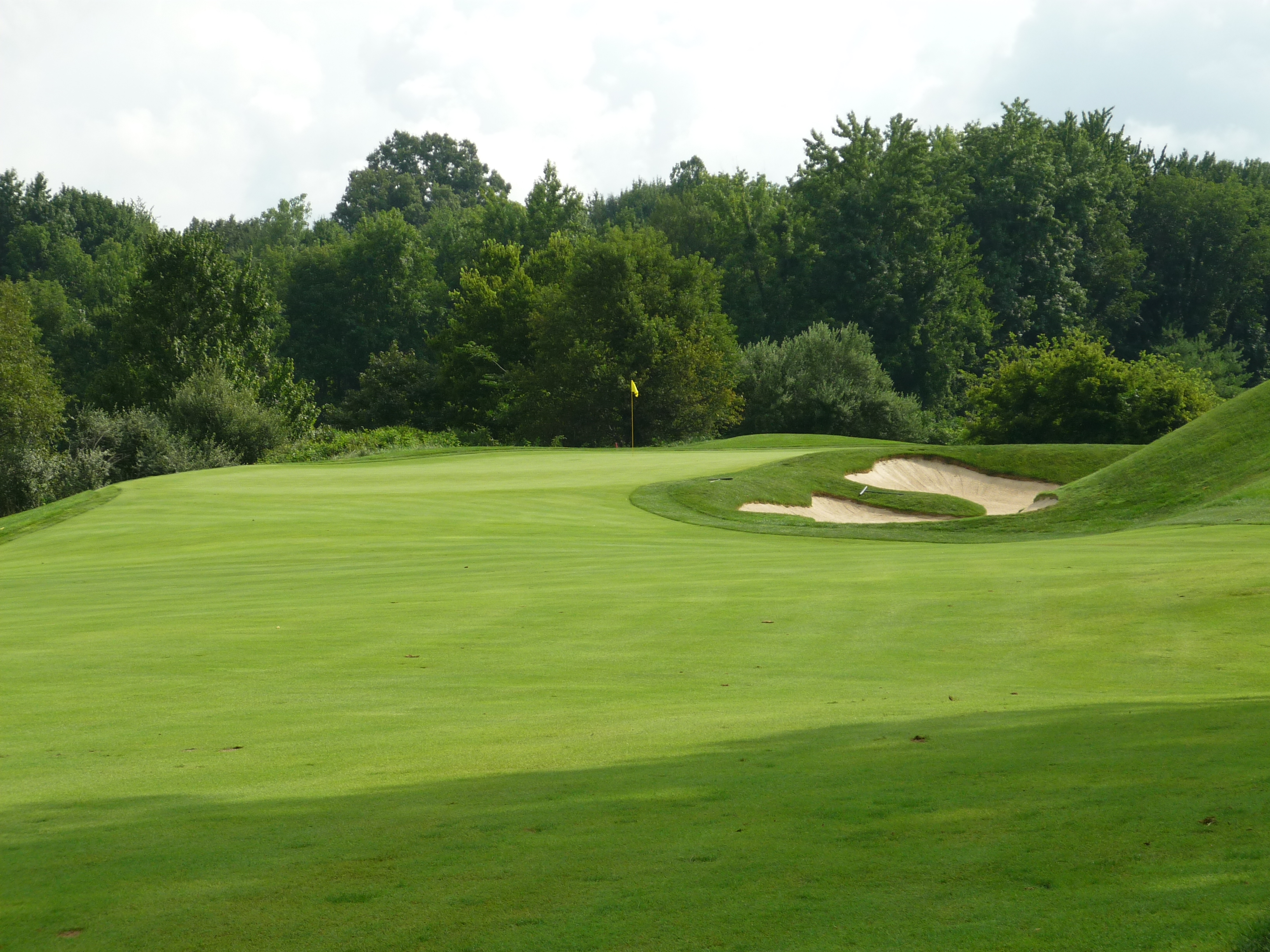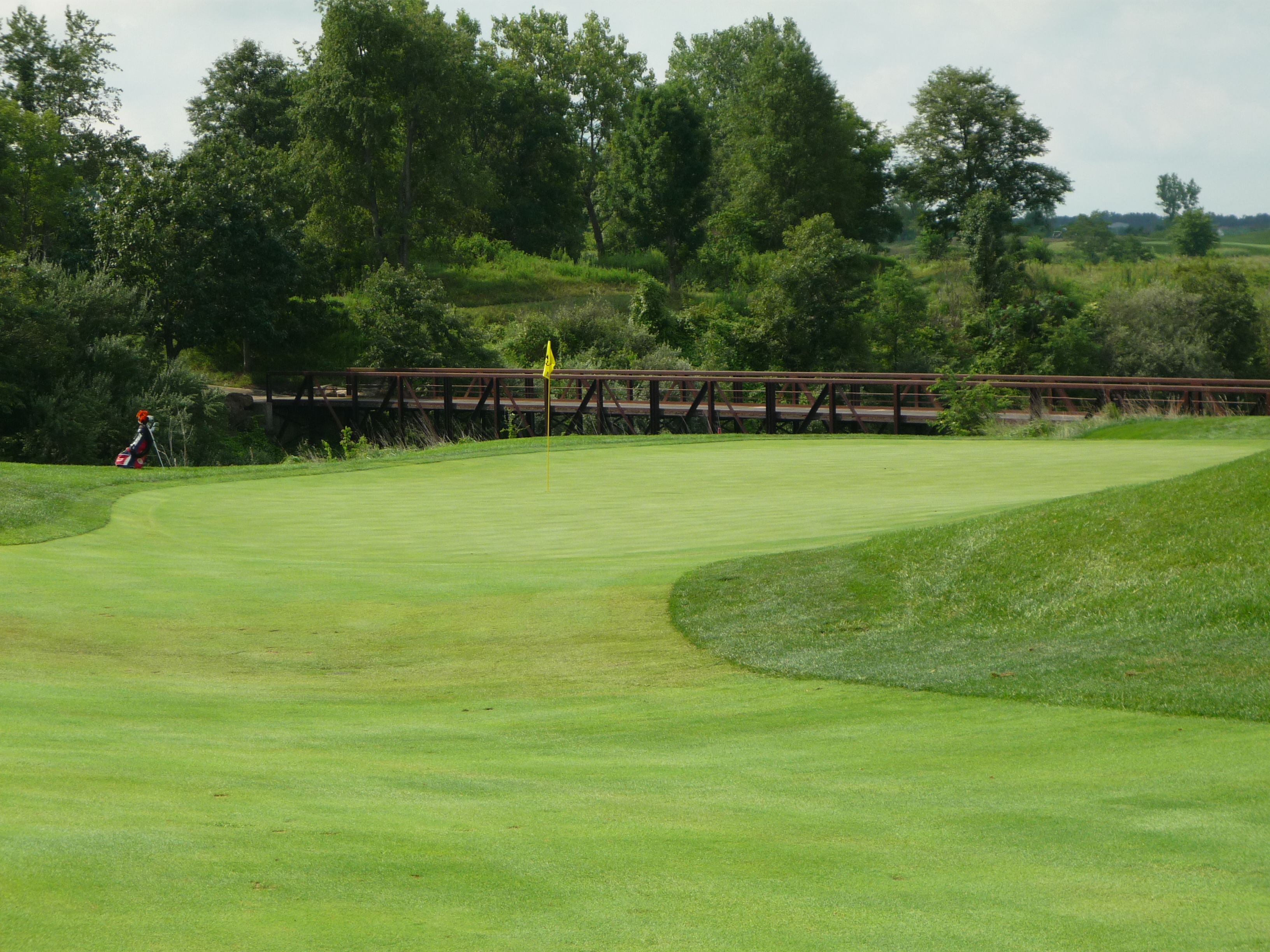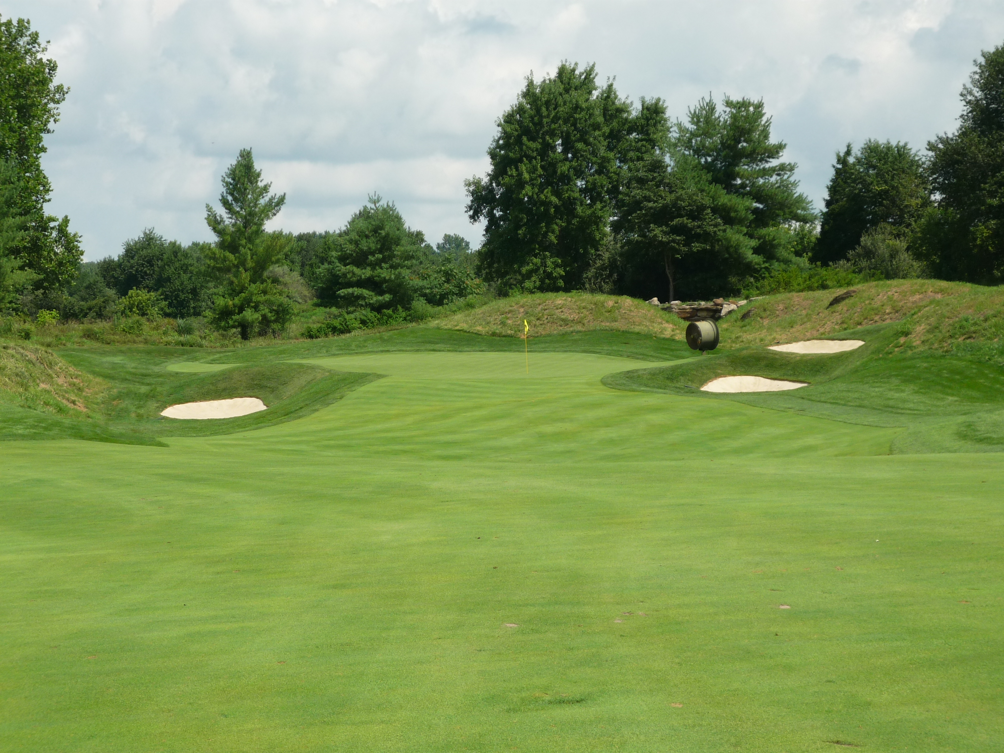 The approach shot plays ever so slightly downhill to a green guarded by two bunkers on the right. You can see in the second photo below that the green has some undulation.