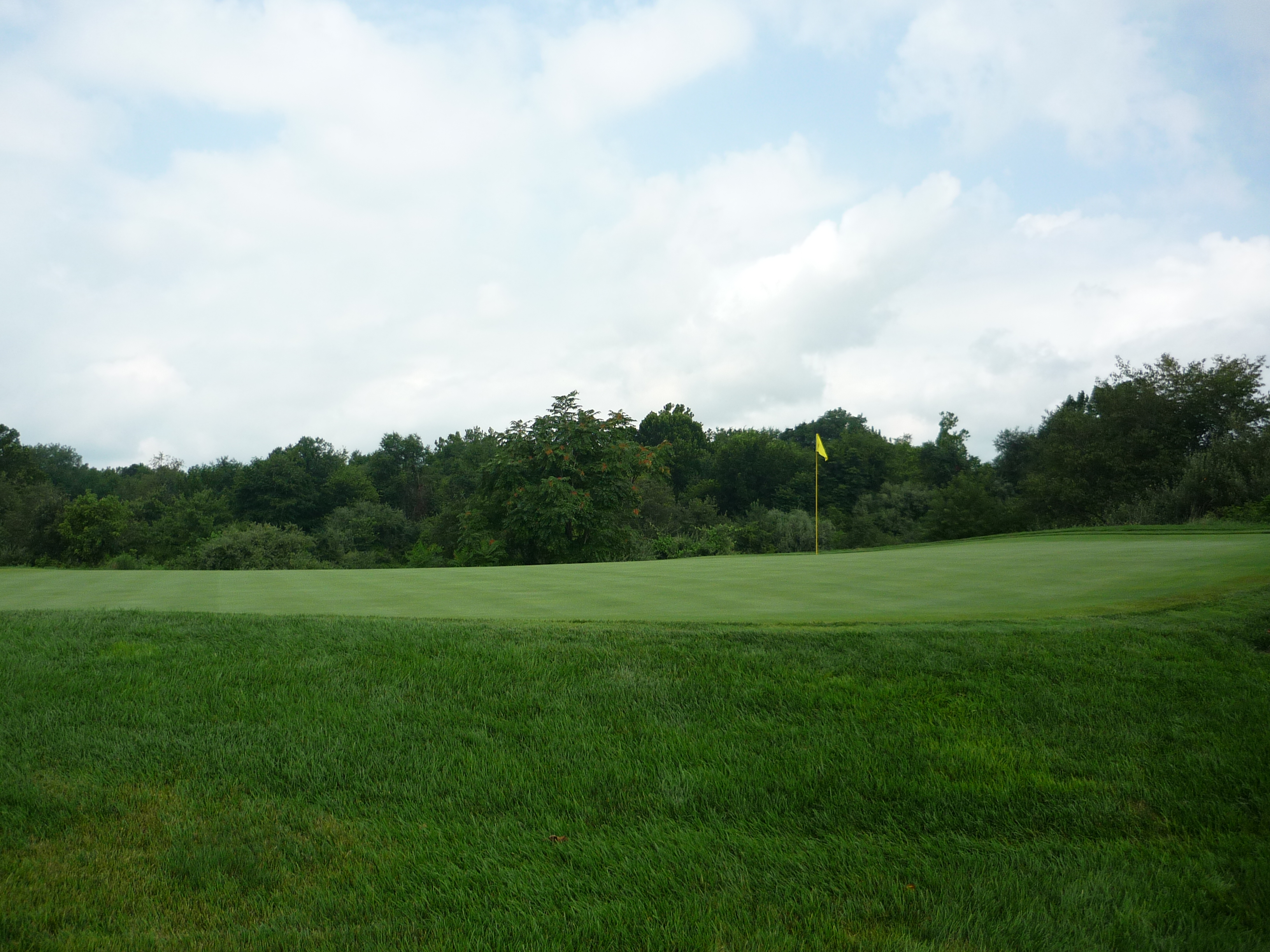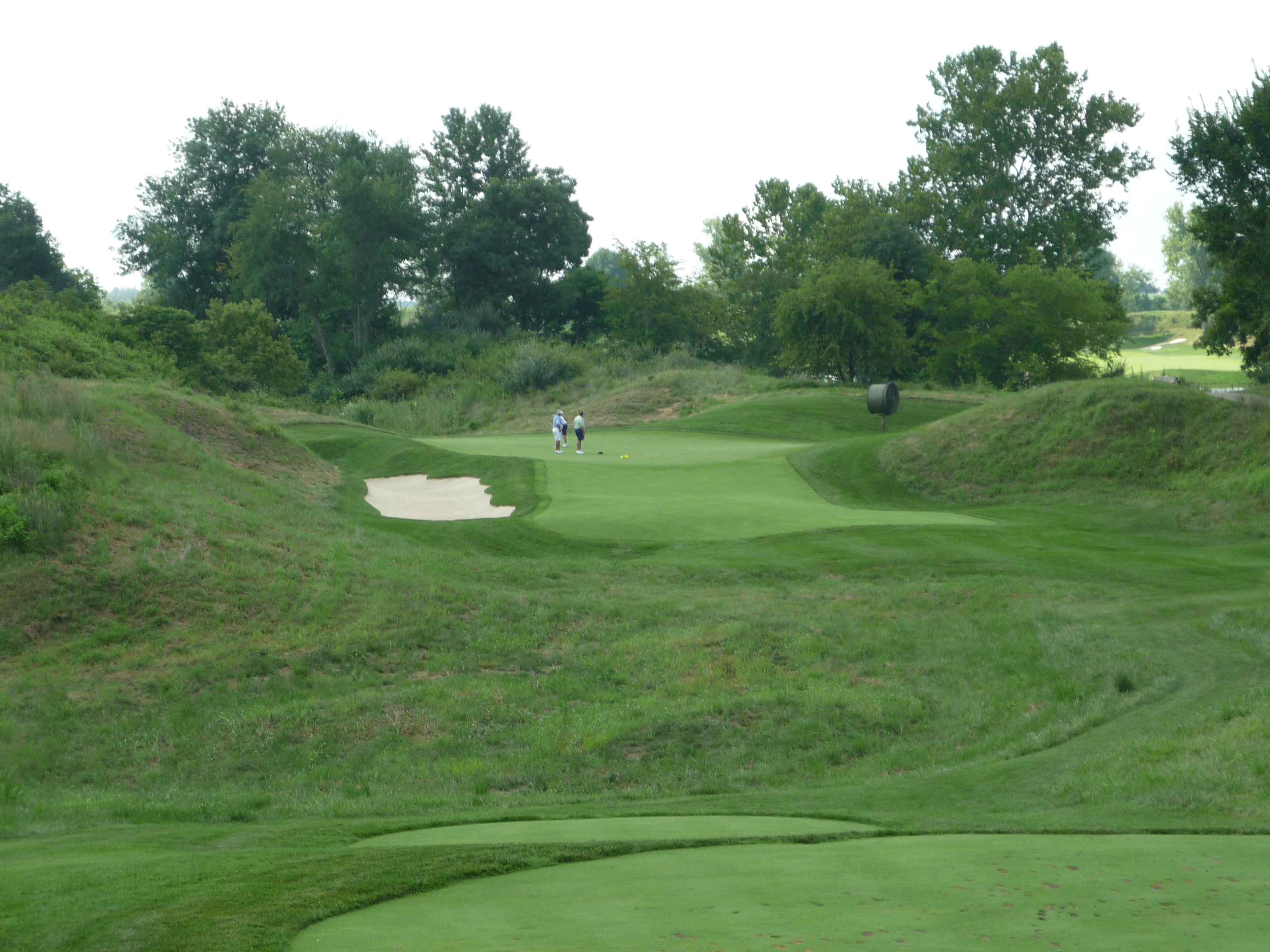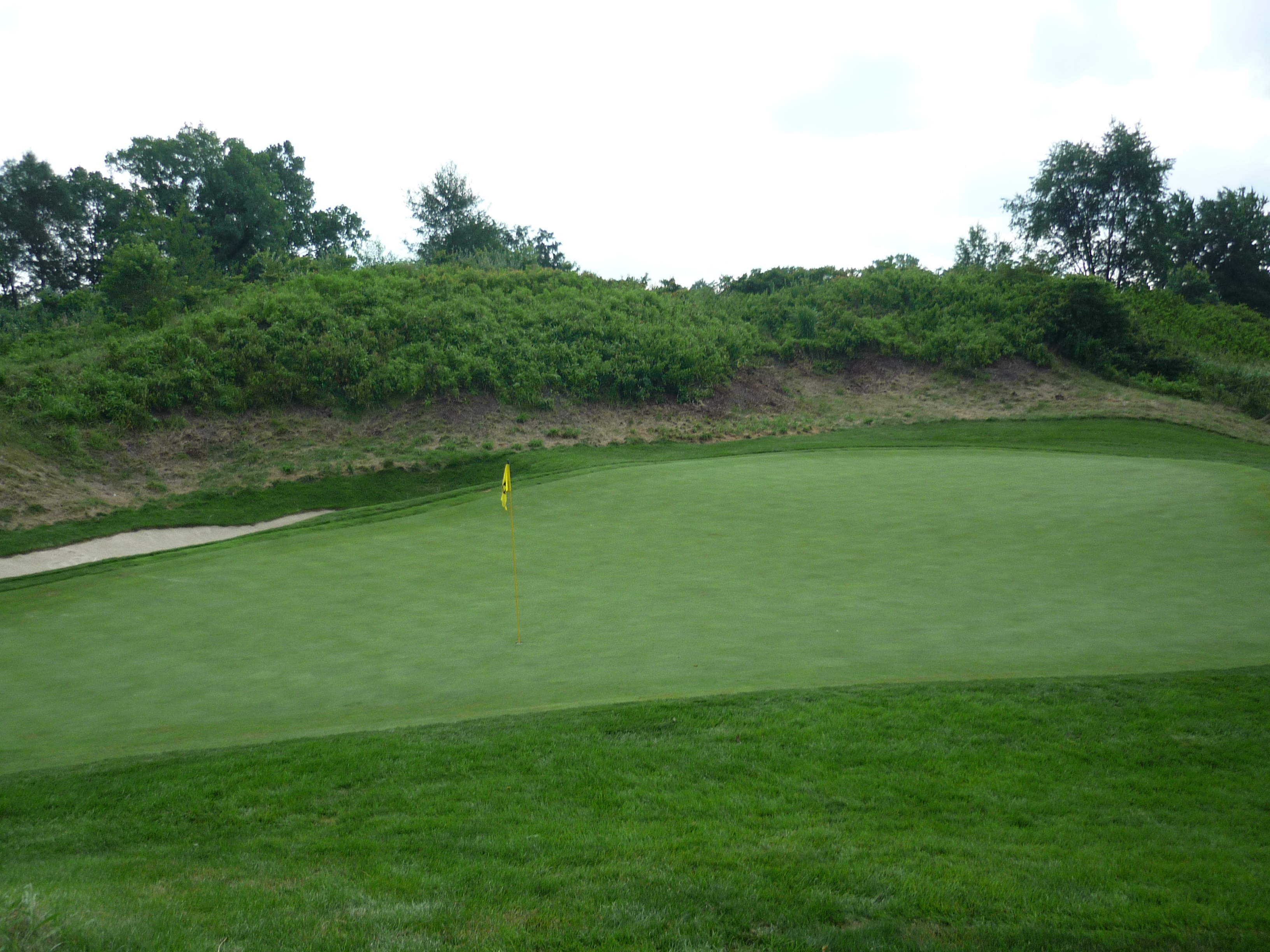 The approach shot plays ever so slightly downhill to a green guarded by two bunkers on the right. You can see in the second photo below that the green has some undulation.
