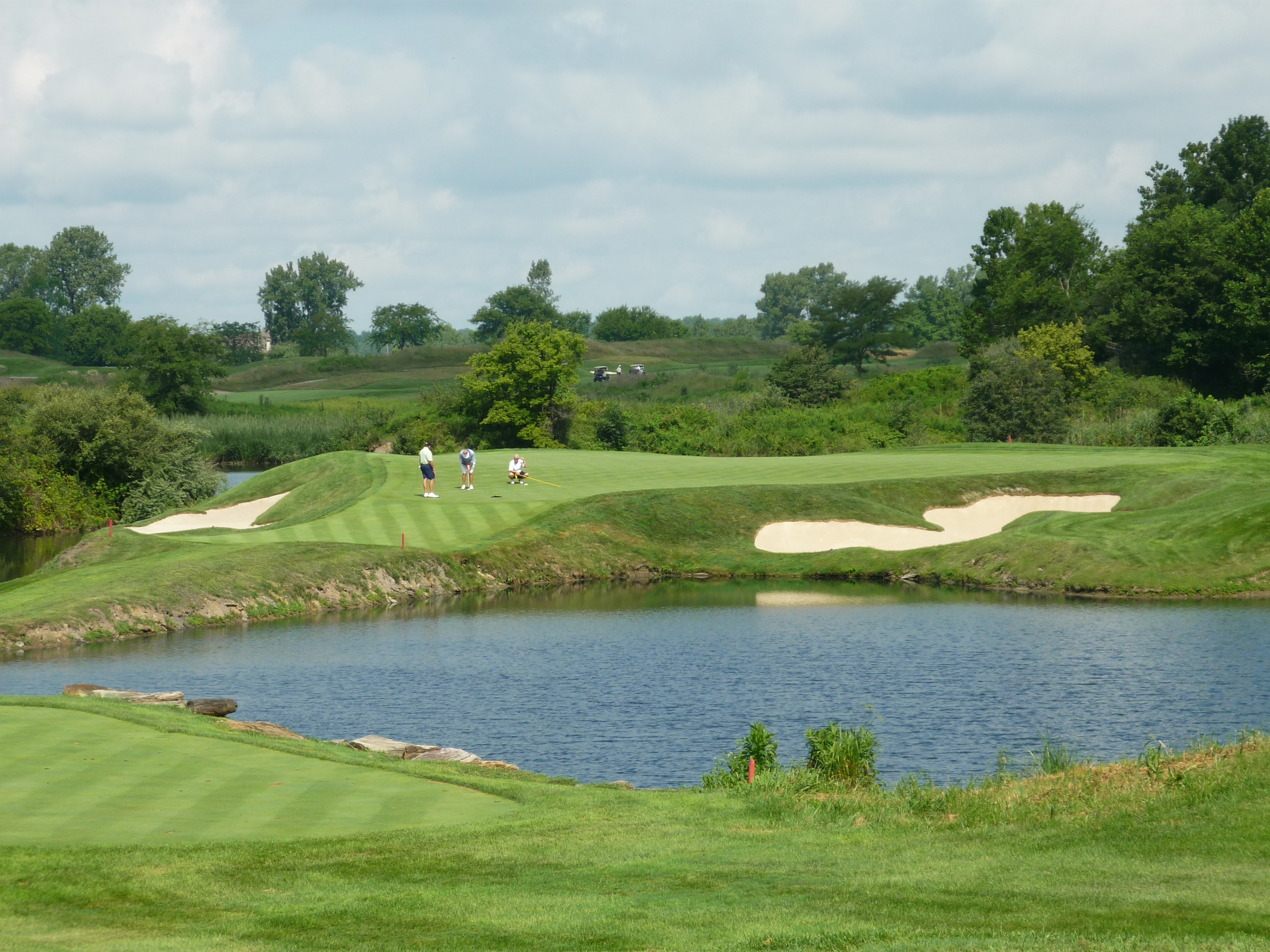 The green is pretty large so you shouldn’t have much to worry about if you have executed on your second shot. The main objective is to carry the water obviously. Depending on the pin position you can get the ball to funnel towards the hole.
