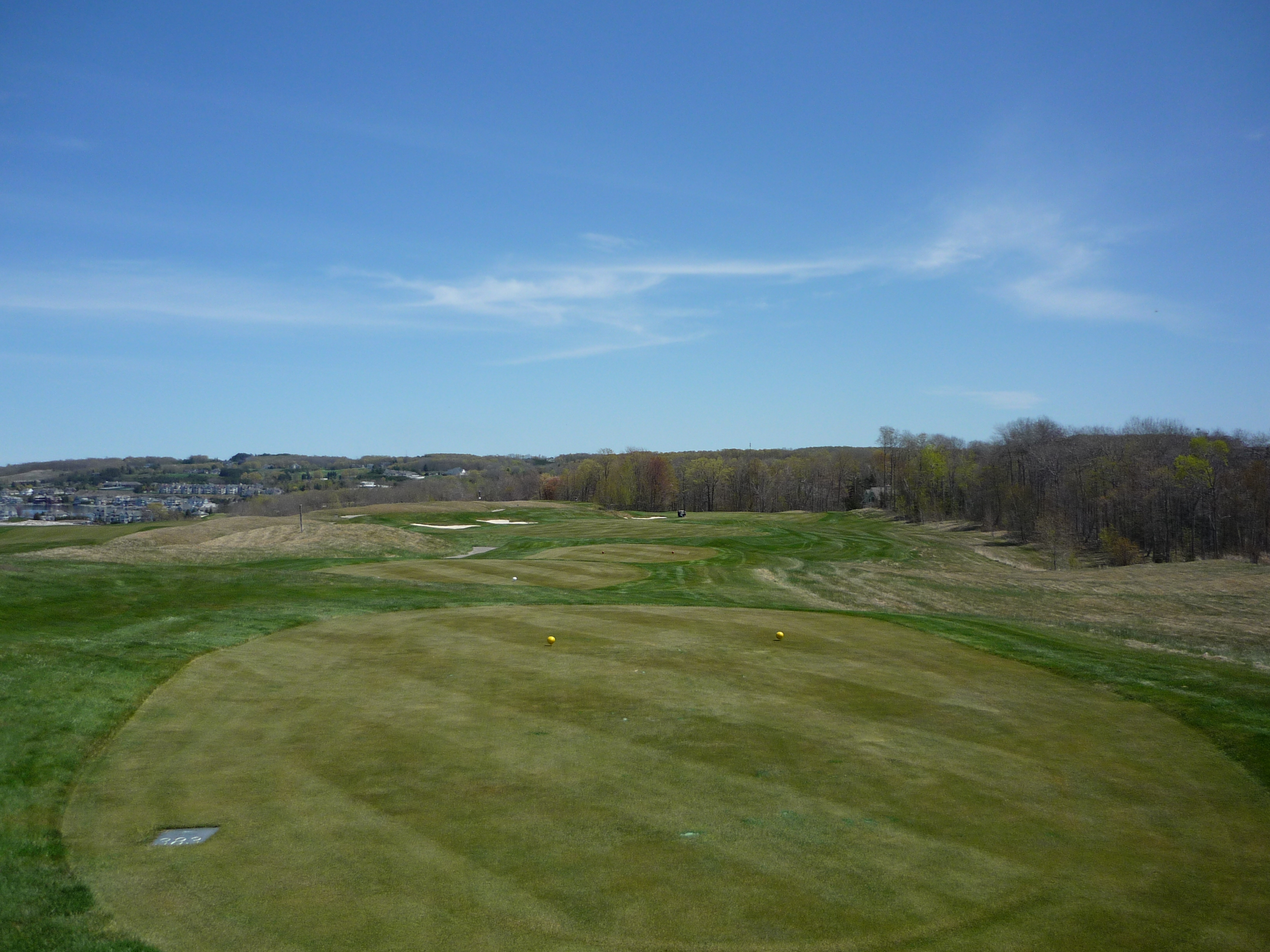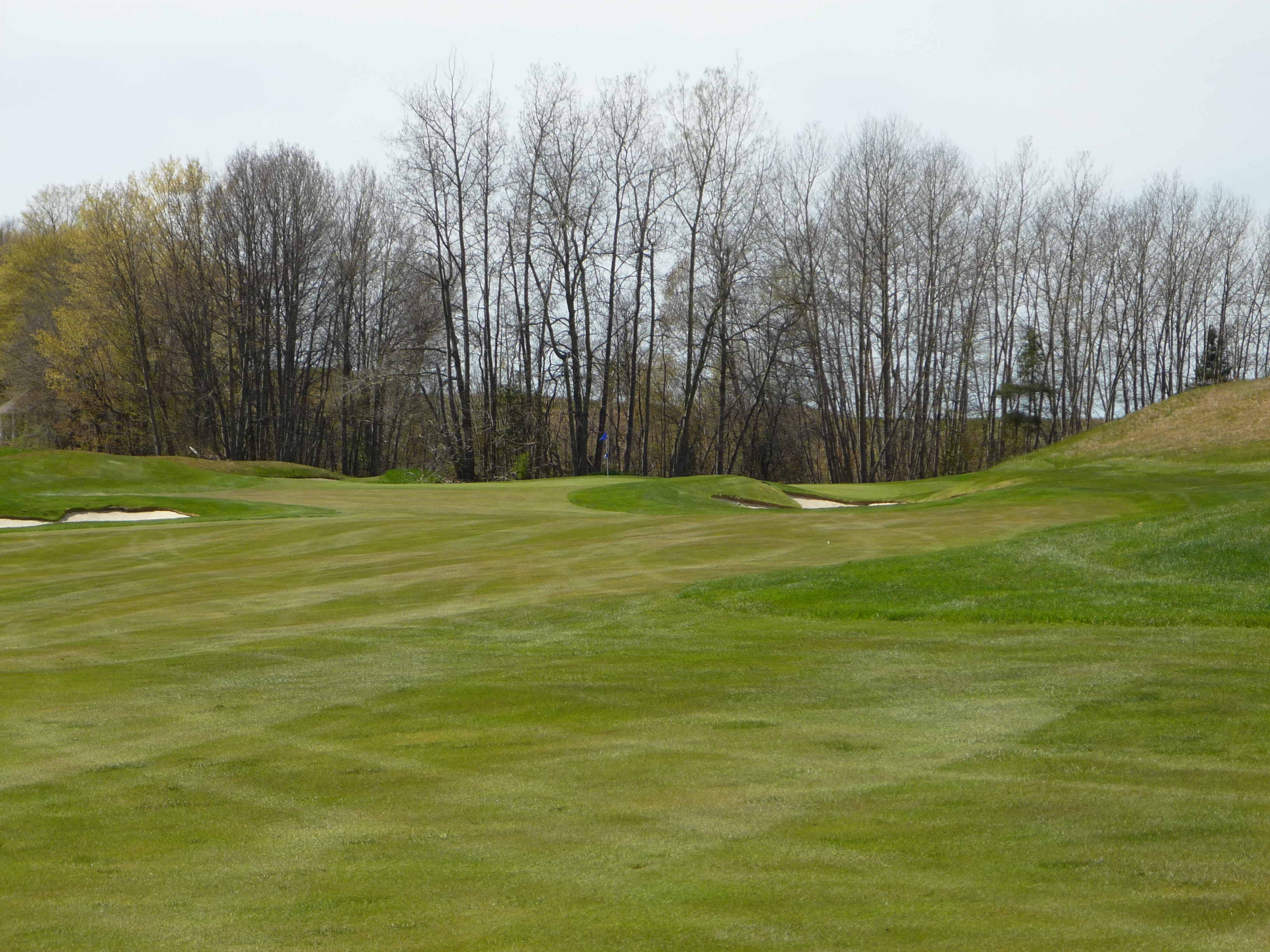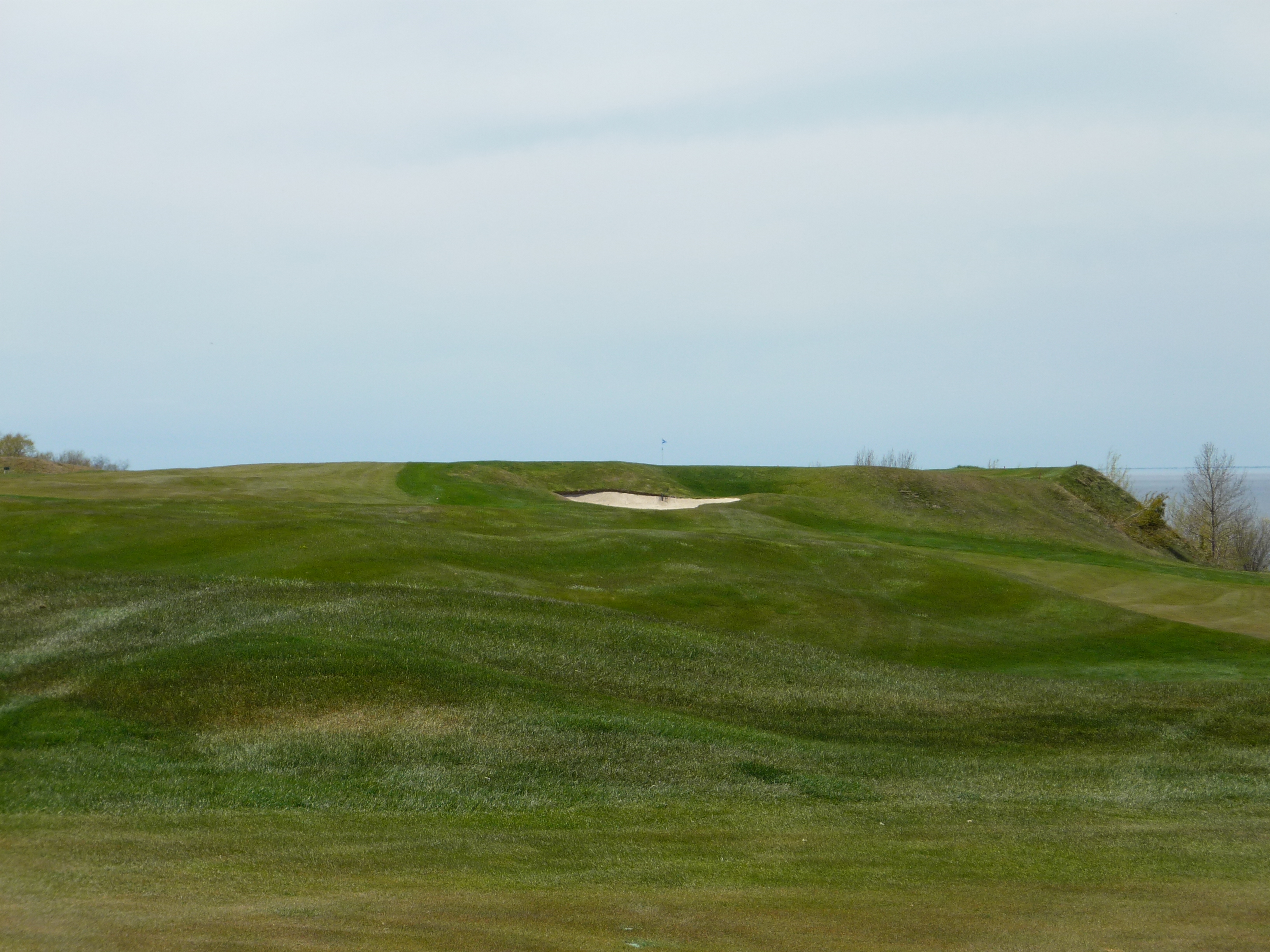 The lack of trees make this a difficult aiming hole. It’s easier to see in person than in the photo, but you want to take a line a little right of the bunkers.