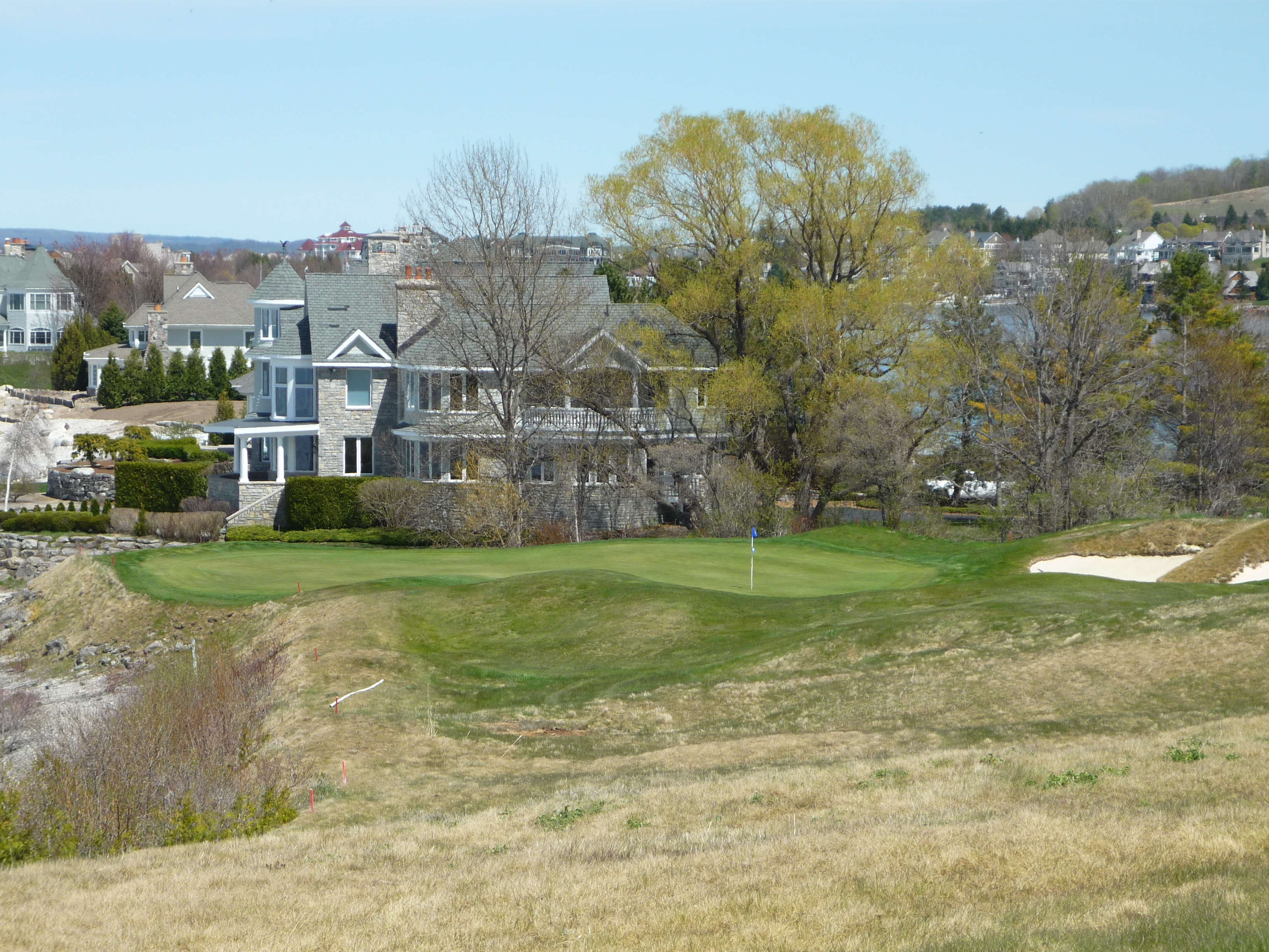 This shot was beautiful to me. I liked the setting next to the water with the awesome houses behind. In the absence of wind the hole will play about a club less. See the second photo for a closer look.