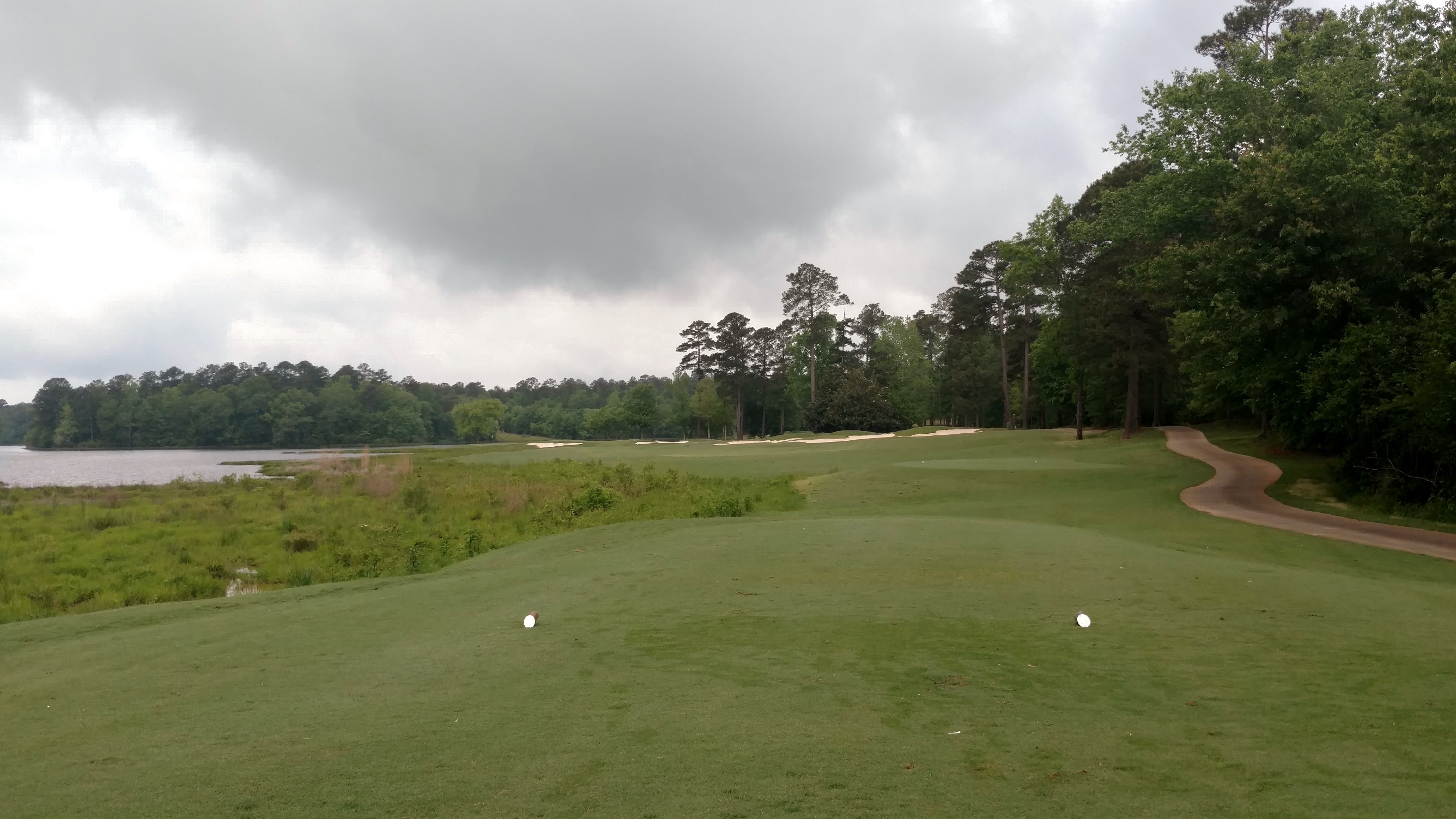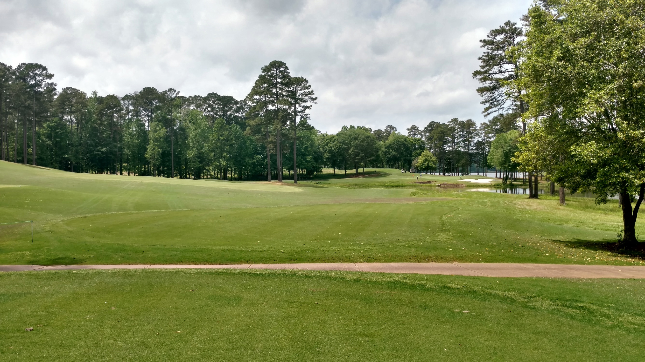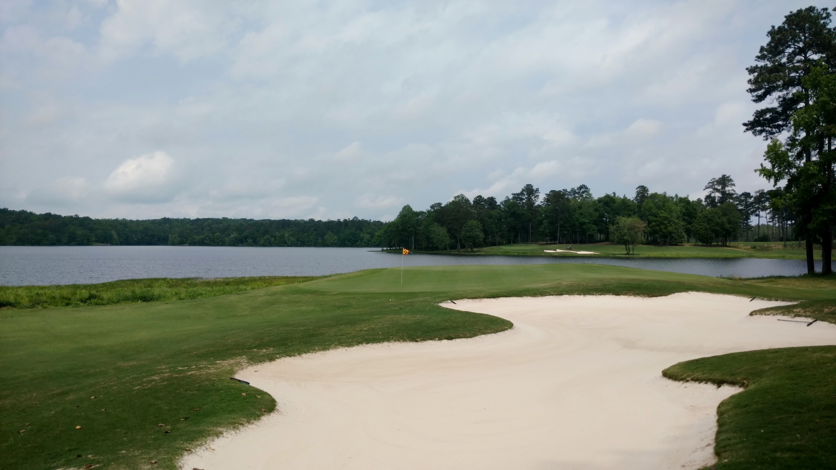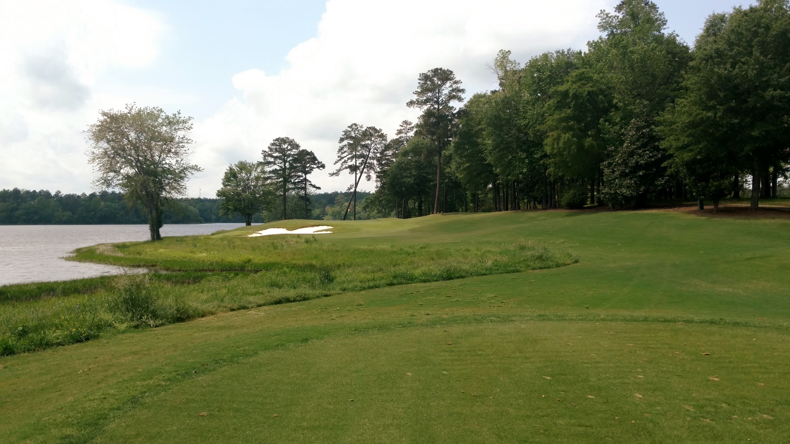 The large bunker you see guards the left side of the fairway. Drives need to be short or right of it. The lake juts in out the right side and guards portions of the fairway and green.