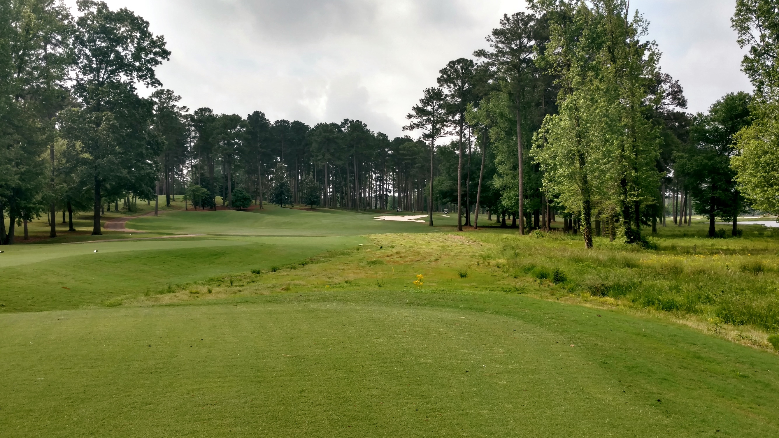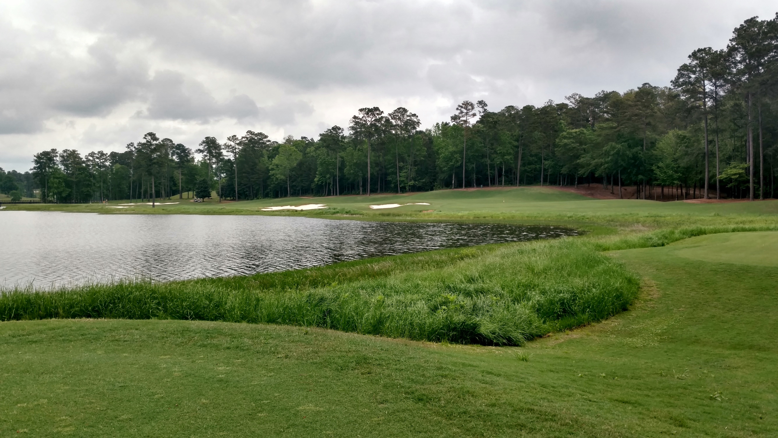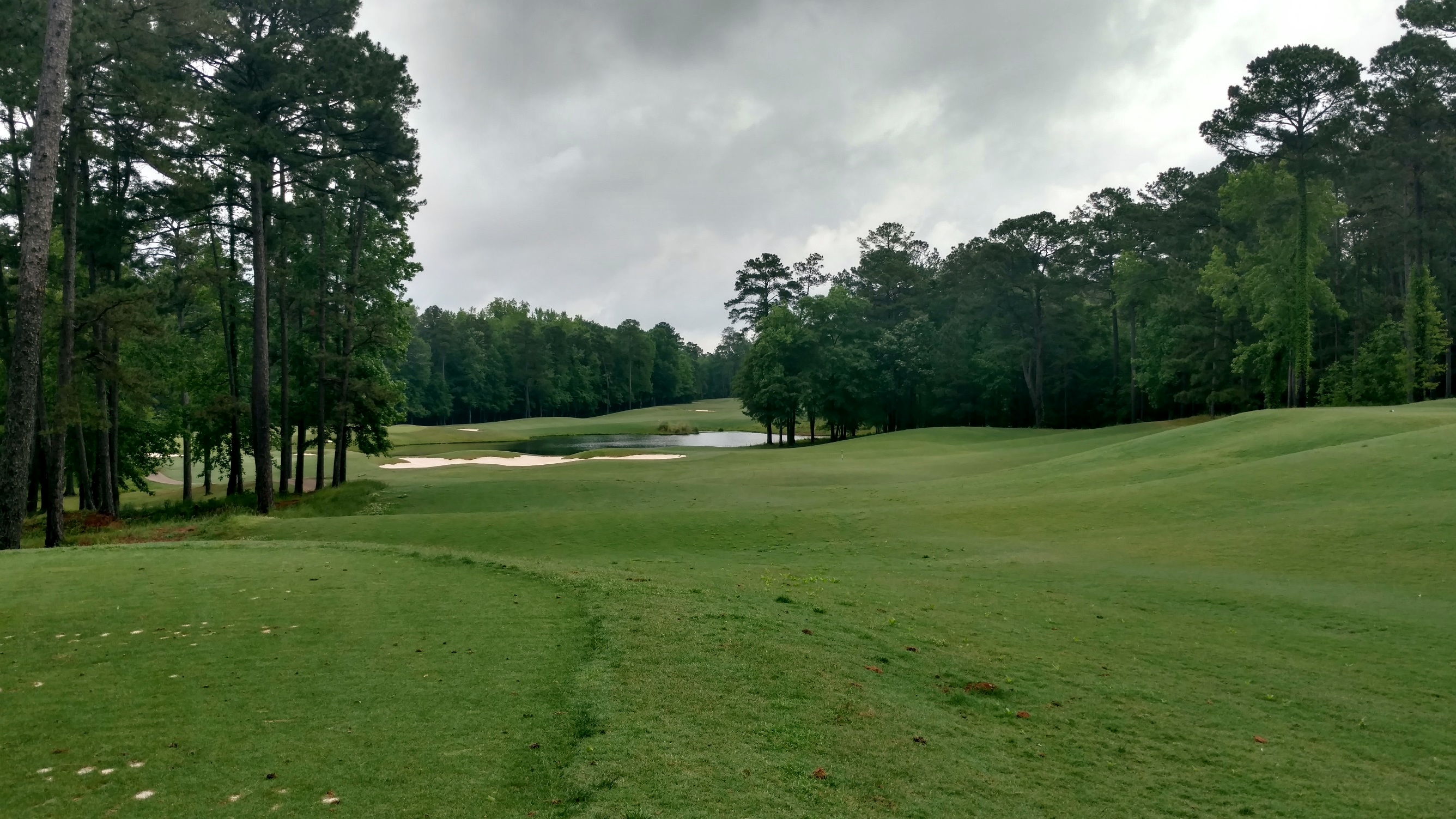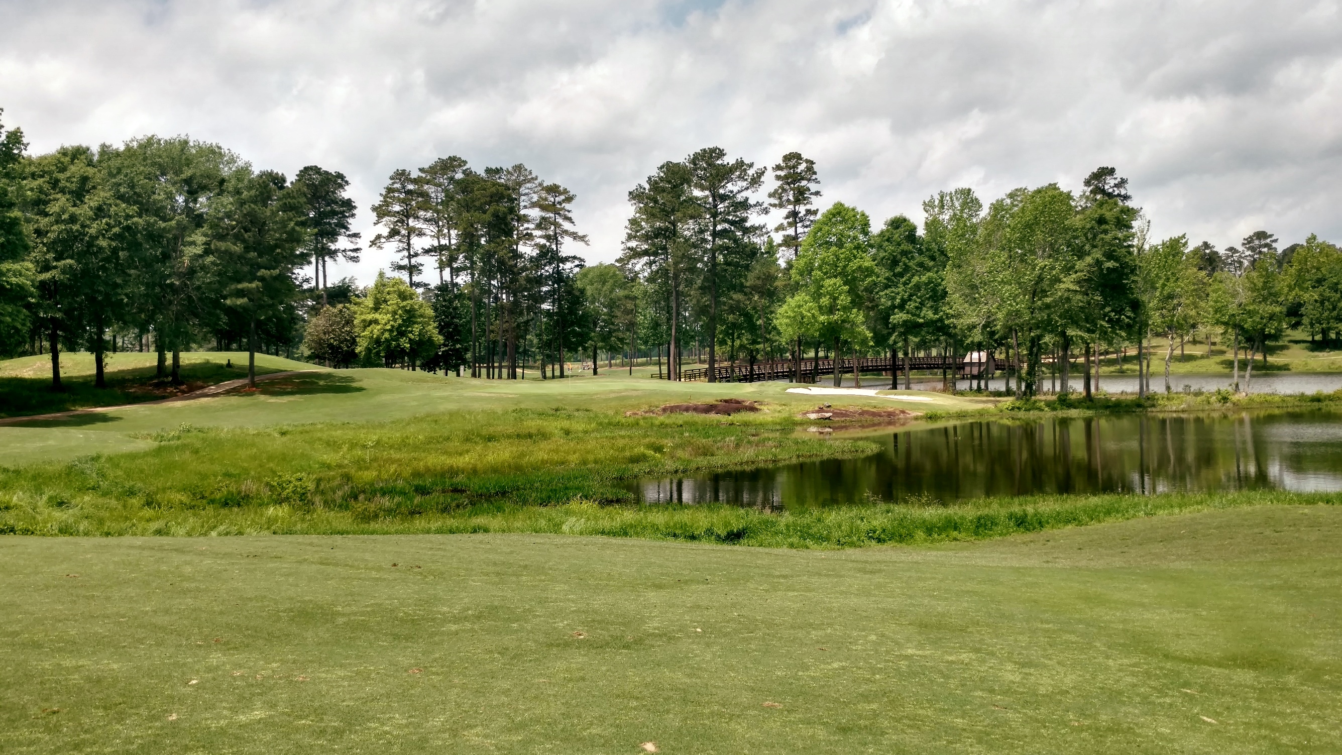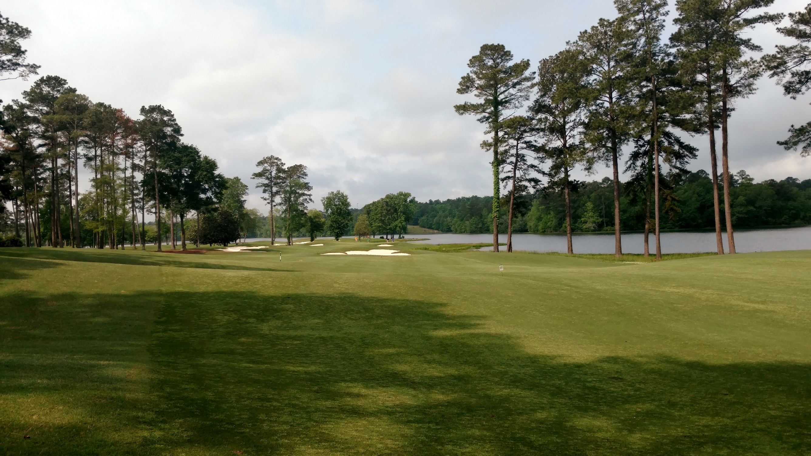 The large bunker you see guards the left side of the fairway. Drives need to be short or right of it. The lake juts in out the right side and guards portions of the fairway and green.