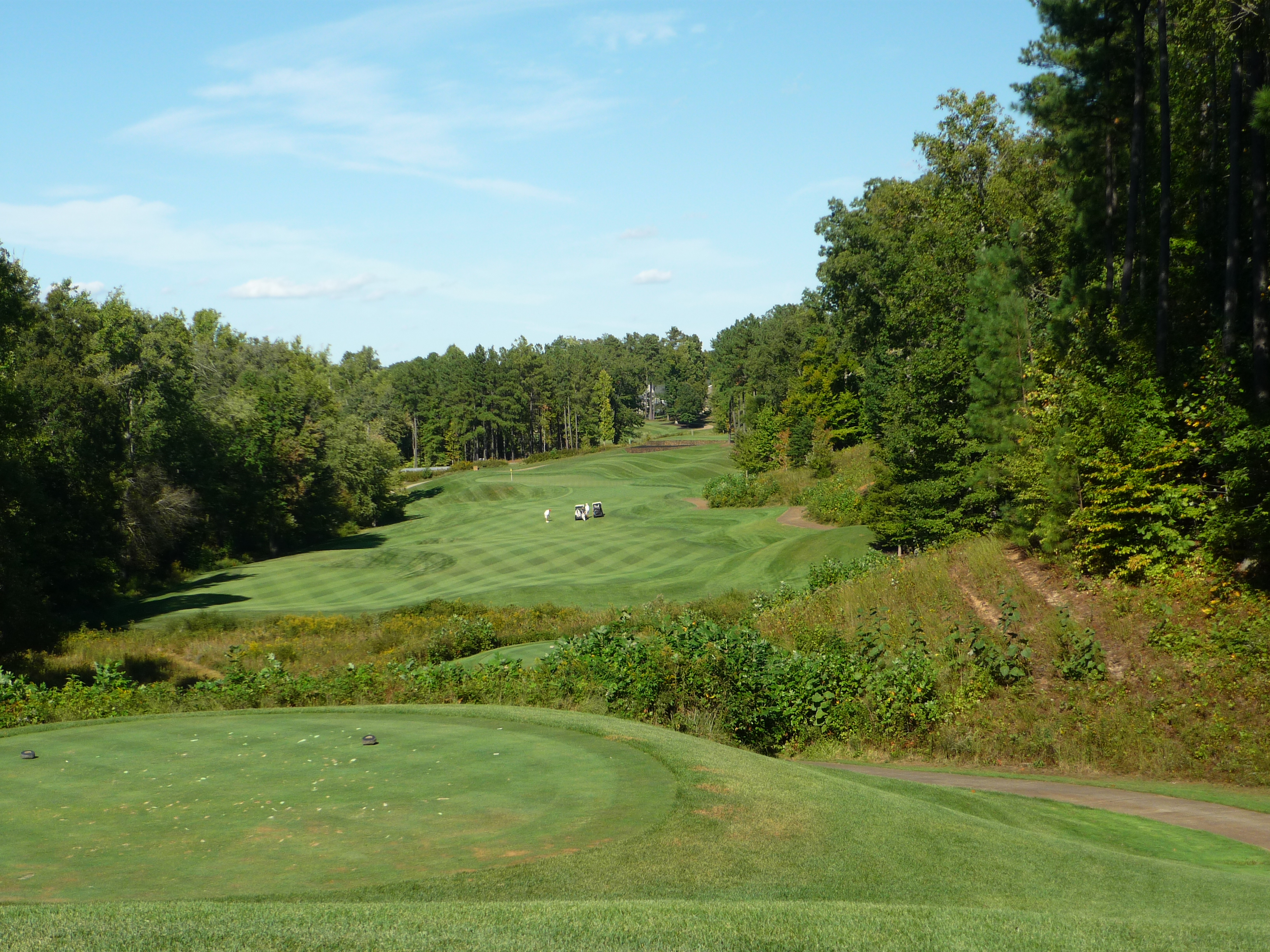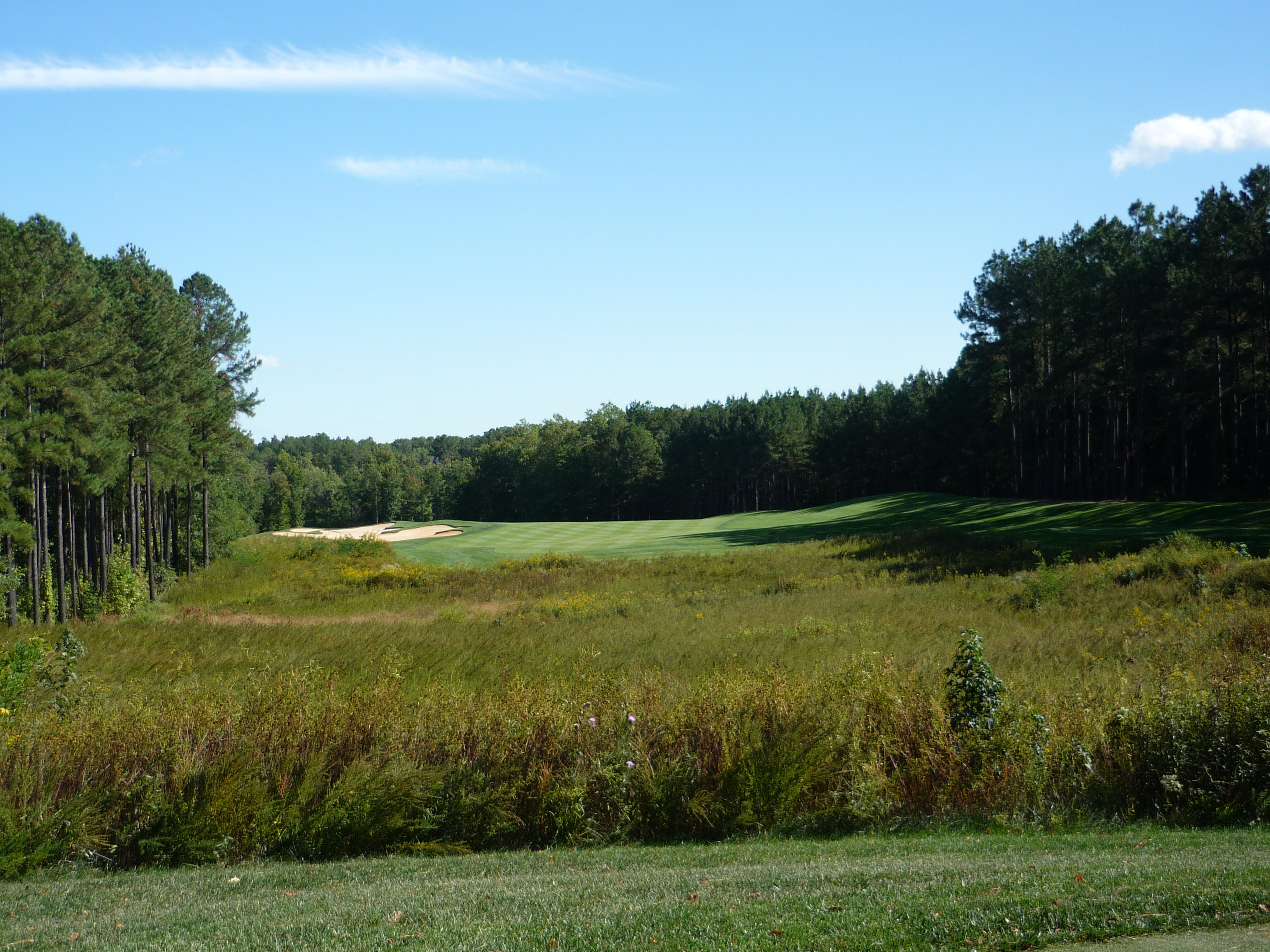 The course tightens up a bit here, but the shorter hole allows for more options off the tee. The shape of the hole and the trees favor a fade.