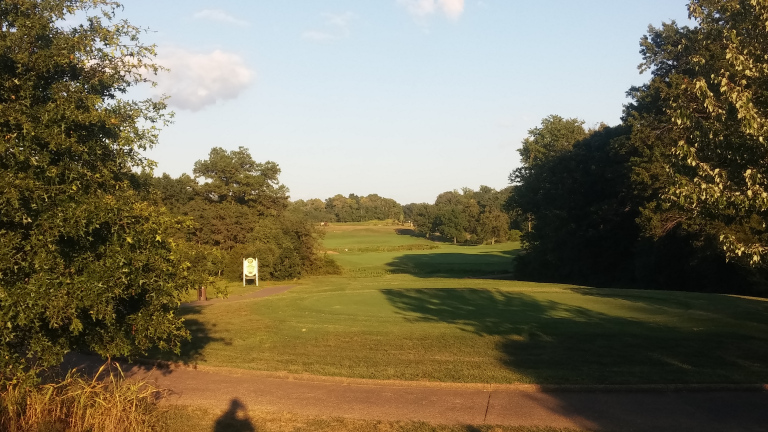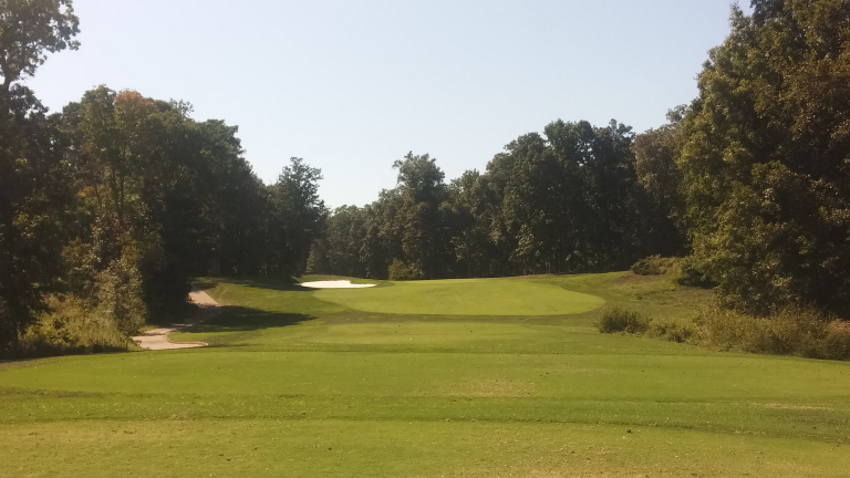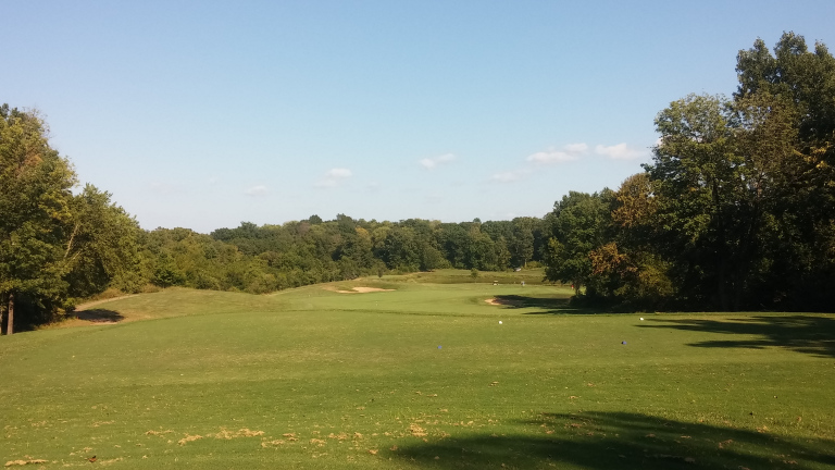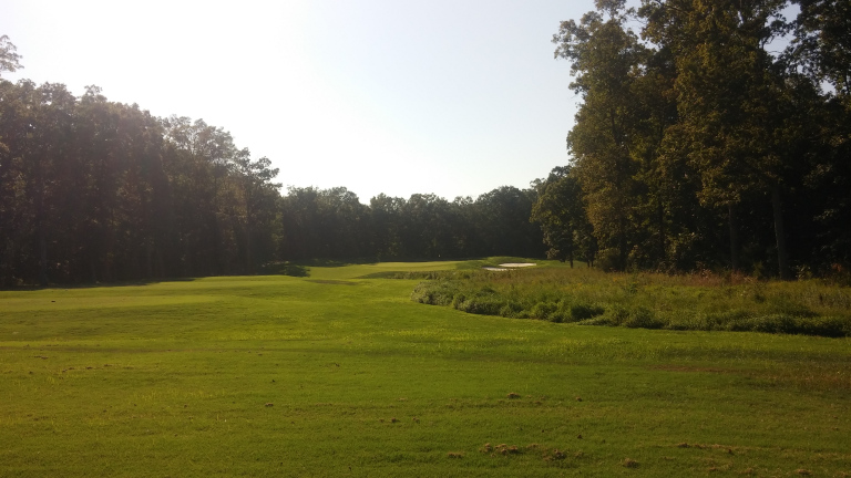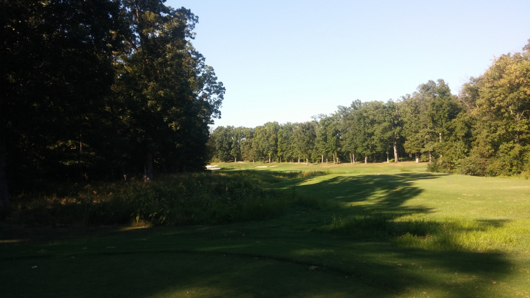 The sun messed with this photo a bit, but the tee shot is straightaway to a narrow fairway guarded by rough. Bunkers start to encroach at 150 yards out.