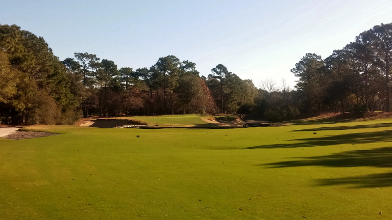 Another dogleg here, this one to the right. Big hitters can carry the right corner.