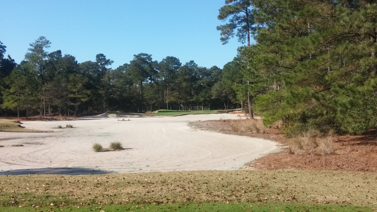 The approach plays to a green that seems guarded by sand, but these are actually 30 yards short. The green is bowl-shaped and should allow for a good shot to funnel towards the middle.