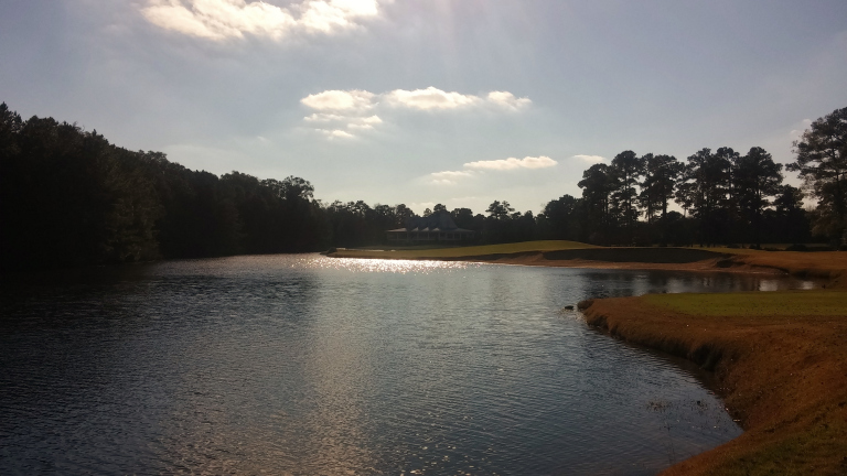The approach plays over the water again to a green that slopes right to left. You have to work hard for a final par.